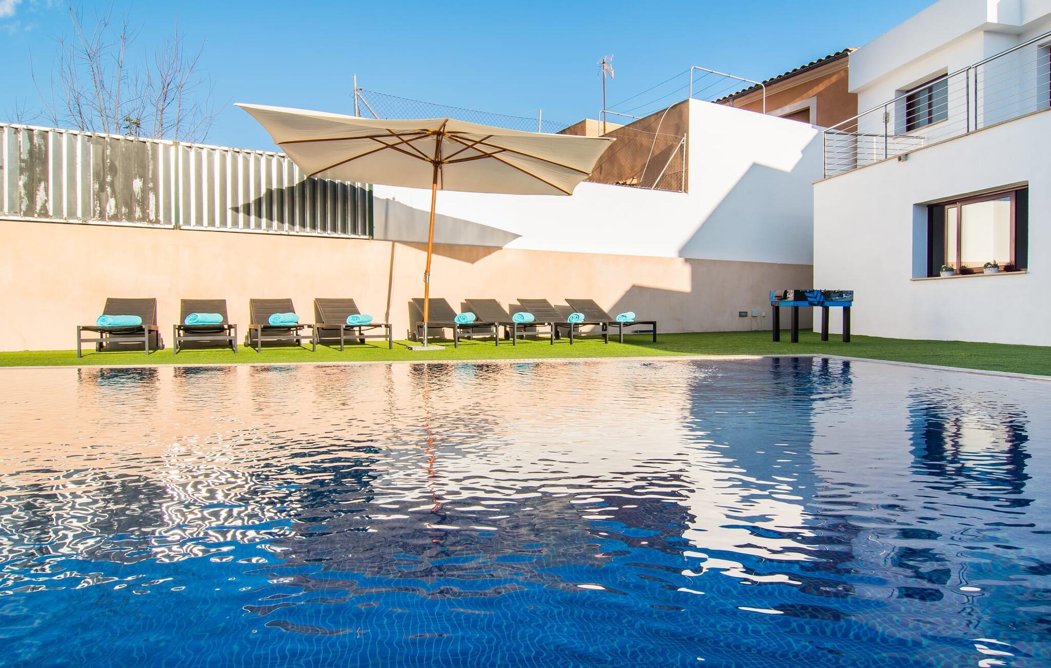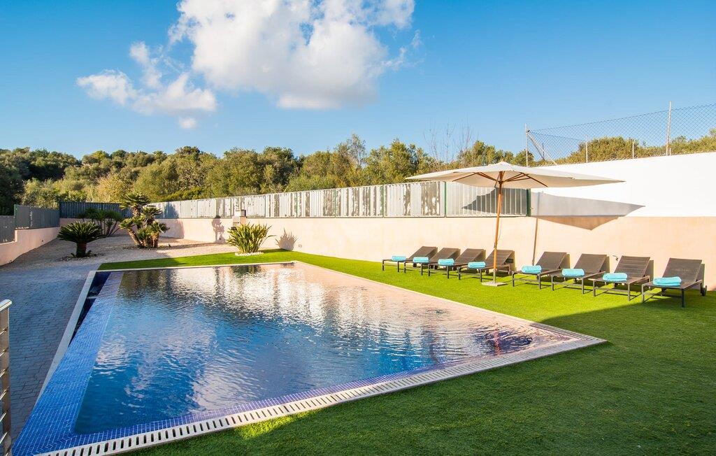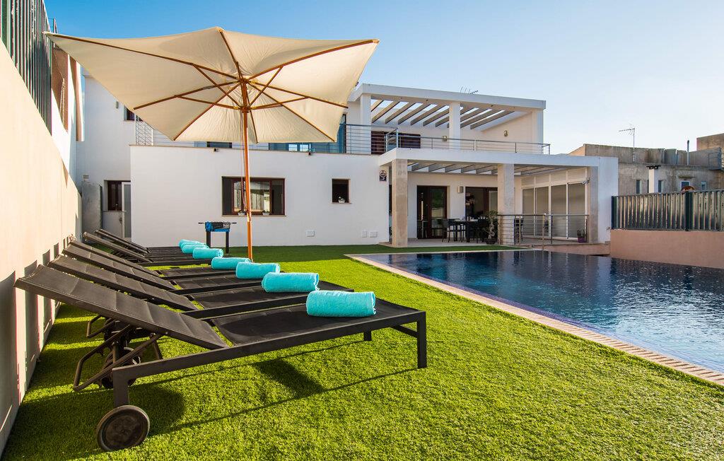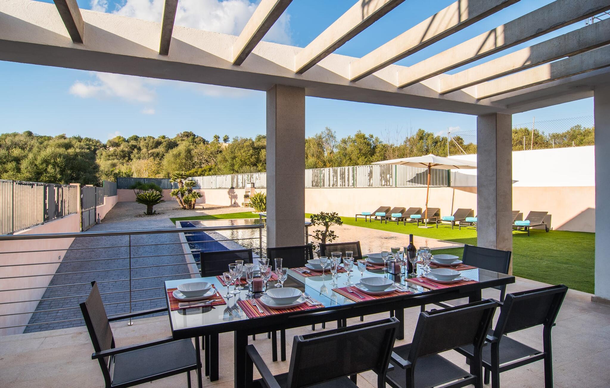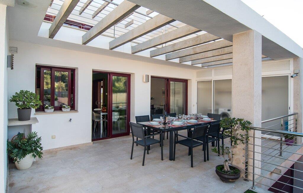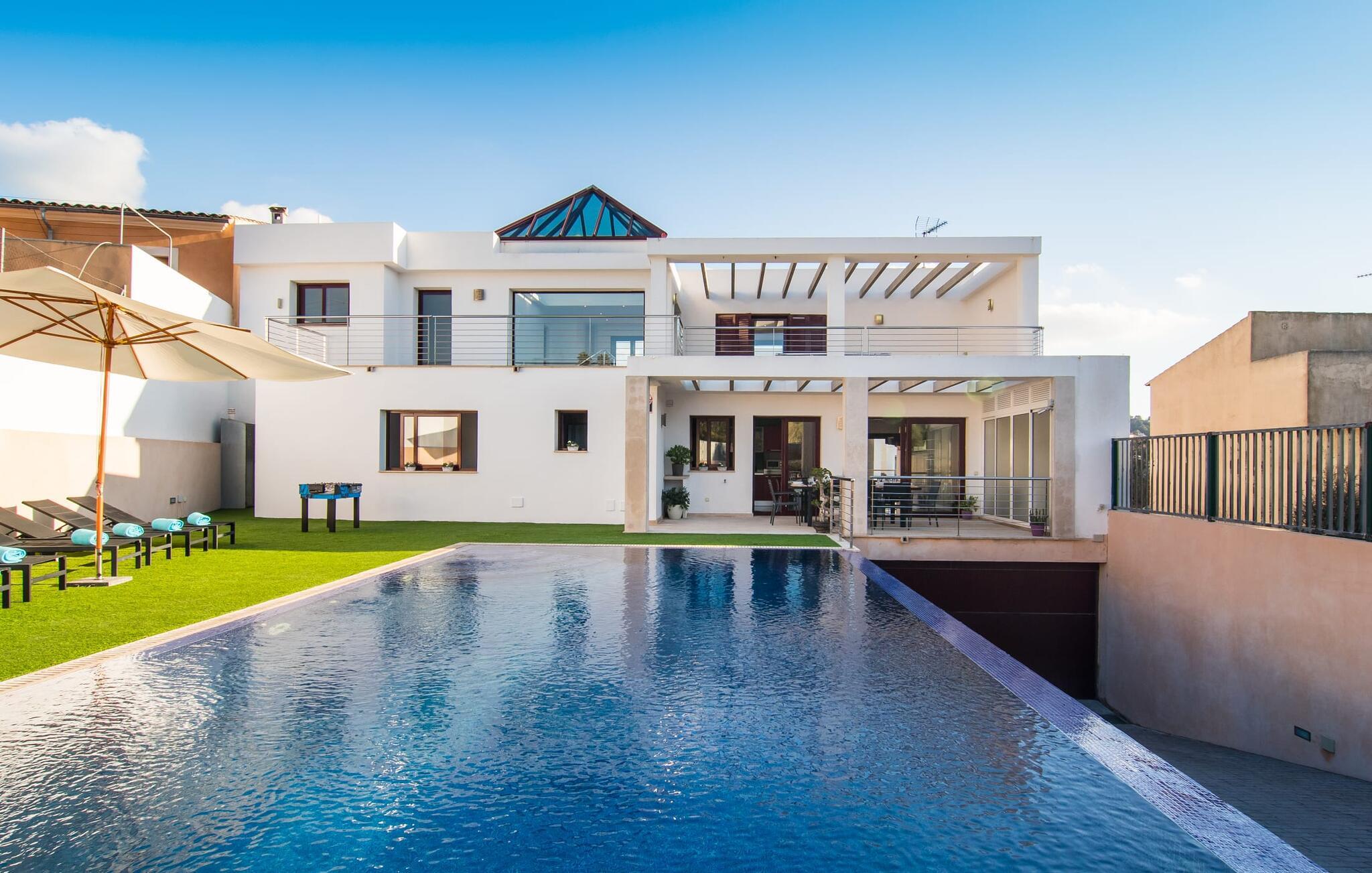 Har I en passion for moderne arkitektur? Kan I lide store, lyse rum og klare linjer? Og værdsætter I at have alt inden for rækkevidde, når I er på ferie – fra supermarkedet til restauranter og caféer til omfattende indkøbsmuligheder? Så er der en god chance for, at I vil føle jer hjemme i den super smarte villa “Puig Verd”! Det lyse hvide hus med sit spektakulære glastag ligger på en typisk villavej i Felanitx. Fra den overdækkede terrasse med spisebord og stole i stueetagen samt den delvist overdækkede tagterrasse kan I se ud over de skønt grønne omkringliggende bakker - og over den store infinity pool lige bag huset. I kan nyde den varmende sol på komfortable liggestole lige ud til det kølige vand eller fordybe jer i en spændende krimi under parasollen. Blot et par meter væk ligger den in-house grill, som inviterer jer til at tilberede kulinariske delikatesser i det fri. Og hvis I vil have lidt motion bagefter, er det bare at gå ovenpå og spille et spil bordtennis på den rummelige tagterrasse. Værelserne i jeres villa strækker sig over to etager. Store vinduer lukker det typiske middelhavslys ind overalt; Denne effekt forstærkes af de sprøde hvide vægge, der findes i de fleste rum. En rummelig spise- og opholdsstue venter på jer i stueetagen: med et elegant glas spisebord med stole, oplyst af en futuristisk udseende lampe og en indbydende sofa med hyggelige puder og et sofabord til snacks og drinks under en hyggelig aften med at se tv . Villaen byder dog på meget mere spænding end et fjernsyn - og bekvemt er der en blød lænestol lige foran den: ejerne af villaen har installeret et kæmpe tropisk akvarium i stuen, med eksotiske, farverige fisk, der svømmer mellem smukke koraller . Det stilrene køkken med højkvalitets hvidevarer er også farverigt indrettet i røde og grønne toner. To smagfuldt indrettede soveværelser og to badeværelser, hvoraf det ene er en-suite, fuldender boligarealet i stueetagen. Ovenpå er der yderligere to soveværelser med private badeværelser. "Puig Verd" ligger midt i Felanitx, en afslappet by i det sydlige Mallorca og også centrum for den næststørste vinregion på øen. Fra jeres sommerhus, der ligger direkte på villavejen, kan I nemt og bekvemt gå ind i landsbyen, shoppe eller besøge en eller to restauranter. Udover de gode egnsvine bør I bestemt prøve de aromatiske kapers, der dyrkes i området. Et besøg på det ugentlige marked om søndagen er altid umagen værd, især de kunstneriske keramiske stykker er meget populære her. Men det omkringliggende område af byen er også interessant: for eksempel klosteret St. Salvador, som ligger på en imponerende bakke i nærheden - I kan endda se det fra huset. Ikke alene er klostret med sin storslåede kirke et besøg værd, panoramaudsigten derfra vil også sikre et uforglemmeligt ferieminde! Hvis I foretrækker at tage til stranden, skal I blot køre cirka 14 km til Cala Murada eller Cala Tropicana. I øvrigt: Cykelforretningen "Els" ligger 100 m fra huset. Hvert ophold i villaen får 10% rabat på alle produkter og tjenester. Der er også gode forbindelser til cykelstierne omkring huset. Har I selv medbragt cykler, kan I parkere dem i det fredede område på den nederste overdækkede terrasse. Villa "Puig Verd" imponerer på alle niveauer: Det supermoderne hus med møbler af høj kvalitet er et sandt højdepunkt for arkitekturelskere, ikke kun med sine delvist overdækkede terrasser på flere niveauer og dets glashvælvede loft. Den scorer også point med sin store, skrånende pool og velholdte græsplæne – og sidst men ikke mindst sin fremragende beliggenhed i den afslappede lille by Felanitx på det sydlige Mallorca. For en dag på stranden skal I kun køre cirka 14 km, for eksempel til Cala Murada.