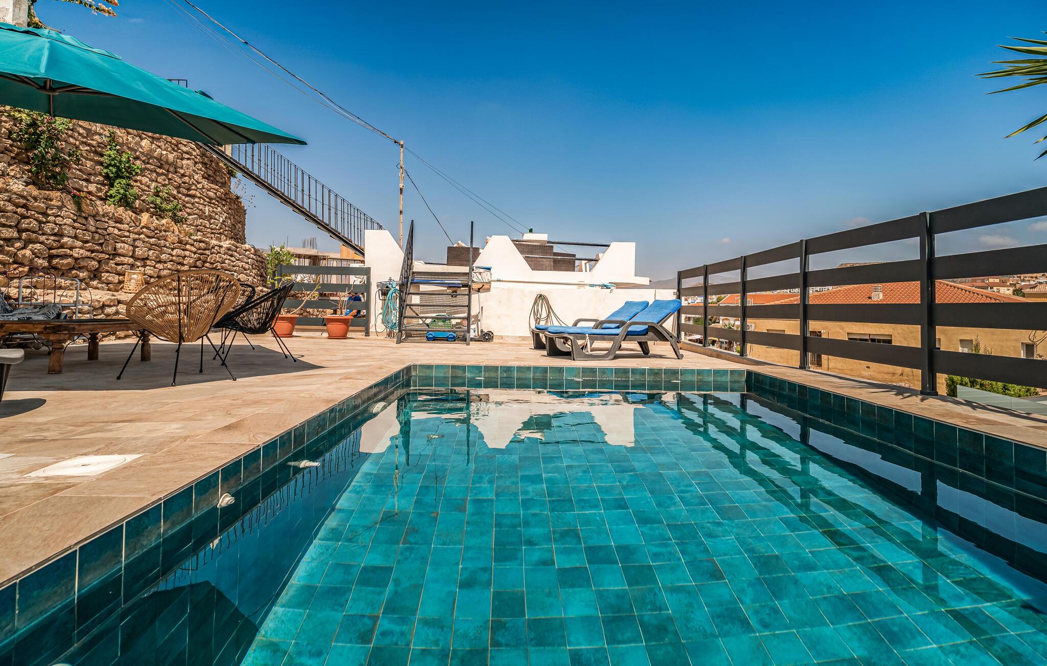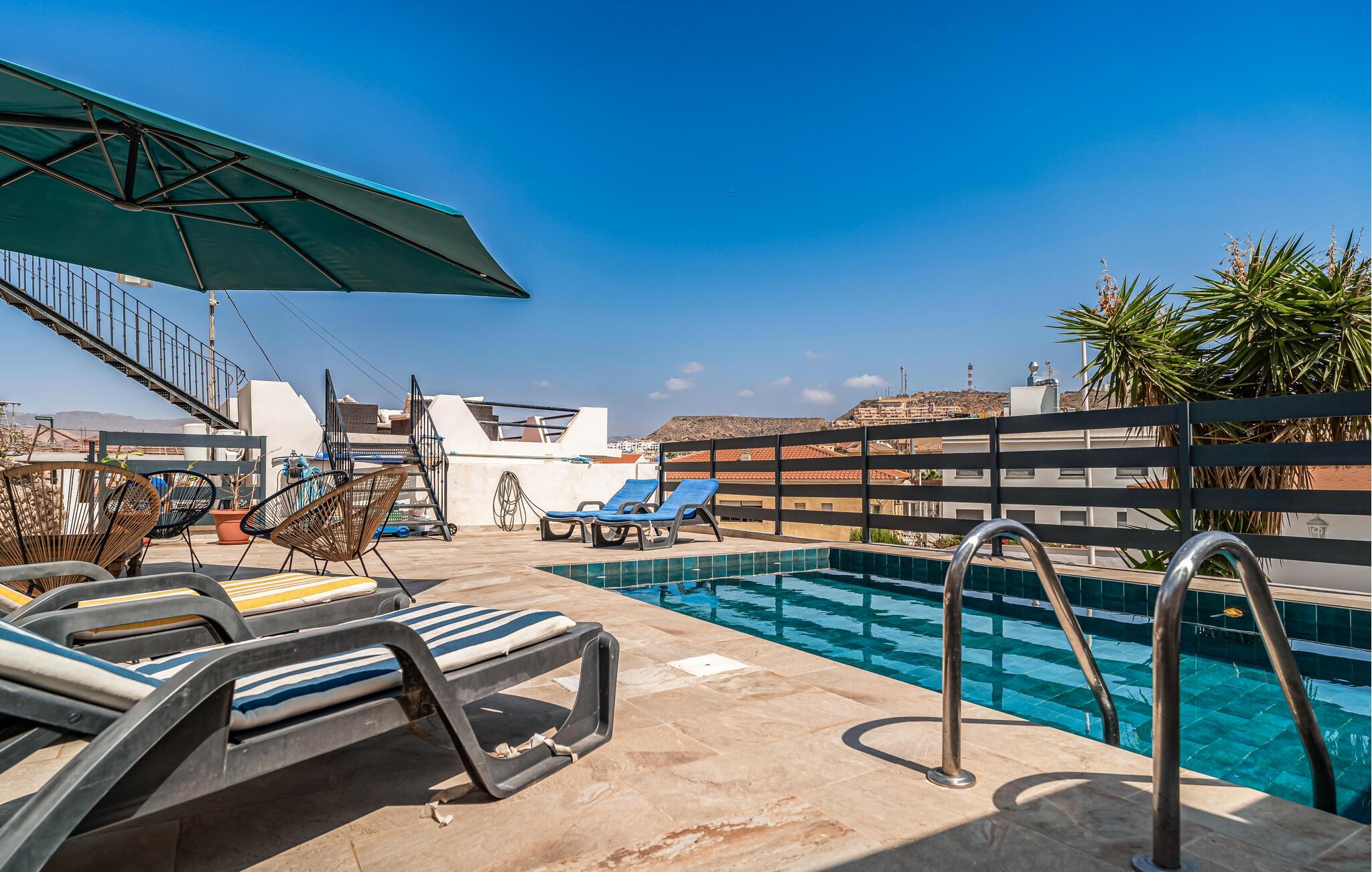 Slap af på den rummelige tagterrasse, som byder på en betagende udsigt over det omkringliggende landskab. Det ekstra terrasseområde med privat pool sørger for afslappende timer i solen.