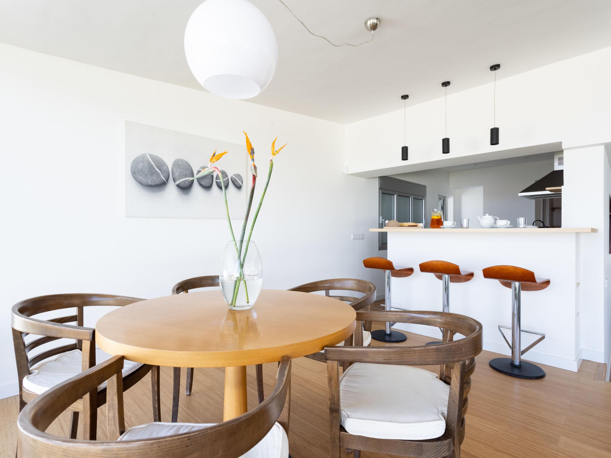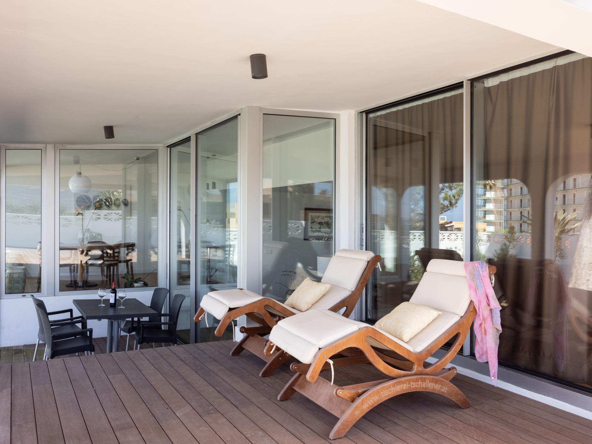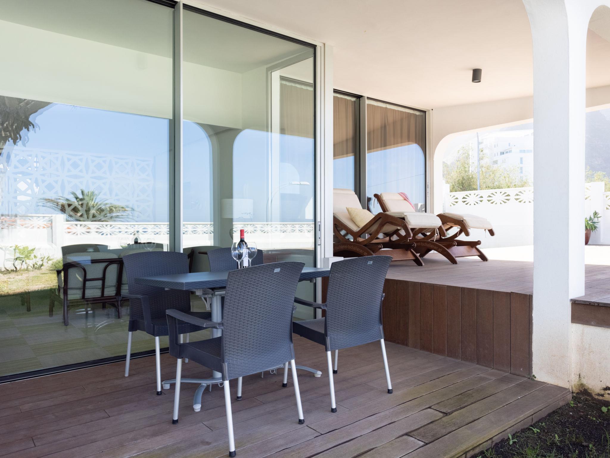 4-room villa 125 m2. Spacious and bright, comfortable and tasteful furnishings: entrance hall. Open large living/dining room with dining table and digital TV. Exit to the garden, to the terrace. 1 room with 1 double bed (180 cm, length 200 cm). 1 room (200 cm, length 200 cm). 1 room with 1 bed (140 cm, length 200 cm). Open kitchen (oven, dishwasher, 4 ceramic glass hob hotplates, toaster, kettle, microwave, electric coffee machine). 2 showers/WC, double hand-basin. No heating option. Terrace furniture, balcony furniture, deck chairs. View of the sea and the countryside. Facilities: safe, iron, children's high chair, baby cot, hair dryer. Internet (WiFi). Please note: non-smoking house. Fire extinguisher, no lift. Smart Tv. CTIC / 69453 / 2020 // Reg. Nr.: ESFCTU00003801000012998700000000000000000000000000008