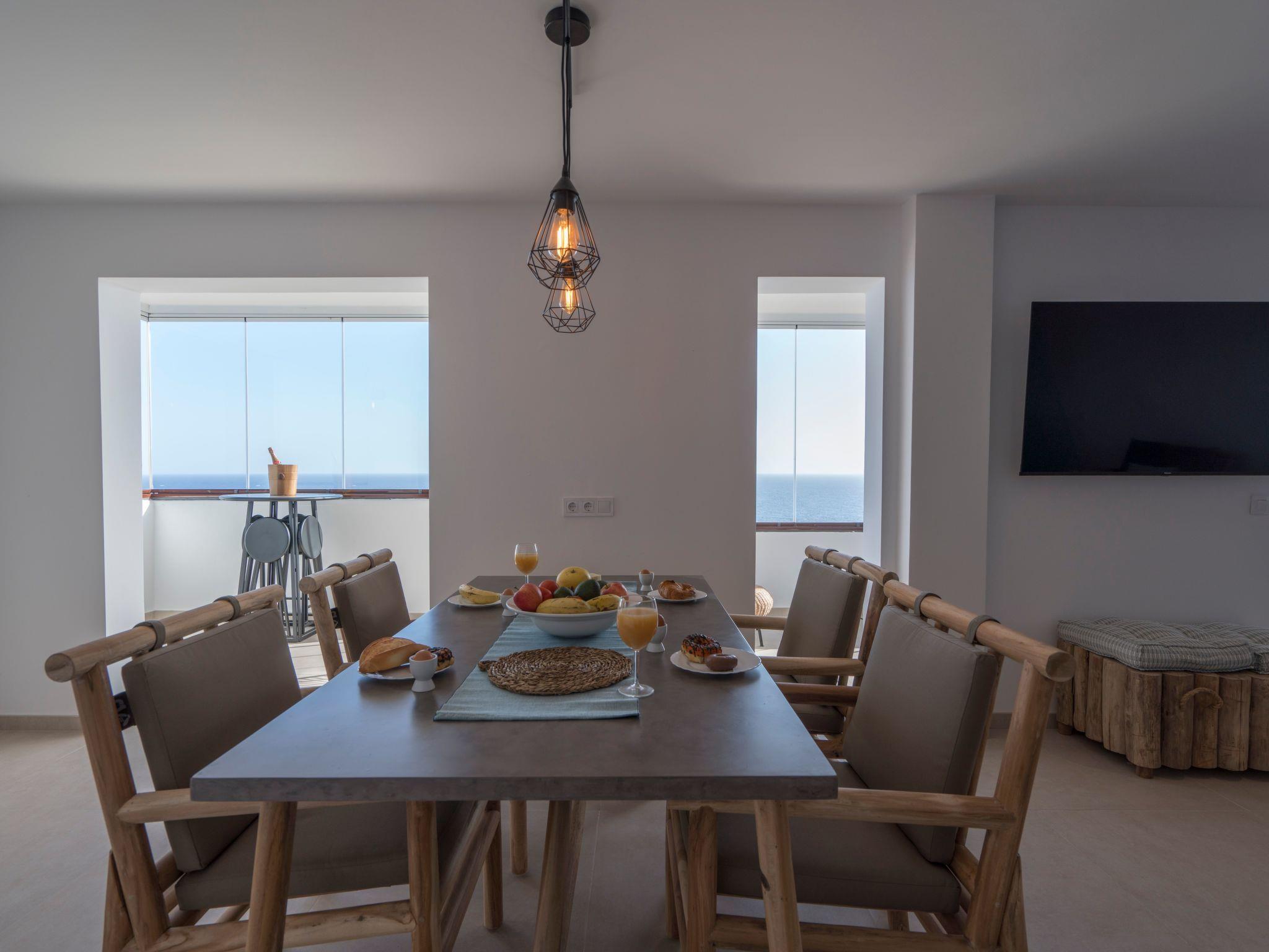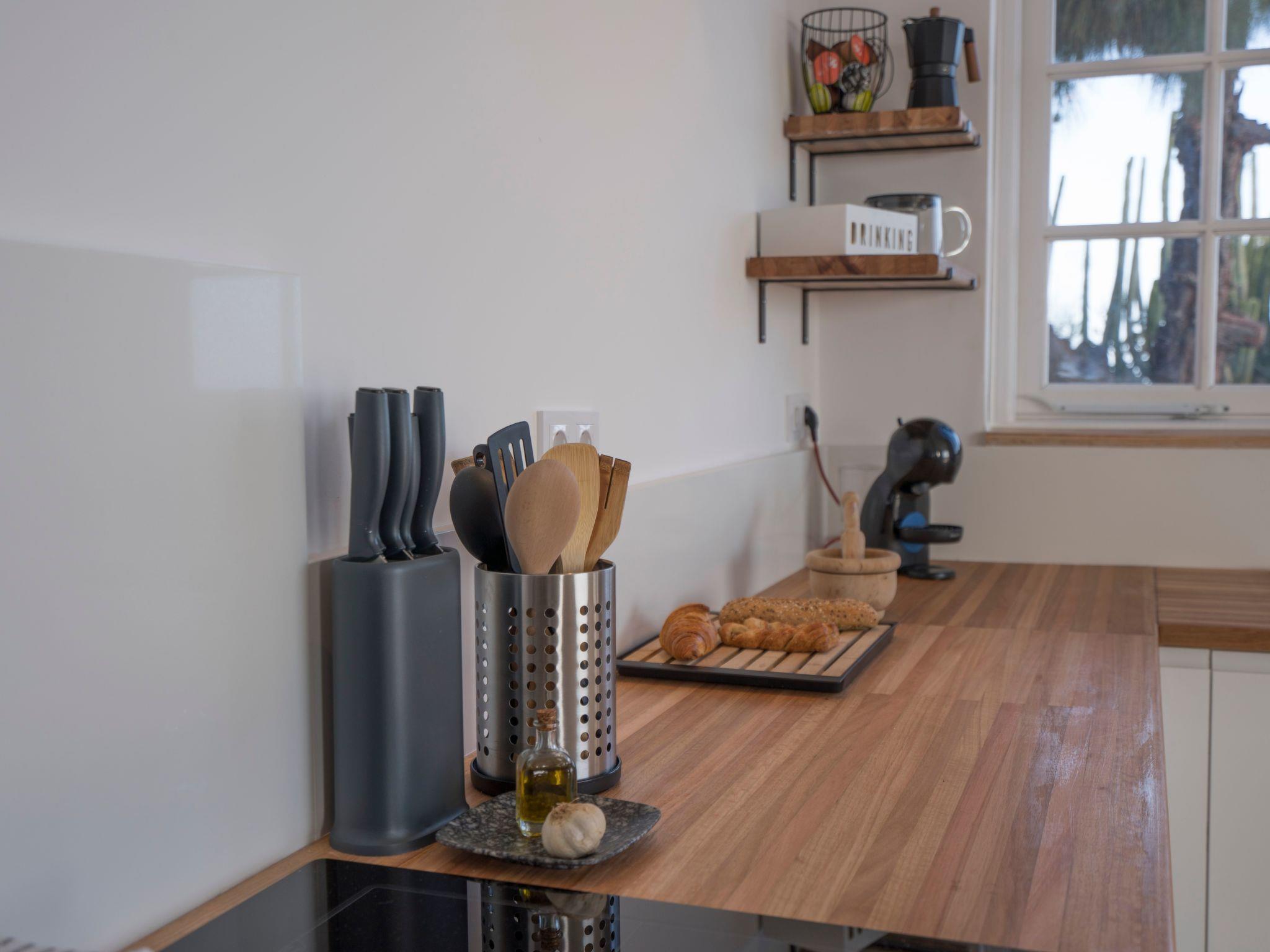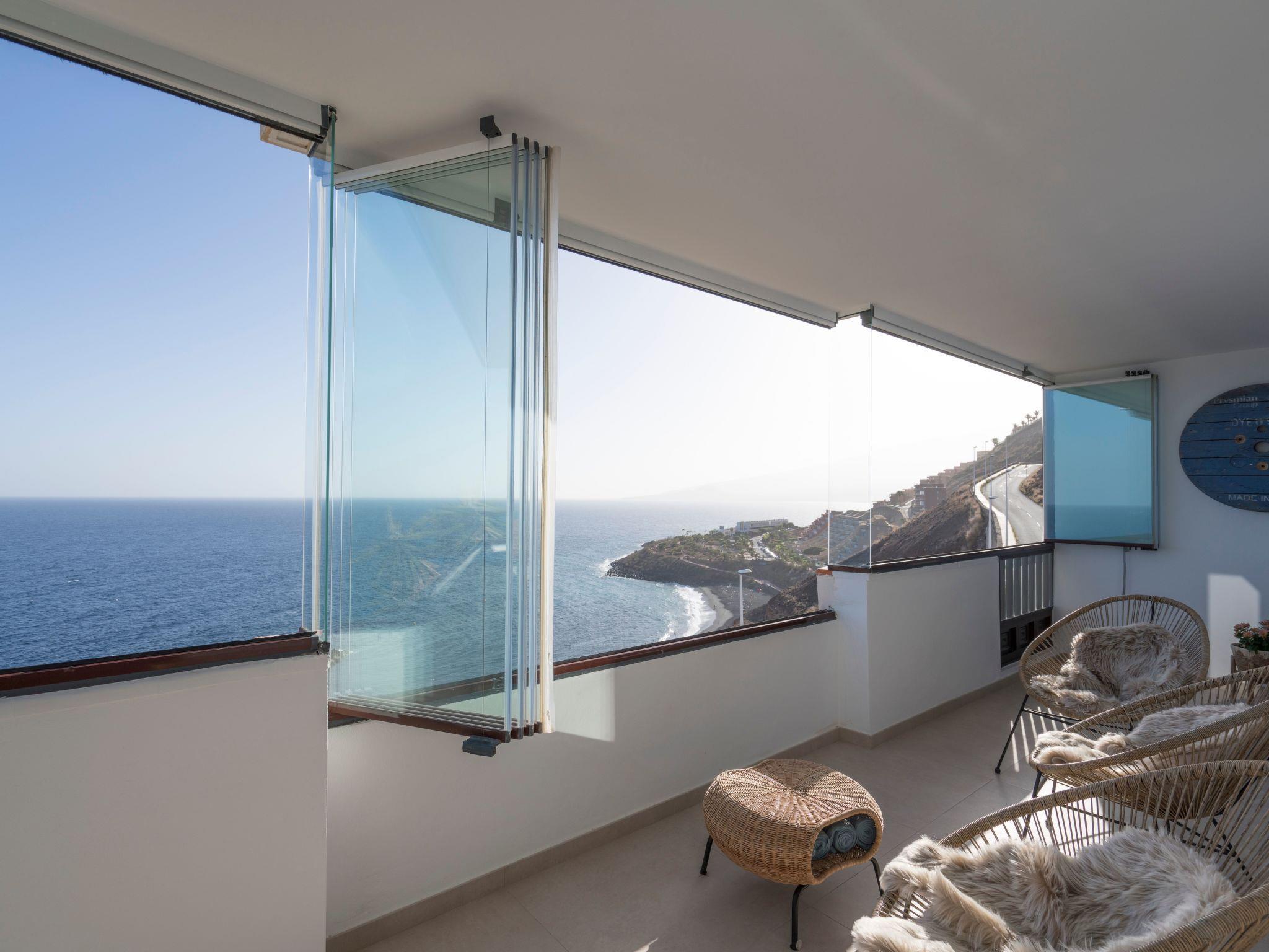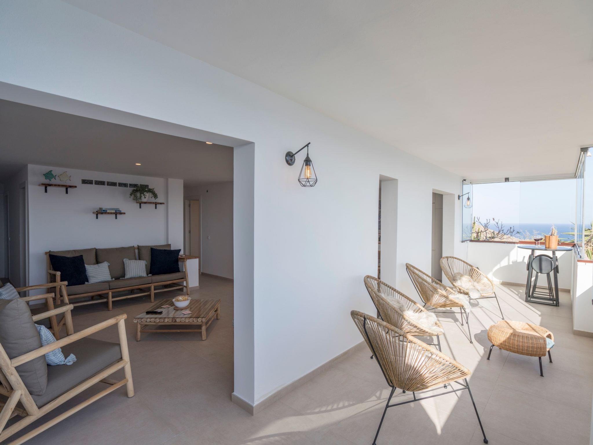 Then you get to the spectacular living area where your eyes immediately get locked on the amazing ocean views. The decoration has natural tones, and the wooden elements give a comfortable feel to the room. The large open plan living room is really bright and has so much natural light entering the room. You have comfortable furniture to relax and watch the large 60-inch TV. With a Chromecast so you can stream all your favourite content from you mobile device (Netflix, Disney+, Spotify etc.) There is a large dining table separating the living and the kitchen area. In the big kitchen you find everything you need for cooking with all the great products you can buy on the island. Pans, pots, cutlery it is all there. Just like a Dolce Gusto coffee machine (and a filter and moka), dishwasher, double sized induction hub, oven microwave and a fridge freezer. Connected to the living room is the incredible balcony which is the crown jewel of the house. Ample 200º views over the village of Bocacangrejo, the ocean and playa la Nea can be enjoyed either from the bar table or the lounge seats. As well you can see the volcanos of Guïmar and the town of Candelaria in the distance. The unique thing of the balcony is that it has glass curtains. They can be held closed to protect you from the ocean breeze or be completely opened to fully enjoy the sunshine. This unique feature makes it possible to enjoy outside living every moment of the day or year.