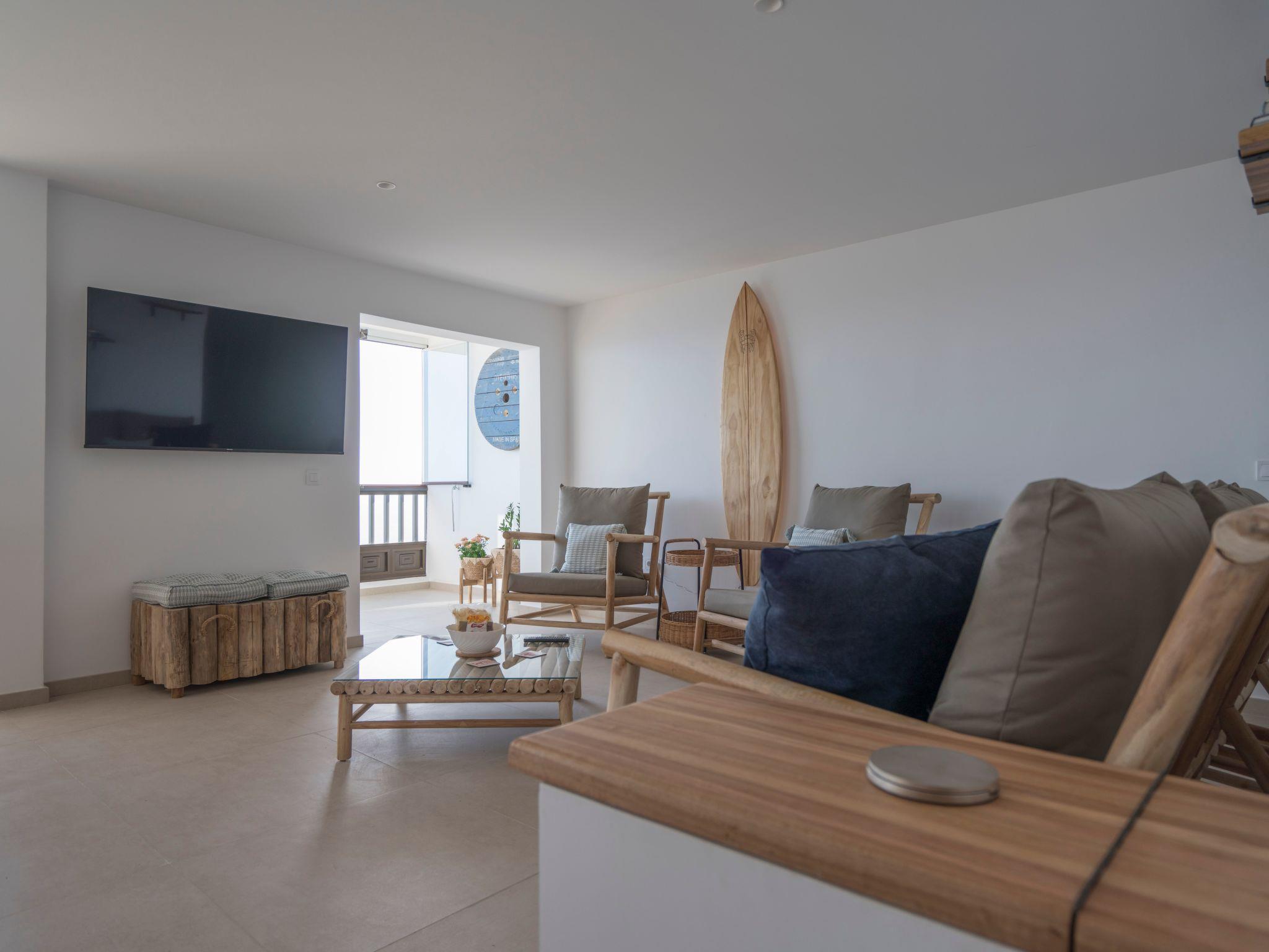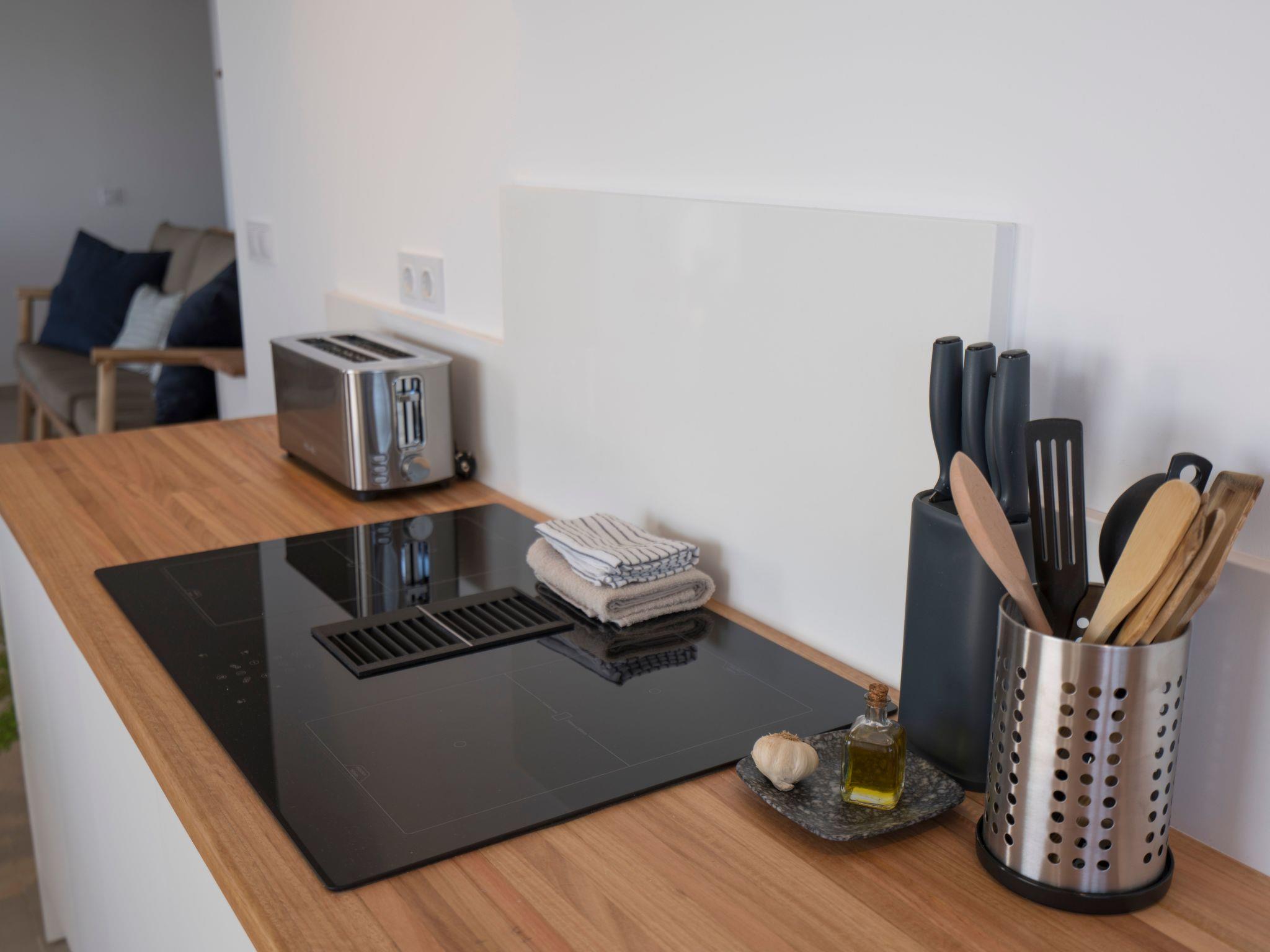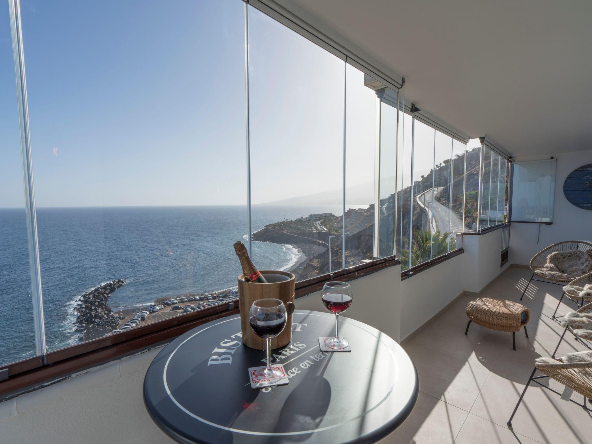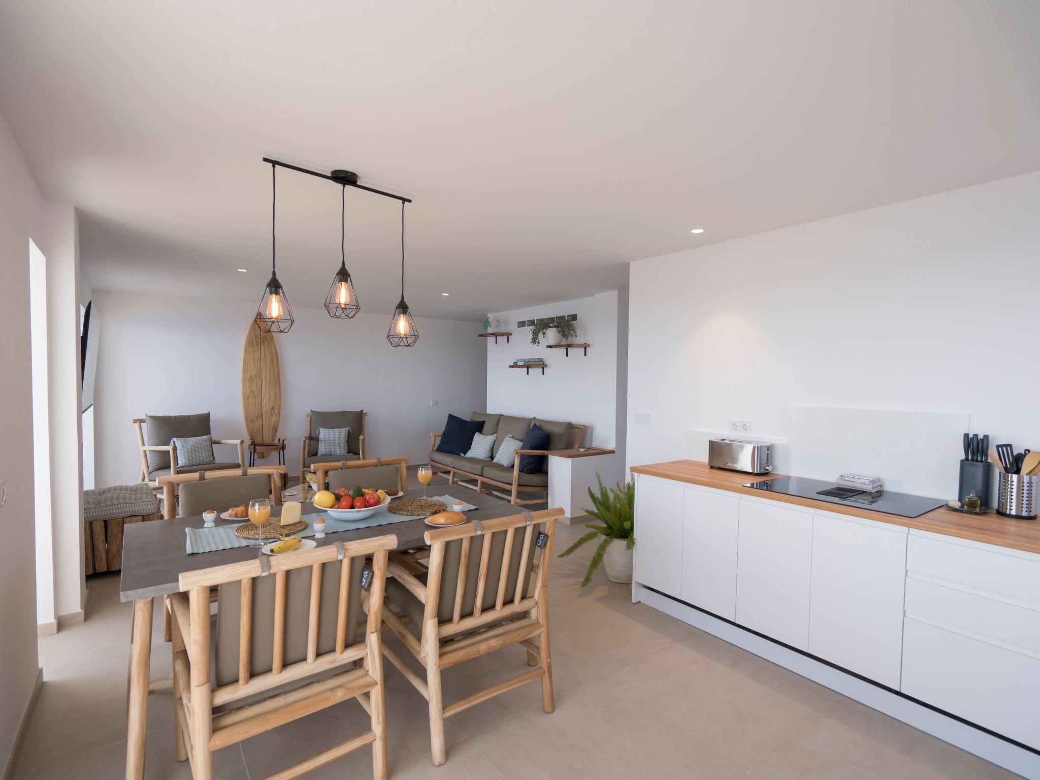 Then you get to the spectacular living area where your eyes immediately get locked on the amazing ocean views. The decoration has natural tones, and the wooden elements give a comfortable feel to the room. The large open plan living room is really bright and has so much natural light entering the room. You have comfortable furniture to relax and watch the large 60-inch TV. With a Chromecast so you can stream all your favourite content from you mobile device (Netflix, Disney+, Spotify etc.) There is a large dining table separating the living and the kitchen area. In the big kitchen you find everything you need for cooking with all the great products you can buy on the island. Pans, pots, cutlery it is all there. Just like a Dolce Gusto coffee machine (and a filter and moka), dishwasher, double sized induction hub, oven microwave and a fridge freezer. Connected to the living room is the incredible balcony which is the crown jewel of the house. Ample 200º views over the village of Bocacangrejo, the ocean and playa la Nea can be enjoyed either from the bar table or the lounge seats. As well you can see the volcanos of Guïmar and the town of Candelaria in the distance. The unique thing of the balcony is that it has glass curtains. They can be held closed to protect you from the ocean breeze or be completely opened to fully enjoy the sunshine. This unique feature makes it possible to enjoy outside living every moment of the day or year.