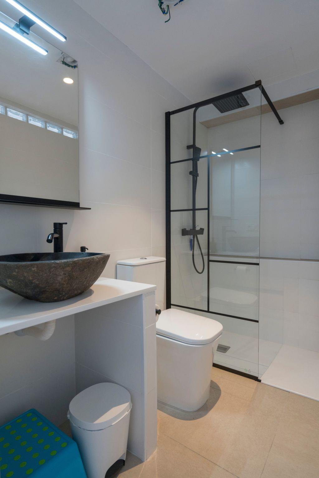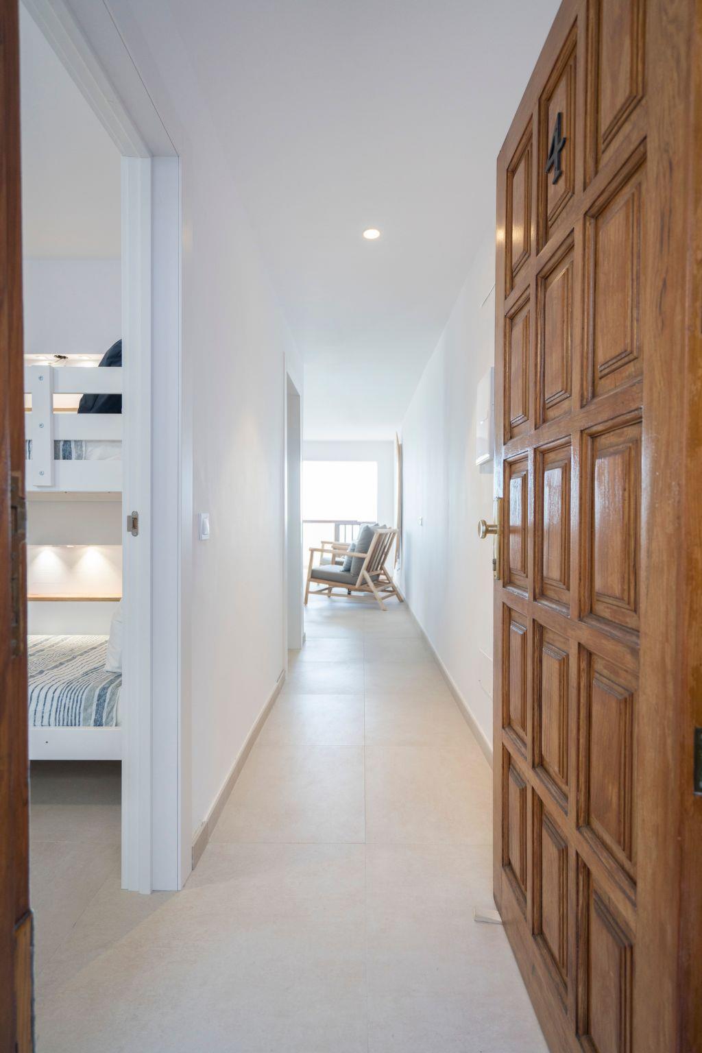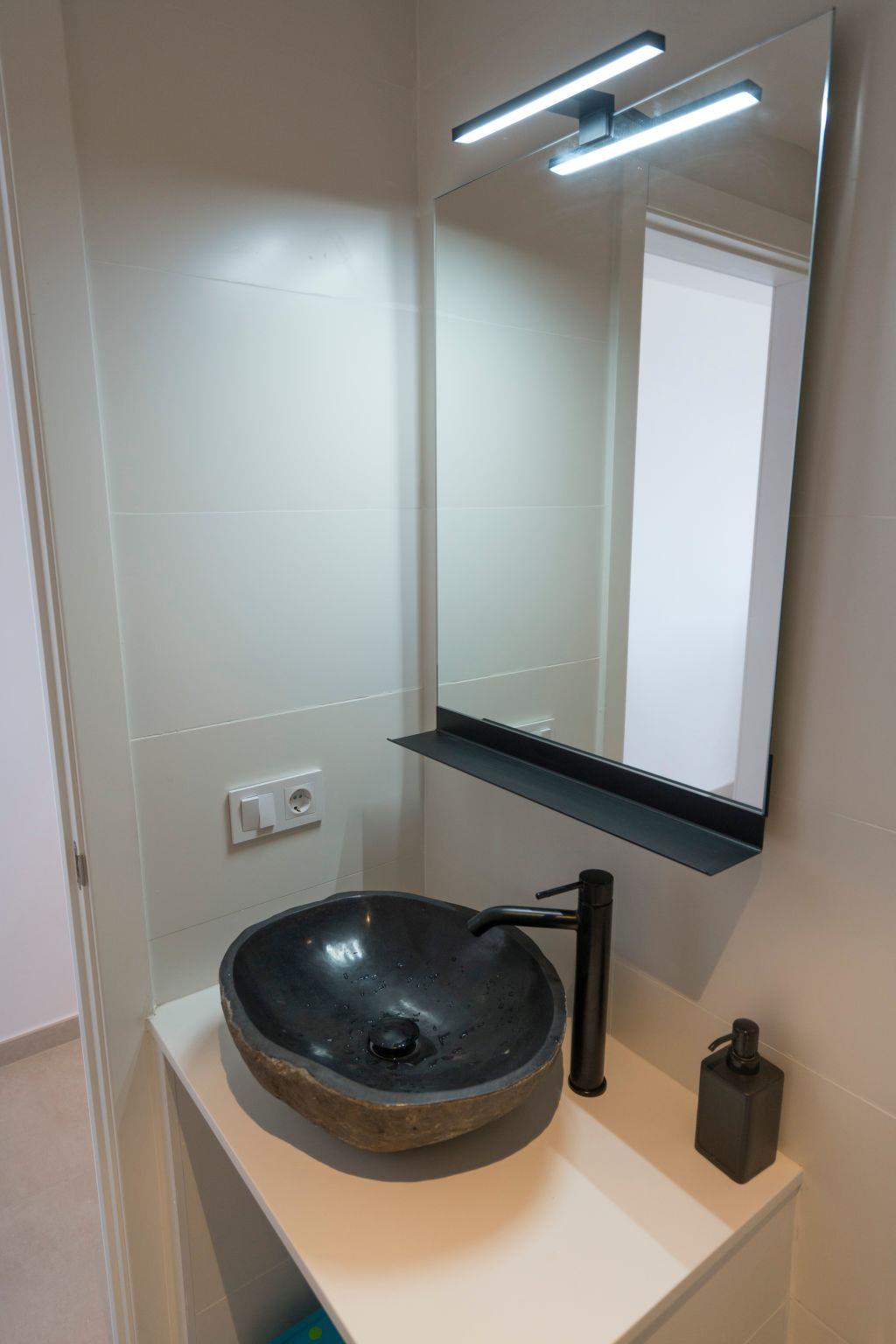 The small residential complex is located right between the small fisherman’s town of Bocacangrejo and the beautiful playa la nea with its black sand, it has its private parking. Already on the parking you get amazed by the great sea views that you have. From the parking you can either take the stairs or the lift to go up one floor. There you find your large 3-bedroom apartment. First there is a private patio on the back of the apartment and then you can enter. The first room is a room with a bunkbed (200cm*90cm) and a desk for remote working. There is a roof ventilator as well. Next to this room there is the first bathroom decorated with a natural stone sink and a rain shower.
