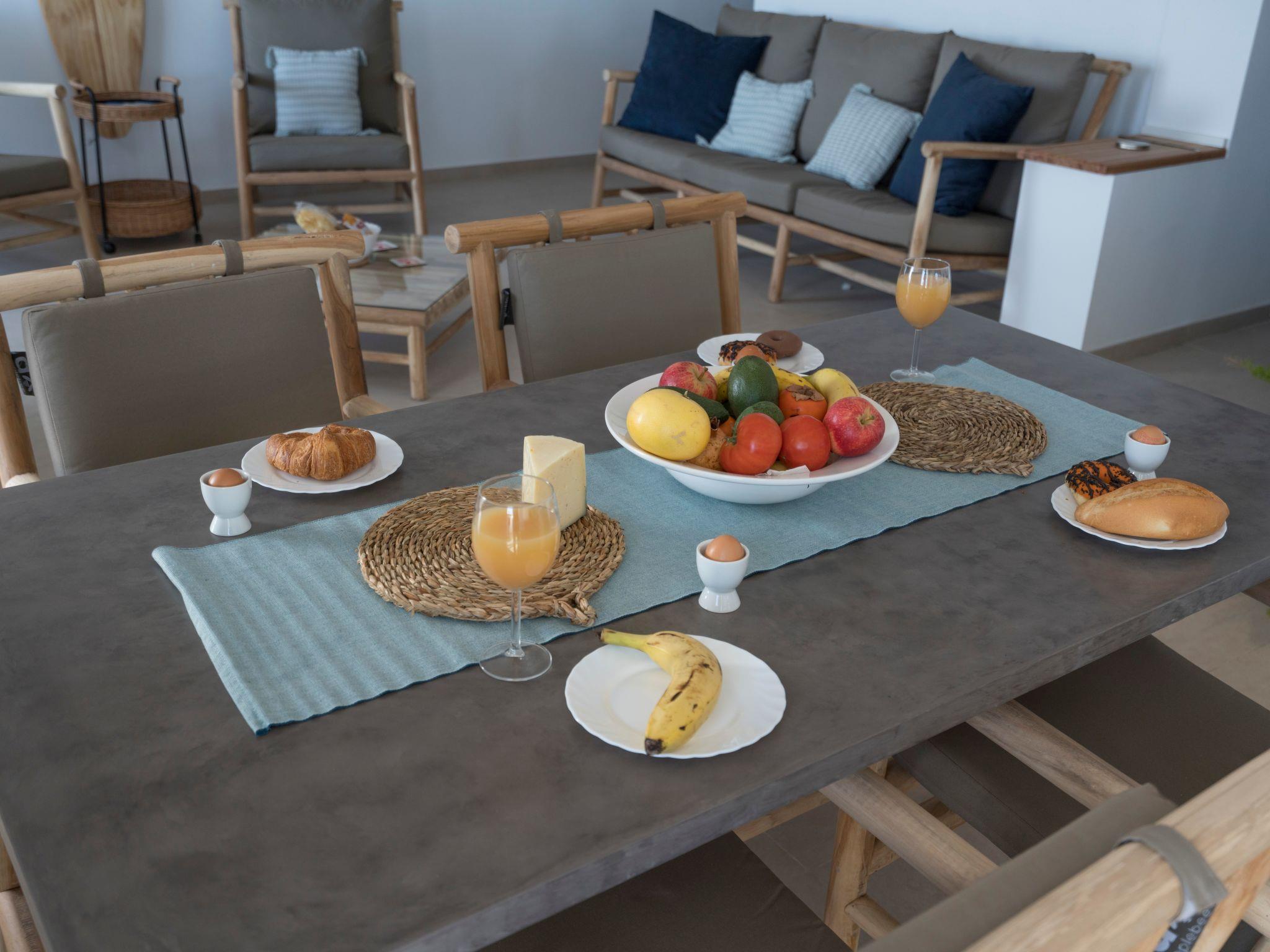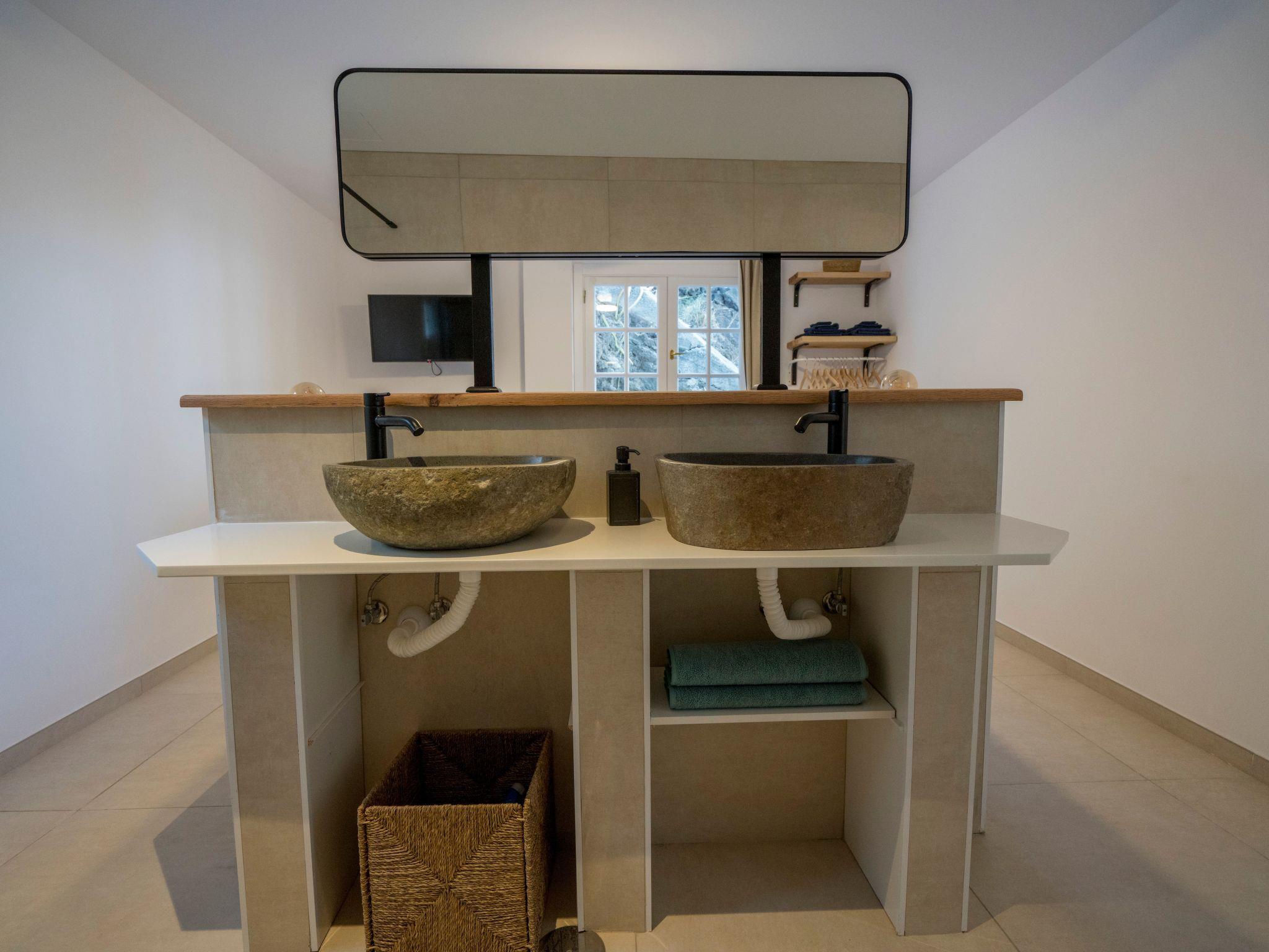 Next to the living room is the second bedroom that is nicely decorated and has two beds (190cm*90cm) that can be used separate or as a comfortable double bed. In this room you have the comfort of a roof ventilator as well. And then you get to the astonishing master bedroom that would not mis stand as a luxury hotel room. You have a king-size bed (200cm*180cm) in an open setting with a design bathroom that is separated by the sleeping part by two big mirrors. Off course you have a walk-in rain shower and again two unique natural stone sinks that refer to the volcanic rocks that you can see from your bedroom window. To top it of there is a roof ventilator and a TV so you can enjoy your precious holiday nights to the fullest!