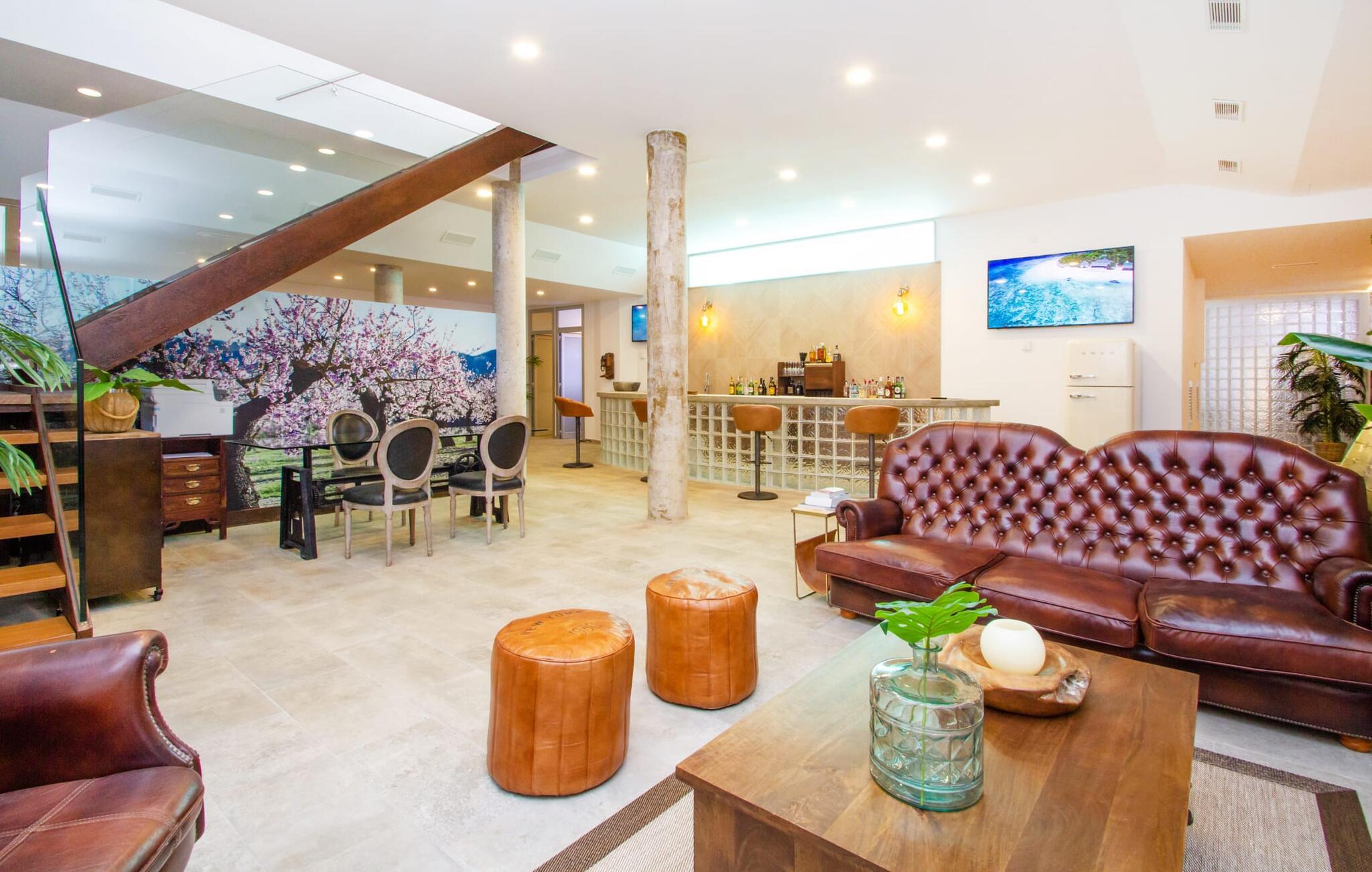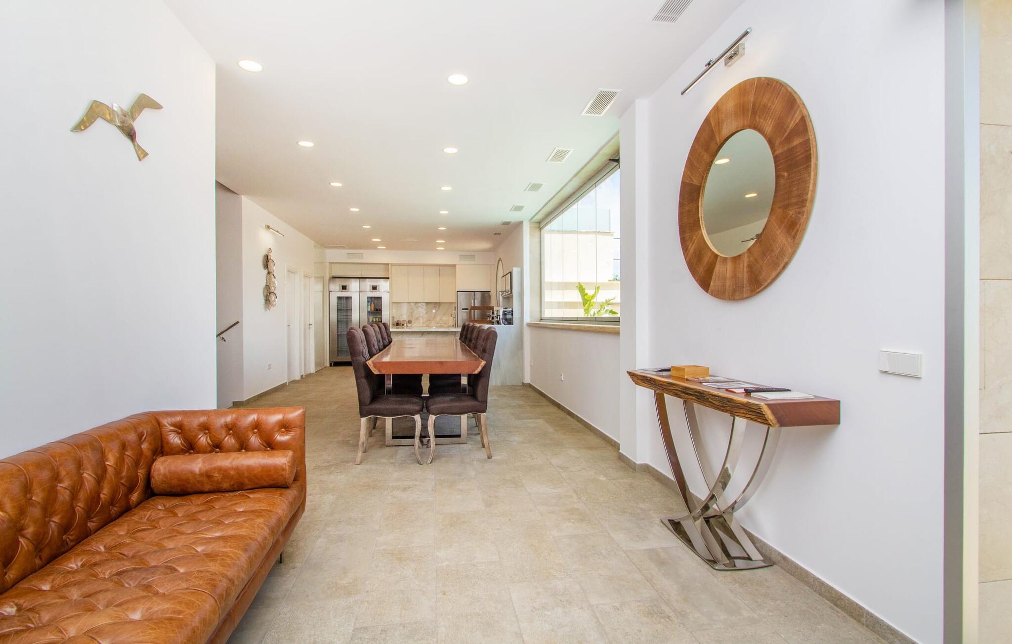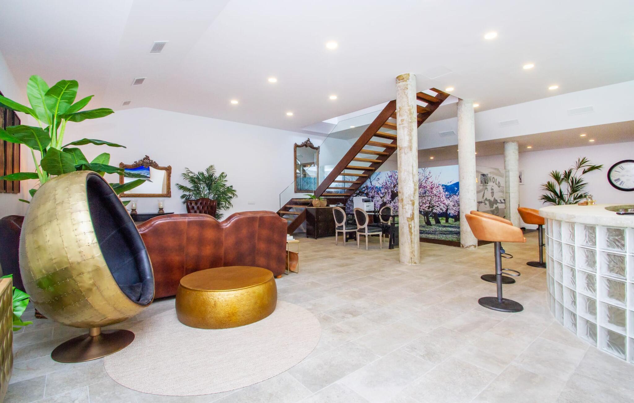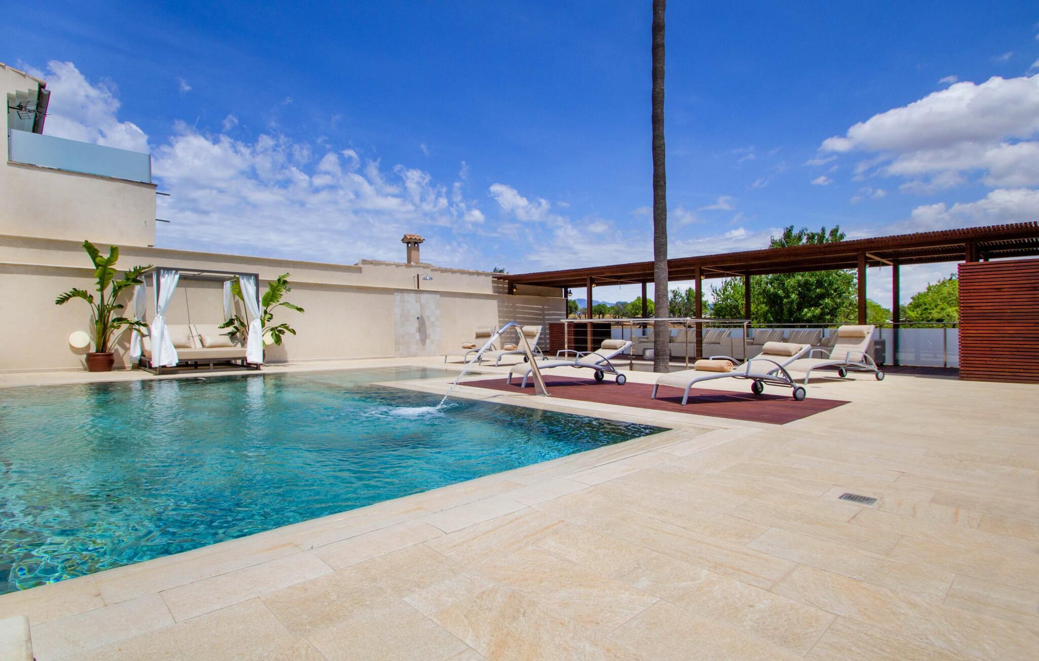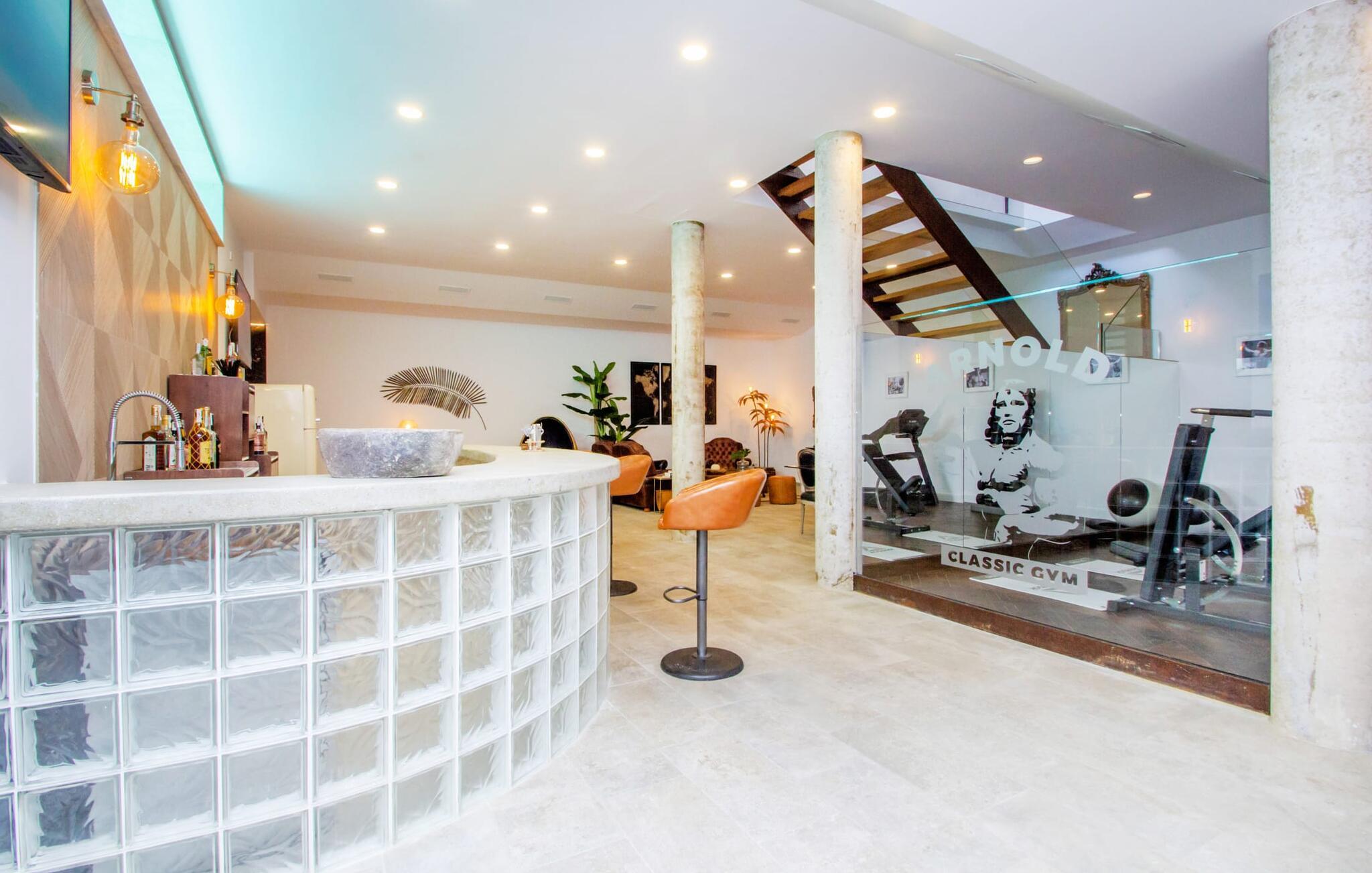 Leder I efter en enestående ejendom med masser af plads og privatliv? Uanset om I ønsker at tilbringe afslappende timer med familie og venner eller planlægger en særlig begivenhed for jeres medarbejdere eller forretningspartnere: "Rainbow"-villaen imponerer ikke kun med sine møbler, som ikke lader noget tilbage at ønske. På grund af dets moderne, puristiske design og udsatte beliggenhed er det også en af de mest eksklusive boliger på øen. Det 400 m² store udendørsareal har en enorm, delvist overdækket poolterrasse med komfortable udendørs sofaer, liggestole i balinesisk stil, liggestole og en pool. Terrassen er ikke synlig udefra: Nyd en helt unik atmosfære her! I kan fremtrylle jeres egne kreationer i poolbaren med et integreret køleskab: fra frossen juice til sundowners, forkæl jeres familie og venner med kølige drinks. Lige overfor er der herretoilet med 2 håndvaske og omklædningsrum. Øverste etage værelser på øverste etage i jeres villa har desuden udgang til en stilfuld terrasse med loungemøbler, hvorfra I har en fantastisk udsigt ud over den brede slette. Kan det ikke være mere? Vent og se. For nu vender vi os til det sofistikerede interiør på 800 m², som har et par overraskelser i vente. Helt fra starten er hele huset fuldt klimatiseret, og I kan individuelt indstille den ønskede temperatur i hvert rum. Forarbejdningen af de fineste materialer og et ekstraordinært design gør dette hus så specielt. I stueetagen finder I den åbne opholds- og spisestue med sofahjørne, et stort spisebord, der også kan bruges som konferencebord, samt et fuldt udstyret køkken. Store vinduespartier slipper masser af lys ind og skaber en luftig atmosfære. Der er fire komfortabelt indrettede soveværelser med dobbeltsenge på denne etage. Hvert værelse i huset har sit eget badeværelse. Disse er enten en-suite eller integreret direkte i rummets åbne arkitektur. Fire yderligere soveværelser ovenpå har adgang til deres egen private terrasse. I kælderen finder I endnu en opholdsstue med sofaer og liggestole, et fladskærms-tv, en bar og et fitnesscenter, der nemt lever op til studiets standarder. Et stort udvalg af fitnessudstyr er tilgængeligt til jeres træning. Der er også fire soveværelser med luksuriøse badeværelser på denne etage. I kan holde forbindelsen via WiFi i hele huset. Villaen er beliggende nord for Palma med en eksklusiv beliggenhed midt i et charmerende boligområde. Byens centrum af denne livlige metropol kan nås på kun ti minutter i bil. Udforsk de smalle gader med smukke butikker, restauranter og tapasbarer eller slentre forbi de imponerende yachter og sejlbåde ved havnen. Den imponerende La Seu-katedral blev bygget i 1200-tallet og er et skinnende blikfang om aftenen og ved daggry. Lige ved siden af ligger Almudaina-paladset, som tilhører den spanske kongefamilie. Palma-bugten med sine lange, let skrånende sandstrande grænser op til byen og er ideel for familier. Ejendommen scorer yderligere pluspoint på grund af dens nærhed til lufthavnen og den korte ankomsttid. Takket være dens centrale beliggenhed er I nemt forbundet til hele øen. Son Vida og Son Termes golfbaner kan nås på kun 15 minutter. Fra jeres villa kan I slentre til et par gode restauranter. Beliggende nord for Palma, er denne ejendom tæt på det pulserende liv i hovedstaden og alligevel det perfekte tilflugtssted for en afslappende tid med venner. jeres drømmevilla ligger i et roligt boligområde, hvorfra I kan nå den historiske gamle bydel eller Playa de Palma på få minutter. Takket være det veludviklede transportnetværk kan I nå Serra de Tramuntana på ingen tid: UNESCO World Heritage Site tilbyder vandrere og cyklister en hidtil uset variation. Bemærk venligst, at denne ejendom ikke accepterer ungdomsgrupper eller polterabender. En ungdomsgruppe på denne ejendom består af personer på 25 år eller derunder. Book ikke denne ejendom, hvis I er en ungdomsgruppe eller en polterabendgruppe, da jeres reservation vil blive afvist, når den er booket, hvilket også kan være tilfældet ved ankomst til ejendommen eller under jeres ophold, og I vil ikke modtage en refusion.