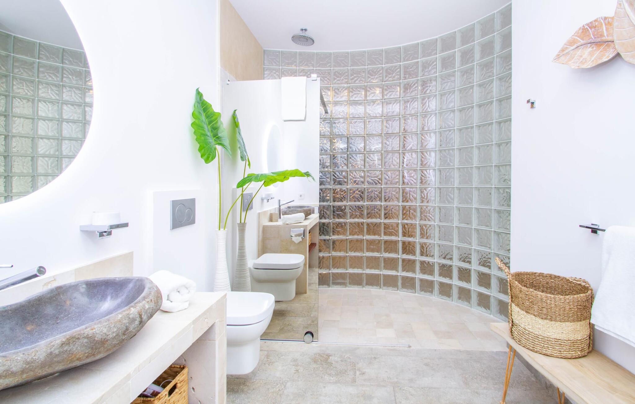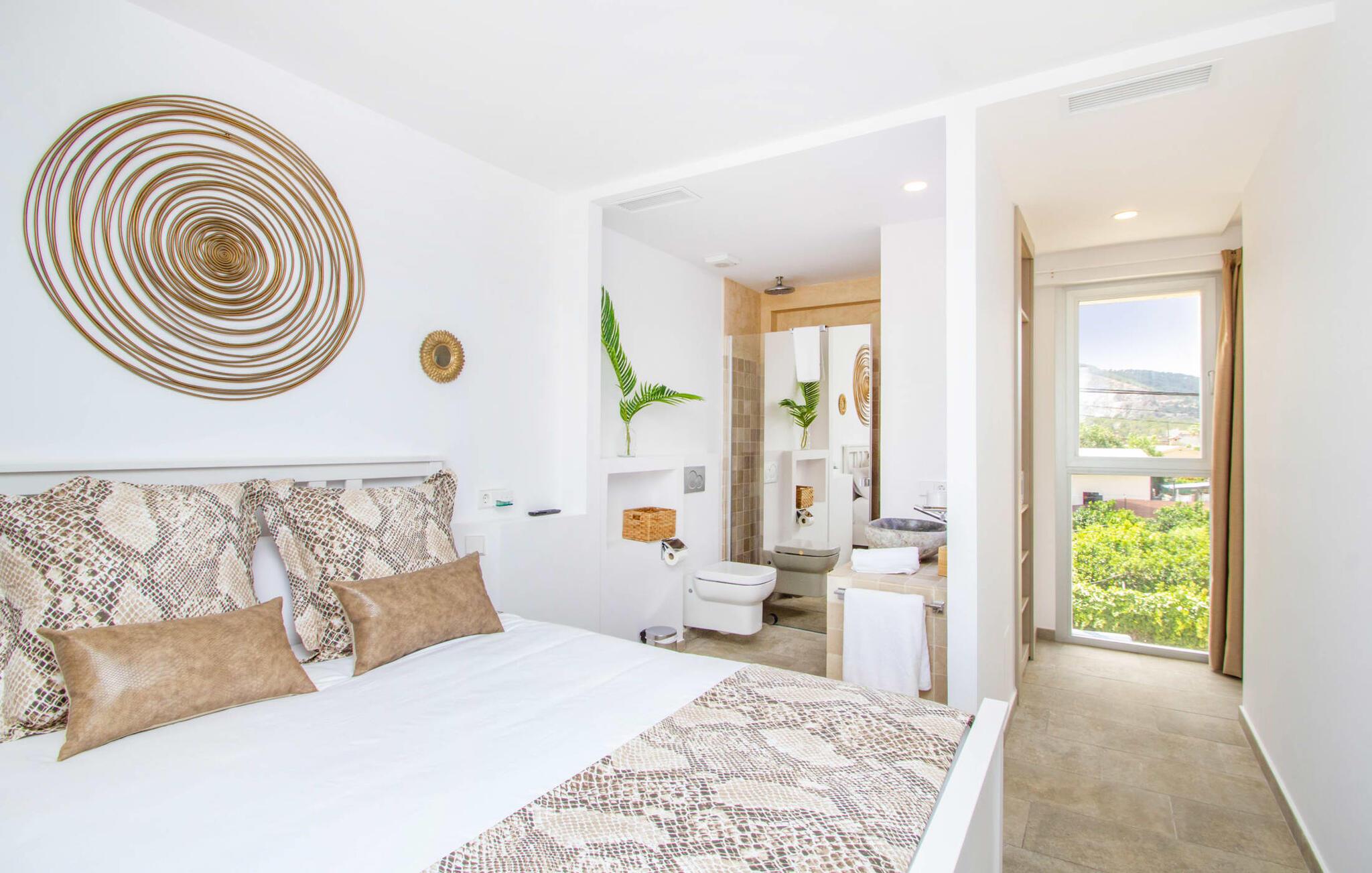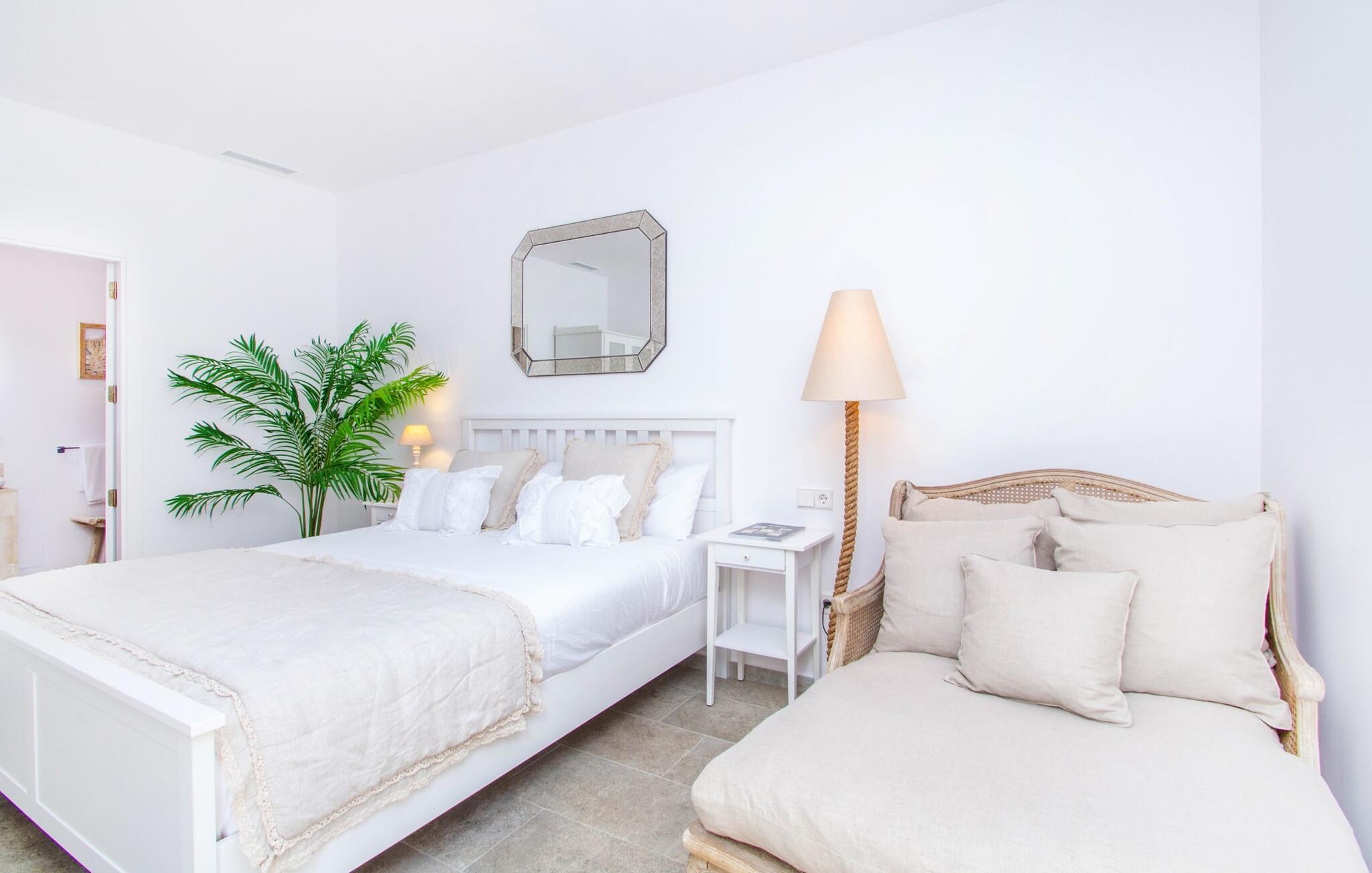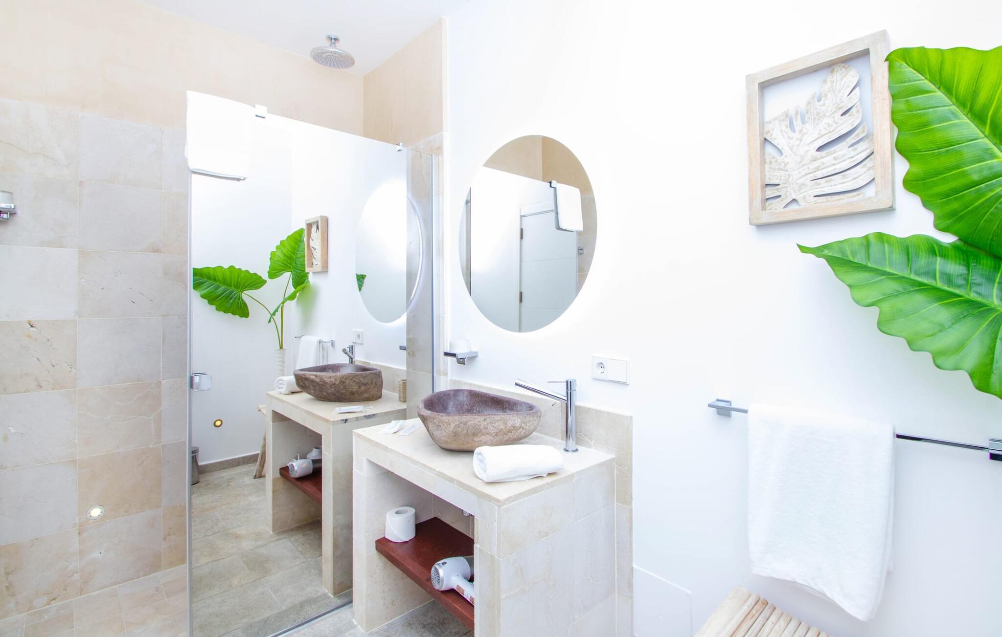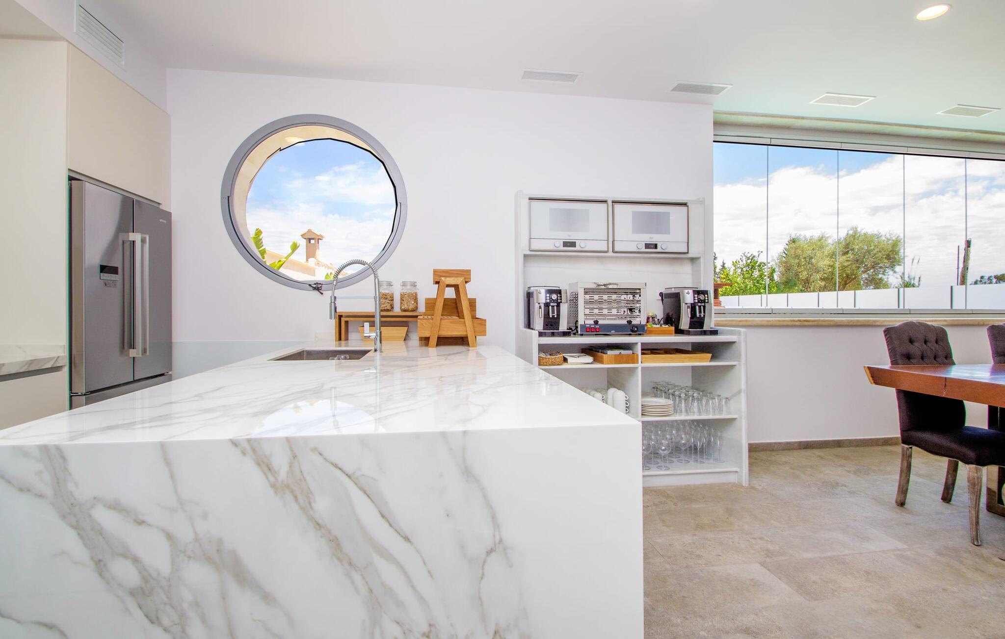 Leder I efter en enestående ejendom med masser af plads og privatliv? Uanset om I ønsker at tilbringe afslappende timer med familie og venner eller planlægger en særlig begivenhed for jeres medarbejdere eller forretningspartnere: "Rainbow"-villaen imponerer ikke kun med sine møbler, som ikke lader noget tilbage at ønske. På grund af dets moderne, puristiske design og udsatte beliggenhed er det også en af de mest eksklusive boliger på øen. Det 400 m² store udendørsareal har en enorm, delvist overdækket poolterrasse med komfortable udendørs sofaer, liggestole i balinesisk stil, liggestole og en pool. Terrassen er ikke synlig udefra: Nyd en helt unik atmosfære her! I kan fremtrylle jeres egne kreationer i poolbaren med et integreret køleskab: fra frossen juice til sundowners, forkæl jeres familie og venner med kølige drinks. Lige overfor er der herretoilet med 2 håndvaske og omklædningsrum. Øverste etage værelser på øverste etage i jeres villa har desuden udgang til en stilfuld terrasse med loungemøbler, hvorfra I har en fantastisk udsigt ud over den brede slette. Kan det ikke være mere? Vent og se. For nu vender vi os til det sofistikerede interiør på 800 m², som har et par overraskelser i vente. Helt fra starten er hele huset fuldt klimatiseret, og I kan individuelt indstille den ønskede temperatur i hvert rum. Forarbejdningen af de fineste materialer og et ekstraordinært design gør dette hus så specielt. I stueetagen finder I den åbne opholds- og spisestue med sofahjørne, et stort spisebord, der også kan bruges som konferencebord, samt et fuldt udstyret køkken. Store vinduespartier slipper masser af lys ind og skaber en luftig atmosfære. Der er fire komfortabelt indrettede soveværelser med dobbeltsenge på denne etage. Hvert værelse i huset har sit eget badeværelse. Disse er enten en-suite eller integreret direkte i rummets åbne arkitektur. Fire yderligere soveværelser ovenpå har adgang til deres egen private terrasse. I kælderen finder I endnu en opholdsstue med sofaer og liggestole, et fladskærms-tv, en bar og et fitnesscenter, der nemt lever op til studiets standarder. Et stort udvalg af fitnessudstyr er tilgængeligt til jeres træning. Der er også fire soveværelser med luksuriøse badeværelser på denne etage. I kan holde forbindelsen via WiFi i hele huset. Villaen er beliggende nord for Palma med en eksklusiv beliggenhed midt i et charmerende boligområde. Byens centrum af denne livlige metropol kan nås på kun ti minutter i bil. Udforsk de smalle gader med smukke butikker, restauranter og tapasbarer eller slentre forbi de imponerende yachter og sejlbåde ved havnen. Den imponerende La Seu-katedral blev bygget i 1200-tallet og er et skinnende blikfang om aftenen og ved daggry. Lige ved siden af ligger Almudaina-paladset, som tilhører den spanske kongefamilie. Palma-bugten med sine lange, let skrånende sandstrande grænser op til byen og er ideel for familier. Ejendommen scorer yderligere pluspoint på grund af dens nærhed til lufthavnen og den korte ankomsttid. Takket være dens centrale beliggenhed er I nemt forbundet til hele øen. Son Vida og Son Termes golfbaner kan nås på kun 15 minutter. Fra jeres villa kan I slentre til et par gode restauranter. Beliggende nord for Palma, er denne ejendom tæt på det pulserende liv i hovedstaden og alligevel det perfekte tilflugtssted for en afslappende tid med venner. jeres drømmevilla ligger i et roligt boligområde, hvorfra I kan nå den historiske gamle bydel eller Playa de Palma på få minutter. Takket være det veludviklede transportnetværk kan I nå Serra de Tramuntana på ingen tid: UNESCO World Heritage Site tilbyder vandrere og cyklister en hidtil uset variation. Bemærk venligst, at denne ejendom ikke accepterer ungdomsgrupper eller polterabender. En ungdomsgruppe på denne ejendom består af personer på 25 år eller derunder. Book ikke denne ejendom, hvis I er en ungdomsgruppe eller en polterabendgruppe, da jeres reservation vil blive afvist, når den er booket, hvilket også kan være tilfældet ved ankomst til ejendommen eller under jeres ophold, og I vil ikke modtage en refusion.