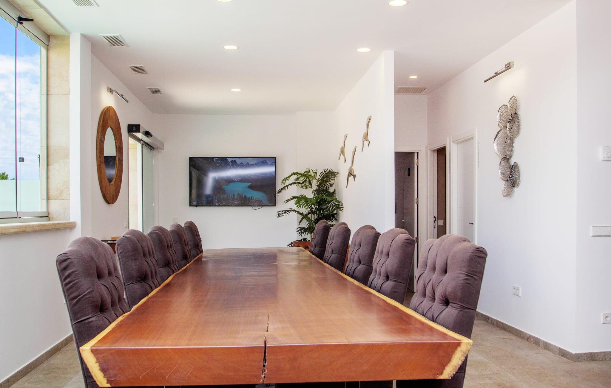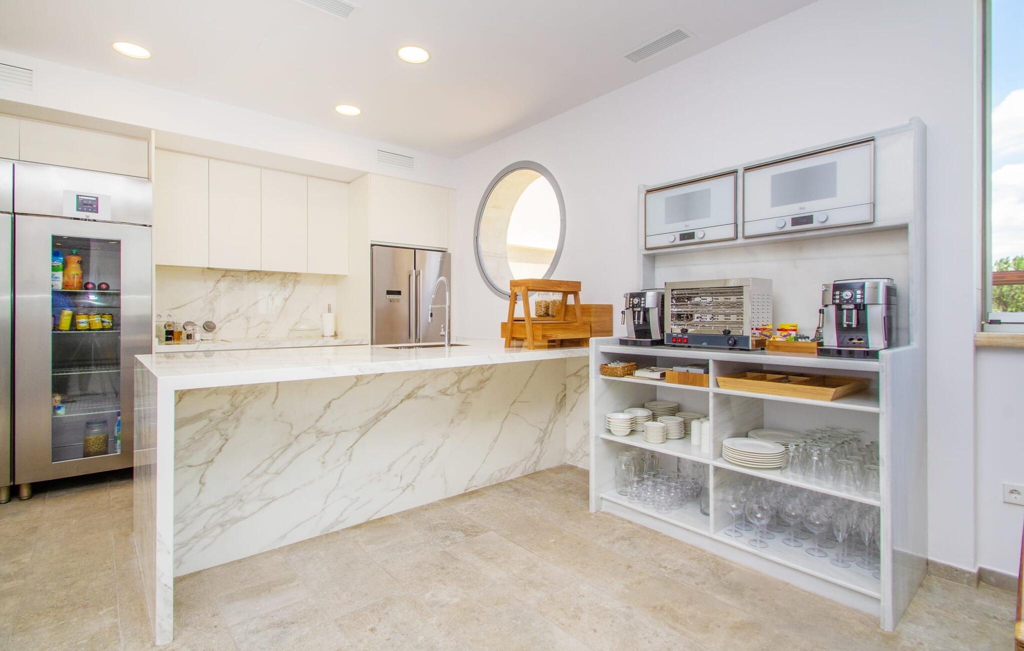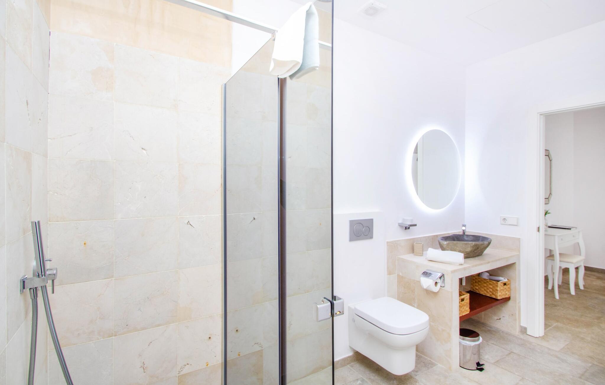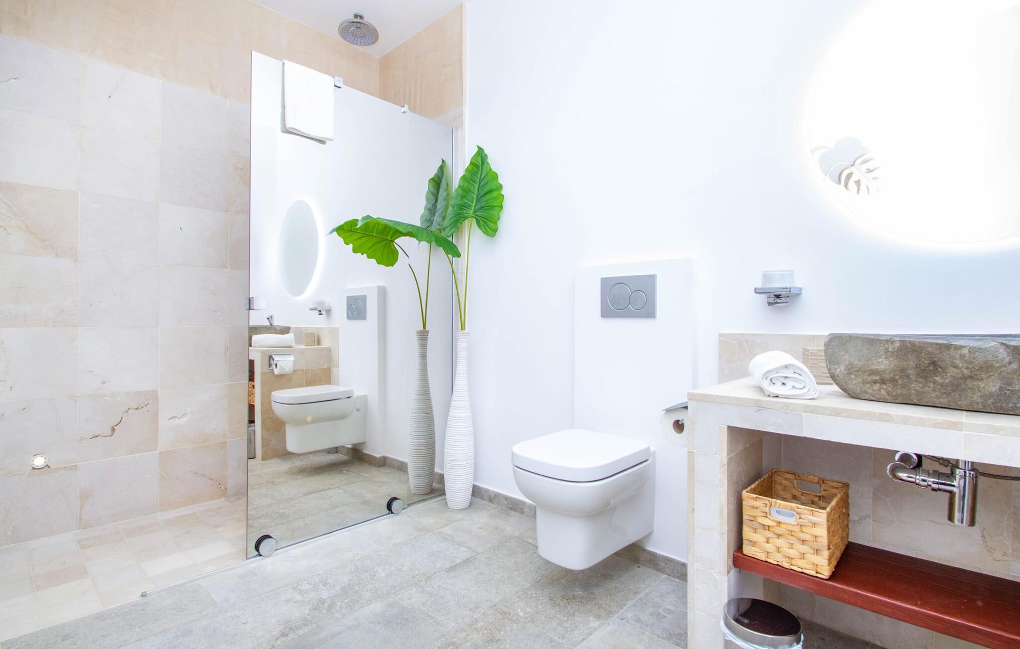 Leder I efter en enestående ejendom med masser af plads og privatliv? Uanset om I ønsker at tilbringe afslappende timer med familie og venner eller planlægger en særlig begivenhed for jeres medarbejdere eller forretningspartnere: "Rainbow"-villaen imponerer ikke kun med sine møbler, som ikke lader noget tilbage at ønske. På grund af dets moderne, puristiske design og udsatte beliggenhed er det også en af de mest eksklusive boliger på øen. Det 400 m² store udendørsareal har en enorm, delvist overdækket poolterrasse med komfortable udendørs sofaer, liggestole i balinesisk stil, liggestole og en pool. Terrassen er ikke synlig udefra: Nyd en helt unik atmosfære her! I kan fremtrylle jeres egne kreationer i poolbaren med et integreret køleskab: fra frossen juice til sundowners, forkæl jeres familie og venner med kølige drinks. Lige overfor er der herretoilet med 2 håndvaske og omklædningsrum. Øverste etage værelser på øverste etage i jeres villa har desuden udgang til en stilfuld terrasse med loungemøbler, hvorfra I har en fantastisk udsigt ud over den brede slette. Kan det ikke være mere? Vent og se. For nu vender vi os til det sofistikerede interiør på 800 m², som har et par overraskelser i vente. Helt fra starten er hele huset fuldt klimatiseret, og I kan individuelt indstille den ønskede temperatur i hvert rum. Forarbejdningen af de fineste materialer og et ekstraordinært design gør dette hus så specielt. I stueetagen finder I den åbne opholds- og spisestue med sofahjørne, et stort spisebord, der også kan bruges som konferencebord, samt et fuldt udstyret køkken. Store vinduespartier slipper masser af lys ind og skaber en luftig atmosfære. Der er fire komfortabelt indrettede soveværelser med dobbeltsenge på denne etage. Hvert værelse i huset har sit eget badeværelse. Disse er enten en-suite eller integreret direkte i rummets åbne arkitektur. Fire yderligere soveværelser ovenpå har adgang til deres egen private terrasse. I kælderen finder I endnu en opholdsstue med sofaer og liggestole, et fladskærms-tv, en bar og et fitnesscenter, der nemt lever op til studiets standarder. Et stort udvalg af fitnessudstyr er tilgængeligt til jeres træning. Der er også fire soveværelser med luksuriøse badeværelser på denne etage. I kan holde forbindelsen via WiFi i hele huset. Villaen er beliggende nord for Palma med en eksklusiv beliggenhed midt i et charmerende boligområde. Byens centrum af denne livlige metropol kan nås på kun ti minutter i bil. Udforsk de smalle gader med smukke butikker, restauranter og tapasbarer eller slentre forbi de imponerende yachter og sejlbåde ved havnen. Den imponerende La Seu-katedral blev bygget i 1200-tallet og er et skinnende blikfang om aftenen og ved daggry. Lige ved siden af ligger Almudaina-paladset, som tilhører den spanske kongefamilie. Palma-bugten med sine lange, let skrånende sandstrande grænser op til byen og er ideel for familier. Ejendommen scorer yderligere pluspoint på grund af dens nærhed til lufthavnen og den korte ankomsttid. Takket være dens centrale beliggenhed er I nemt forbundet til hele øen. Son Vida og Son Termes golfbaner kan nås på kun 15 minutter. Fra jeres villa kan I slentre til et par gode restauranter. Beliggende nord for Palma, er denne ejendom tæt på det pulserende liv i hovedstaden og alligevel det perfekte tilflugtssted for en afslappende tid med venner. jeres drømmevilla ligger i et roligt boligområde, hvorfra I kan nå den historiske gamle bydel eller Playa de Palma på få minutter. Takket være det veludviklede transportnetværk kan I nå Serra de Tramuntana på ingen tid: UNESCO World Heritage Site tilbyder vandrere og cyklister en hidtil uset variation. Bemærk venligst, at denne ejendom ikke accepterer ungdomsgrupper eller polterabender. En ungdomsgruppe på denne ejendom består af personer på 25 år eller derunder. Book ikke denne ejendom, hvis I er en ungdomsgruppe eller en polterabendgruppe, da jeres reservation vil blive afvist, når den er booket, hvilket også kan være tilfældet ved ankomst til ejendommen eller under jeres ophold, og I vil ikke modtage en refusion.