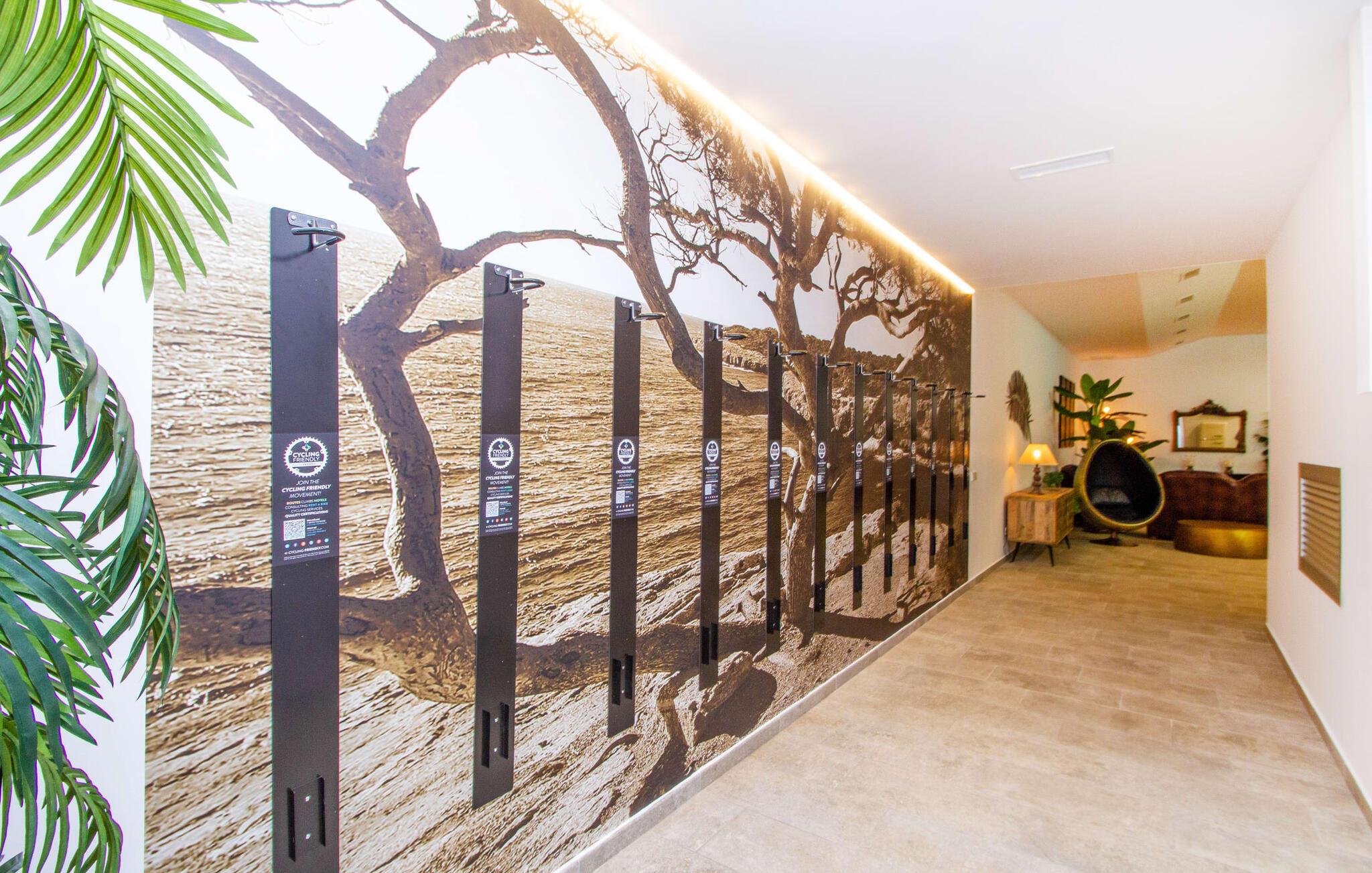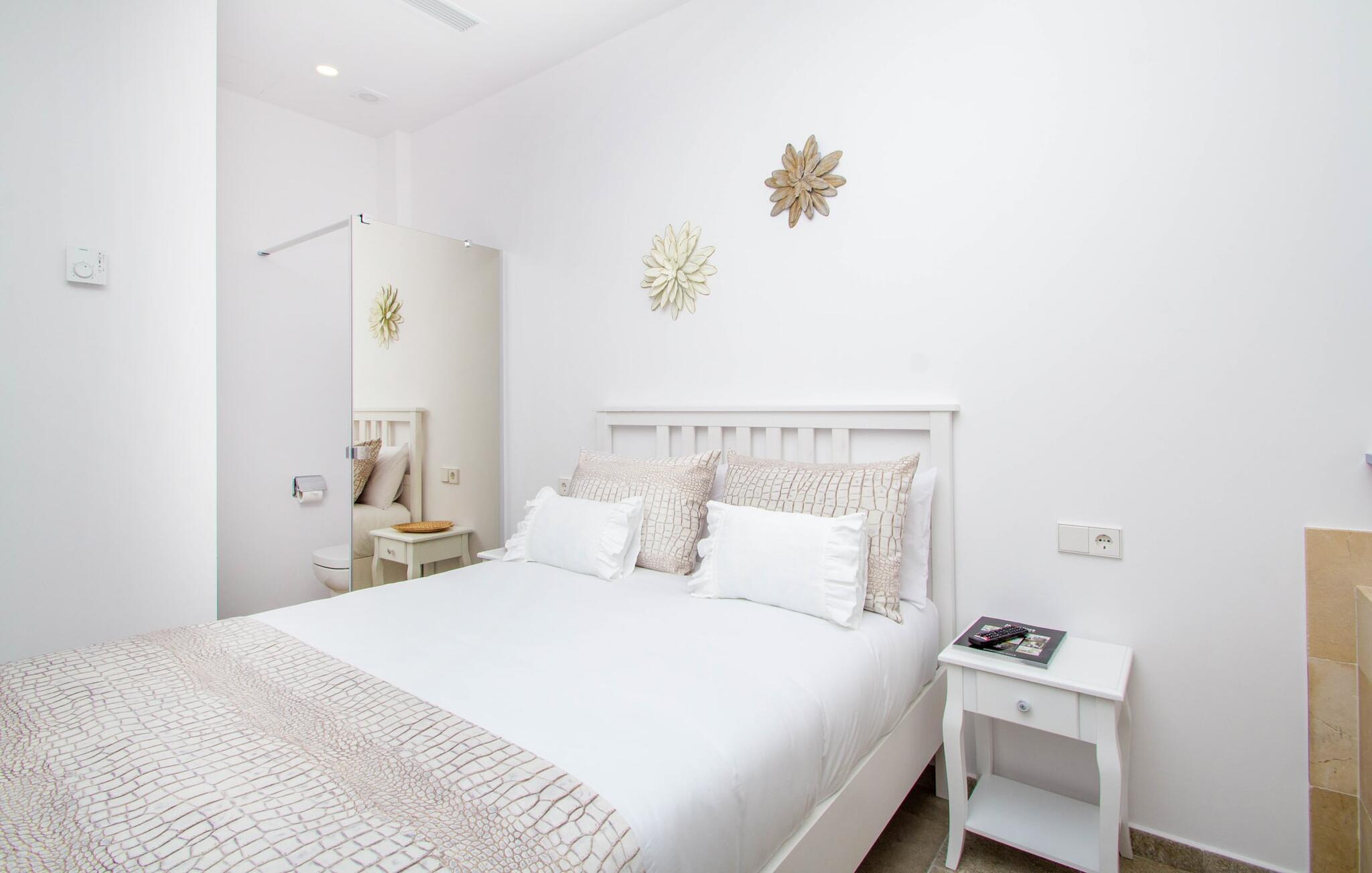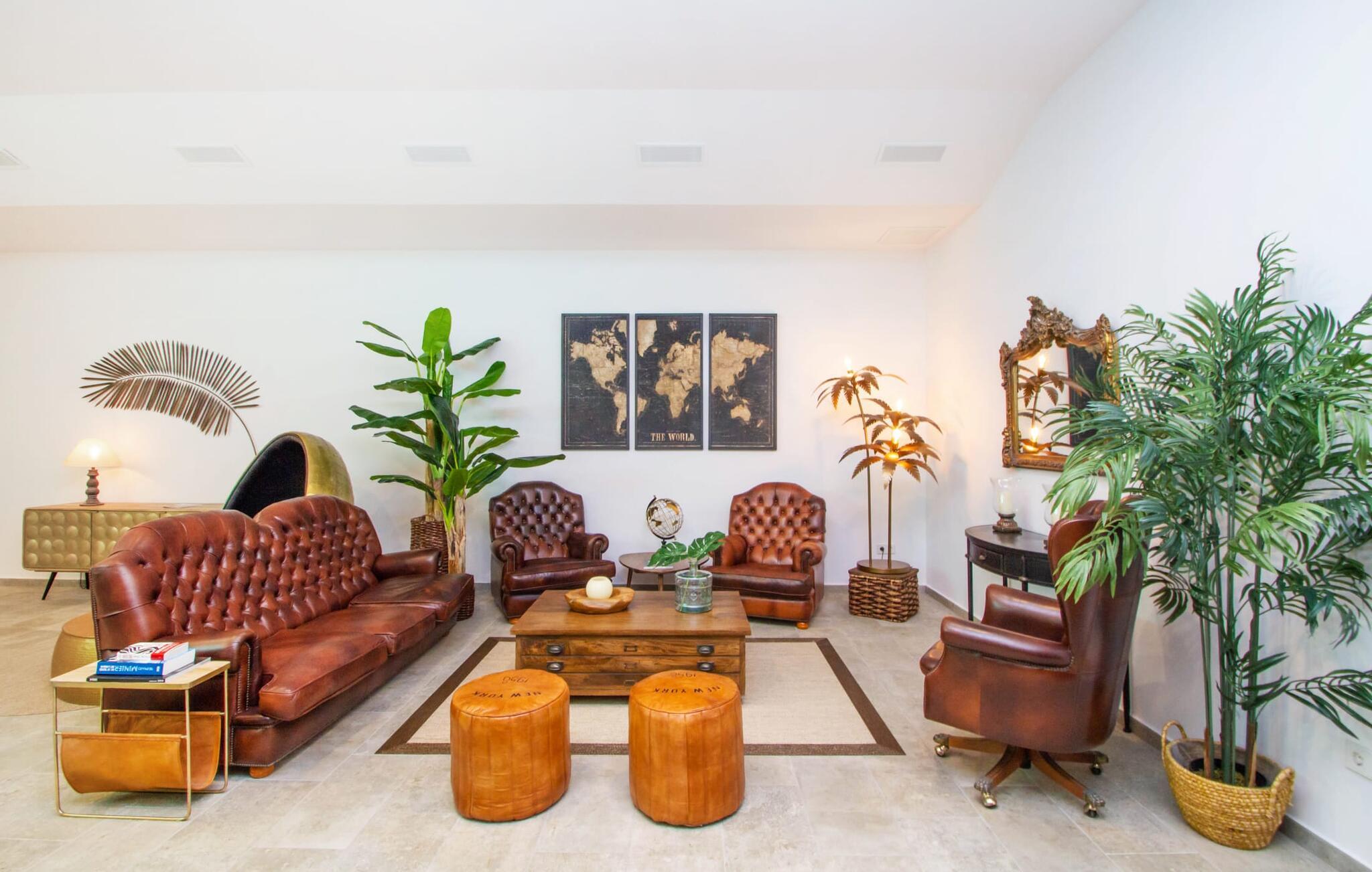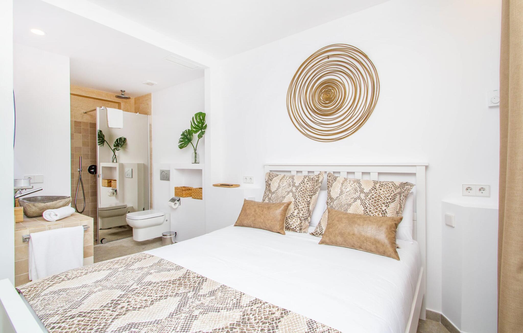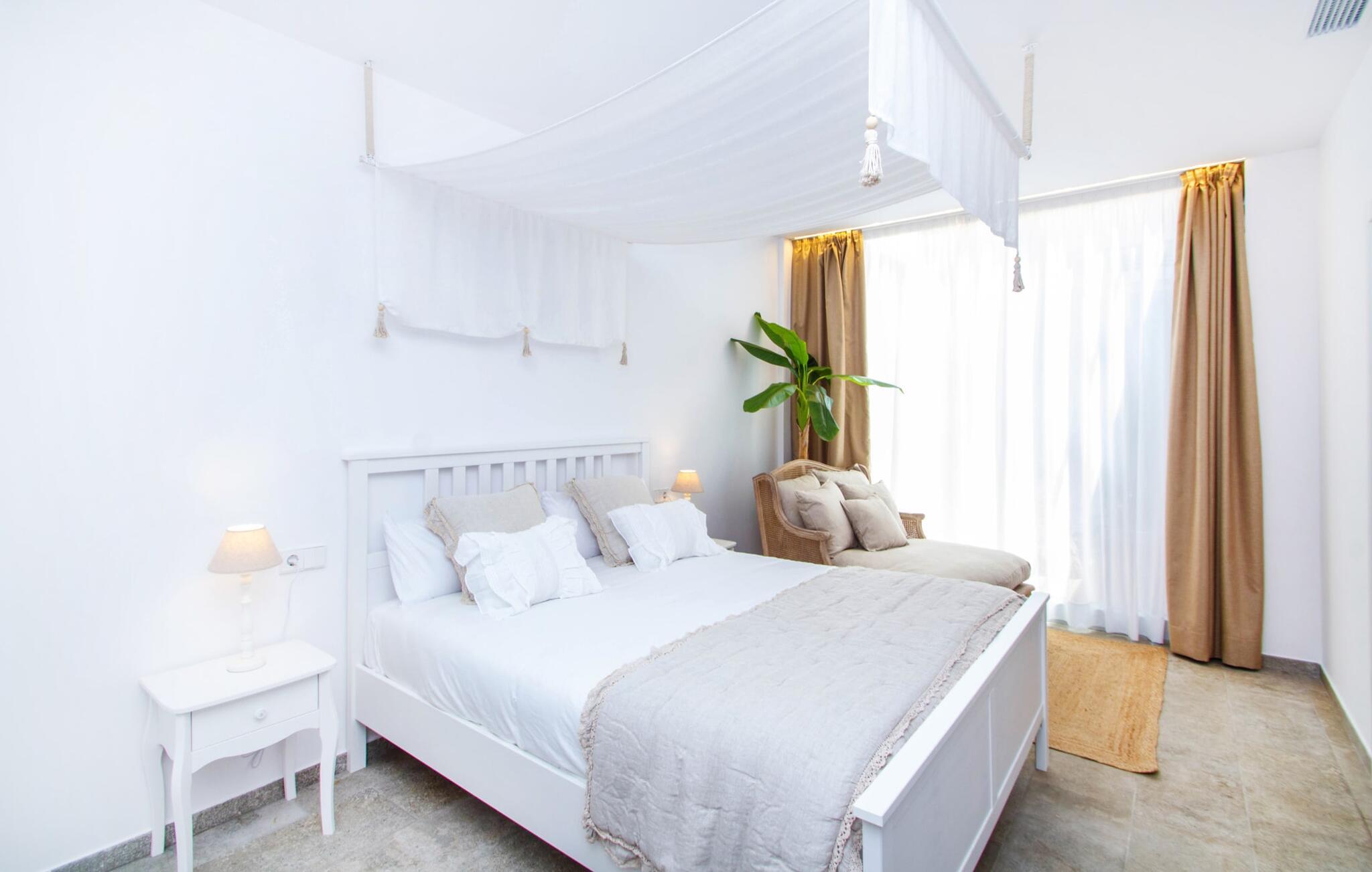 Leder I efter en enestående ejendom med masser af plads og privatliv? Uanset om I ønsker at tilbringe afslappende timer med familie og venner eller planlægger en særlig begivenhed for jeres medarbejdere eller forretningspartnere: "Rainbow"-villaen imponerer ikke kun med sine møbler, som ikke lader noget tilbage at ønske. På grund af dets moderne, puristiske design og udsatte beliggenhed er det også en af de mest eksklusive boliger på øen. Det 400 m² store udendørsareal har en enorm, delvist overdækket poolterrasse med komfortable udendørs sofaer, liggestole i balinesisk stil, liggestole og en pool. Terrassen er ikke synlig udefra: Nyd en helt unik atmosfære her! I kan fremtrylle jeres egne kreationer i poolbaren med et integreret køleskab: fra frossen juice til sundowners, forkæl jeres familie og venner med kølige drinks. Lige overfor er der herretoilet med 2 håndvaske og omklædningsrum. Øverste etage værelser på øverste etage i jeres villa har desuden udgang til en stilfuld terrasse med loungemøbler, hvorfra I har en fantastisk udsigt ud over den brede slette. Kan det ikke være mere? Vent og se. For nu vender vi os til det sofistikerede interiør på 800 m², som har et par overraskelser i vente. Helt fra starten er hele huset fuldt klimatiseret, og I kan individuelt indstille den ønskede temperatur i hvert rum. Forarbejdningen af de fineste materialer og et ekstraordinært design gør dette hus så specielt. I stueetagen finder I den åbne opholds- og spisestue med sofahjørne, et stort spisebord, der også kan bruges som konferencebord, samt et fuldt udstyret køkken. Store vinduespartier slipper masser af lys ind og skaber en luftig atmosfære. Der er fire komfortabelt indrettede soveværelser med dobbeltsenge på denne etage. Hvert værelse i huset har sit eget badeværelse. Disse er enten en-suite eller integreret direkte i rummets åbne arkitektur. Fire yderligere soveværelser ovenpå har adgang til deres egen private terrasse. I kælderen finder I endnu en opholdsstue med sofaer og liggestole, et fladskærms-tv, en bar og et fitnesscenter, der nemt lever op til studiets standarder. Et stort udvalg af fitnessudstyr er tilgængeligt til jeres træning. Der er også fire soveværelser med luksuriøse badeværelser på denne etage. I kan holde forbindelsen via WiFi i hele huset. Villaen er beliggende nord for Palma med en eksklusiv beliggenhed midt i et charmerende boligområde. Byens centrum af denne livlige metropol kan nås på kun ti minutter i bil. Udforsk de smalle gader med smukke butikker, restauranter og tapasbarer eller slentre forbi de imponerende yachter og sejlbåde ved havnen. Den imponerende La Seu-katedral blev bygget i 1200-tallet og er et skinnende blikfang om aftenen og ved daggry. Lige ved siden af ligger Almudaina-paladset, som tilhører den spanske kongefamilie. Palma-bugten med sine lange, let skrånende sandstrande grænser op til byen og er ideel for familier. Ejendommen scorer yderligere pluspoint på grund af dens nærhed til lufthavnen og den korte ankomsttid. Takket være dens centrale beliggenhed er I nemt forbundet til hele øen. Son Vida og Son Termes golfbaner kan nås på kun 15 minutter. Fra jeres villa kan I slentre til et par gode restauranter. Beliggende nord for Palma, er denne ejendom tæt på det pulserende liv i hovedstaden og alligevel det perfekte tilflugtssted for en afslappende tid med venner. jeres drømmevilla ligger i et roligt boligområde, hvorfra I kan nå den historiske gamle bydel eller Playa de Palma på få minutter. Takket være det veludviklede transportnetværk kan I nå Serra de Tramuntana på ingen tid: UNESCO World Heritage Site tilbyder vandrere og cyklister en hidtil uset variation. Bemærk venligst, at denne ejendom ikke accepterer ungdomsgrupper eller polterabender. En ungdomsgruppe på denne ejendom består af personer på 25 år eller derunder. Book ikke denne ejendom, hvis I er en ungdomsgruppe eller en polterabendgruppe, da jeres reservation vil blive afvist, når den er booket, hvilket også kan være tilfældet ved ankomst til ejendommen eller under jeres ophold, og I vil ikke modtage en refusion.