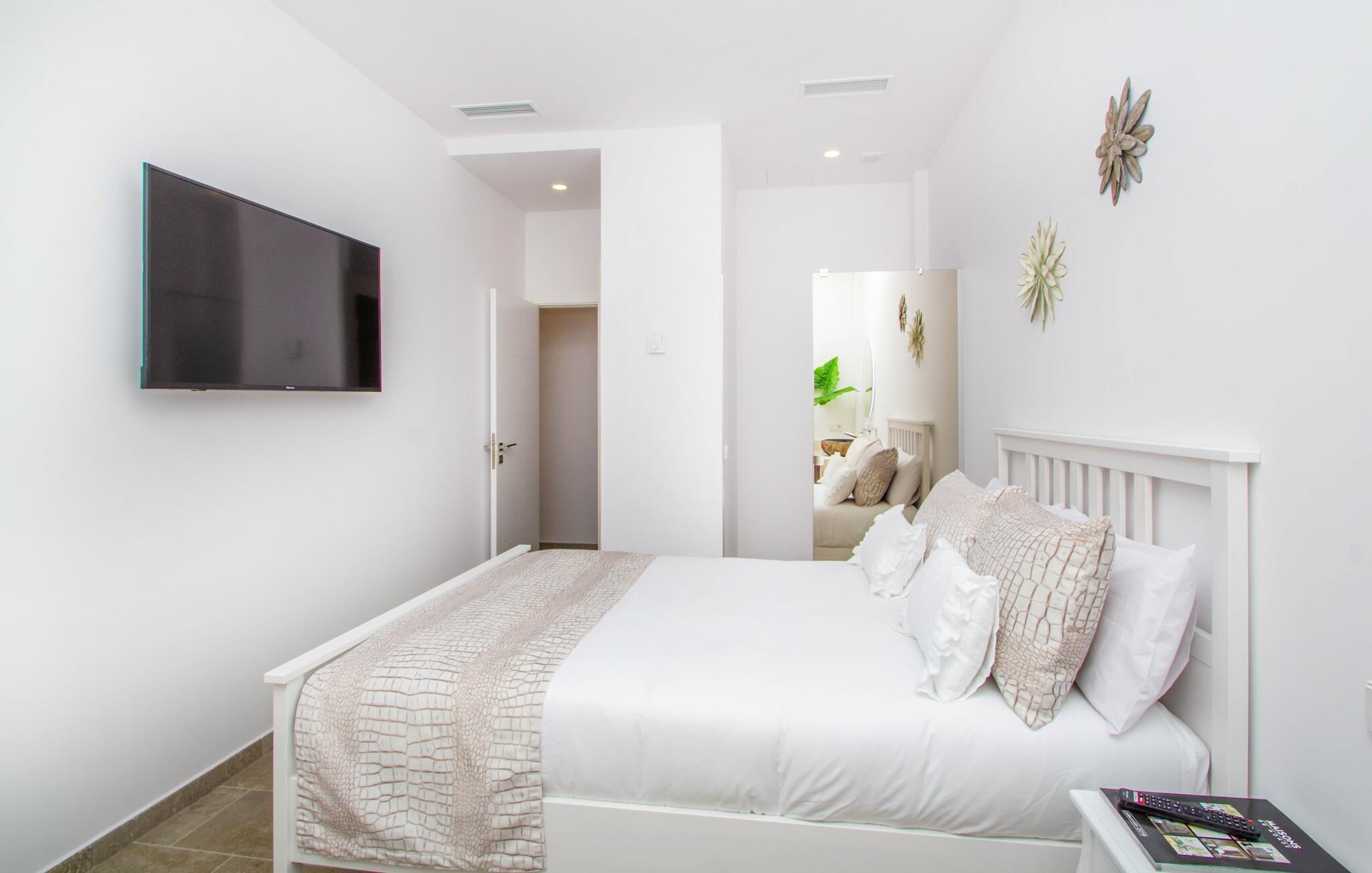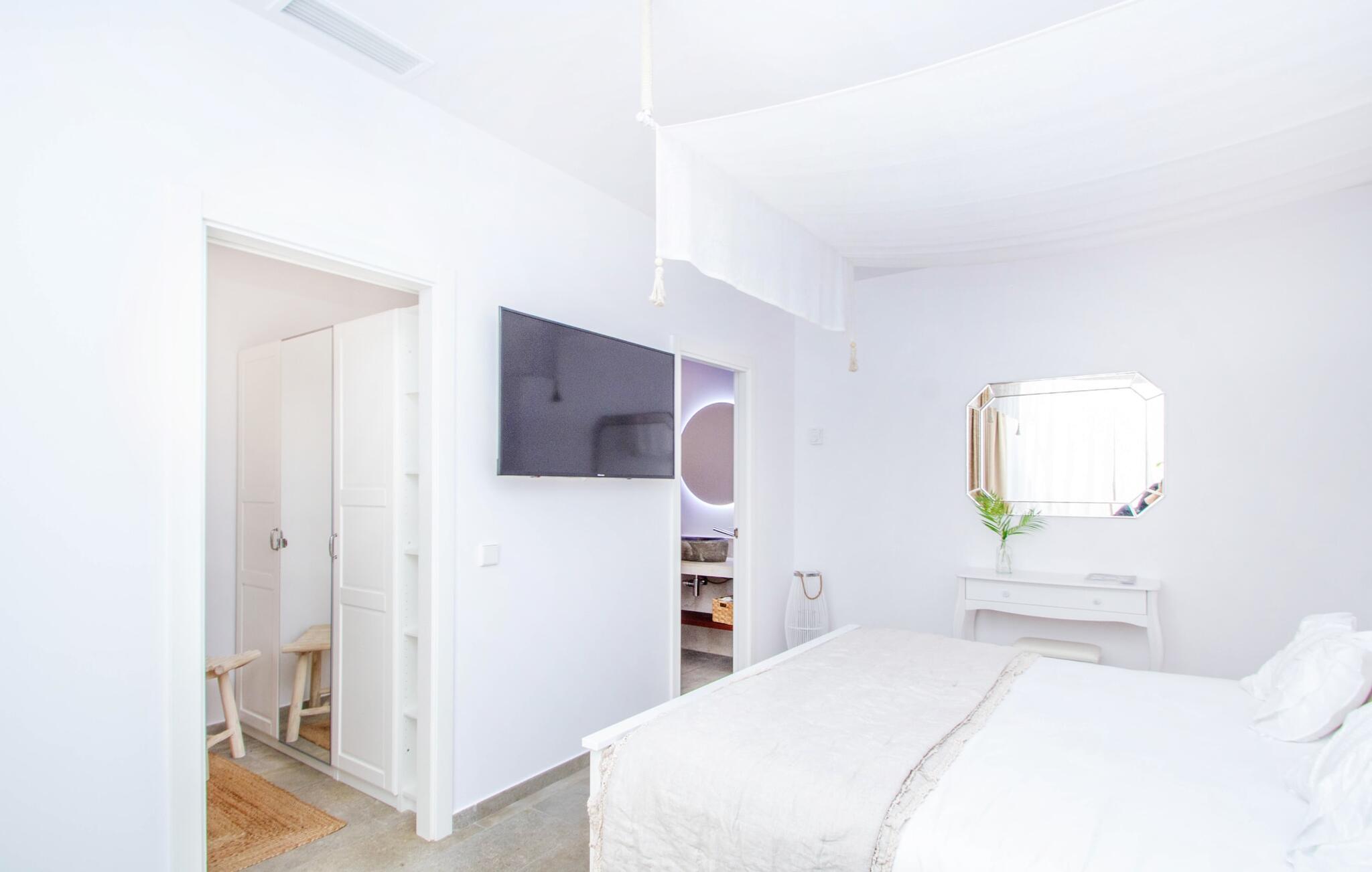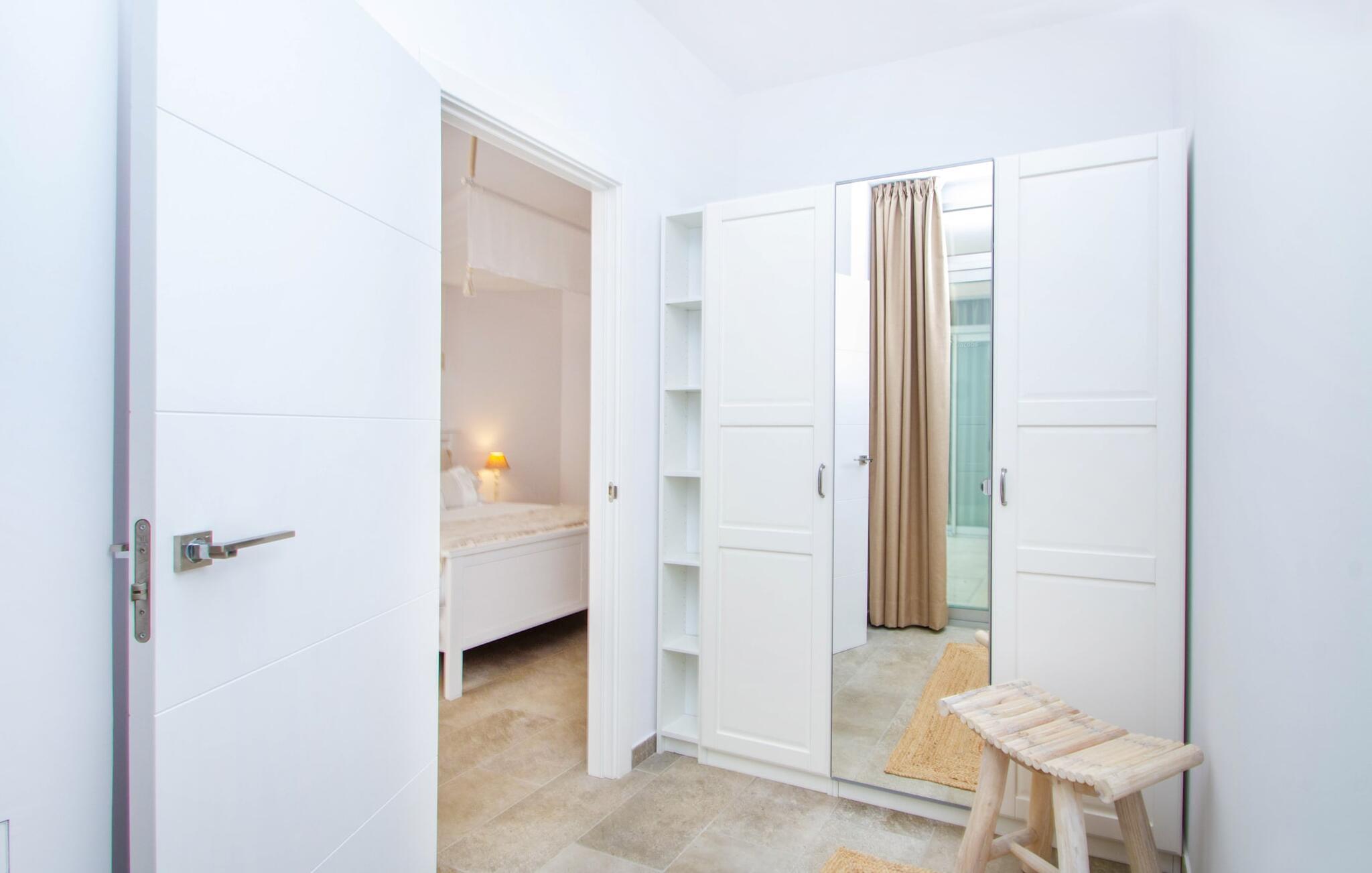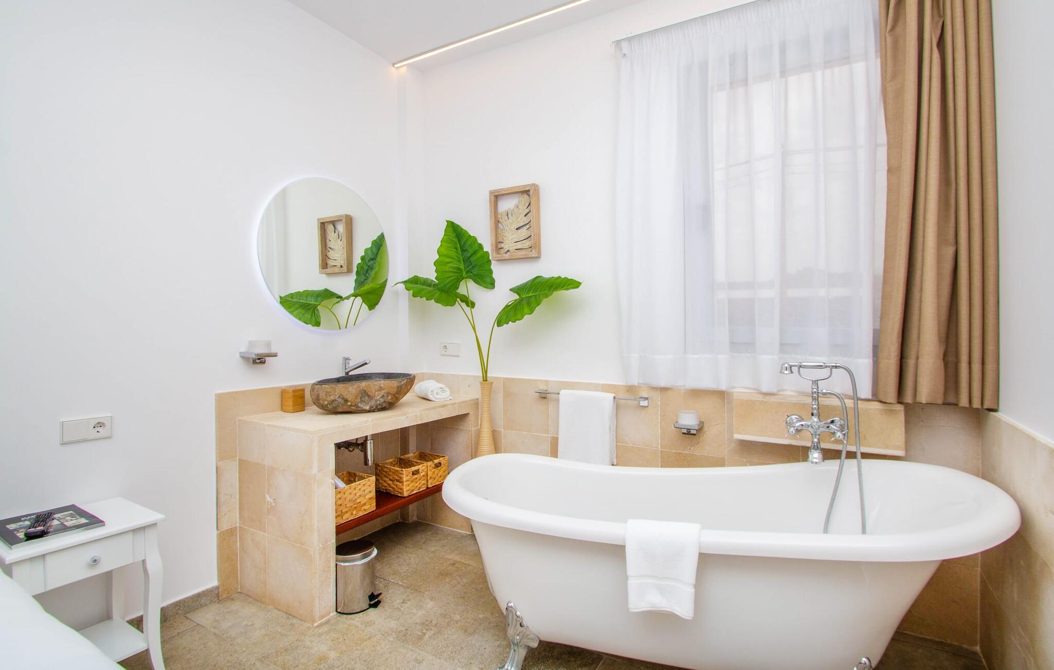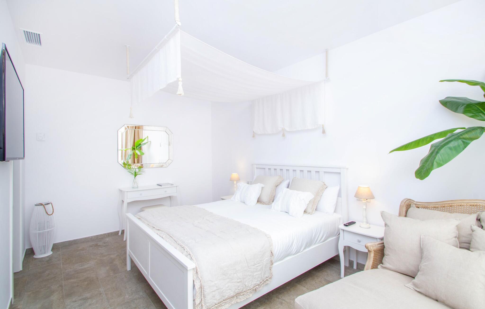 Leder I efter en enestående ejendom med masser af plads og privatliv? Uanset om I ønsker at tilbringe afslappende timer med familie og venner eller planlægger en særlig begivenhed for jeres medarbejdere eller forretningspartnere: "Rainbow"-villaen imponerer ikke kun med sine møbler, som ikke lader noget tilbage at ønske. På grund af dets moderne, puristiske design og udsatte beliggenhed er det også en af de mest eksklusive boliger på øen. Det 400 m² store udendørsareal har en enorm, delvist overdækket poolterrasse med komfortable udendørs sofaer, liggestole i balinesisk stil, liggestole og en pool. Terrassen er ikke synlig udefra: Nyd en helt unik atmosfære her! I kan fremtrylle jeres egne kreationer i poolbaren med et integreret køleskab: fra frossen juice til sundowners, forkæl jeres familie og venner med kølige drinks. Lige overfor er der herretoilet med 2 håndvaske og omklædningsrum. Øverste etage værelser på øverste etage i jeres villa har desuden udgang til en stilfuld terrasse med loungemøbler, hvorfra I har en fantastisk udsigt ud over den brede slette. Kan det ikke være mere? Vent og se. For nu vender vi os til det sofistikerede interiør på 800 m², som har et par overraskelser i vente. Helt fra starten er hele huset fuldt klimatiseret, og I kan individuelt indstille den ønskede temperatur i hvert rum. Forarbejdningen af de fineste materialer og et ekstraordinært design gør dette hus så specielt. I stueetagen finder I den åbne opholds- og spisestue med sofahjørne, et stort spisebord, der også kan bruges som konferencebord, samt et fuldt udstyret køkken. Store vinduespartier slipper masser af lys ind og skaber en luftig atmosfære. Der er fire komfortabelt indrettede soveværelser med dobbeltsenge på denne etage. Hvert værelse i huset har sit eget badeværelse. Disse er enten en-suite eller integreret direkte i rummets åbne arkitektur. Fire yderligere soveværelser ovenpå har adgang til deres egen private terrasse. I kælderen finder I endnu en opholdsstue med sofaer og liggestole, et fladskærms-tv, en bar og et fitnesscenter, der nemt lever op til studiets standarder. Et stort udvalg af fitnessudstyr er tilgængeligt til jeres træning. Der er også fire soveværelser med luksuriøse badeværelser på denne etage. I kan holde forbindelsen via WiFi i hele huset. Villaen er beliggende nord for Palma med en eksklusiv beliggenhed midt i et charmerende boligområde. Byens centrum af denne livlige metropol kan nås på kun ti minutter i bil. Udforsk de smalle gader med smukke butikker, restauranter og tapasbarer eller slentre forbi de imponerende yachter og sejlbåde ved havnen. Den imponerende La Seu-katedral blev bygget i 1200-tallet og er et skinnende blikfang om aftenen og ved daggry. Lige ved siden af ligger Almudaina-paladset, som tilhører den spanske kongefamilie. Palma-bugten med sine lange, let skrånende sandstrande grænser op til byen og er ideel for familier. Ejendommen scorer yderligere pluspoint på grund af dens nærhed til lufthavnen og den korte ankomsttid. Takket være dens centrale beliggenhed er I nemt forbundet til hele øen. Son Vida og Son Termes golfbaner kan nås på kun 15 minutter. Fra jeres villa kan I slentre til et par gode restauranter. Beliggende nord for Palma, er denne ejendom tæt på det pulserende liv i hovedstaden og alligevel det perfekte tilflugtssted for en afslappende tid med venner. jeres drømmevilla ligger i et roligt boligområde, hvorfra I kan nå den historiske gamle bydel eller Playa de Palma på få minutter. Takket være det veludviklede transportnetværk kan I nå Serra de Tramuntana på ingen tid: UNESCO World Heritage Site tilbyder vandrere og cyklister en hidtil uset variation. Bemærk venligst, at denne ejendom ikke accepterer ungdomsgrupper eller polterabender. En ungdomsgruppe på denne ejendom består af personer på 25 år eller derunder. Book ikke denne ejendom, hvis I er en ungdomsgruppe eller en polterabendgruppe, da jeres reservation vil blive afvist, når den er booket, hvilket også kan være tilfældet ved ankomst til ejendommen eller under jeres ophold, og I vil ikke modtage en refusion.