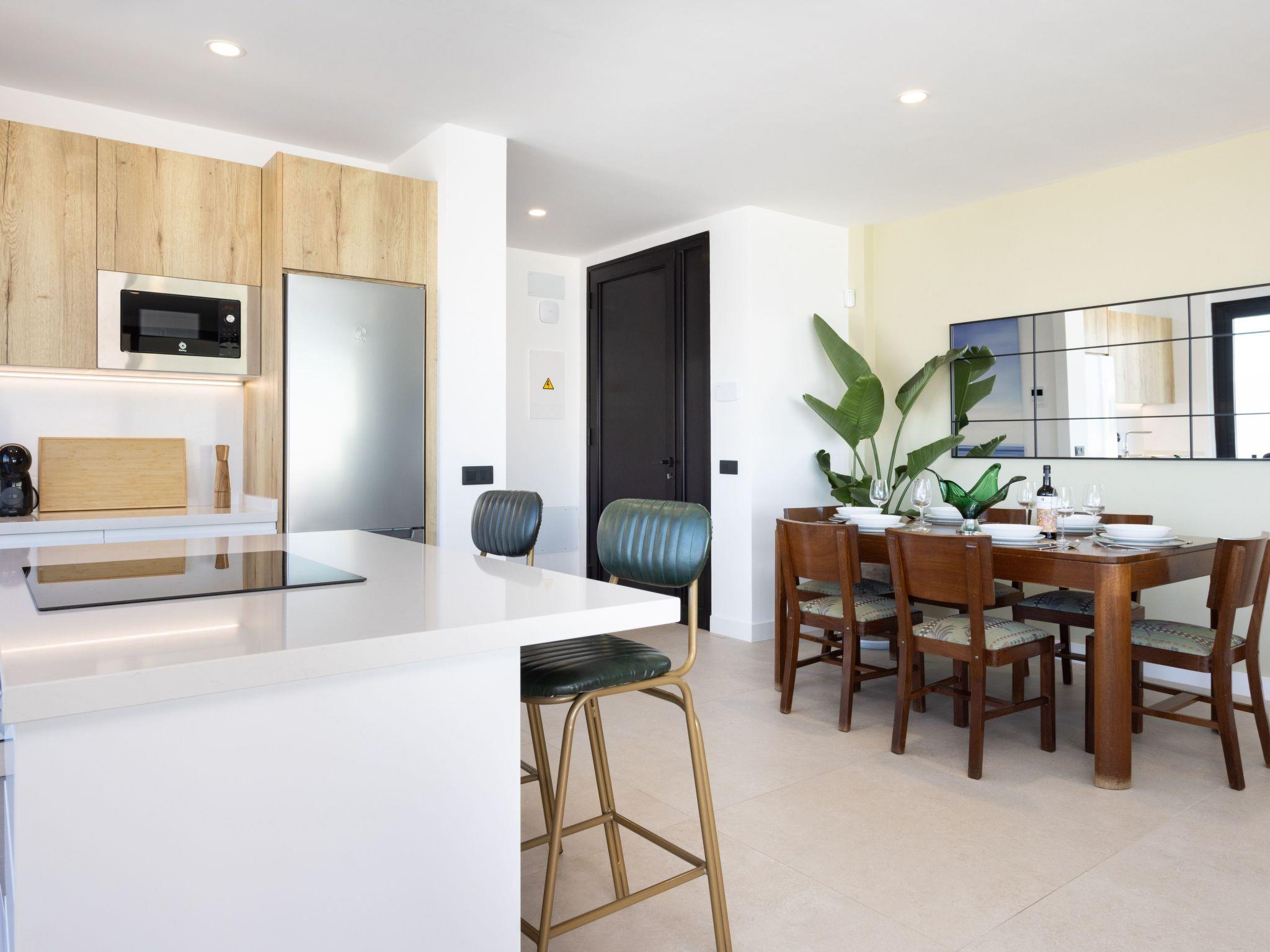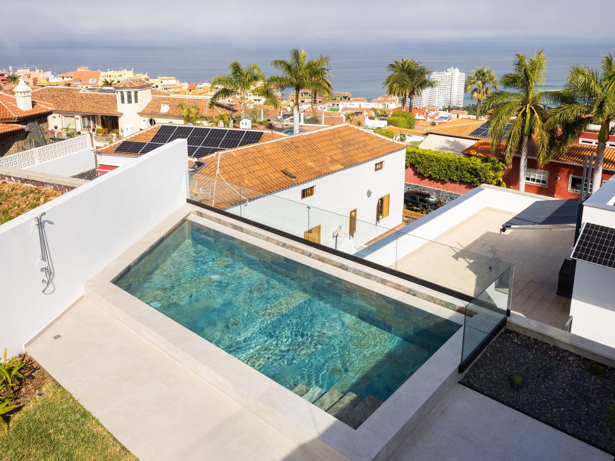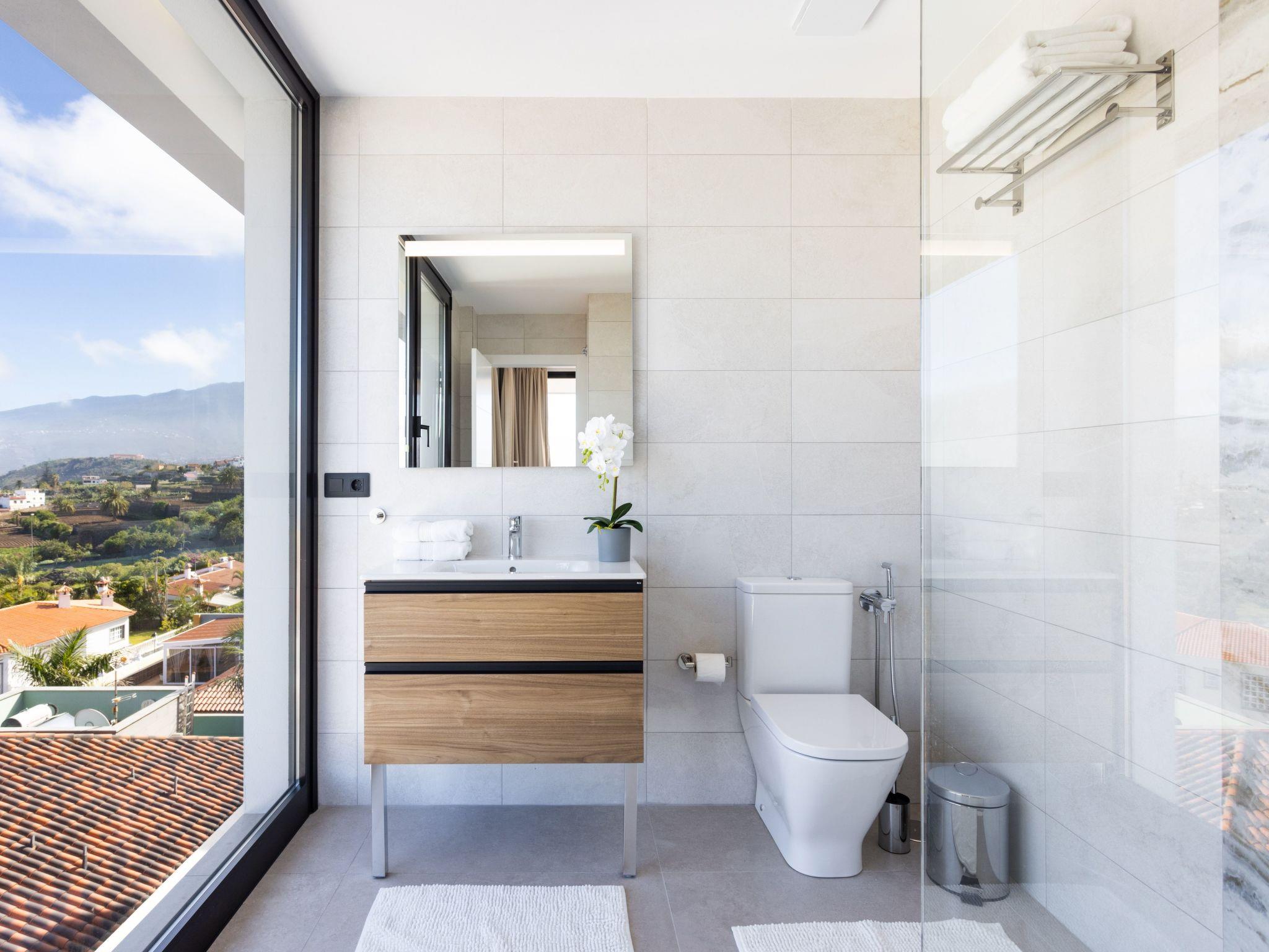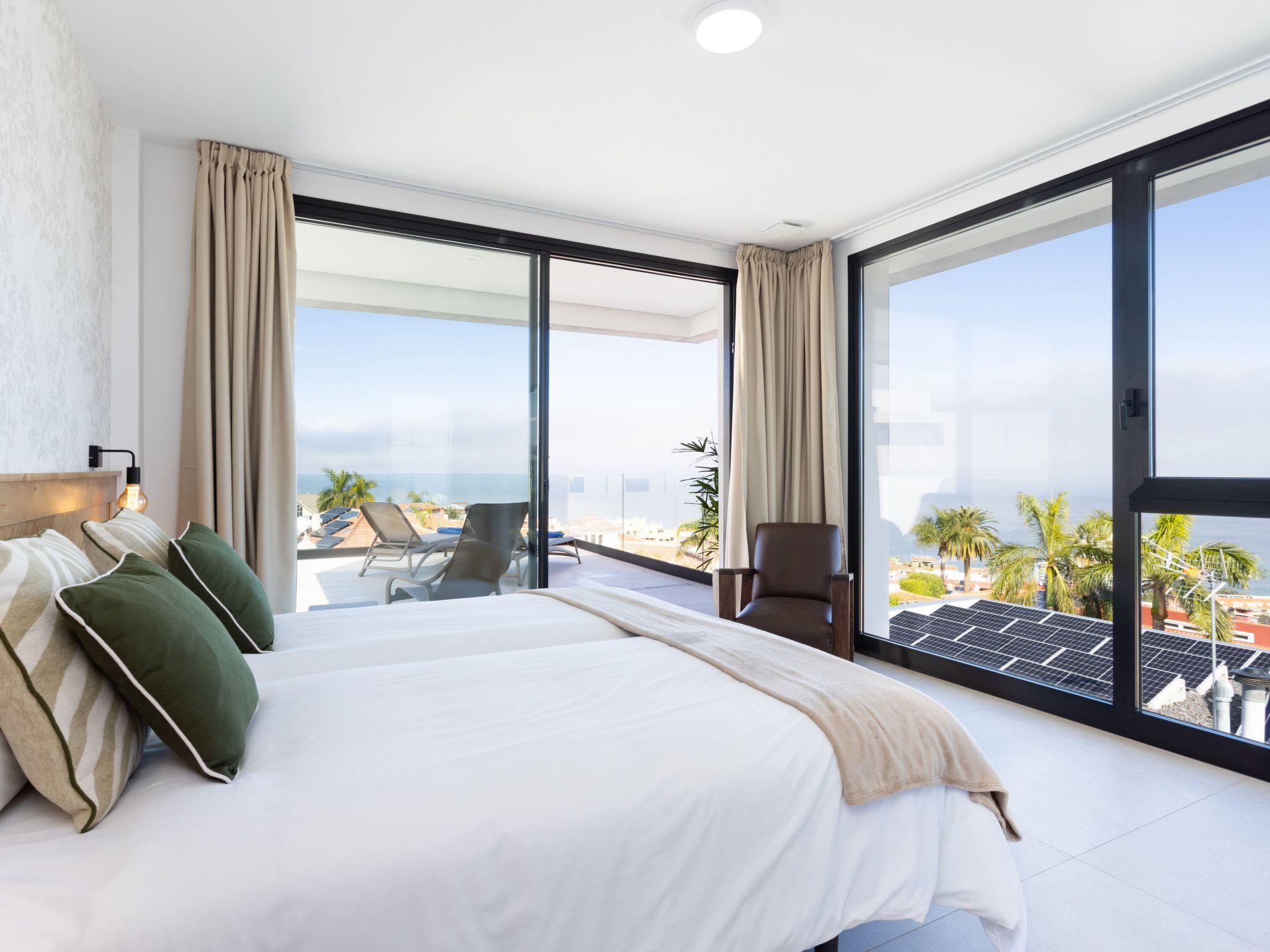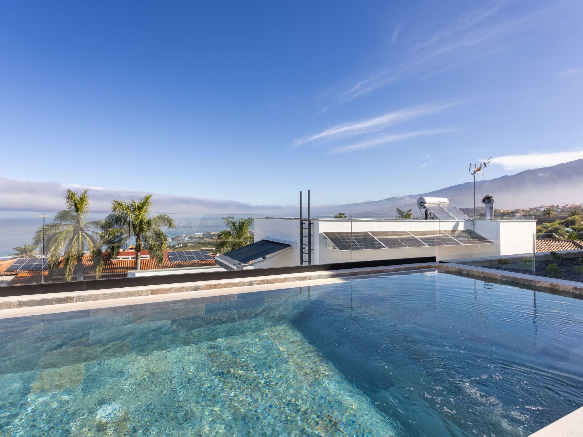The upper floor has two bedrooms with single beds and two bathrooms, one of which has spectacular views of Puerto de la Cruz. The master bedroom also has a spacious balcony overlooking the pool.