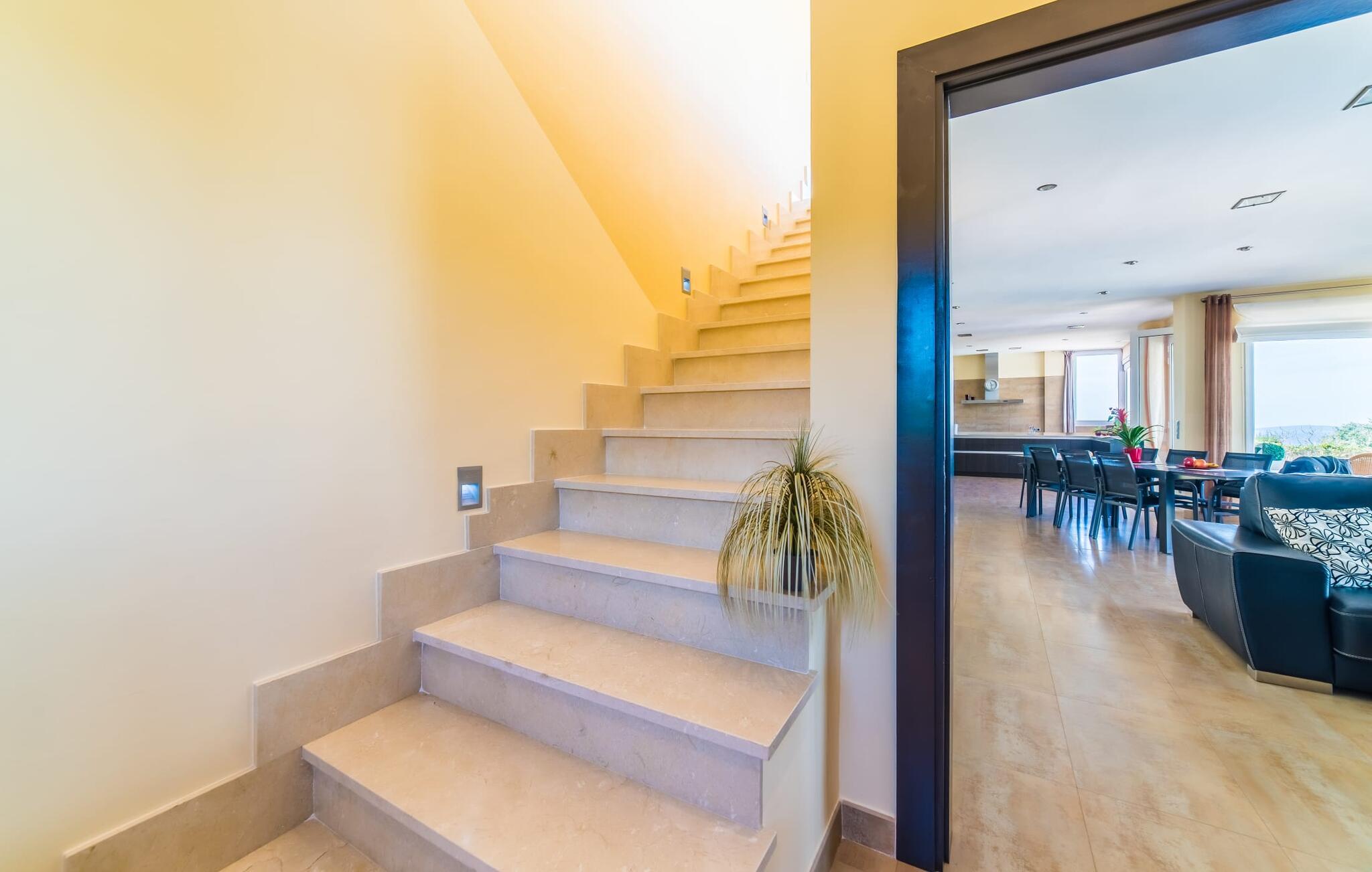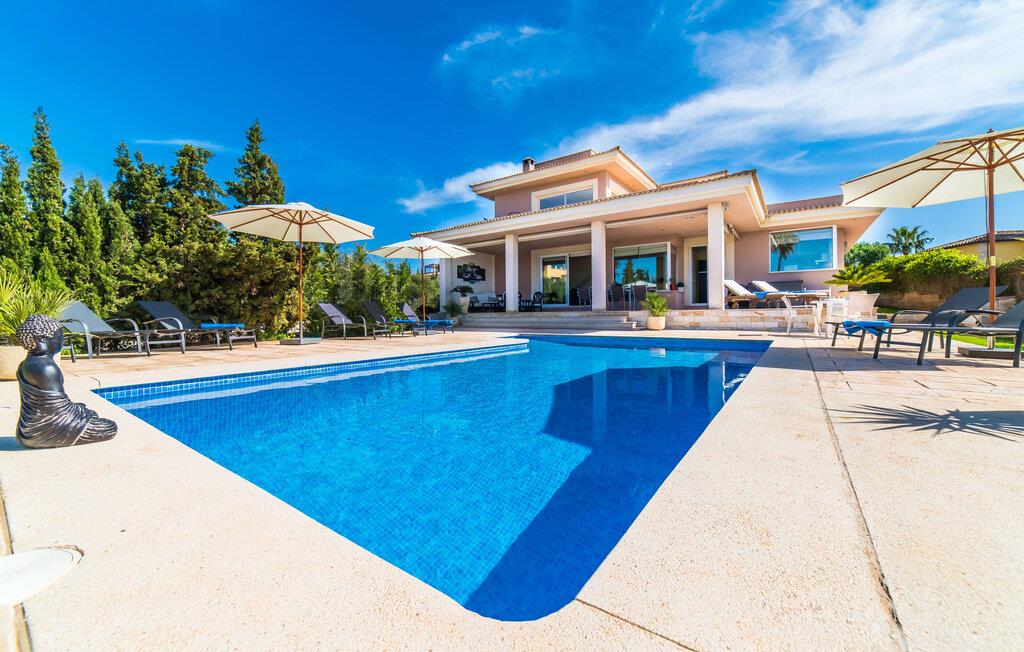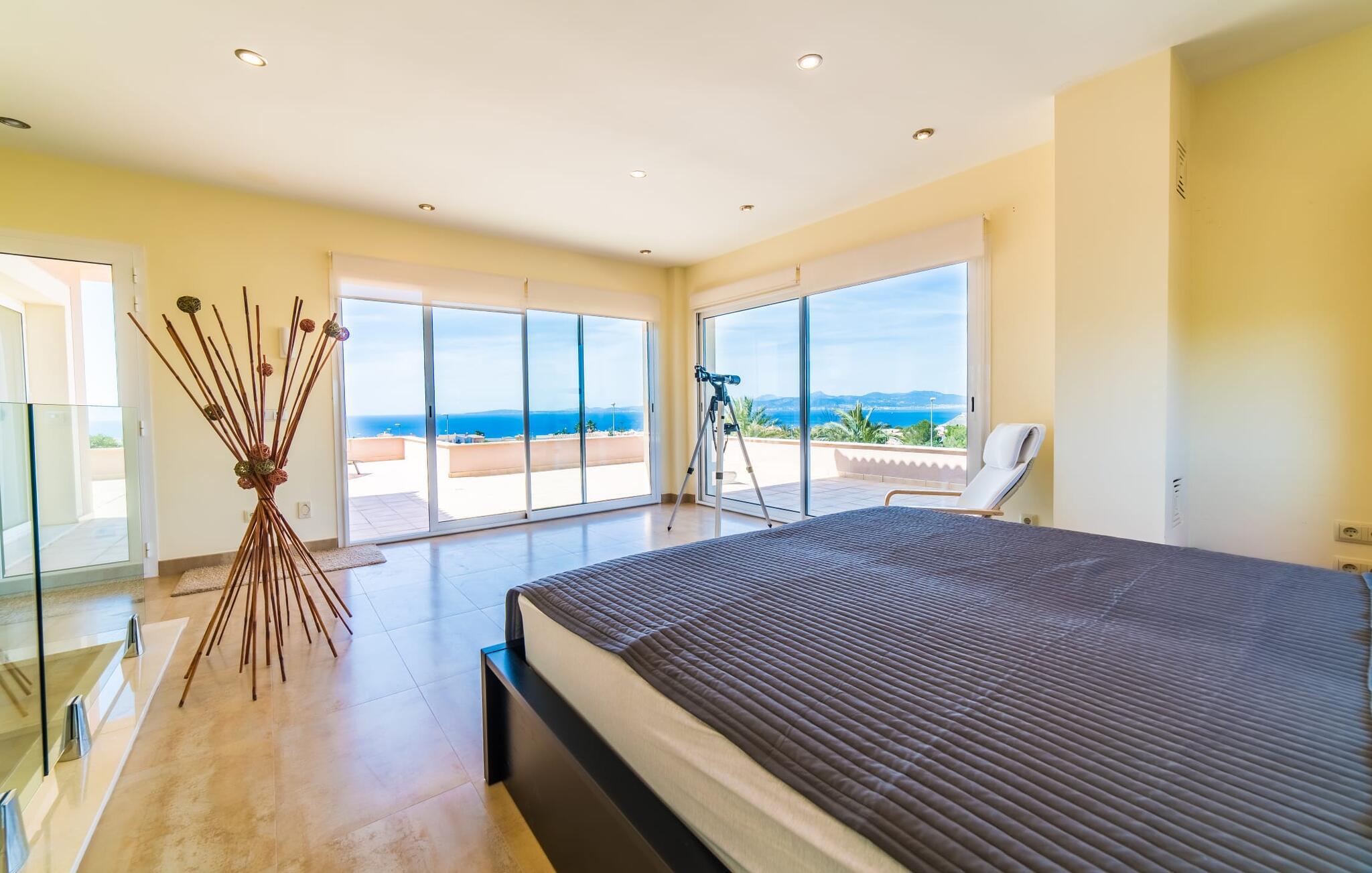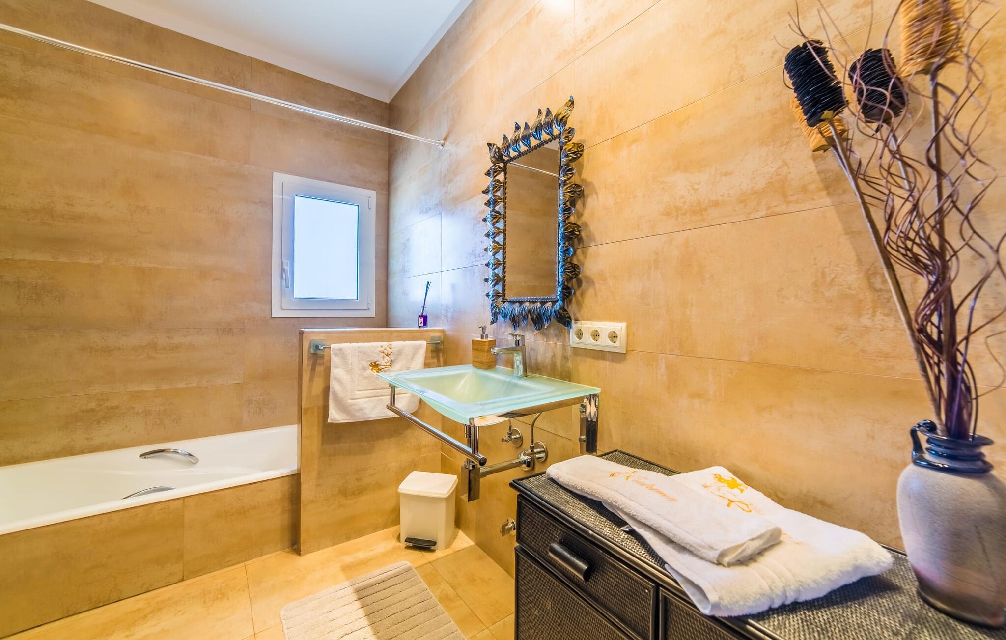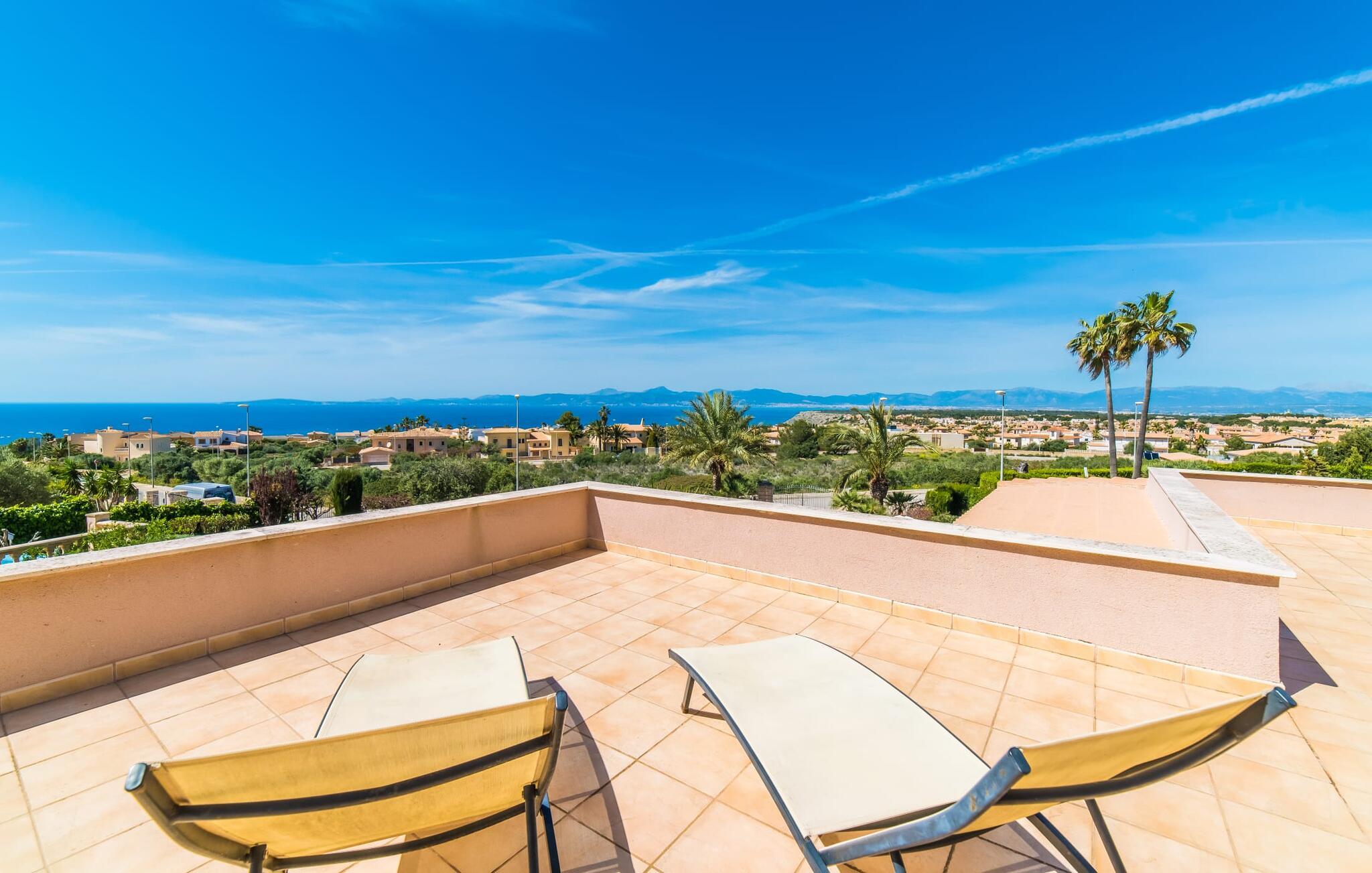 Med det blå hav i sigte og følelsen af et badehåndklæde på huden: Denne moderne, to-etagers villa har store vinduer overalt, men skjuler samtidig smart den smukke pool og dens loungeområder bag træer og hække. Privatlivets fred er meget vigtigt i boligområdet. Med terrassemarkiserne udvidet, vil I virkelig føle jer adskilt fra jeres naboer i det hyggelige udendørs opholdsrum. Her kan I grille, slappe af eller hygge jer efter hjertens lyst. Hele havlandskabet ligger for fødderne af solbadere, der soler sig på den ekspansive tagterrasse. Hvis I vil, kan I også efterlade alt jeres tøj her fra tid til anden. Palma-bugten viser sig i al sin skønhed. Om natten funkler hovedstadens lys, og I spekulerer på, om I vil tage dertil senere for at få en cocktail eller gå en tur. Der er en asfaltparkering ved huset, hvor I kan parkere jeres lejebil sikkert og komfortabelt, og der er også plads nok omkring bordtennisbordet. Villa "Redrema" lover ikke kun rosenrøde tider, Buddha gennemsyrer også huset og bringer harmoni og ferielykke. Opholdsstuen er mere reserveret møbleret og fremhævet med et tv-hjørne, spisebord og udstyret køkken, hvis ekstra store køleskab er ideelt til varme dage og de mange tilbud på landmændenes markeder. Det er ikke kun allergikere, der bliver glade for de tæppefri marmorgulve. Villa “Redrema” ønsker at lukke så meget lys ind i rummene som muligt og er afhængig af den store glasfacade ud mod pool og hav. Vinduer og terrassedøre spiller en afgørende rolle i huset. Der er direkte adgang til det fri fra alle fire gæsteværelser; fra de to nedenunder og de to ovenover. Store indbyggede skabe hjælper jer med at opbevare selv den største bagage. Stueetagen og altanen skal dog bruges i fred. Den rummelige master suite med en 1,8 x 2 m dobbeltseng, ensuite brusebadeværelse og påklædningsområde flyder ind i det åbne galleri, som også har en dobbeltseng og tilbyder jeres gæster begrænset privatliv, men en fantastisk udsigt. Familien kan sagtens komme tættere sammen, mens de solbader og nyder en hyggelig aften med fjernsyn. Der er yderligere to elegante badeværelser i stueetagen, det ene med badekar, så hvert gæsteværelse har sit eget - ikke helt en-suite som ovenpå, men stadig et badeværelse i nærheden... Hvis markedet i Llucmajor er åbent, skal I Sørg for at gå: Den berømte Café Colón på det nostalgiske Plaza España tilføjer et kapitel af øens historie til den kaffe, I drikker. Med koffein i jeres årer og bønnens kraft kan I så ubesværet bestige det 542 m høje Puig de Randa-bjerg. Alene den vidunderlige udsigt er det værd. Som belønning kan I også forkæle jer selv med et gourmetmåltid på klipperne ved Mirador de Cabrera i Cala Pí, selvom det vil sætte et stort indhug i jeres feriebudget. jeres børn kan lege og have det sjovt på Aqualand i El Arenal, det største badeland ved havet på øen. Med sine 60 hektar jord tilbyder Golf Maioris et sted for den kræsne golfspiller. Omgivende strande som Es Trenc er et naturligt fænomen i sig selv. Den flade region omkring Puigderrós har også smukke cykelstier at byde på. Den moderne og komfortable villa "Redrema" ligger kun 500 m fra klippekysten, i det rolige boligområde Sa Torre, med direkte forbindelse til strandene i Palma som Cala Pí og Sa Ràpita. Landmandsmarkedet i Llucmajor ligger omkring 17 km derfra, mens Palma med dets kultur og natteliv ligger 23 km derfra. Det lille indkøbscenter Puigderrós har et velassorteret supermarked. Yderligere butikker og restauranter kan findes i de nærliggende byer Maioris og Badia Gran.