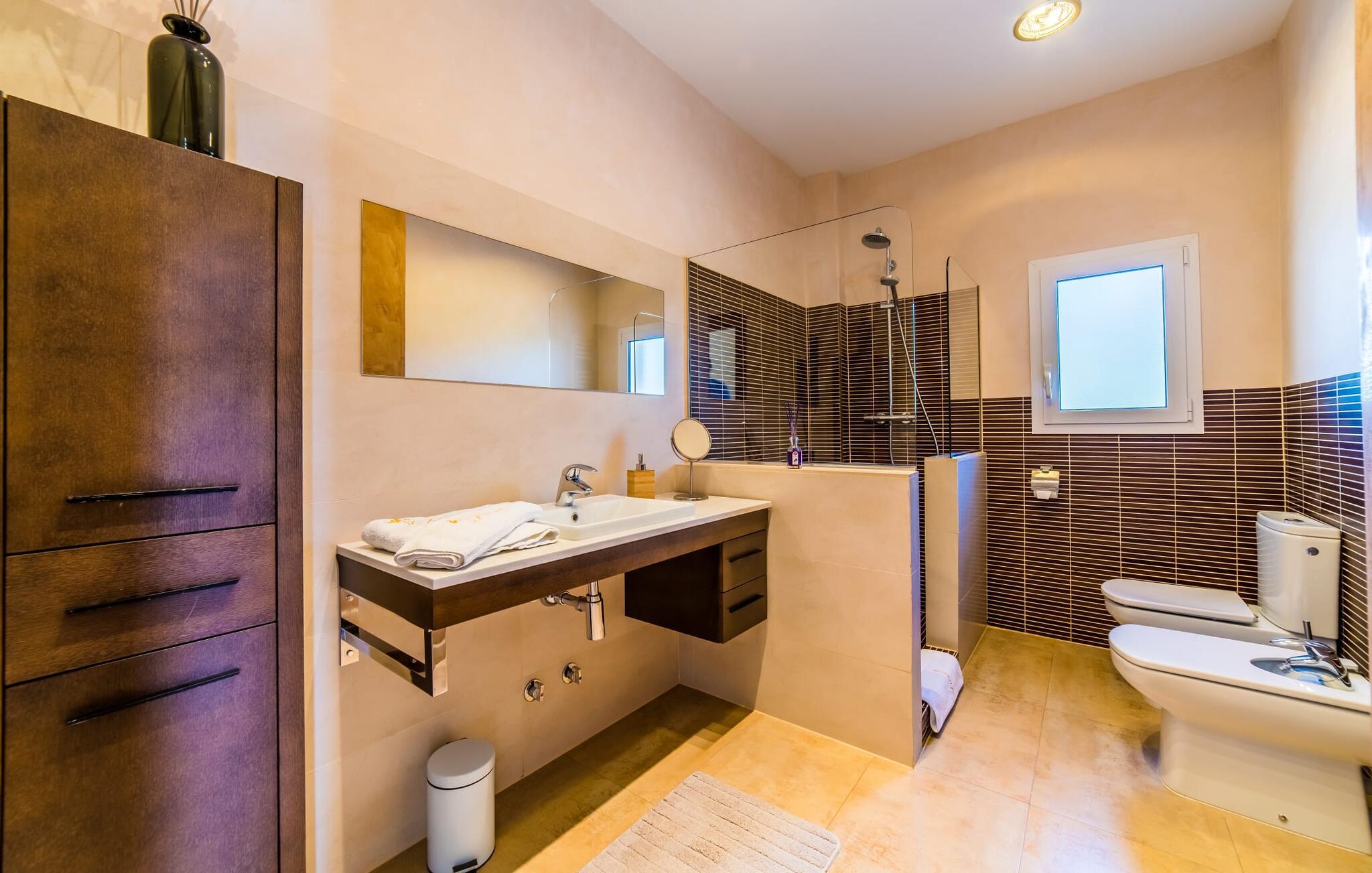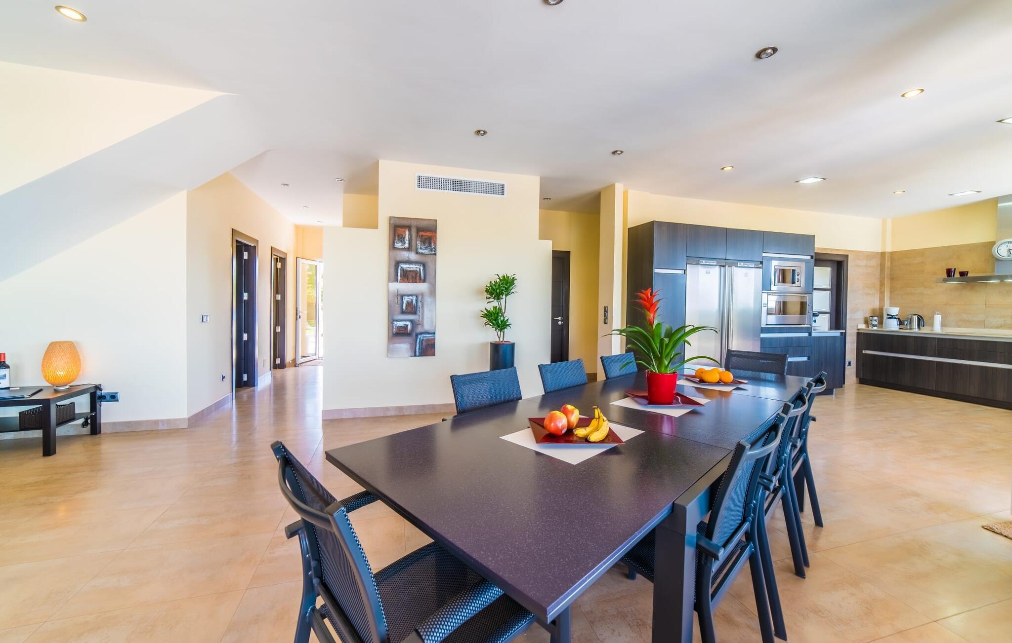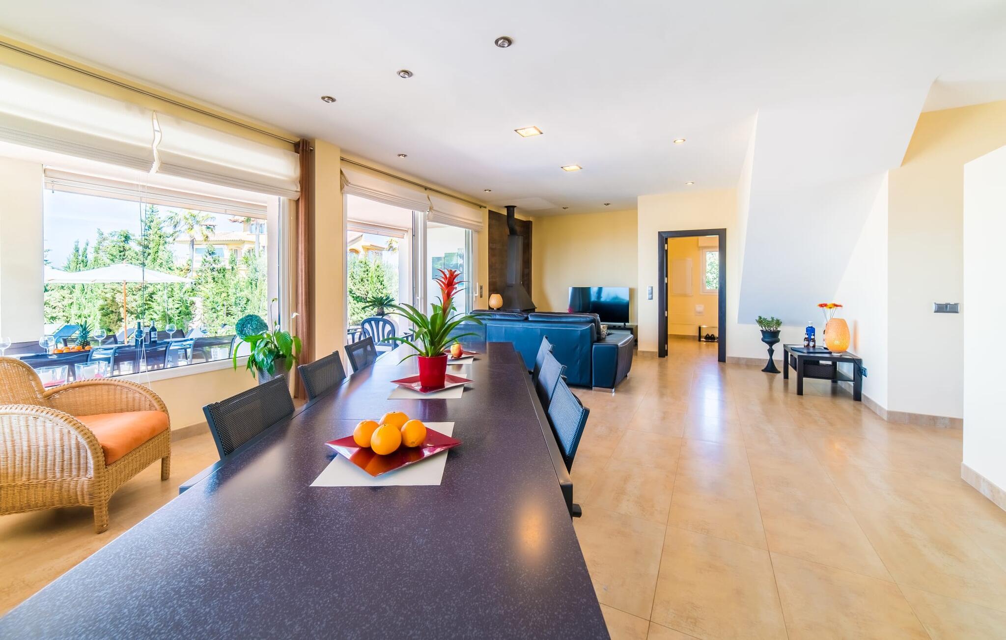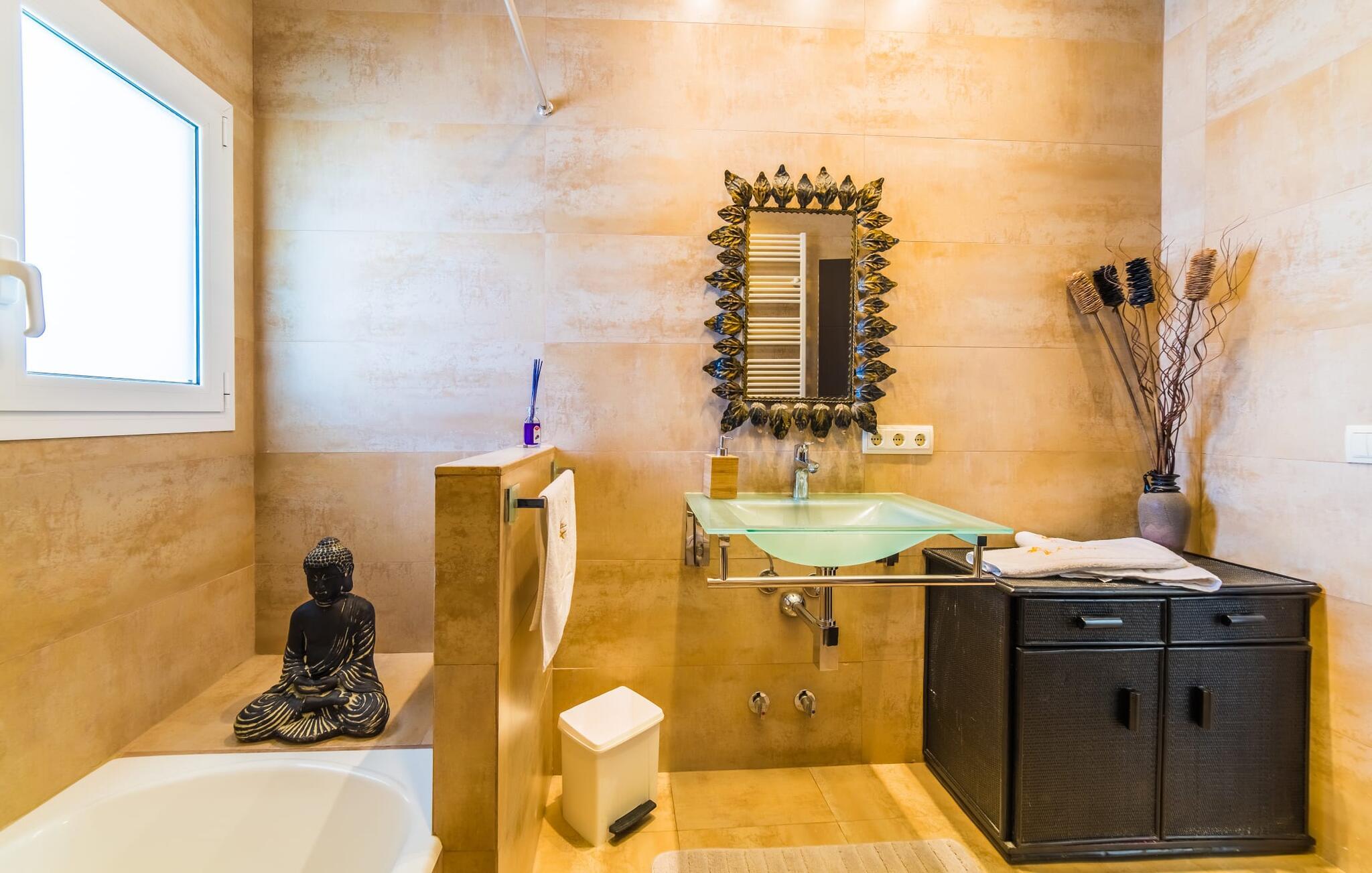 Med det blå hav i sigte og følelsen af et badehåndklæde på huden: Denne moderne, to-etagers villa har store vinduer overalt, men skjuler samtidig smart den smukke pool og dens loungeområder bag træer og hække. Privatlivets fred er meget vigtigt i boligområdet. Med terrassemarkiserne udvidet, vil I virkelig føle jer adskilt fra jeres naboer i det hyggelige udendørs opholdsrum. Her kan I grille, slappe af eller hygge jer efter hjertens lyst. Hele havlandskabet ligger for fødderne af solbadere, der soler sig på den ekspansive tagterrasse. Hvis I vil, kan I også efterlade alt jeres tøj her fra tid til anden. Palma-bugten viser sig i al sin skønhed. Om natten funkler hovedstadens lys, og I spekulerer på, om I vil tage dertil senere for at få en cocktail eller gå en tur. Der er en asfaltparkering ved huset, hvor I kan parkere jeres lejebil sikkert og komfortabelt, og der er også plads nok omkring bordtennisbordet. Villa "Redrema" lover ikke kun rosenrøde tider, Buddha gennemsyrer også huset og bringer harmoni og ferielykke. Opholdsstuen er mere reserveret møbleret og fremhævet med et tv-hjørne, spisebord og udstyret køkken, hvis ekstra store køleskab er ideelt til varme dage og de mange tilbud på landmændenes markeder. Det er ikke kun allergikere, der bliver glade for de tæppefri marmorgulve. Villa “Redrema” ønsker at lukke så meget lys ind i rummene som muligt og er afhængig af den store glasfacade ud mod pool og hav. Vinduer og terrassedøre spiller en afgørende rolle i huset. Der er direkte adgang til det fri fra alle fire gæsteværelser; fra de to nedenunder og de to ovenover. Store indbyggede skabe hjælper jer med at opbevare selv den største bagage. Stueetagen og altanen skal dog bruges i fred. Den rummelige master suite med en 1,8 x 2 m dobbeltseng, ensuite brusebadeværelse og påklædningsområde flyder ind i det åbne galleri, som også har en dobbeltseng og tilbyder jeres gæster begrænset privatliv, men en fantastisk udsigt. Familien kan sagtens komme tættere sammen, mens de solbader og nyder en hyggelig aften med fjernsyn. Der er yderligere to elegante badeværelser i stueetagen, det ene med badekar, så hvert gæsteværelse har sit eget - ikke helt en-suite som ovenpå, men stadig et badeværelse i nærheden... Hvis markedet i Llucmajor er åbent, skal I Sørg for at gå: Den berømte Café Colón på det nostalgiske Plaza España tilføjer et kapitel af øens historie til den kaffe, I drikker. Med koffein i jeres årer og bønnens kraft kan I så ubesværet bestige det 542 m høje Puig de Randa-bjerg. Alene den vidunderlige udsigt er det værd. Som belønning kan I også forkæle jer selv med et gourmetmåltid på klipperne ved Mirador de Cabrera i Cala Pí, selvom det vil sætte et stort indhug i jeres feriebudget. jeres børn kan lege og have det sjovt på Aqualand i El Arenal, det største badeland ved havet på øen. Med sine 60 hektar jord tilbyder Golf Maioris et sted for den kræsne golfspiller. Omgivende strande som Es Trenc er et naturligt fænomen i sig selv. Den flade region omkring Puigderrós har også smukke cykelstier at byde på. Den moderne og komfortable villa "Redrema" ligger kun 500 m fra klippekysten, i det rolige boligområde Sa Torre, med direkte forbindelse til strandene i Palma som Cala Pí og Sa Ràpita. Landmandsmarkedet i Llucmajor ligger omkring 17 km derfra, mens Palma med dets kultur og natteliv ligger 23 km derfra. Det lille indkøbscenter Puigderrós har et velassorteret supermarked. Yderligere butikker og restauranter kan findes i de nærliggende byer Maioris og Badia Gran.