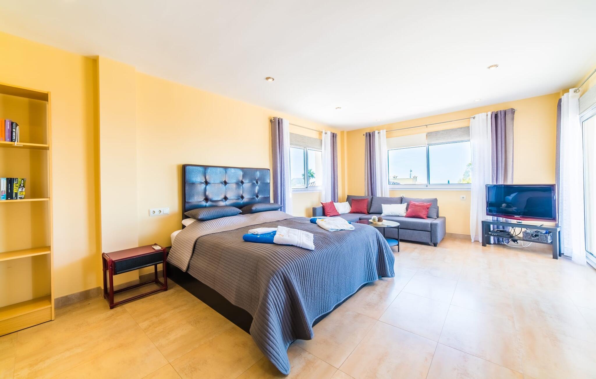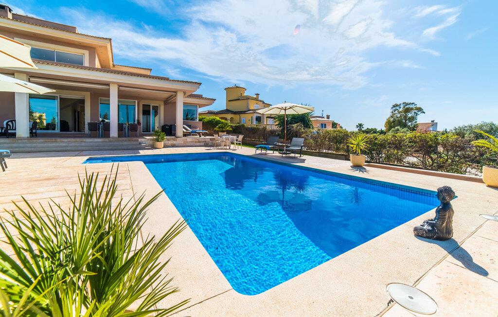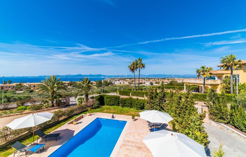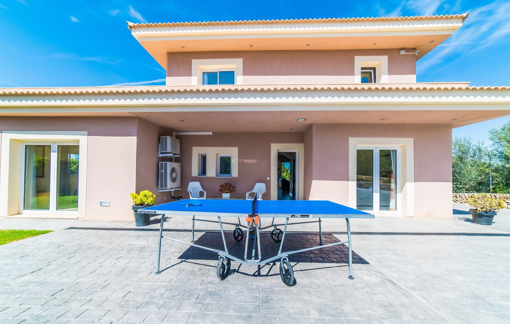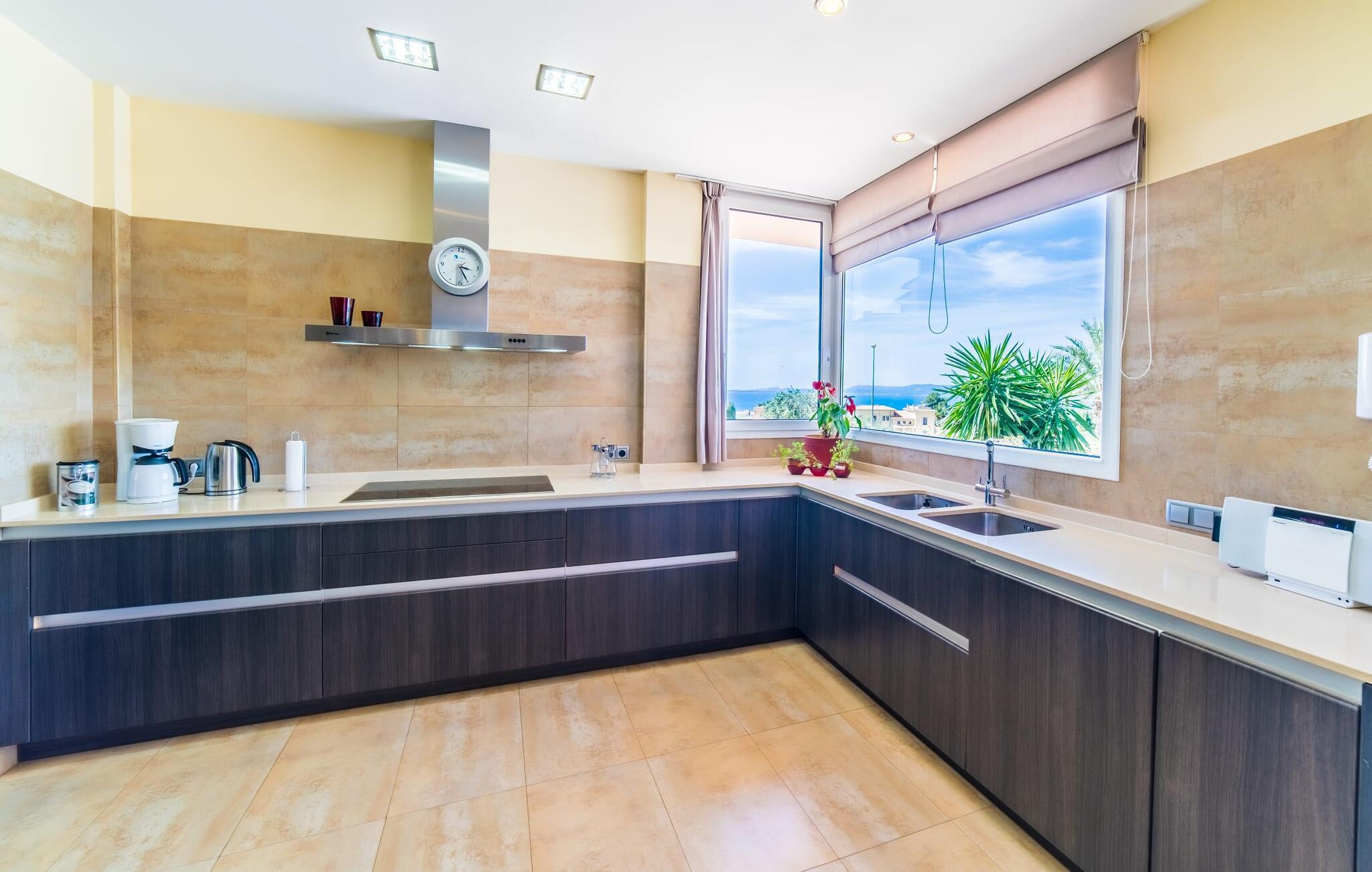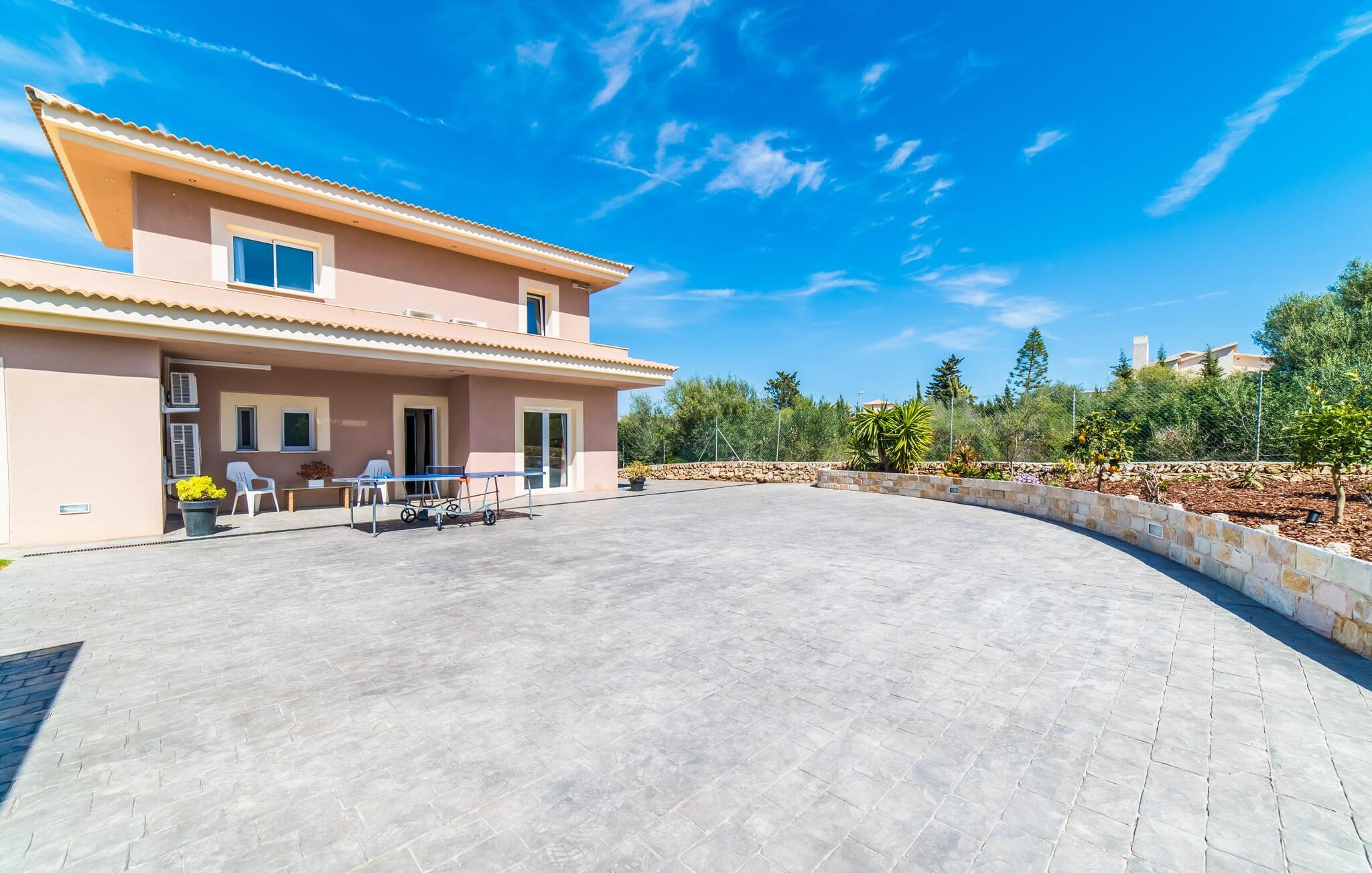 Med det blå hav i sigte og følelsen af et badehåndklæde på huden: Denne moderne, to-etagers villa har store vinduer overalt, men skjuler samtidig smart den smukke pool og dens loungeområder bag træer og hække. Privatlivets fred er meget vigtigt i boligområdet. Med terrassemarkiserne udvidet, vil I virkelig føle jer adskilt fra jeres naboer i det hyggelige udendørs opholdsrum. Her kan I grille, slappe af eller hygge jer efter hjertens lyst. Hele havlandskabet ligger for fødderne af solbadere, der soler sig på den ekspansive tagterrasse. Hvis I vil, kan I også efterlade alt jeres tøj her fra tid til anden. Palma-bugten viser sig i al sin skønhed. Om natten funkler hovedstadens lys, og I spekulerer på, om I vil tage dertil senere for at få en cocktail eller gå en tur. Der er en asfaltparkering ved huset, hvor I kan parkere jeres lejebil sikkert og komfortabelt, og der er også plads nok omkring bordtennisbordet. Villa "Redrema" lover ikke kun rosenrøde tider, Buddha gennemsyrer også huset og bringer harmoni og ferielykke. Opholdsstuen er mere reserveret møbleret og fremhævet med et tv-hjørne, spisebord og udstyret køkken, hvis ekstra store køleskab er ideelt til varme dage og de mange tilbud på landmændenes markeder. Det er ikke kun allergikere, der bliver glade for de tæppefri marmorgulve. Villa “Redrema” ønsker at lukke så meget lys ind i rummene som muligt og er afhængig af den store glasfacade ud mod pool og hav. Vinduer og terrassedøre spiller en afgørende rolle i huset. Der er direkte adgang til det fri fra alle fire gæsteværelser; fra de to nedenunder og de to ovenover. Store indbyggede skabe hjælper jer med at opbevare selv den største bagage. Stueetagen og altanen skal dog bruges i fred. Den rummelige master suite med en 1,8 x 2 m dobbeltseng, ensuite brusebadeværelse og påklædningsområde flyder ind i det åbne galleri, som også har en dobbeltseng og tilbyder jeres gæster begrænset privatliv, men en fantastisk udsigt. Familien kan sagtens komme tættere sammen, mens de solbader og nyder en hyggelig aften med fjernsyn. Der er yderligere to elegante badeværelser i stueetagen, det ene med badekar, så hvert gæsteværelse har sit eget - ikke helt en-suite som ovenpå, men stadig et badeværelse i nærheden... Hvis markedet i Llucmajor er åbent, skal I Sørg for at gå: Den berømte Café Colón på det nostalgiske Plaza España tilføjer et kapitel af øens historie til den kaffe, I drikker. Med koffein i jeres årer og bønnens kraft kan I så ubesværet bestige det 542 m høje Puig de Randa-bjerg. Alene den vidunderlige udsigt er det værd. Som belønning kan I også forkæle jer selv med et gourmetmåltid på klipperne ved Mirador de Cabrera i Cala Pí, selvom det vil sætte et stort indhug i jeres feriebudget. jeres børn kan lege og have det sjovt på Aqualand i El Arenal, det største badeland ved havet på øen. Med sine 60 hektar jord tilbyder Golf Maioris et sted for den kræsne golfspiller. Omgivende strande som Es Trenc er et naturligt fænomen i sig selv. Den flade region omkring Puigderrós har også smukke cykelstier at byde på. Den moderne og komfortable villa "Redrema" ligger kun 500 m fra klippekysten, i det rolige boligområde Sa Torre, med direkte forbindelse til strandene i Palma som Cala Pí og Sa Ràpita. Landmandsmarkedet i Llucmajor ligger omkring 17 km derfra, mens Palma med dets kultur og natteliv ligger 23 km derfra. Det lille indkøbscenter Puigderrós har et velassorteret supermarked. Yderligere butikker og restauranter kan findes i de nærliggende byer Maioris og Badia Gran.
