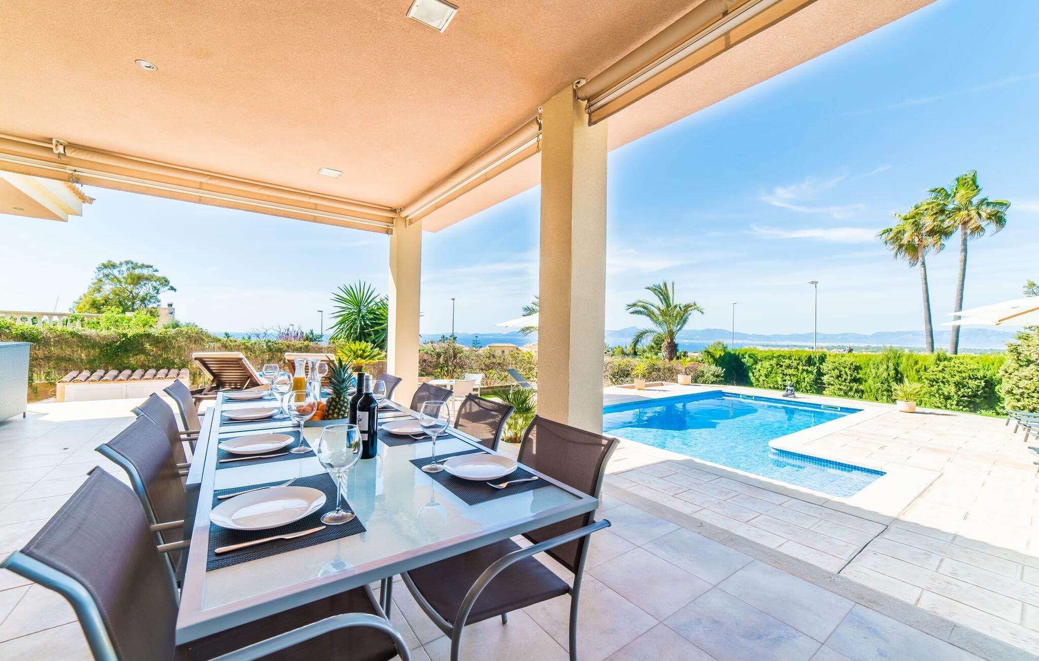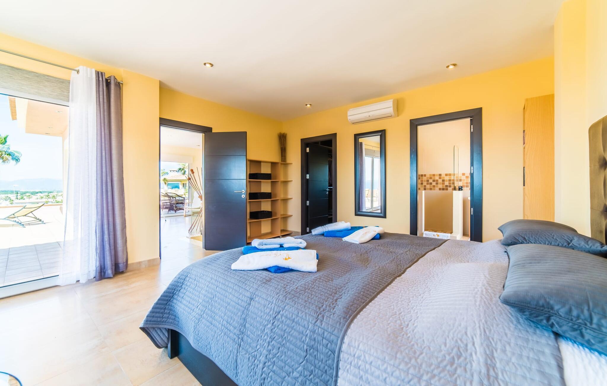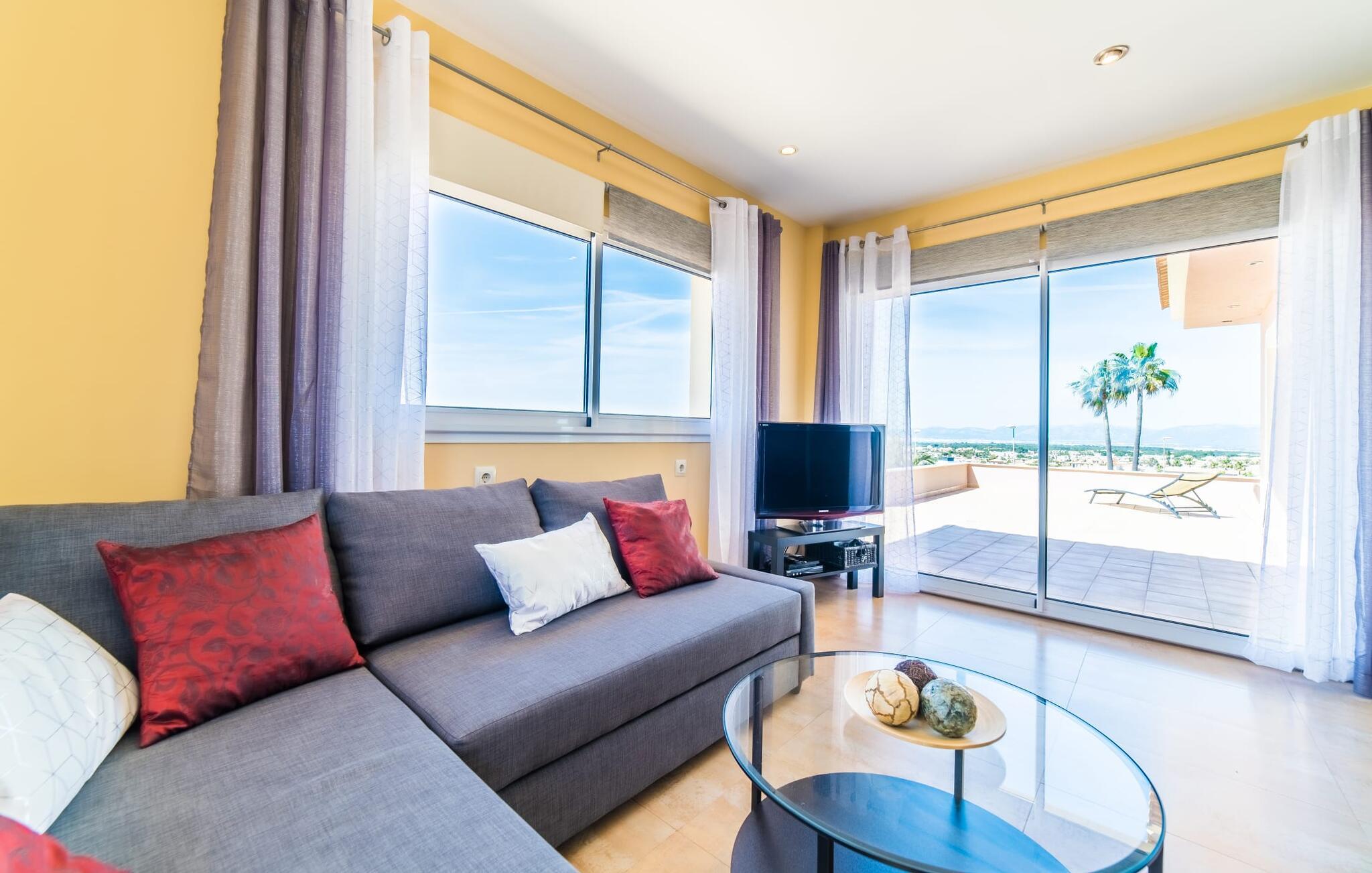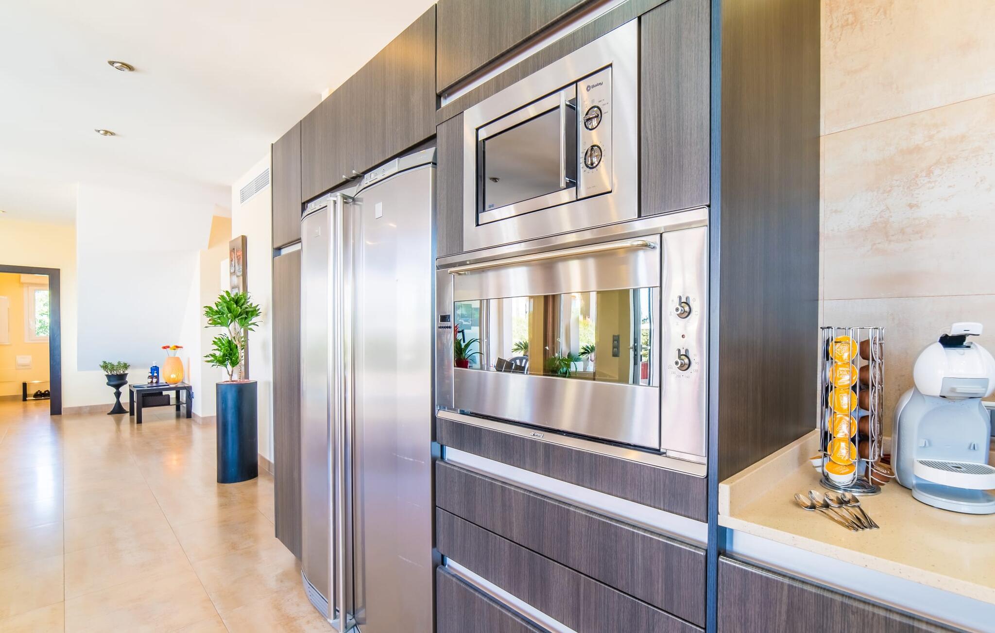 Med det blå hav i sigte og følelsen af et badehåndklæde på huden: Denne moderne, to-etagers villa har store vinduer overalt, men skjuler samtidig smart den smukke pool og dens loungeområder bag træer og hække. Privatlivets fred er meget vigtigt i boligområdet. Med terrassemarkiserne udvidet, vil I virkelig føle jer adskilt fra jeres naboer i det hyggelige udendørs opholdsrum. Her kan I grille, slappe af eller hygge jer efter hjertens lyst. Hele havlandskabet ligger for fødderne af solbadere, der soler sig på den ekspansive tagterrasse. Hvis I vil, kan I også efterlade alt jeres tøj her fra tid til anden. Palma-bugten viser sig i al sin skønhed. Om natten funkler hovedstadens lys, og I spekulerer på, om I vil tage dertil senere for at få en cocktail eller gå en tur. Der er en asfaltparkering ved huset, hvor I kan parkere jeres lejebil sikkert og komfortabelt, og der er også plads nok omkring bordtennisbordet. Villa "Redrema" lover ikke kun rosenrøde tider, Buddha gennemsyrer også huset og bringer harmoni og ferielykke. Opholdsstuen er mere reserveret møbleret og fremhævet med et tv-hjørne, spisebord og udstyret køkken, hvis ekstra store køleskab er ideelt til varme dage og de mange tilbud på landmændenes markeder. Det er ikke kun allergikere, der bliver glade for de tæppefri marmorgulve. Villa “Redrema” ønsker at lukke så meget lys ind i rummene som muligt og er afhængig af den store glasfacade ud mod pool og hav. Vinduer og terrassedøre spiller en afgørende rolle i huset. Der er direkte adgang til det fri fra alle fire gæsteværelser; fra de to nedenunder og de to ovenover. Store indbyggede skabe hjælper jer med at opbevare selv den største bagage. Stueetagen og altanen skal dog bruges i fred. Den rummelige master suite med en 1,8 x 2 m dobbeltseng, ensuite brusebadeværelse og påklædningsområde flyder ind i det åbne galleri, som også har en dobbeltseng og tilbyder jeres gæster begrænset privatliv, men en fantastisk udsigt. Familien kan sagtens komme tættere sammen, mens de solbader og nyder en hyggelig aften med fjernsyn. Der er yderligere to elegante badeværelser i stueetagen, det ene med badekar, så hvert gæsteværelse har sit eget - ikke helt en-suite som ovenpå, men stadig et badeværelse i nærheden... Hvis markedet i Llucmajor er åbent, skal I Sørg for at gå: Den berømte Café Colón på det nostalgiske Plaza España tilføjer et kapitel af øens historie til den kaffe, I drikker. Med koffein i jeres årer og bønnens kraft kan I så ubesværet bestige det 542 m høje Puig de Randa-bjerg. Alene den vidunderlige udsigt er det værd. Som belønning kan I også forkæle jer selv med et gourmetmåltid på klipperne ved Mirador de Cabrera i Cala Pí, selvom det vil sætte et stort indhug i jeres feriebudget. jeres børn kan lege og have det sjovt på Aqualand i El Arenal, det største badeland ved havet på øen. Med sine 60 hektar jord tilbyder Golf Maioris et sted for den kræsne golfspiller. Omgivende strande som Es Trenc er et naturligt fænomen i sig selv. Den flade region omkring Puigderrós har også smukke cykelstier at byde på. Den moderne og komfortable villa "Redrema" ligger kun 500 m fra klippekysten, i det rolige boligområde Sa Torre, med direkte forbindelse til strandene i Palma som Cala Pí og Sa Ràpita. Landmandsmarkedet i Llucmajor ligger omkring 17 km derfra, mens Palma med dets kultur og natteliv ligger 23 km derfra. Det lille indkøbscenter Puigderrós har et velassorteret supermarked. Yderligere butikker og restauranter kan findes i de nærliggende byer Maioris og Badia Gran.