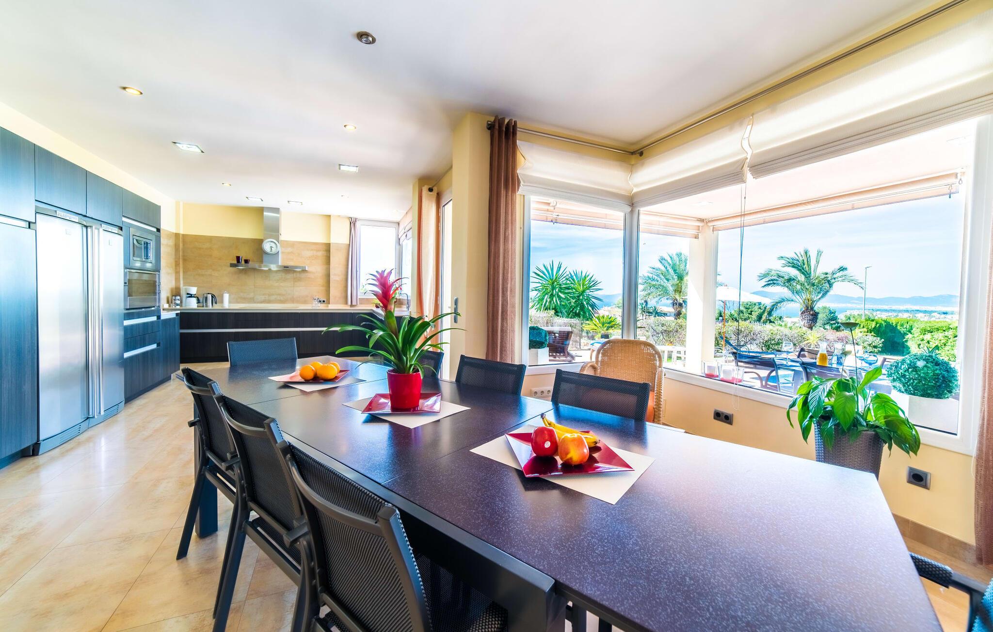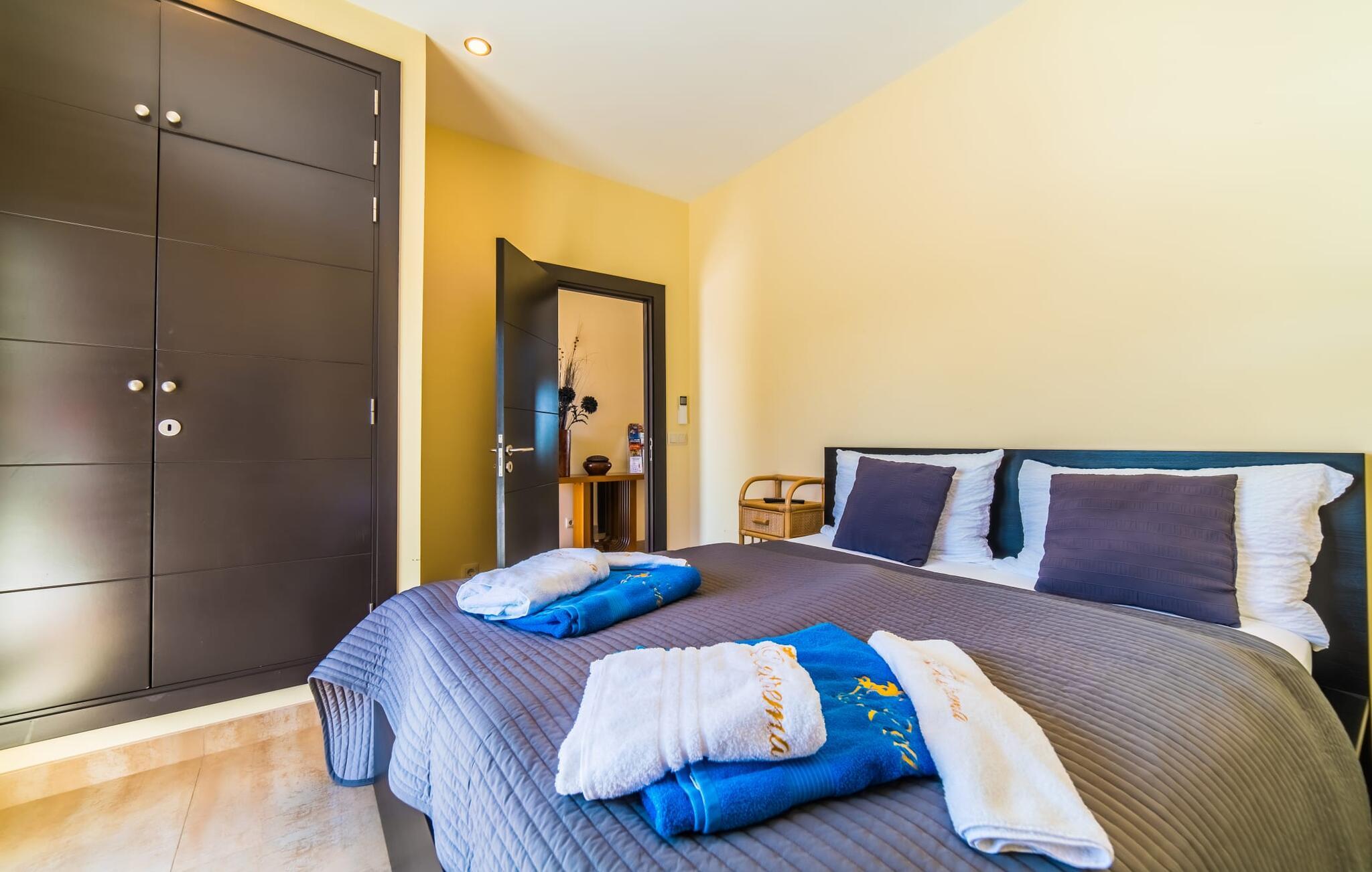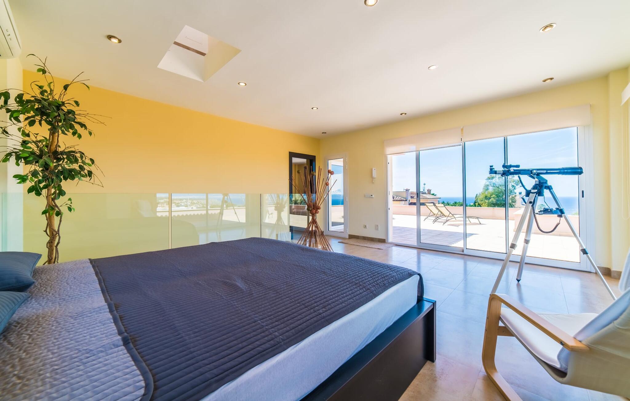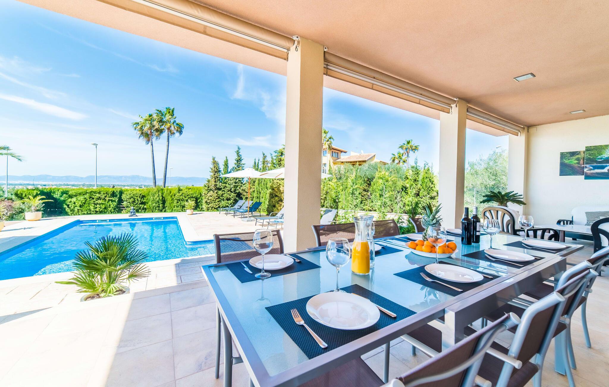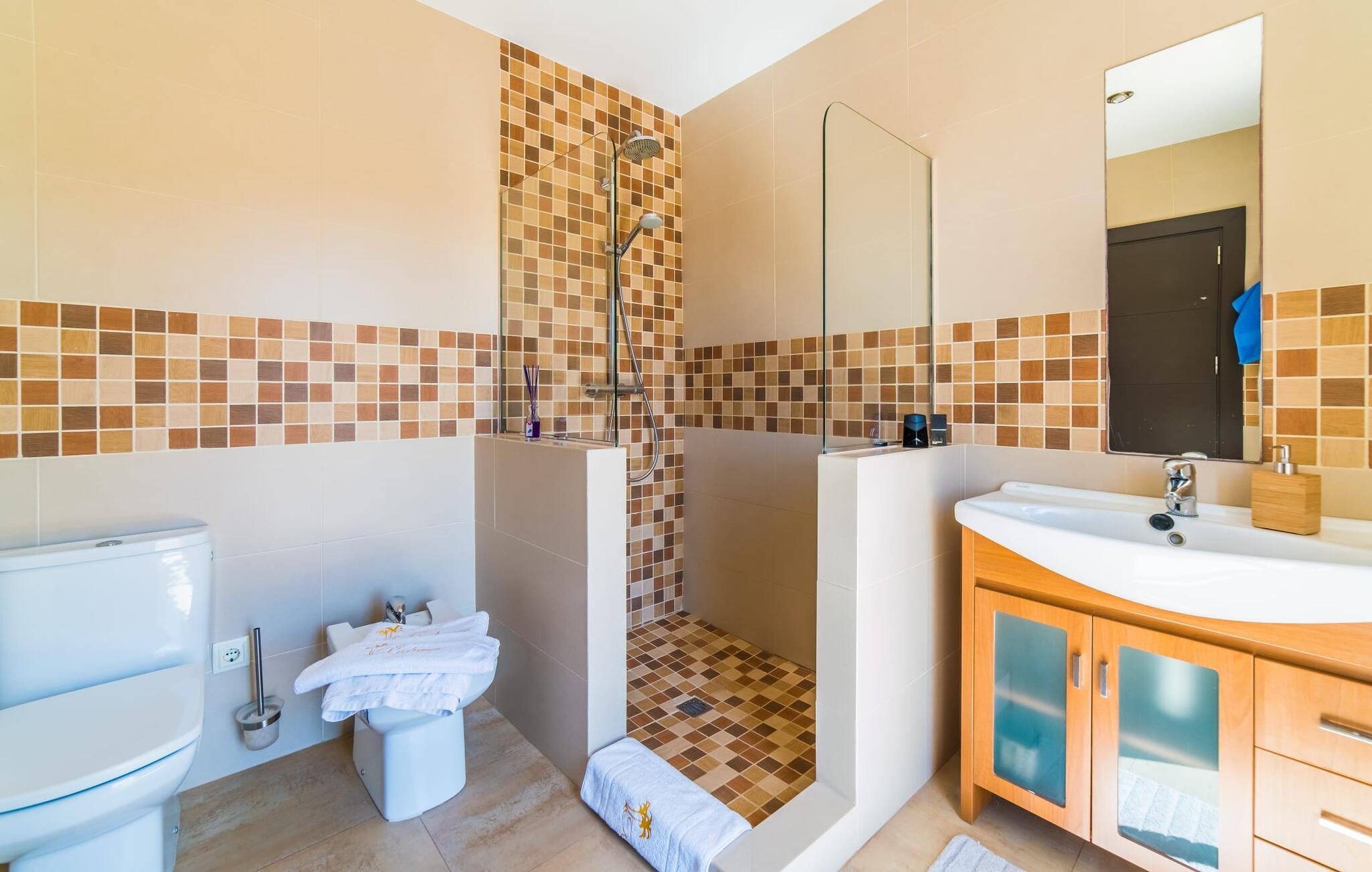 Med det blå hav i sigte og følelsen af et badehåndklæde på huden: Denne moderne, to-etagers villa har store vinduer overalt, men skjuler samtidig smart den smukke pool og dens loungeområder bag træer og hække. Privatlivets fred er meget vigtigt i boligområdet. Med terrassemarkiserne udvidet, vil I virkelig føle jer adskilt fra jeres naboer i det hyggelige udendørs opholdsrum. Her kan I grille, slappe af eller hygge jer efter hjertens lyst. Hele havlandskabet ligger for fødderne af solbadere, der soler sig på den ekspansive tagterrasse. Hvis I vil, kan I også efterlade alt jeres tøj her fra tid til anden. Palma-bugten viser sig i al sin skønhed. Om natten funkler hovedstadens lys, og I spekulerer på, om I vil tage dertil senere for at få en cocktail eller gå en tur. Der er en asfaltparkering ved huset, hvor I kan parkere jeres lejebil sikkert og komfortabelt, og der er også plads nok omkring bordtennisbordet. Villa "Redrema" lover ikke kun rosenrøde tider, Buddha gennemsyrer også huset og bringer harmoni og ferielykke. Opholdsstuen er mere reserveret møbleret og fremhævet med et tv-hjørne, spisebord og udstyret køkken, hvis ekstra store køleskab er ideelt til varme dage og de mange tilbud på landmændenes markeder. Det er ikke kun allergikere, der bliver glade for de tæppefri marmorgulve. Villa “Redrema” ønsker at lukke så meget lys ind i rummene som muligt og er afhængig af den store glasfacade ud mod pool og hav. Vinduer og terrassedøre spiller en afgørende rolle i huset. Der er direkte adgang til det fri fra alle fire gæsteværelser; fra de to nedenunder og de to ovenover. Store indbyggede skabe hjælper jer med at opbevare selv den største bagage. Stueetagen og altanen skal dog bruges i fred. Den rummelige master suite med en 1,8 x 2 m dobbeltseng, ensuite brusebadeværelse og påklædningsområde flyder ind i det åbne galleri, som også har en dobbeltseng og tilbyder jeres gæster begrænset privatliv, men en fantastisk udsigt. Familien kan sagtens komme tættere sammen, mens de solbader og nyder en hyggelig aften med fjernsyn. Der er yderligere to elegante badeværelser i stueetagen, det ene med badekar, så hvert gæsteværelse har sit eget - ikke helt en-suite som ovenpå, men stadig et badeværelse i nærheden... Hvis markedet i Llucmajor er åbent, skal I Sørg for at gå: Den berømte Café Colón på det nostalgiske Plaza España tilføjer et kapitel af øens historie til den kaffe, I drikker. Med koffein i jeres årer og bønnens kraft kan I så ubesværet bestige det 542 m høje Puig de Randa-bjerg. Alene den vidunderlige udsigt er det værd. Som belønning kan I også forkæle jer selv med et gourmetmåltid på klipperne ved Mirador de Cabrera i Cala Pí, selvom det vil sætte et stort indhug i jeres feriebudget. jeres børn kan lege og have det sjovt på Aqualand i El Arenal, det største badeland ved havet på øen. Med sine 60 hektar jord tilbyder Golf Maioris et sted for den kræsne golfspiller. Omgivende strande som Es Trenc er et naturligt fænomen i sig selv. Den flade region omkring Puigderrós har også smukke cykelstier at byde på. Den moderne og komfortable villa "Redrema" ligger kun 500 m fra klippekysten, i det rolige boligområde Sa Torre, med direkte forbindelse til strandene i Palma som Cala Pí og Sa Ràpita. Landmandsmarkedet i Llucmajor ligger omkring 17 km derfra, mens Palma med dets kultur og natteliv ligger 23 km derfra. Det lille indkøbscenter Puigderrós har et velassorteret supermarked. Yderligere butikker og restauranter kan findes i de nærliggende byer Maioris og Badia Gran.