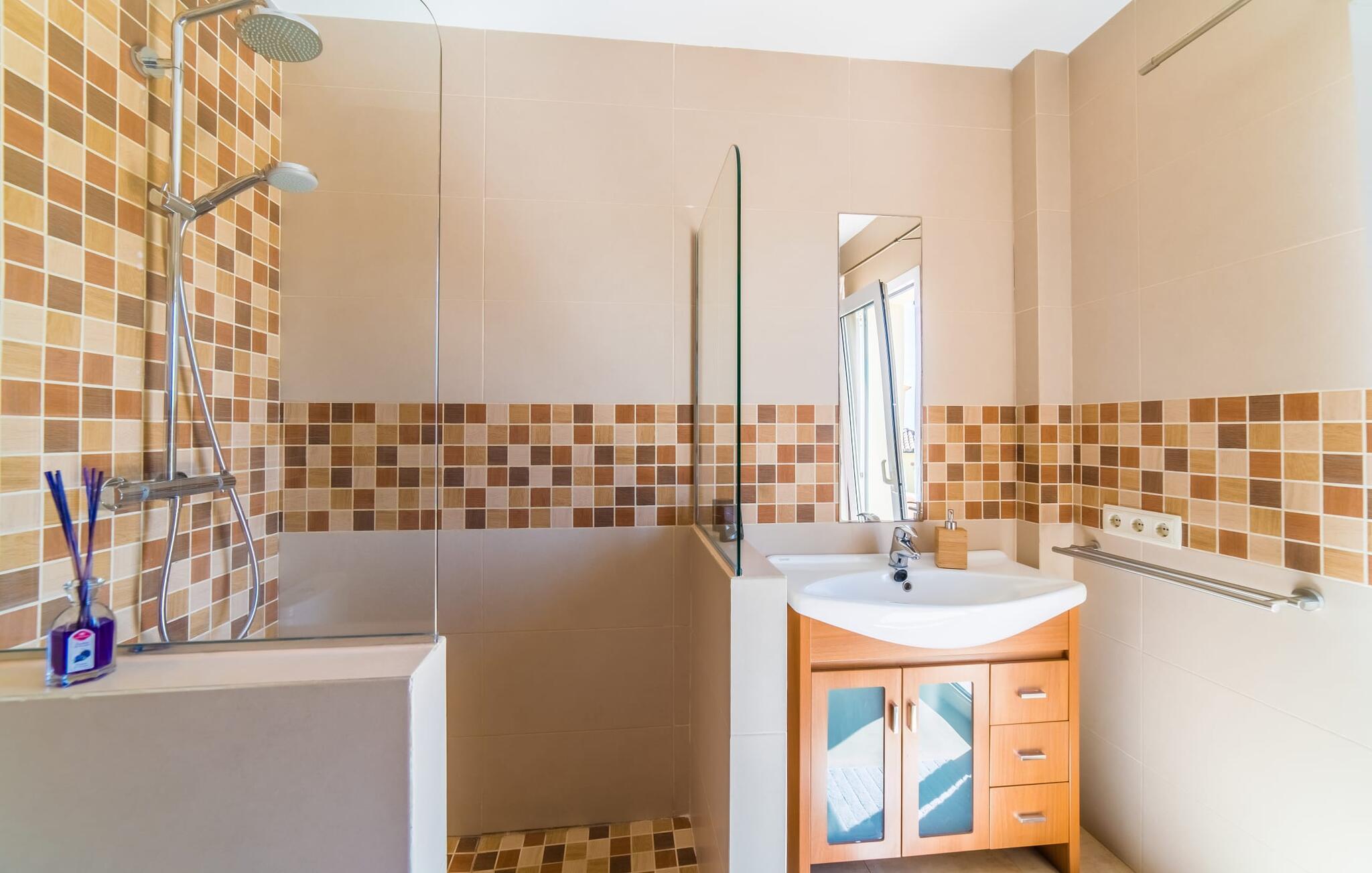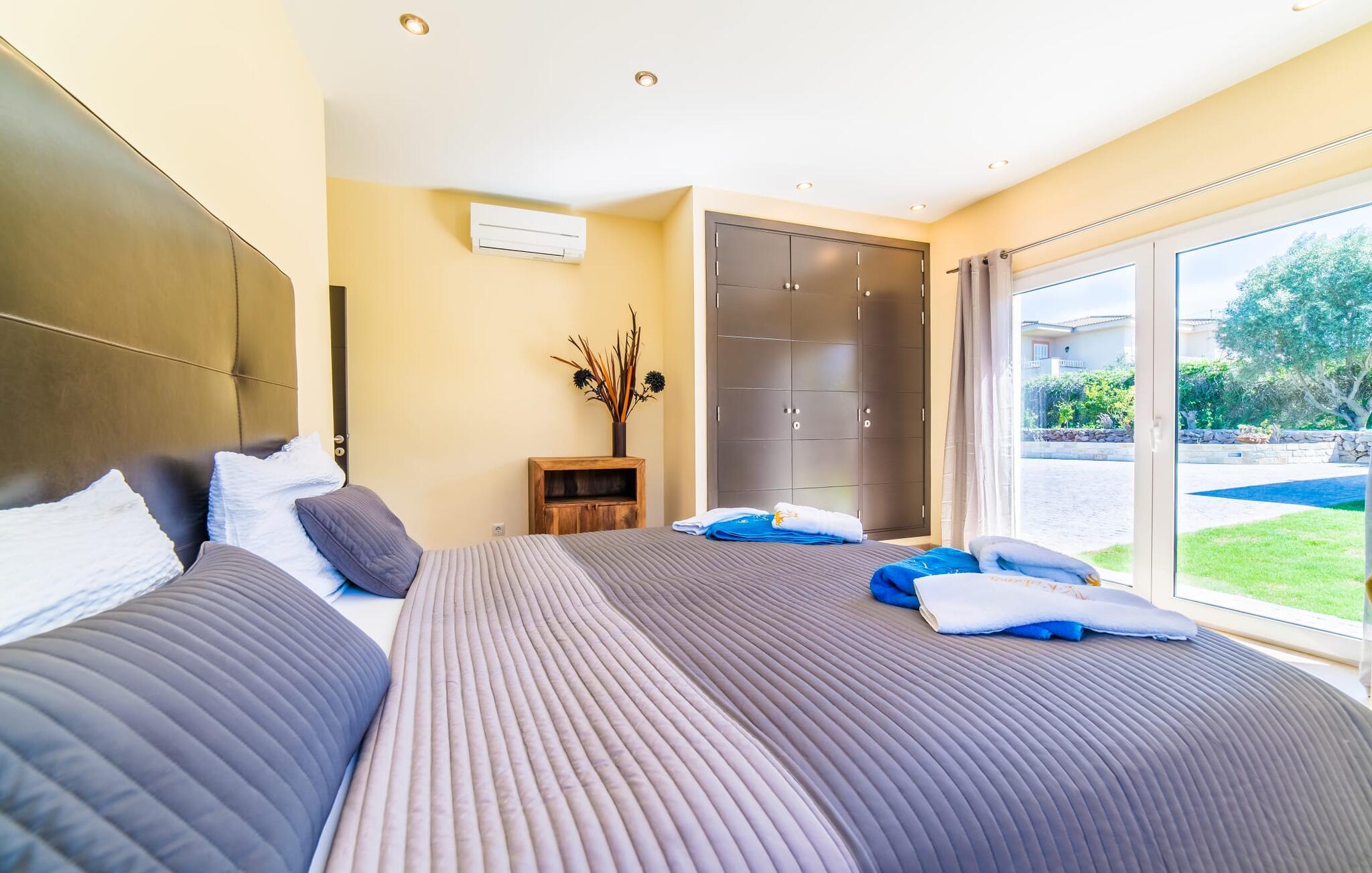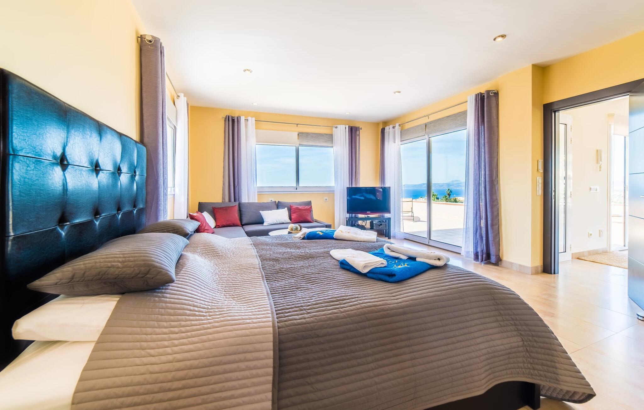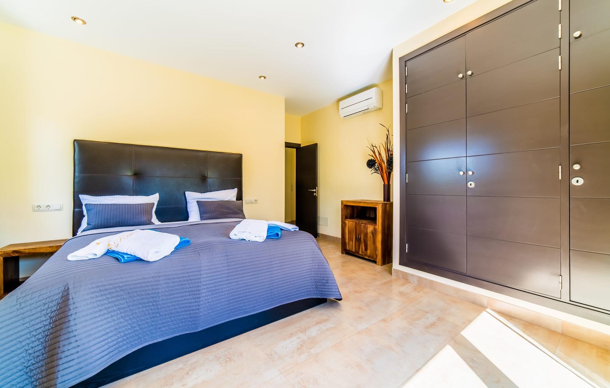 Med det blå hav i sigte og følelsen af et badehåndklæde på huden: Denne moderne, to-etagers villa har store vinduer overalt, men skjuler samtidig smart den smukke pool og dens loungeområder bag træer og hække. Privatlivets fred er meget vigtigt i boligområdet. Med terrassemarkiserne udvidet, vil I virkelig føle jer adskilt fra jeres naboer i det hyggelige udendørs opholdsrum. Her kan I grille, slappe af eller hygge jer efter hjertens lyst. Hele havlandskabet ligger for fødderne af solbadere, der soler sig på den ekspansive tagterrasse. Hvis I vil, kan I også efterlade alt jeres tøj her fra tid til anden. Palma-bugten viser sig i al sin skønhed. Om natten funkler hovedstadens lys, og I spekulerer på, om I vil tage dertil senere for at få en cocktail eller gå en tur. Der er en asfaltparkering ved huset, hvor I kan parkere jeres lejebil sikkert og komfortabelt, og der er også plads nok omkring bordtennisbordet. Villa "Redrema" lover ikke kun rosenrøde tider, Buddha gennemsyrer også huset og bringer harmoni og ferielykke. Opholdsstuen er mere reserveret møbleret og fremhævet med et tv-hjørne, spisebord og udstyret køkken, hvis ekstra store køleskab er ideelt til varme dage og de mange tilbud på landmændenes markeder. Det er ikke kun allergikere, der bliver glade for de tæppefri marmorgulve. Villa “Redrema” ønsker at lukke så meget lys ind i rummene som muligt og er afhængig af den store glasfacade ud mod pool og hav. Vinduer og terrassedøre spiller en afgørende rolle i huset. Der er direkte adgang til det fri fra alle fire gæsteværelser; fra de to nedenunder og de to ovenover. Store indbyggede skabe hjælper jer med at opbevare selv den største bagage. Stueetagen og altanen skal dog bruges i fred. Den rummelige master suite med en 1,8 x 2 m dobbeltseng, ensuite brusebadeværelse og påklædningsområde flyder ind i det åbne galleri, som også har en dobbeltseng og tilbyder jeres gæster begrænset privatliv, men en fantastisk udsigt. Familien kan sagtens komme tættere sammen, mens de solbader og nyder en hyggelig aften med fjernsyn. Der er yderligere to elegante badeværelser i stueetagen, det ene med badekar, så hvert gæsteværelse har sit eget - ikke helt en-suite som ovenpå, men stadig et badeværelse i nærheden... Hvis markedet i Llucmajor er åbent, skal I Sørg for at gå: Den berømte Café Colón på det nostalgiske Plaza España tilføjer et kapitel af øens historie til den kaffe, I drikker. Med koffein i jeres årer og bønnens kraft kan I så ubesværet bestige det 542 m høje Puig de Randa-bjerg. Alene den vidunderlige udsigt er det værd. Som belønning kan I også forkæle jer selv med et gourmetmåltid på klipperne ved Mirador de Cabrera i Cala Pí, selvom det vil sætte et stort indhug i jeres feriebudget. jeres børn kan lege og have det sjovt på Aqualand i El Arenal, det største badeland ved havet på øen. Med sine 60 hektar jord tilbyder Golf Maioris et sted for den kræsne golfspiller. Omgivende strande som Es Trenc er et naturligt fænomen i sig selv. Den flade region omkring Puigderrós har også smukke cykelstier at byde på. Den moderne og komfortable villa "Redrema" ligger kun 500 m fra klippekysten, i det rolige boligområde Sa Torre, med direkte forbindelse til strandene i Palma som Cala Pí og Sa Ràpita. Landmandsmarkedet i Llucmajor ligger omkring 17 km derfra, mens Palma med dets kultur og natteliv ligger 23 km derfra. Det lille indkøbscenter Puigderrós har et velassorteret supermarked. Yderligere butikker og restauranter kan findes i de nærliggende byer Maioris og Badia Gran.