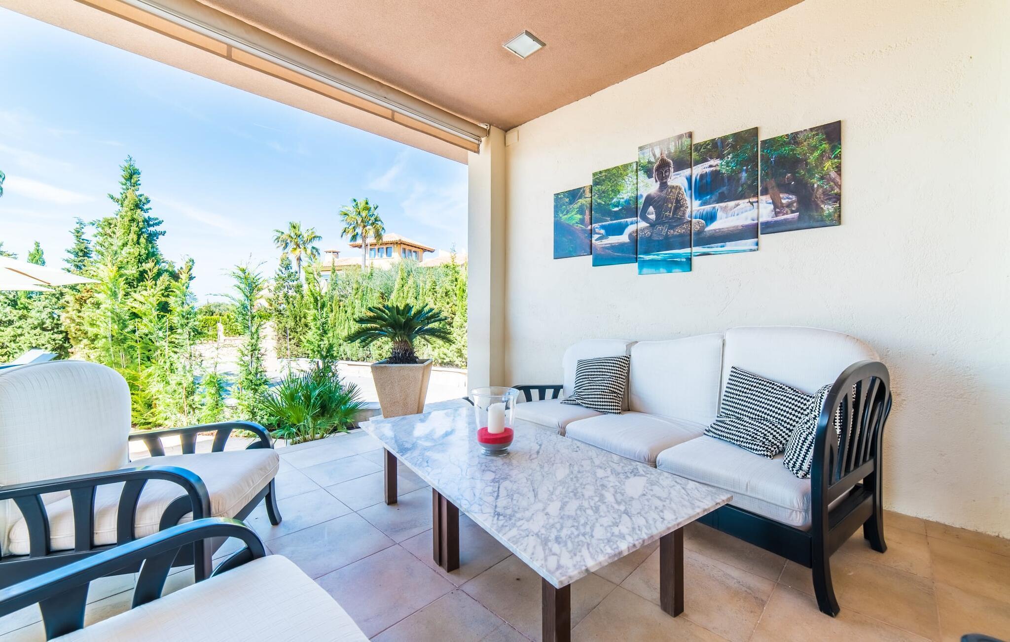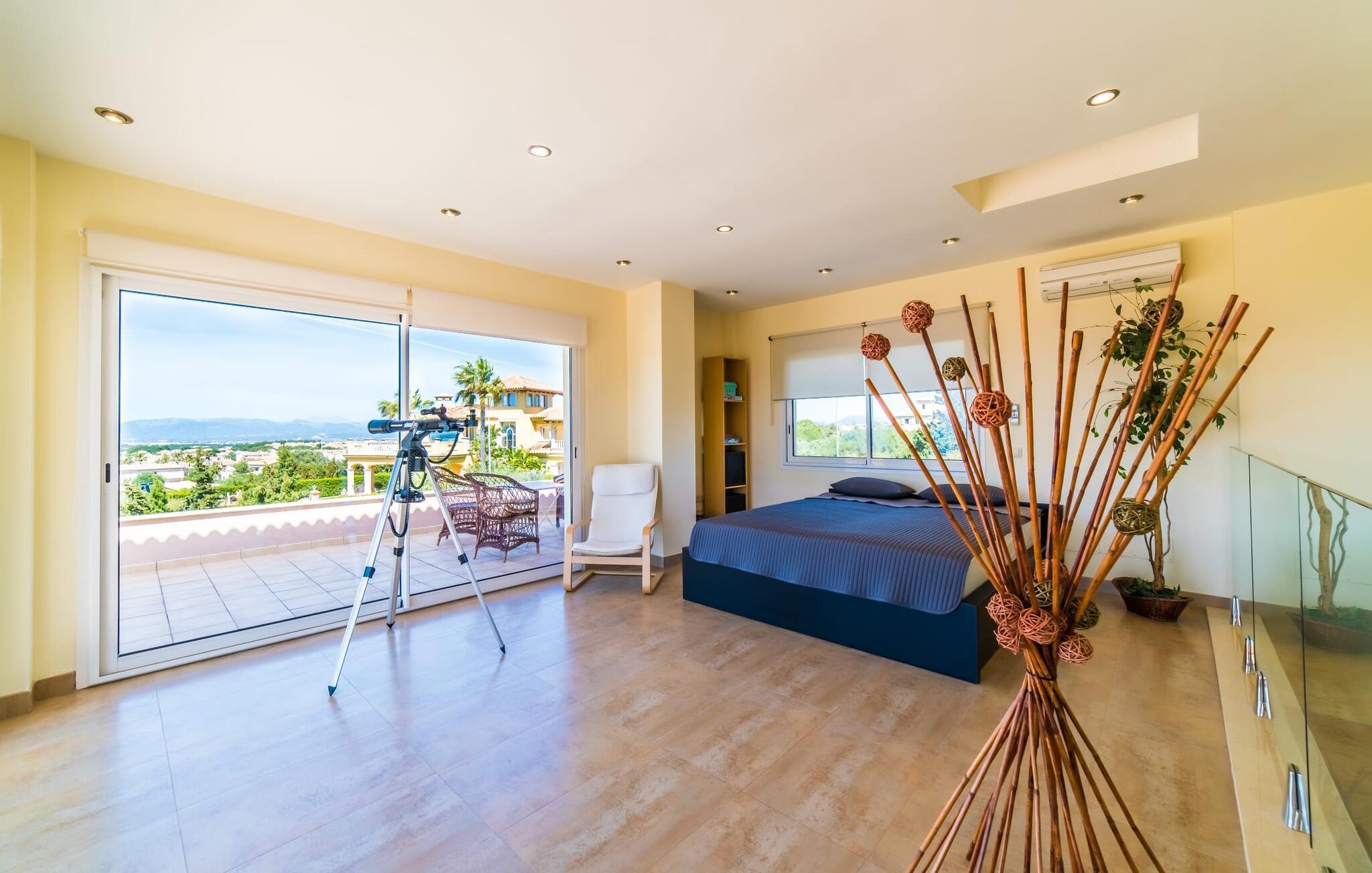 Med det blå hav i sigte og følelsen af et badehåndklæde på huden: Denne moderne, to-etagers villa har store vinduer overalt, men skjuler samtidig smart den smukke pool og dens loungeområder bag træer og hække. Privatlivets fred er meget vigtigt i boligområdet. Med terrassemarkiserne udvidet, vil du virkelig føle dig adskilt fra dine naboer i det hyggelige udendørs opholdsrum. Her kan du grille, slappe af eller hygge dig efter hjertens lyst. Hele havlandskabet ligger for fødderne af solbadere, der soler sig på den ekspansive tagterrasse. Hvis du vil, kan du også efterlade alt dit tøj her fra tid til anden. Palma-bugten viser sig i al sin skønhed. Om natten funkler hovedstadens lys, og du spekulerer på, om du vil tage dertil senere for at få en cocktail eller gå en tur. Der er en asfaltparkering ved huset, hvor du kan parkere din lejebil sikkert og komfortabelt, og der er også plads nok omkring bordtennisbordet. Villa "Redrema" lover ikke kun rosenrøde tider, Buddha gennemsyrer også huset og bringer harmoni og ferielykke. Dette er et Fincallorca feriehus. Opholdsstuen er mere reserveret møbleret og fremhævet med et tv-hjørne, spisebord og udstyret køkken, hvis ekstra store køleskab er ideelt til varme dage og de mange tilbud på landmændenes markeder. Det er ikke kun allergikere, der bliver glade for de tæppefri marmorgulve. Villa “Redrema” ønsker at lukke så meget lys ind i rummene som muligt og er afhængig af den store glasfacade ud mod pool og hav. Vinduer og terrassedøre spiller en afgørende rolle i huset. Der er direkte adgang til det fri fra alle fire gæsteværelser; fra de to nedenunder og de to ovenover. Store indbyggede skabe hjælper dig med at opbevare selv den største bagage. Stueetagen og altanen skal dog bruges i fred. Den rummelige master suite med en 1,8 x 2 m dobbeltseng, ensuite brusebadeværelse og påklædningsområde flyder ind i det åbne galleri, som også har en dobbeltseng og tilbyder dine gæster begrænset privatliv, men en fantastisk udsigt. Familien kan sagtens komme tættere sammen, mens de solbader og nyder en hyggelig aften med fjernsyn. Der er yderligere to elegante badeværelser i stueetagen, det ene med badekar, så hvert gæsteværelse har sit eget - ikke helt en-suite som ovenpå, men stadig et badeværelse i nærheden... Hvis markedet i Llucmajor er åbent, skal du Sørg for at gå: Den berømte Café Colón på det nostalgiske Plaza España tilføjer et kapitel af øens historie til den kaffe, du drikker. Med koffein i dine årer og bønnens kraft kan du så ubesværet bestige det 542 m høje Puig de Randa-bjerg. Alene den vidunderlige udsigt er det værd. Som belønning kan du også forkæle dig selv med et gourmetmåltid på klipperne ved Mirador de Cabrera i Cala Pí, selvom det vil sætte et stort indhug i dit feriebudget. Dine børn kan lege og have det sjovt på Aqualand i El Arenal, det største badeland ved havet på øen. Med sine 60 hektar jord tilbyder Golf Maioris et sted for den kræsne golfspiller. Omgivende strande som Es Trenc er et naturligt fænomen i sig selv. Den flade region omkring Puigderrós har også smukke cykelstier at byde på. Den moderne og komfortable villa "Redrema" ligger kun 500 m fra klippekysten, i det rolige boligområde Sa Torre, med direkte forbindelse til strandene i Palma såsom Cala Pí og Sa Ràpita. Landmandsmarkedet i Llucmajor ligger omkring 17 km derfra, mens Palma med dets kultur og natteliv ligger 23 km derfra. Det lille indkøbscenter Puigderrós har et velassorteret supermarked. Yderligere butikker og restauranter kan findes i de nærliggende byer Maioris og Badia Gran.