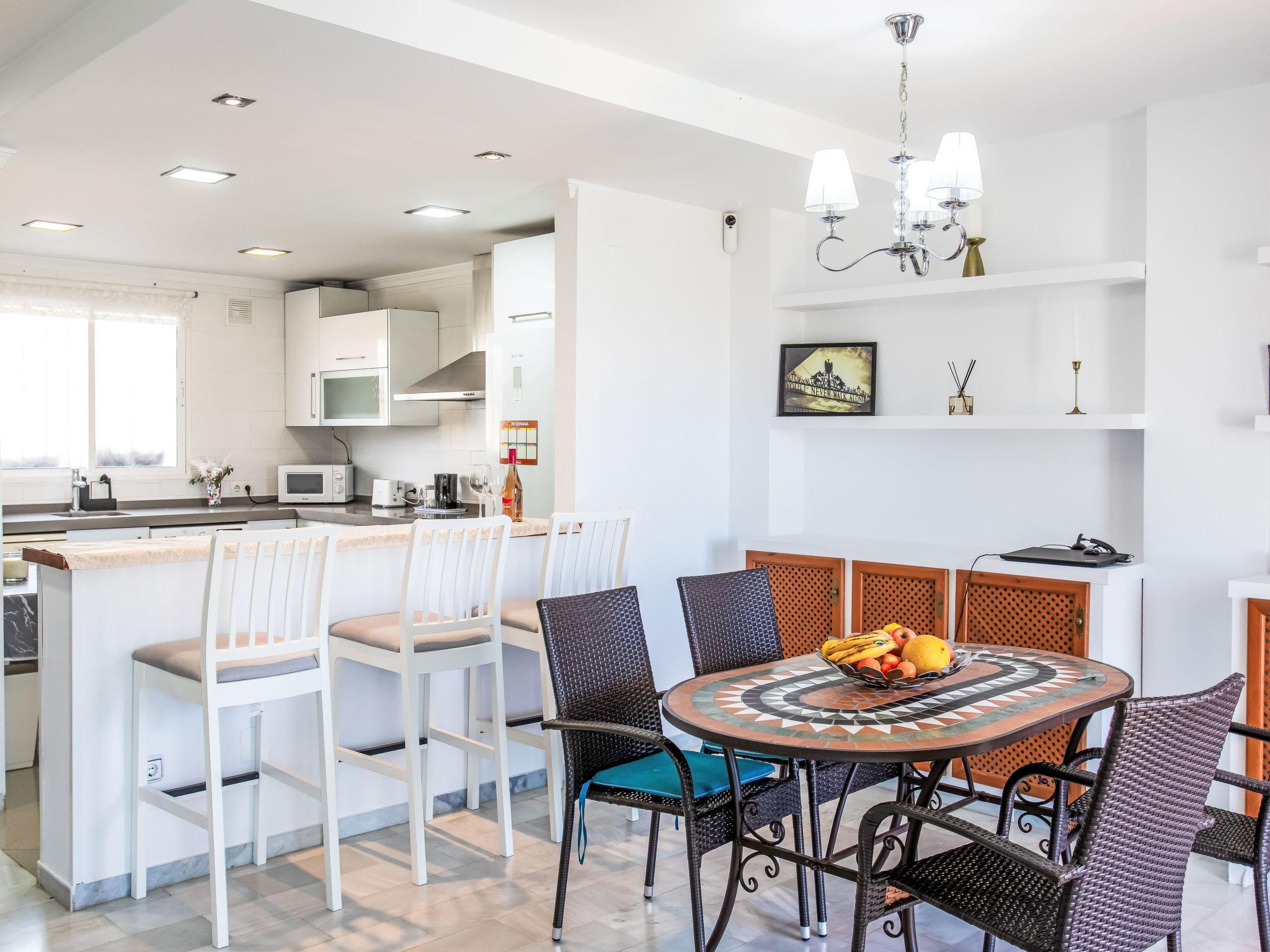 "Los almendros", 3-room terraced house 150 m2, south facing position. Spacious, practical and beautiful furnishings: living/dining room with digital TV, air conditioning and boiler (80 litres). Exit to the terrace. Open kitchen (oven, dishwasher, 3 induction hot plates, toaster, kettle, microwave, freezer, electric coffee machine). Shower/WC. Heating not available in all rooms. Upper floor: 1 room with 2 beds (90 cm, length 190 cm), air conditioning and forced-air heating. 1 room with 2 beds (150 cm, length 190 cm), air conditioning and fan. Bath/WC. Small terrace. Terrace furniture, barbecue, deck chairs (2). Partial view of the sea. Facilities: washing machine, iron, hair dryer. Internet (WiFi, free). Parking space n 29. Please note: TV only ES. VFT/MA/73848 // Reg. Nr.: ESFCTU0000290250003742770000000000000000VFT/MA/738488
