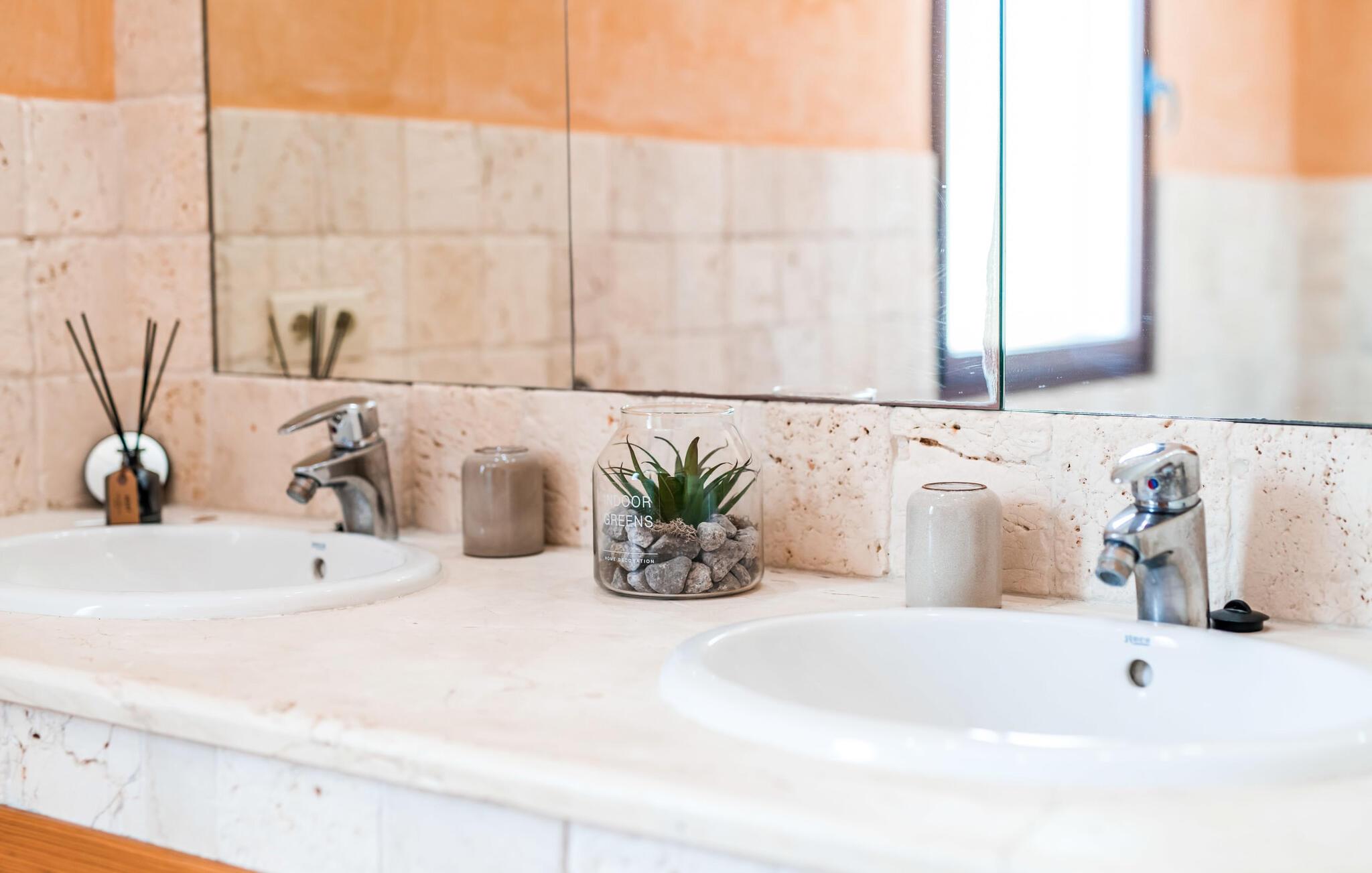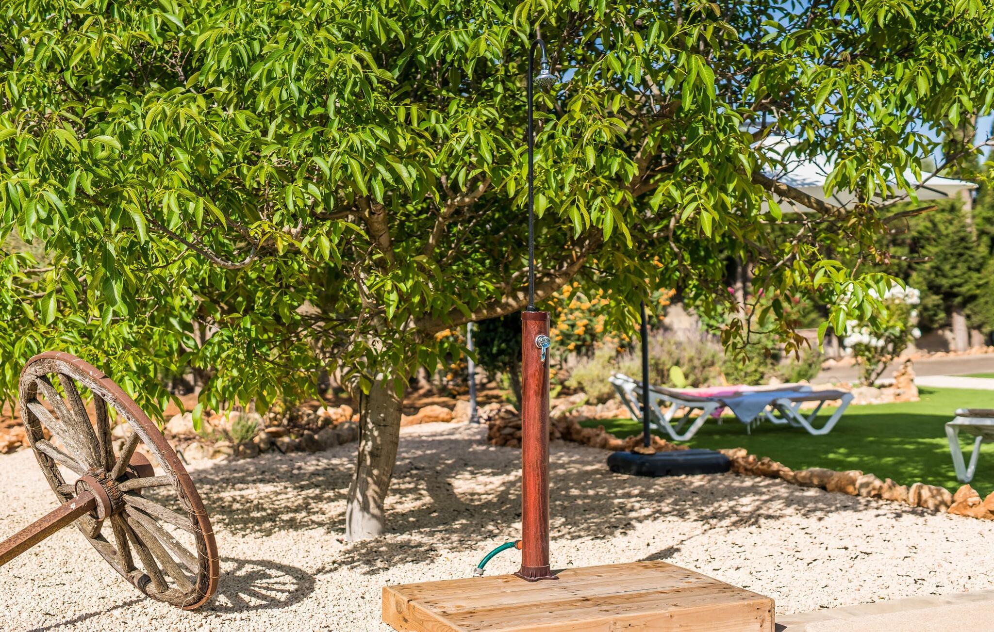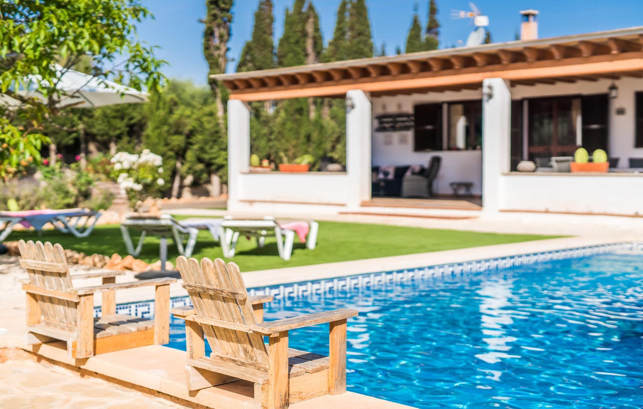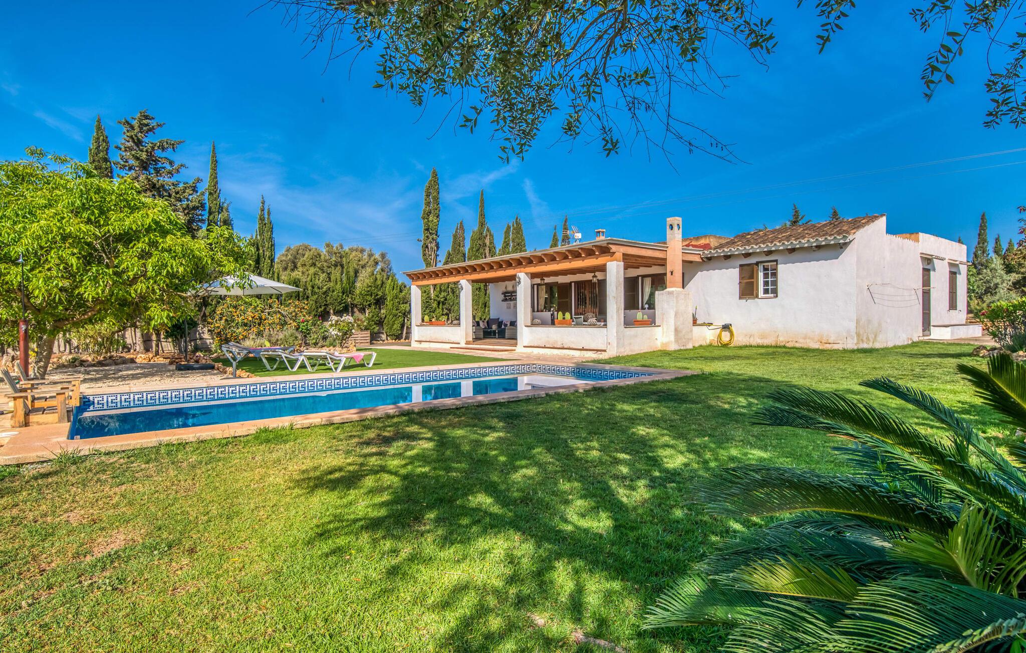 Den charmerende bondegård med det melodiøse navn "Roca de Tejos" imponerer med sin behagelige tilbageholdenhed. Hele ejendommen er meget naturlig, haven er præget af gamle oliventræer, majestætiske palmer og middelhavsdiversitet. I kan udforske landsbyen Sa Coma og dens omgivelser til fods eller ved hjælp af de fire tilgængelige cykler. Nyd den mallorcanske idyl i jeres have, som er domineret af et mosaikvandsbassin og en solterrasse. I kan slappe af på liggestolene på plænen eller på liggestolene ved poolen. En smuk veranda strækker sig i hele husets længde. Dette overdækkede område har en lounge og udendørs spiseplads. Grillen er praktisk taget integreret i terrassen. Derfra kommer I ind i husets indre med dens rummelige stue med pejs og spiseplads samt køkkenet. Der er tre soveværelser og to badeværelser, hvoraf badeværelset er en suite med bruseniche. Takket være det varme/kolde klimaanlæg er huset behageligt varmt året rundt og kan bruges som sommerhus i alle måneder. Det charmerende bondehus "Roca de Tejos" imponerer med en smuk middelhavshave og pool i en behagelig, afsondret beliggenhed. Den rustikke ejendom ligger sydøst for den smukke by Sant Llorenç i kystbæltet. Den nærliggende vej betyder, at det kun er 5 minutters kørsel til havet og fantastiske sandstrande som S'Illot eller Sa Coma.
