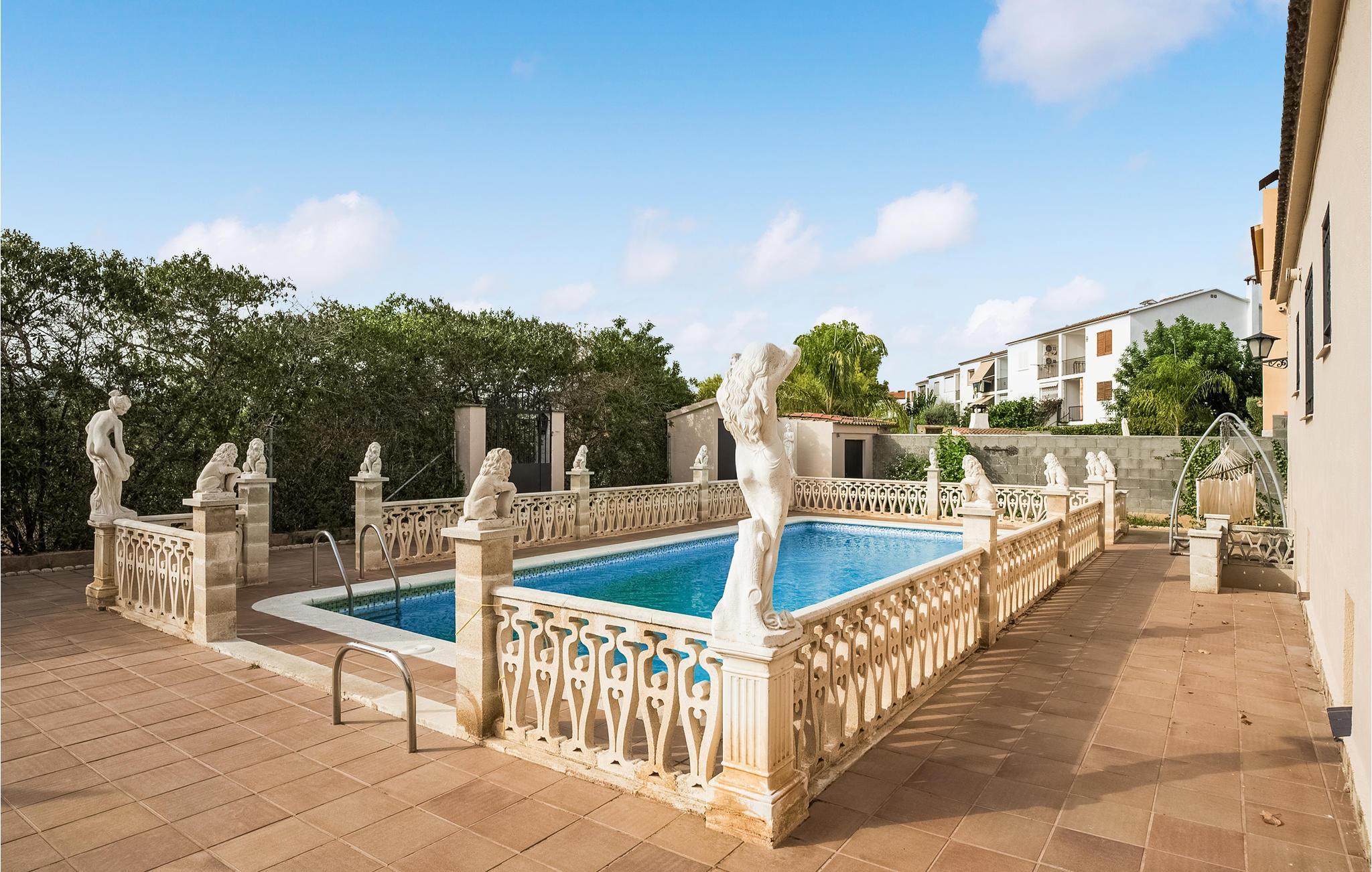I når huset gennem en smuk veranda. Ved indgangen finder I den komfortable og rummelige spisestue, der fører til det fuldt renoverede og udstyrede køkken. Huset er lyst indrettet med to badeværelser, tre dobbeltværelser og et tredobbelt værelse. Værelserne er praktisk taget fordelt på en etage. Den rummelige have er fuld af elegante skulpturer, springvand og lanterner, der giver huset en speciel atmosfære. Poolområdet er rummeligt og har et komplet badeværelse. Her er også grillen med flere spisesteder eller bare at nyde udendørs.