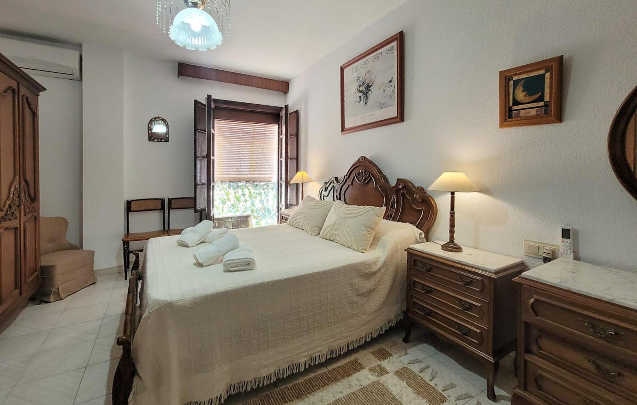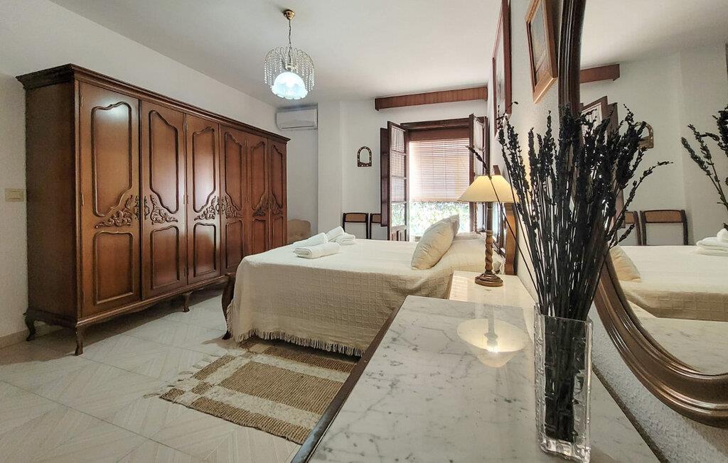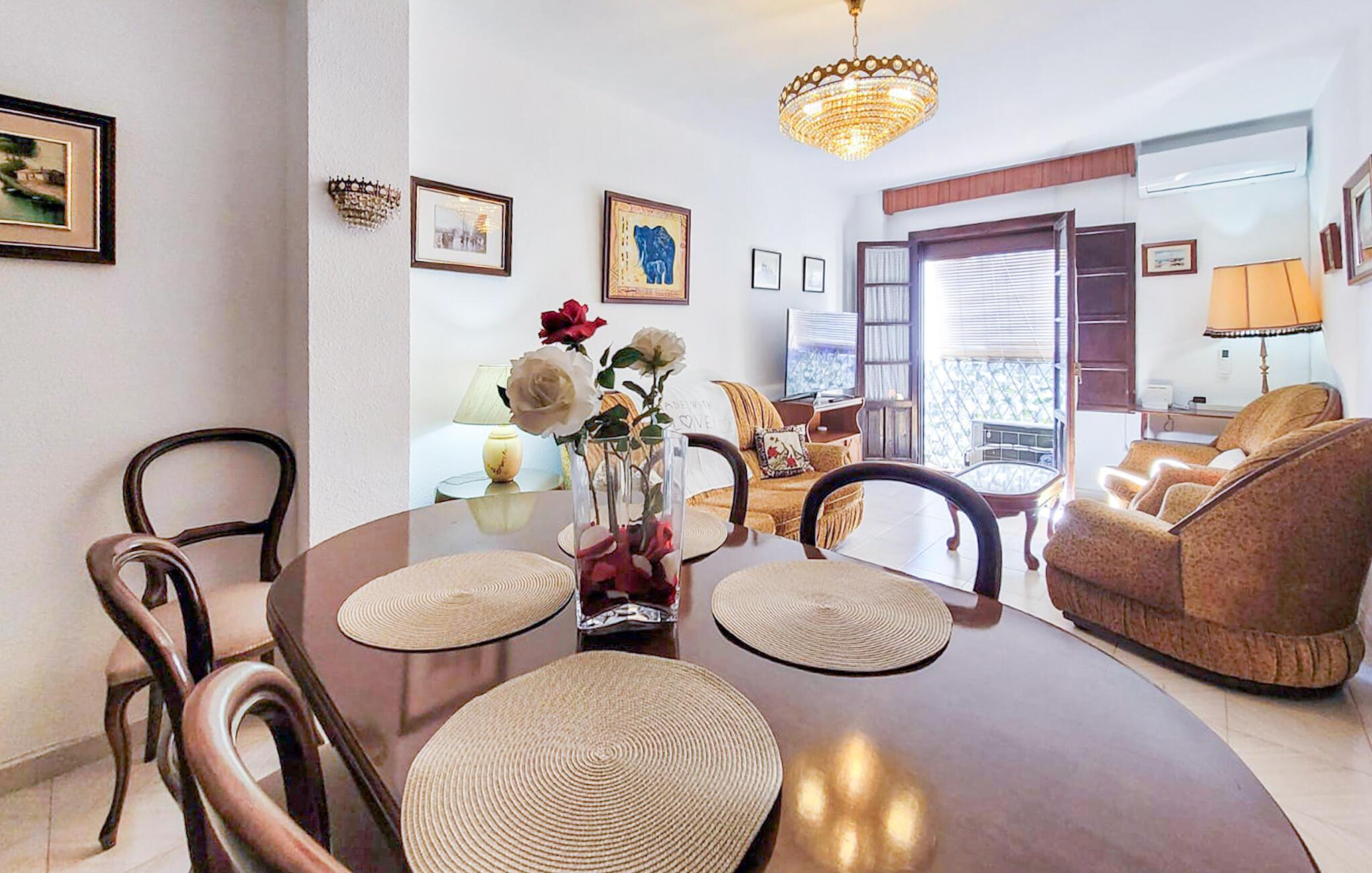 Oplev det autentiske andalusiske byliv i en lejlighed, der er noget særligt med sin nostalgiske stil. Træd ind i en klassisk stue med komfortable polstrede møbler og antikke møbler. Sæt jer ved spisebordet til fælles måltider eller afslappede aftensammenkomster. Traditionelle træelementer og lysekroner giver de forskellige rum et særligt præg. Lav mad i det separate køkken med masser af opbevaringsplads, ideelt til et længere ophold.