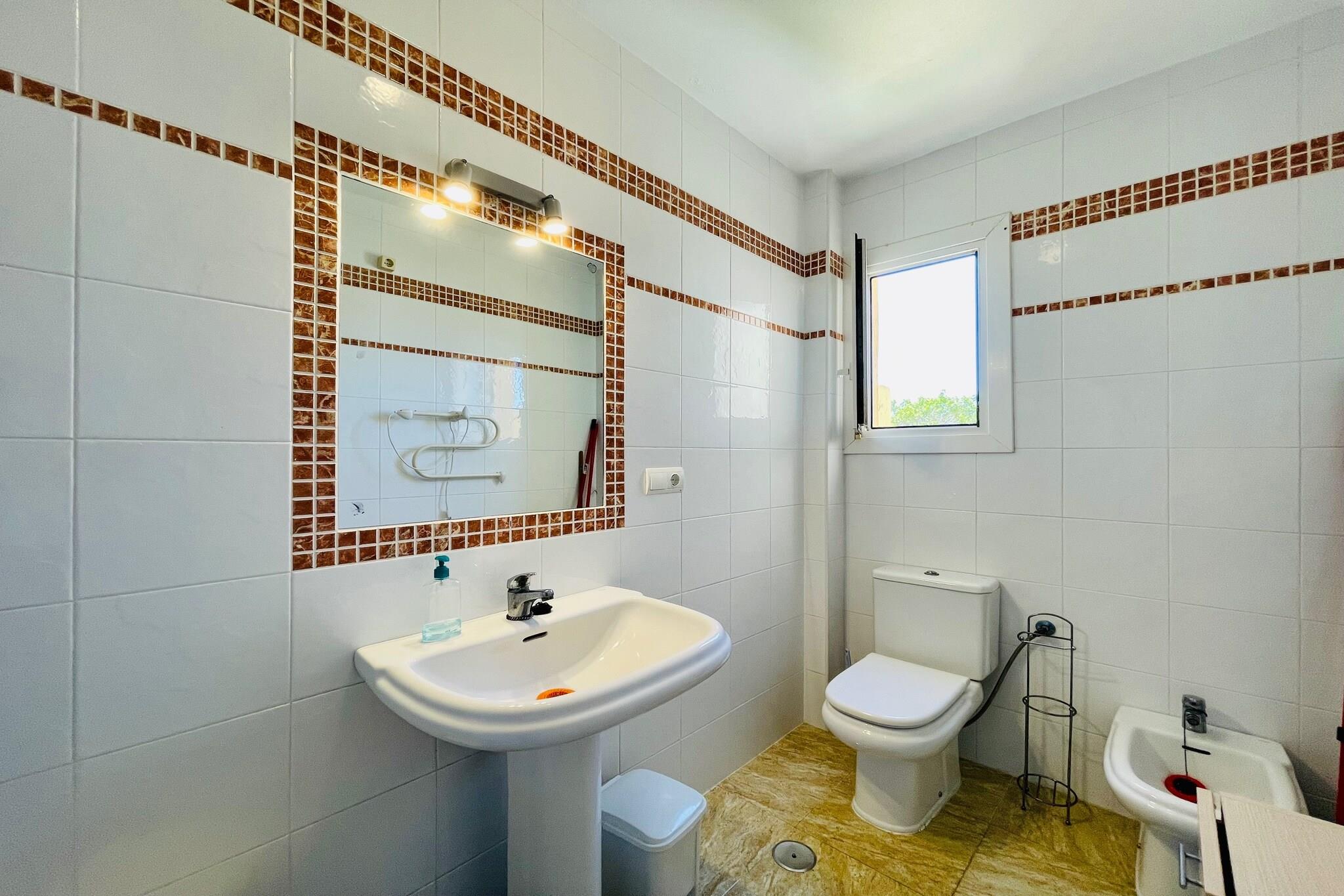 Stueetage: (Indgang (deles med andre gæster, adgang udefra)) På 1. etage: (Indgang , Køkken(kogeplade, elkedel, brødrister, emhætte, ovn, mikrobølgeovn, køle-fryseskab, Saftpresser), stue / spisestue(Fjernsyn(fladskærm), spisebord, sofahjørne), soveværelse(dobbeltseng), soveværelse(enkeltseng, enkeltseng), badeværelse(badekar med bruser, håndvask, toilet), klimaanlæg, terrasse) garage, havedøre, have(deles med andre gæster, oplyst), havemøbler, grill, swimmingpool(deles med andre gæster, udendørs, opened from Jun upto and including Sep)