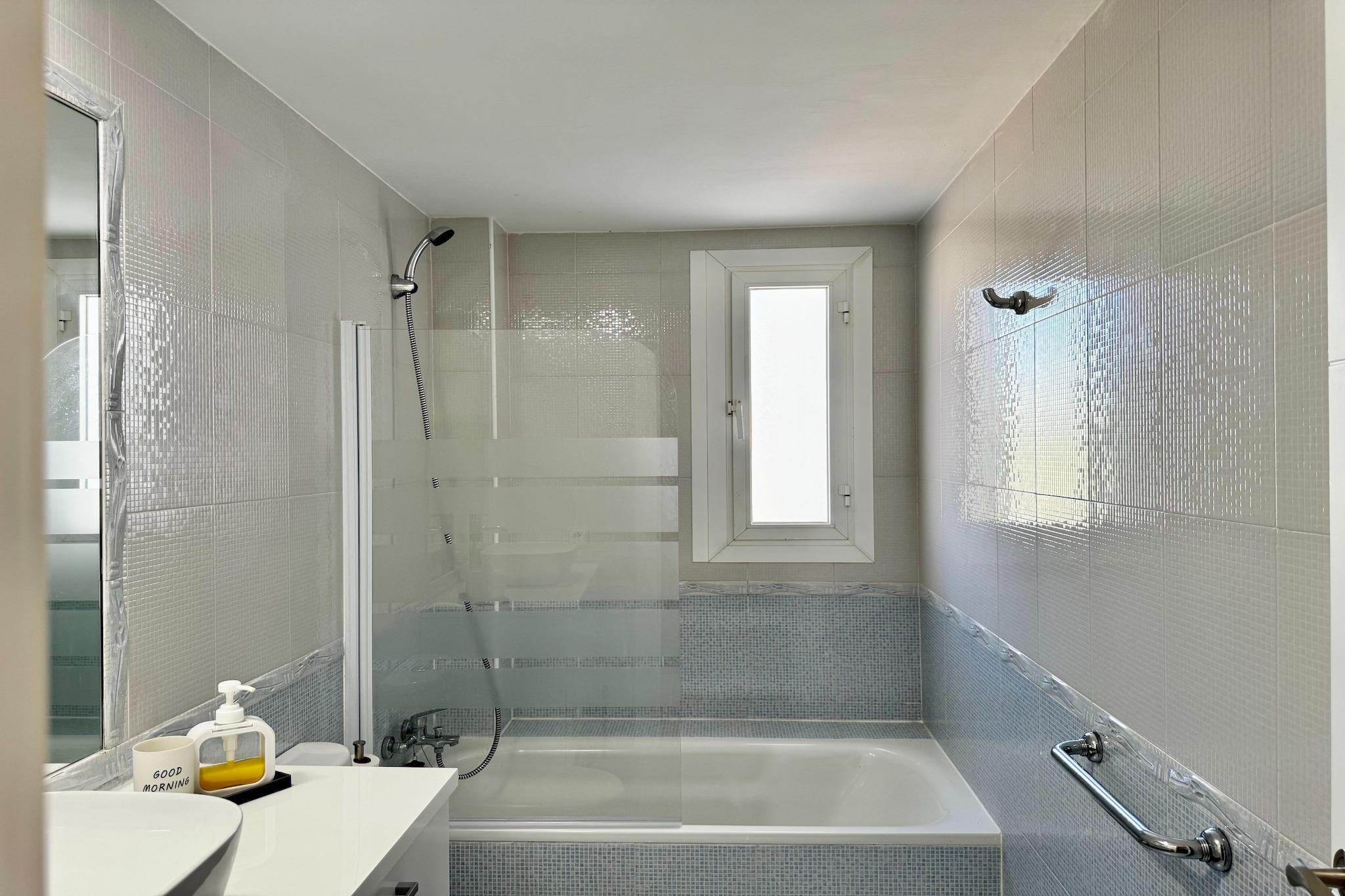 Stueetage: (Indgang (deles med andre gæster, fælles indgang, adgang udefra)) På 1. etage: (Indgang , åbent køkken(kogeplade(Komfur med fire kogeplader, elektrisk), elkedel, brødrister, emhætte, kaffemaskine(kaffetragt), ovn, mikrobølgeovn, køle-fryseskab, vaskemaskine), stue / spisestue(dobbeltsovesofa, Fjernsyn(fladskærm, Internationale TV-kanaler), spisebord, sofahjørne), soveværelse(enkeltseng(90 x 200 cm), enkeltseng(90 x 200 cm)), badeværelse(badekar med bruser, håndvask, toilet), klimaanlæg, terrasse, ) have(deles med andre gæster), parking lot(public), swimmingpool(deles med andre gæster, udendørs, opened from Jun upto and including Sep), strygebræt, strygejern