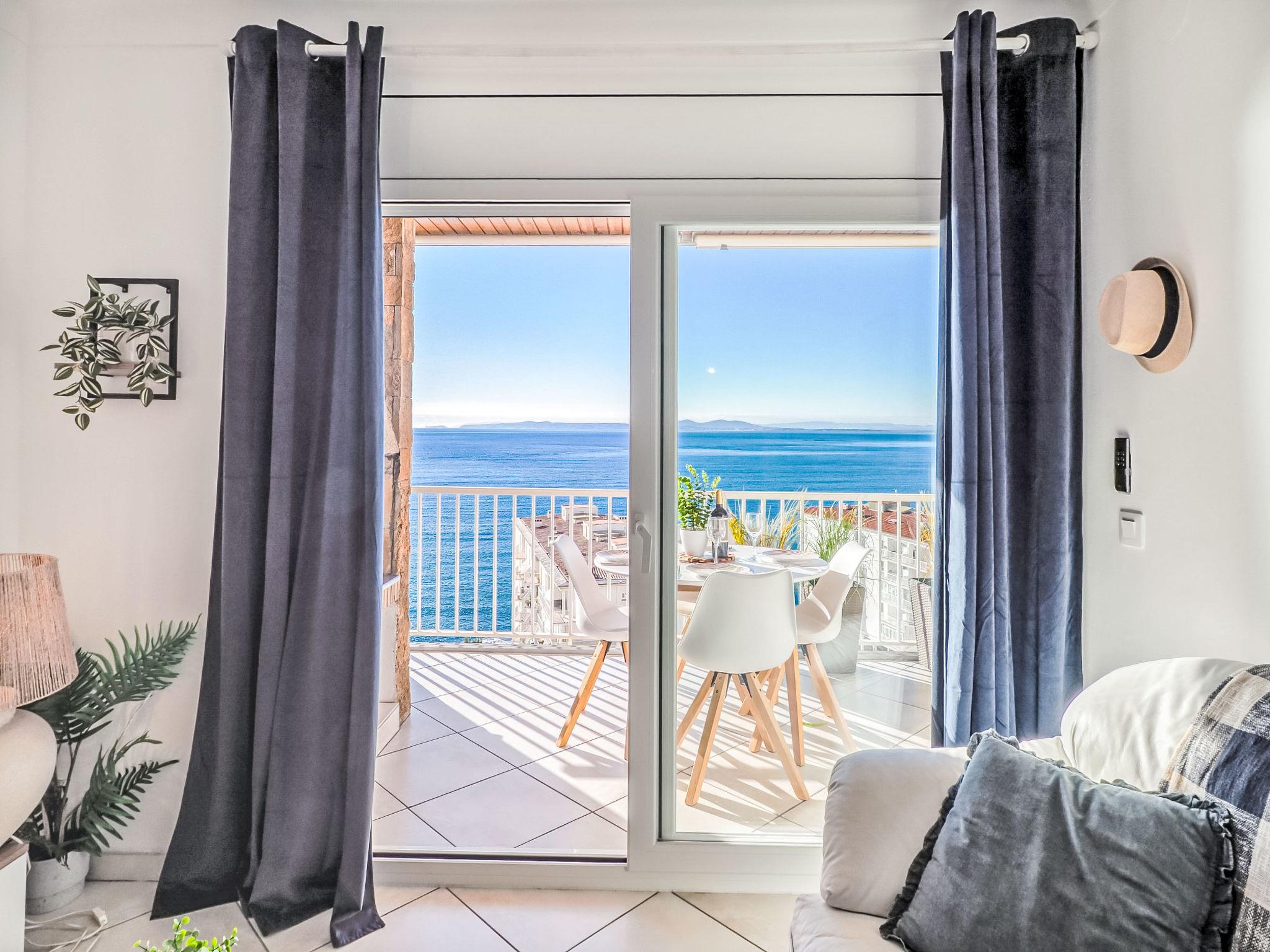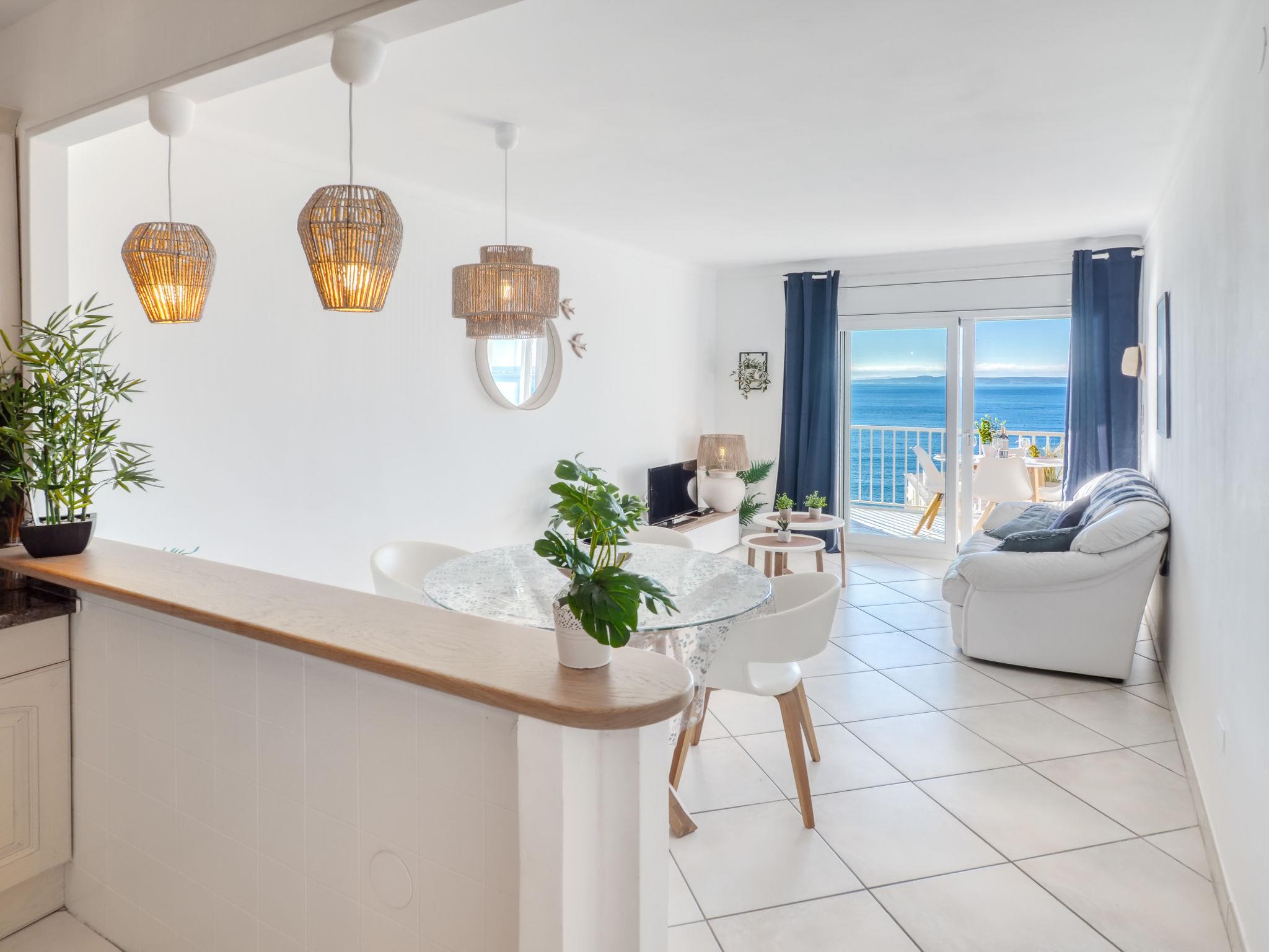 3-room apartment 65 m2. Bright, comfortable and modern furnishings: living/dining room with dining table and satellite TV. Exit to the terrace, south facing position and west facing position. 1 room with 1 french bed (160 cm, length 190 cm). Exit to the terrace. 1 room with 2 beds (90 cm, length 190 cm). Kitchen (oven, 3 ceramic glass hob hotplates, toaster, kettle, microwave, freezer, electric coffee machine) with hatch. Shower, sep. WC. Terrace. Terrace furniture. Marvellous panoramic view of the sea. Facilities: washing machine, iron. Internet (WiFi, free). Please note: non-smokers only. TV only FR, DE. No lift. HUTG-074788 // Reg. Nr.: ESFCTU0000170190001558250000000000000000HUTG074788851