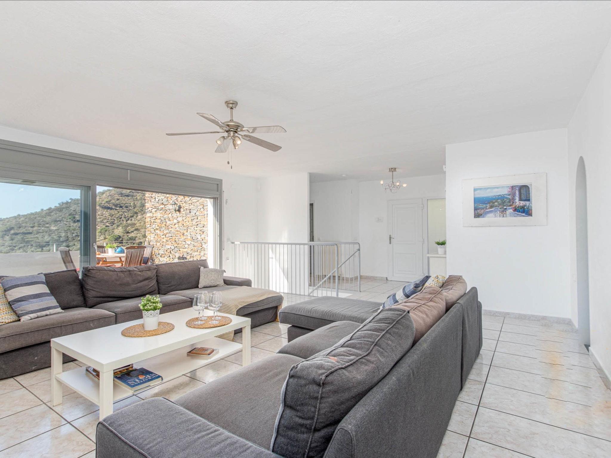 5-room villa 200 m2 on 2 levels. Spacious and bright, comfortable and cosy furnishings: large living/dining room with dining table, satellite TV and fan. Exit to the terrace, south facing position. 1 room with 1 bed (90 cm, length 190 cm), 1 x 2 bunk beds (90 cm, length 190 cm), fan. 1 room with 1 french bed (140 cm, length 190 cm), fan. Exit to the terrace. 1 room with 1 french bed (140 cm, length 190 cm), fan. Kitchen (4 hot plates, oven, dishwasher, toaster, kettle, microwave, freezer, electric coffee machine). Shower/WC. On the lower ground floor: living room. Exit to the patio, to the swimming pool. 1 room with 1 french bed (140 cm, length 190 cm), bath/WC. Open kitchen (freezer, electric coffee machine). Shower, sep. WC. Small terrace. Terrace furniture. Marvellous panoramic view of the sea, the swimming pool and the countryside. Facilities: washing machine, iron, children's high chair, baby cot, hair dryer. Internet (WiFi, free). Parking (4 cars) at the house. Please note: non-smoking house. 1 small pet/ dog allowed. No lift. HUTG-013472 // Reg. Nr.: ESFCTU00001701900014715800000000000000000HUTG-0134720