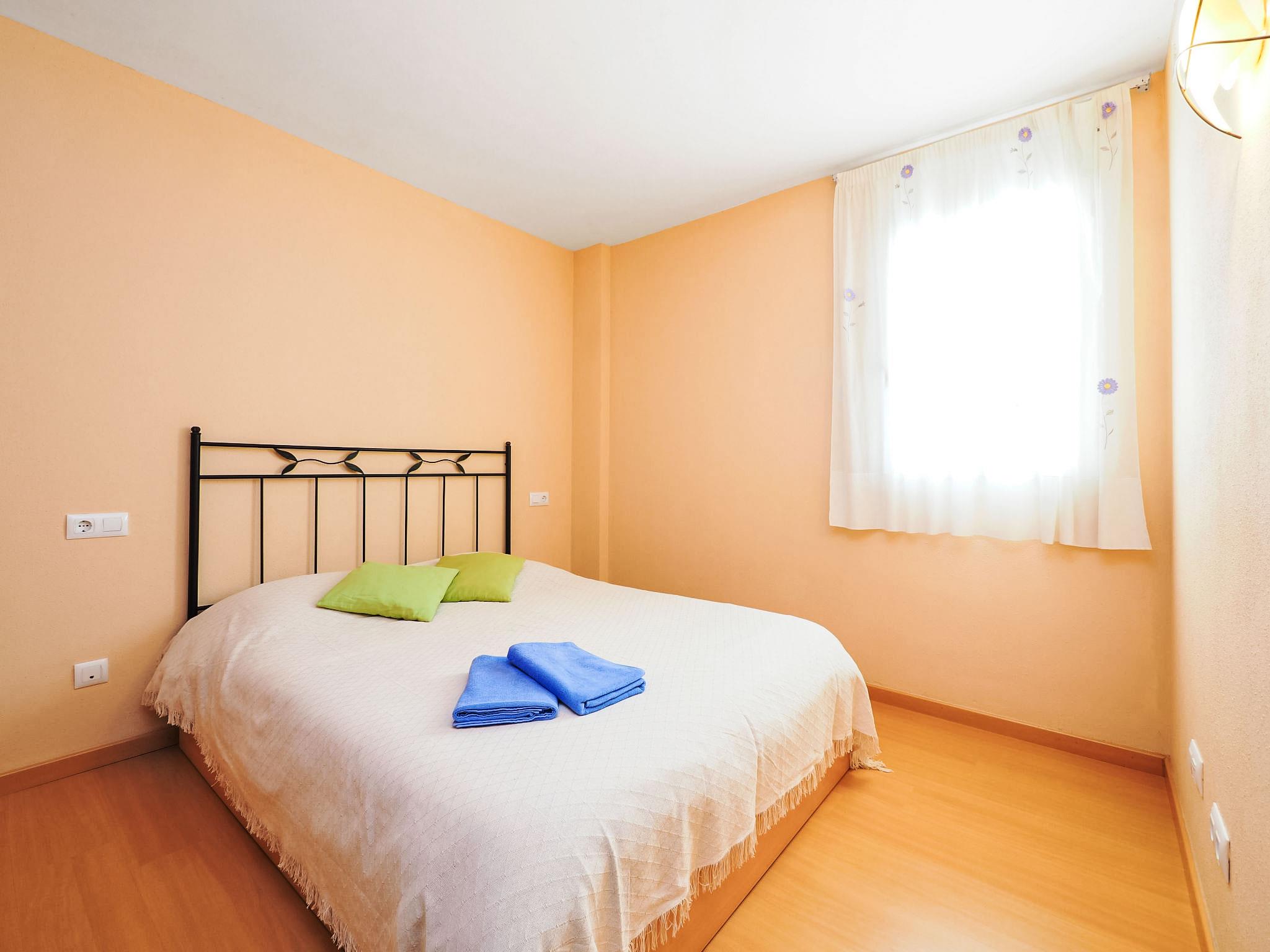 3-room apartment 57 m2 on 4th floor. Bright, practical furnishings: living/dining room with 1 sofabed and TV. Exit to the balcony. 1 room with 1 french bed (150 cm). 1 children's room with 1 x 2 bunk beds (90 cm, length 180 cm). Open kitchen (oven, 2 ceramic glass hob hotplates, microwave, freezer, electric coffee machine) with bar. Bath/shower/WC. Heating, air-conditioning, forced-air heating. Upper floor: (steep stair). Exit to the terrace. Balcony 9 m2, large terrace 60 m2. Terrace furniture, deck chairs. View of the swimming pool, the garden and the countryside. Facilities: washing machine. HUTG049162 // Reg. Nr.: ESFCTU00001701900039236700000000000000HUTG-049162-334