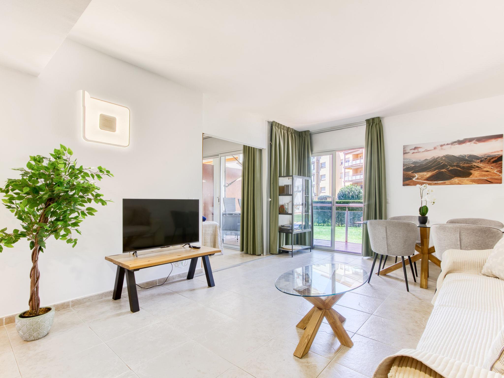 3-room apartment 56 m2, on the ground floor. Spacious and bright: living/dining room with dining table, TV, air conditioning and forced-air heating. Exit to the terrace, south facing position and west facing position. 1 room with 1 french bed (150 cm, length 190 cm), air conditioning and forced-air heating. 1 room with 1 french bed (150 cm, length 190 cm), air conditioning and forced-air heating. Open kitchen (oven, dishwasher, 4 ceramic glass hob hotplates, toaster, kettle, microwave, freezer, electric coffee machine). Shower/WC. Terrace. Terrace furniture. View of the swimming pool and the garden. Facilities: washing machine. Internet (WiFi, free). Parking space n 121 (roofed). Please note: non-smokers only. TV only ES, FR. HUTG-012219 // Reg. Nr.: ESFCTU00001701900037925200000000000000000HUTG-0122194