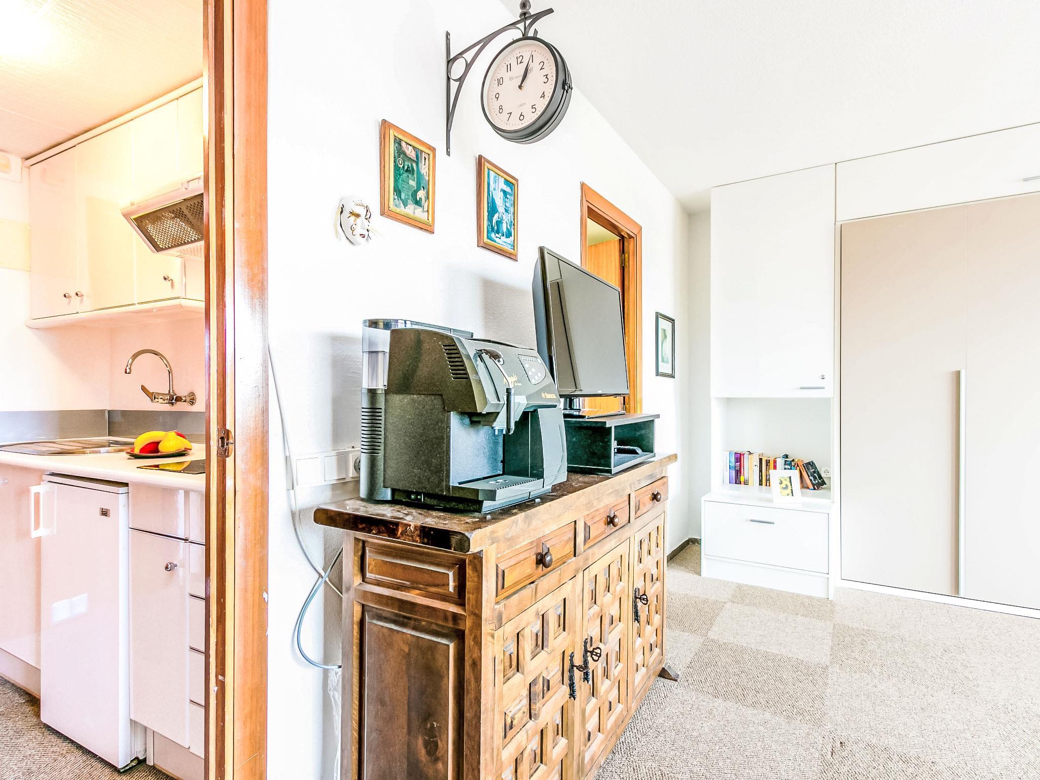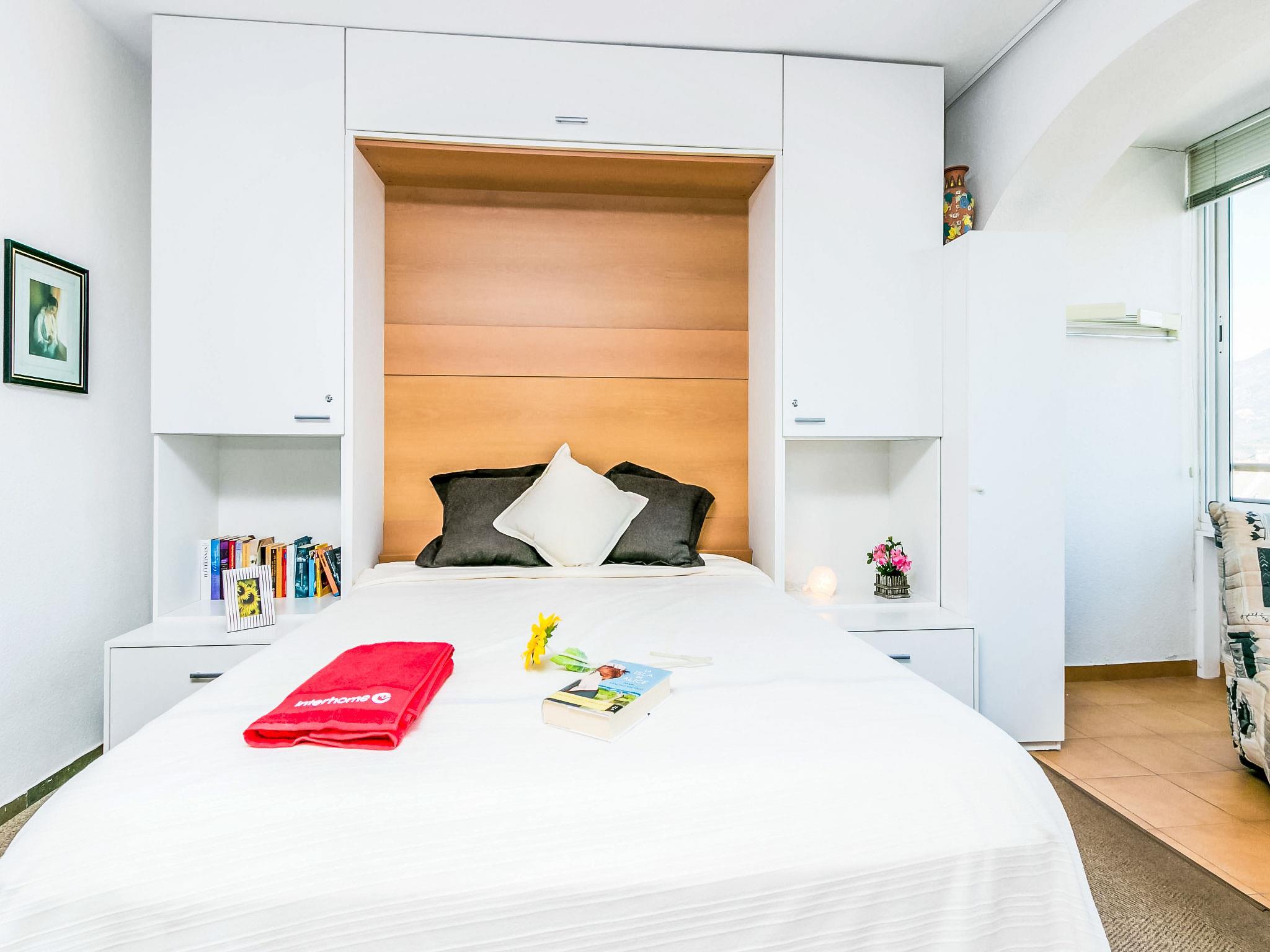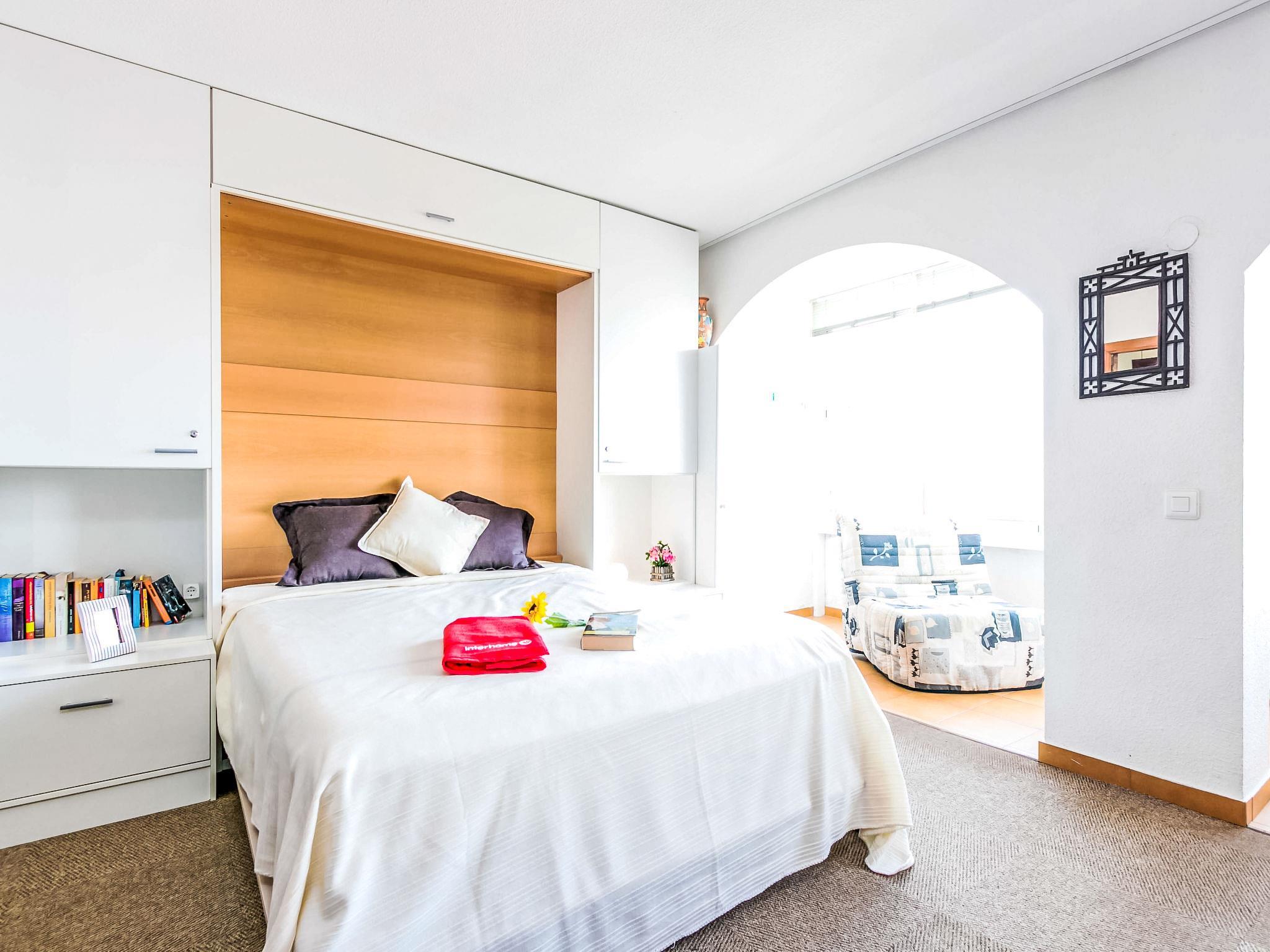 1-room studio 32 m2 on 7th floor. Very simple and rustic furnishings: living/dining room with 1 sofabed, 1 double fold-away bed and satellite TV. Exit to the veranda. Small, open kitchen in the entrance (2 ceramic glass hob hotplates). Shower/WC. No heating option. Terrace 7 m2. Side view of the sea. Facilities: washing machine. Internet (WiFi, free). Please note: non-smoking house. TV only DE, FR. HUTG029266-487 // Reg. Nr.: ESFCTU00001701900013554400000000000000HUTG-029266-487