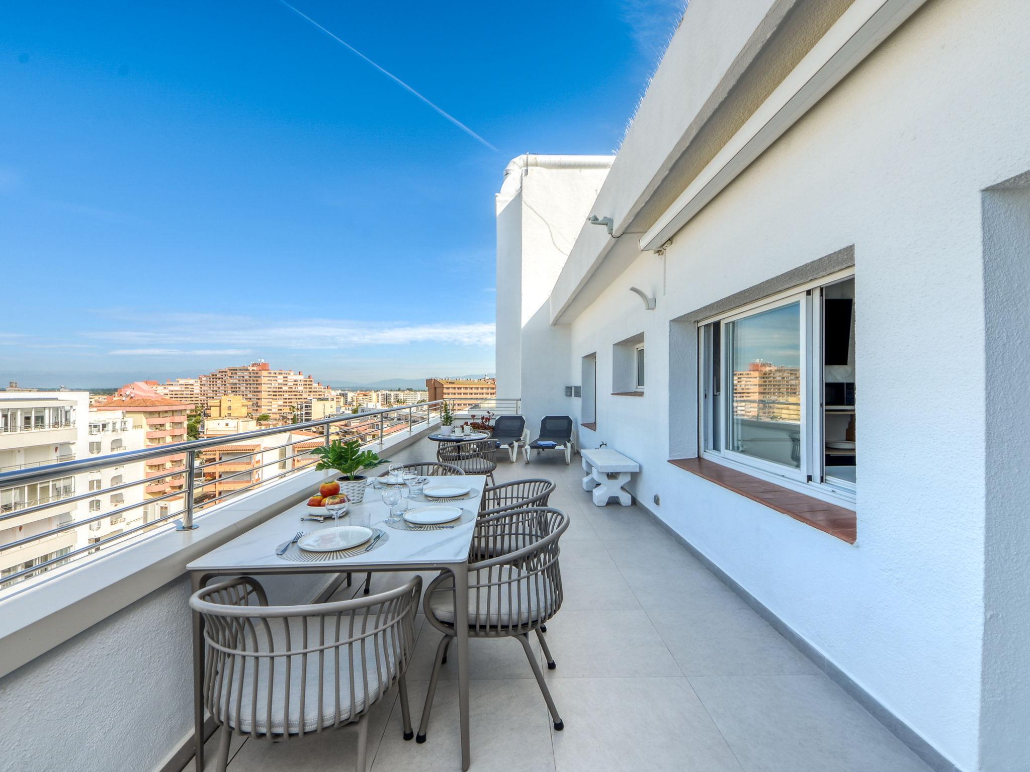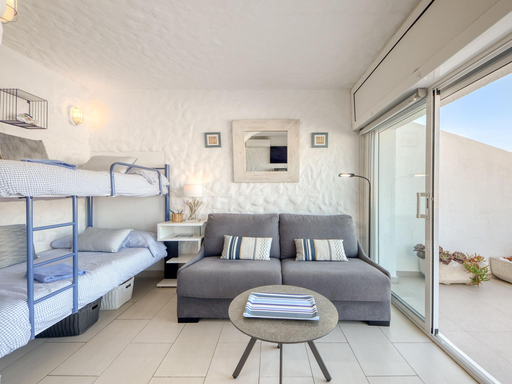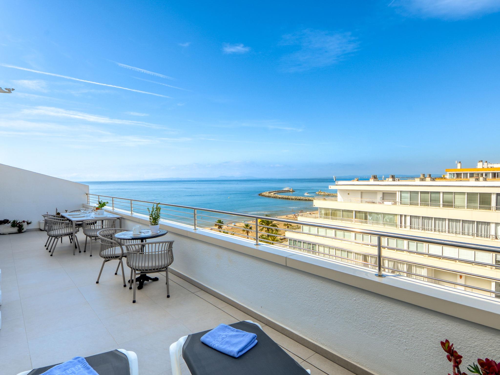 2-room apartment 30 m2 on 8th floor. Practical and beautiful furnishings: open living/sleeping room with 1 x 2 bunk beds, satellite TV (flat screen), air conditioning and electric shutters. Exit to the terrace. 1 room with 1 french bed and electric shutters. Open kitchen (2 ceramic glass hob hotplates, microwave, freezer). Shower/WC. No heating option. Terrace 27 m2. Terrace furniture. Marvellous view of the sea. Facilities: washing machine. Internet (WiFi, free). Please note: non-smoking house. TV only FR, DE, ES. The house has an electric awning with wind sensors. HUTG001905 // Reg. Nr.: ESFCTU00001701900000440600000000000000000HUTG-0019056