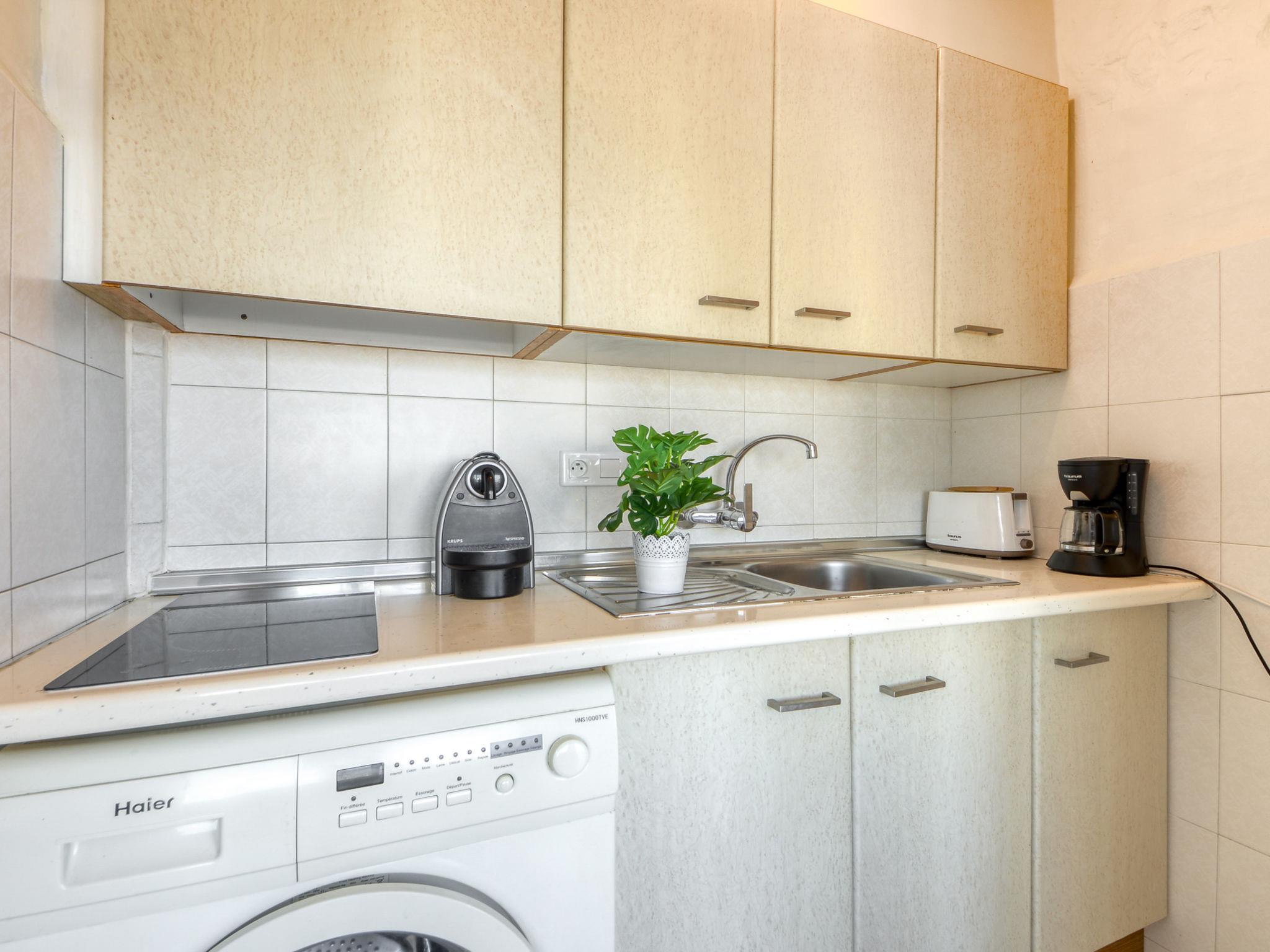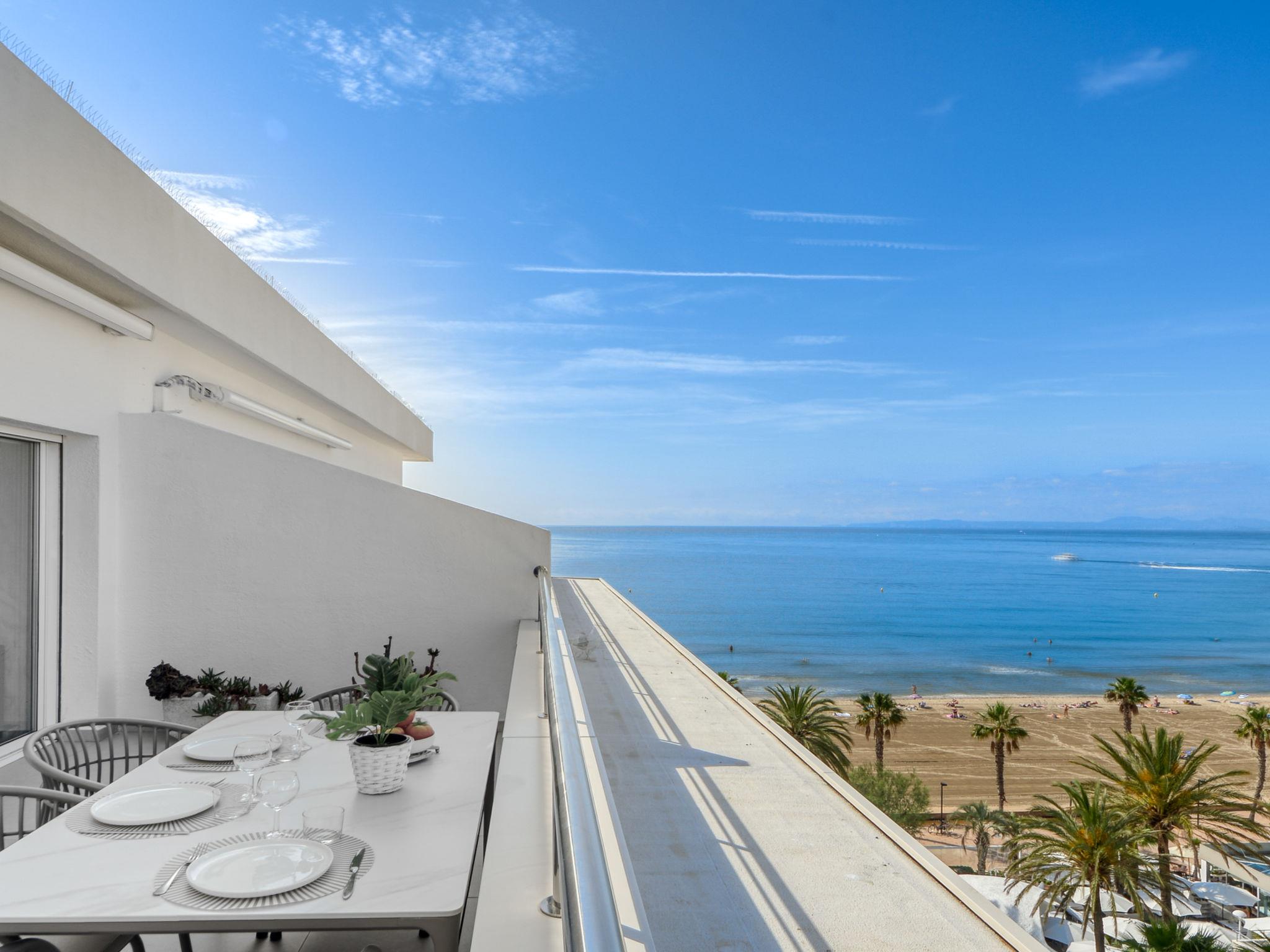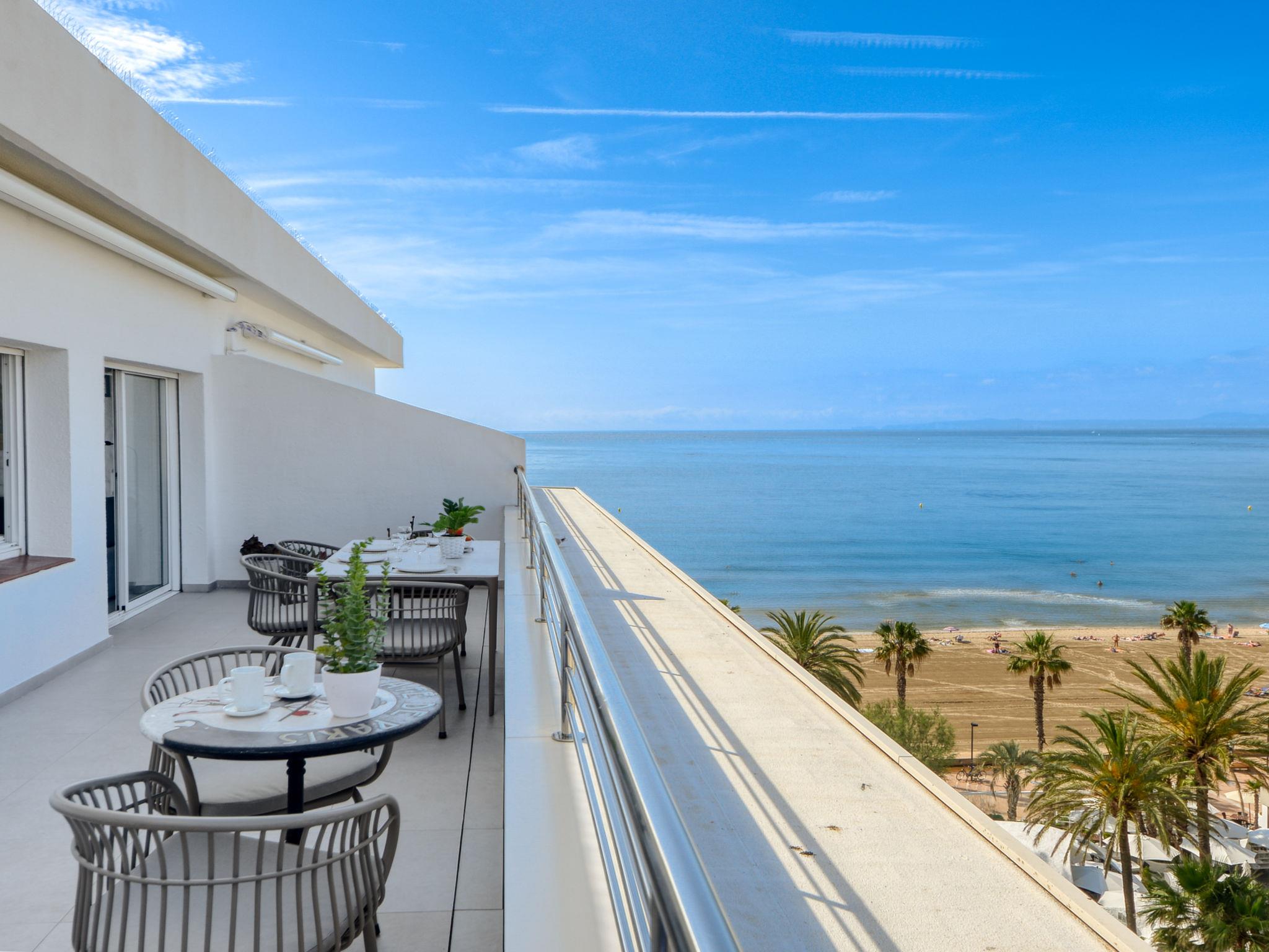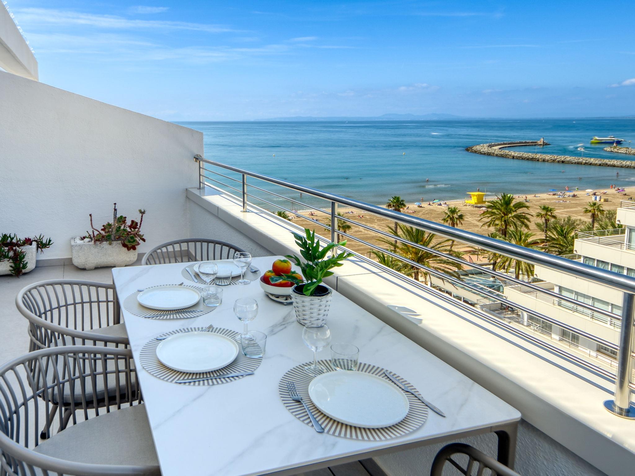 2-room apartment 30 m2 on 8th floor. Practical and beautiful furnishings: open living/sleeping room with 1 x 2 bunk beds, satellite TV (flat screen), air conditioning and electric shutters. Exit to the terrace. 1 room with 1 french bed and electric shutters. Open kitchen (2 ceramic glass hob hotplates, microwave, freezer). Shower/WC. No heating option. Terrace 27 m2. Terrace furniture. Marvellous view of the sea. Facilities: washing machine. Internet (WiFi, free). Please note: non-smoking house. TV only FR, DE, ES. The house has an electric awning with wind sensors. HUTG001905 // Reg. Nr.: ESFCTU00001701900000440600000000000000000HUTG-0019056