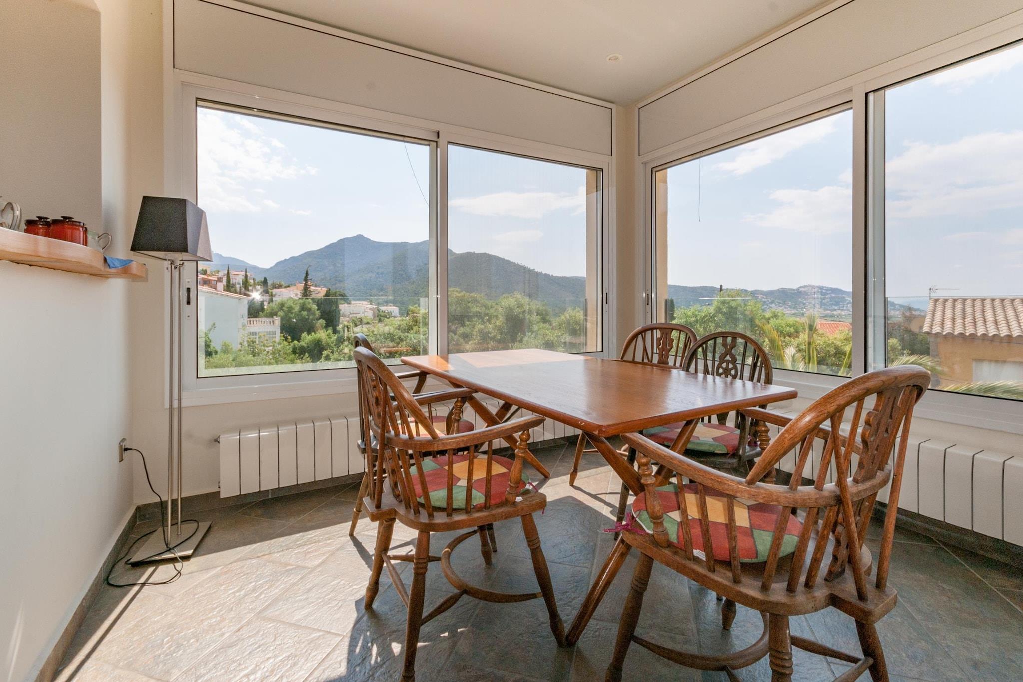 Rummelig villa med udsigt Denne indbydende villa med 5 soveværelser ligger på de naturskønne skråninger af Mas Fumats og kombinerer rustik charme med moderne komfort. Fordelt på et hovedhus og gæsteplads tilbyder det overnatning for op til 10 gæster, hvilket gør det ideelt for familier og små grupper. Den private indhegnede pool, have med liggestole og overdækket terrasse giver en afslappende kulisse til udendørs eftermiddage, mens de indendørs rum har hyggelige pejse, aircondition og et fuldt udstyret køkken for et bekvemt ophold. Rolig og alligevel godt forbundet Villaens beliggenhed på en bjergskråning byder på en flot udsigt over Roses-bugten og Pyrenæernes foden, mens den stadig er tæt på hverdagens væsentlige ting. Skovture begynder kun 100 meter væk, og inden for 400 meter finder du et bageri og en restaurant. Det livlige centrum af Roses, med dets strande, butikker og kulturelle steder, ligger kun 5 km væk, mens Girona-Costa Brava Lufthavn ligger inden for 50 km, hvilket gør ankomst og afgang let. Lokal spisning og opdagelse Roses er kendt for sit kystkøkken med alt fra familiedrevne tapasbarer til friske fiskerestauranter kun få minutter fra villaen. En kort køretur tager dig til Restaurant Pasko's for lokale catalanske smagsoplevelser, eller ind til byens centrum, hvor middelhavsrestauranter og aftenpromenader langs havnefronten venter. Uanset om du udforsker vandrestier, nyder stranddage eller nyder regionale retter, tilbyder denne villa en komfortabel og velplaceret base for dit ophold i Costa Brava.