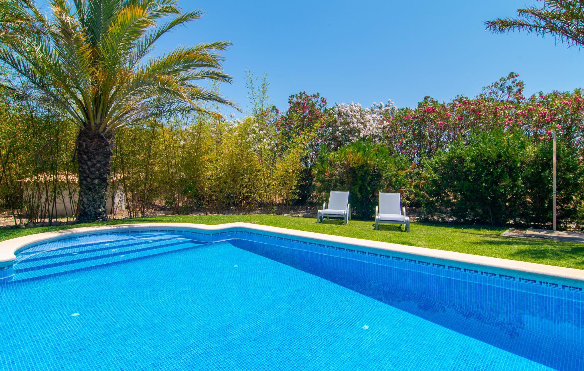 Denne rummelige, traditionelle mallorcanske villa "Rustica" er beliggende i den nordøstlige del af Mallorca og tilbyder en betagende udsigt over de omkringliggende bakker i Artà. Dette er et Fincallorca feriehus mandeltræer samt livlige oleanderbuske Den smukt velplejede have med palmer indbyder til aftenture, mens den private pool, som er ovenover. Adgang til trapper og indrammet af et loungeområde, kan voksne slappe af på liggestole, mens børn har det sjovt med at plaske rundt. Den overdækkede terrasse er et charmerende sted at nyde de rolige omgivelser, og om aftenen er der en grill udenfor praktisk parkering direkte ved huset Indenfor har villaen stilfulde faciliteter, synlige bjælkelofter, hvidkalkede vægge og elegante gulvfliser skaber en varm atmosfære. Den rummelige stue har en åben pejs, et fjernsyn og et stort spisebord, ideelt til at slappe af eller spise sammen. Det veludstyrede køkken byder på plads til afslappet spisning. Med tre indbydende soveværelser, hver med to enkeltsenge, og tre funktionelle badeværelser, sikrer villaen komfort og privatliv for alle gæster. Centralvarmen gør den velegnet til helårsophold og tilbyder også et perfekt tilflugtssted om vinteren. "Rustica" er en villa i et landligt område, kun ca. 2 km fra den smukke by Artà Den har en fantastisk udsigt over landskabet og ligger på en grund på over 7.000 m². En smuk naturlig sandstrand (Cala Torta) er ca 10 minutter i bil Der er fire golfbaner i nærheden af villaen, hvoraf nogle er kun 10 minutter væk i bil.