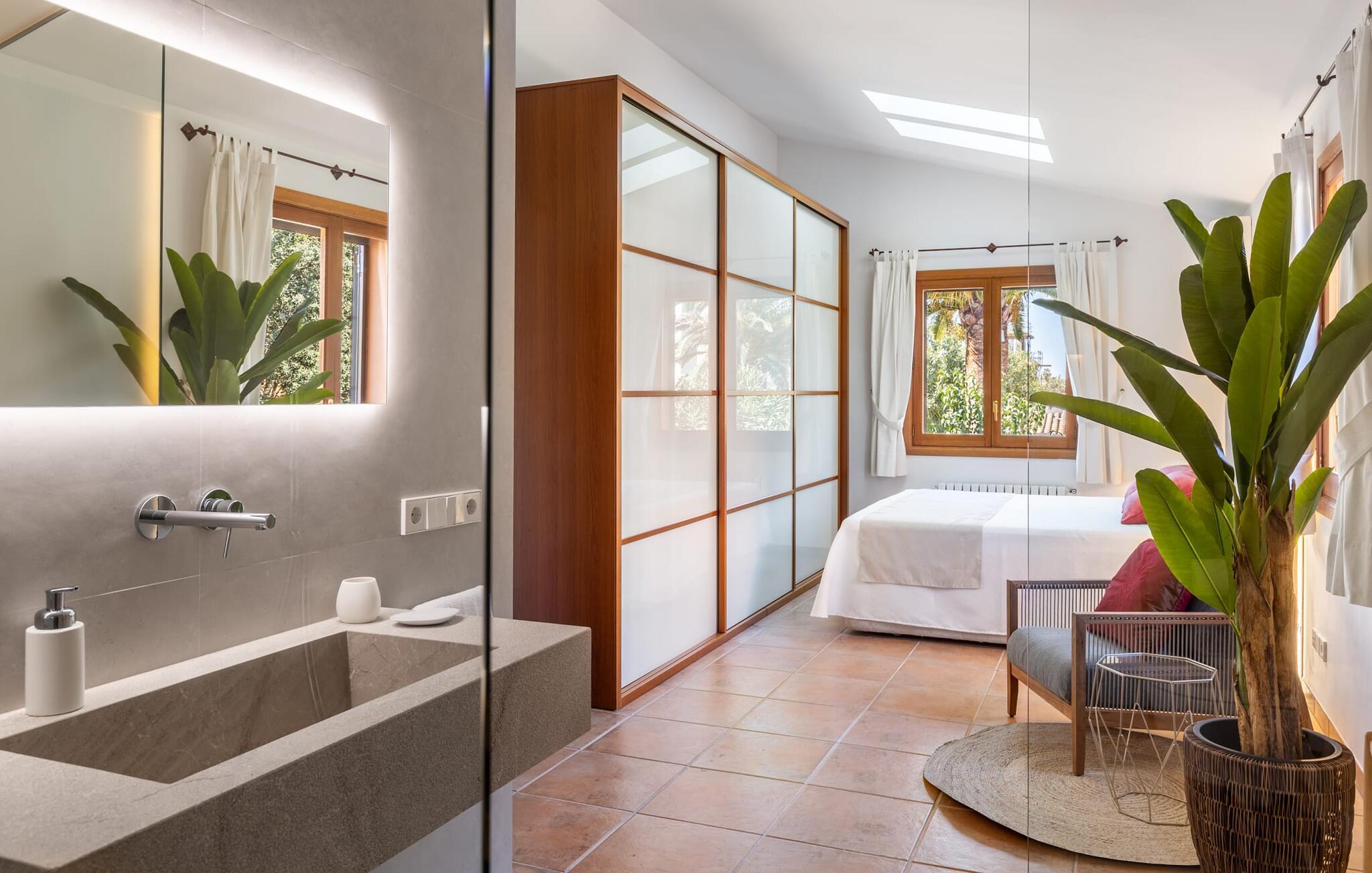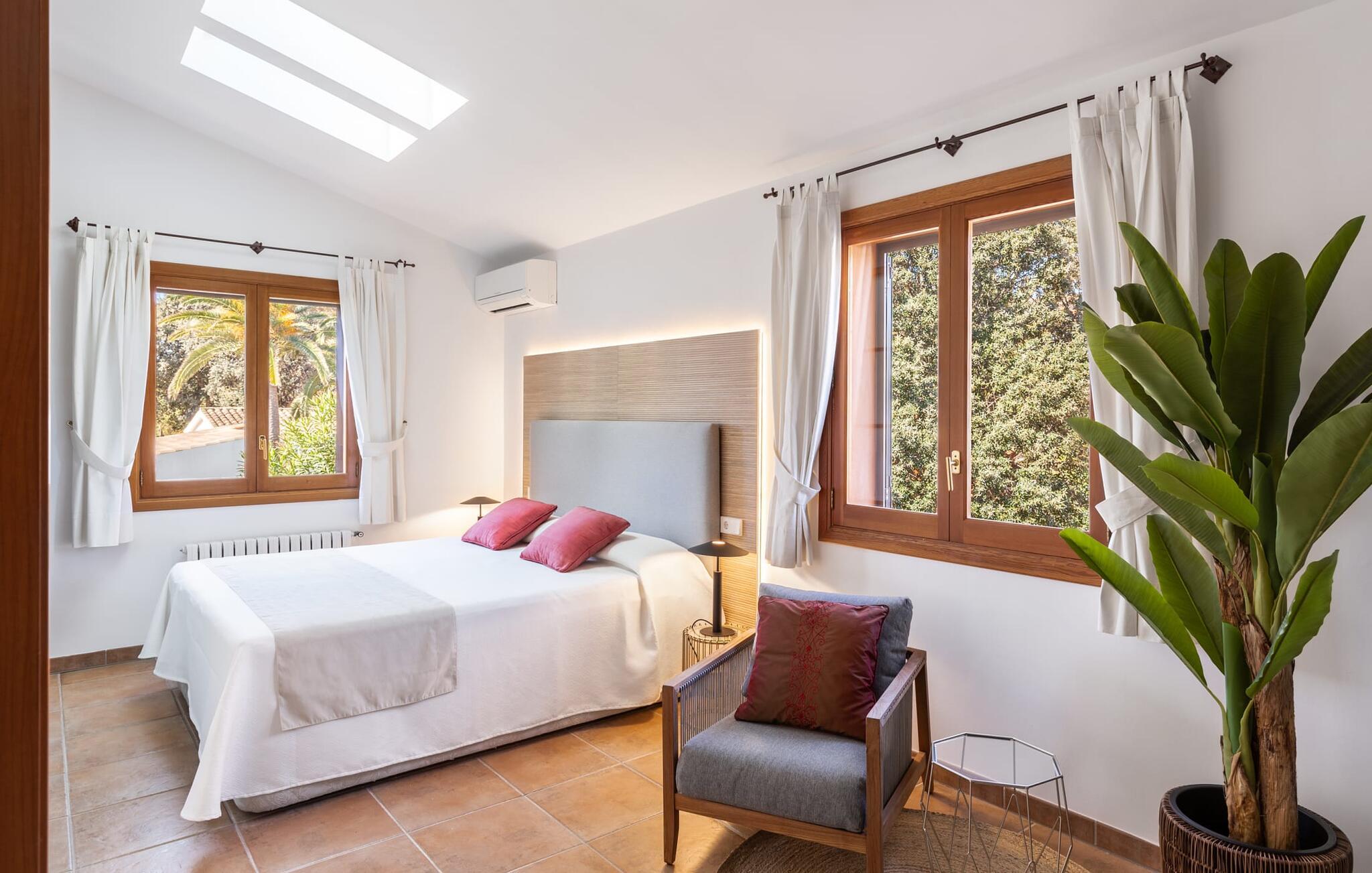 Omgivet af en tæt grøn hæk og frodig middelhavsvegetation ligger den meget smukke villa "S'Embat", godt afskærmet for nysgerrige blikke. En smuk udendørs plads er kendetegnende for denne feriedestination og kan virkelig være et syn at se. Den meget velholdte, smagfuldt indrettede og delvist overdækkede terrasse løber rundt om husets forside. Æstetikken implementeret her skaber en meget fin og værdig atmosfære, der gør en fornøjelig ferie til noget helt særligt. På den store altan venter et fantastisk loungeområde for enhver, der ønsker at være endnu tættere på himlen og samtidig nyde den vidunderlige havudsigt. Poolområdet smelter problemfrit ind i haven og danner en separat zone til afslapning og forfriskning. Den elegant buede pool er omgivet af en charmerende terrasse, hvor behagelige liggestole er tilgængelige for alle soltilbedere blandt jer. Afhængigt af tidspunktet kan I også finde et skyggefuldt tilflugtssted under de høje palmer. Sportsentusiaster vil elske bordtennisbordet, som helt sikkert vil friste dem til at spille et spil eller to. Huset ligger direkte på en lille, lidt brugt gade. I har den behagelige følelse af at være midt i en lille landsby og samtidig nyde fuldstændig privatliv, fred og ro. I stueetagen af det hyggeligt lyse hus er der en meget rummelig stue/alrum, kun adskilt af en rundbue, med generøse vinduesfronter og direkte udgang til den omkringliggende terrasse med havudsigt. Der blev lagt vægt på både komfort og en elegant stemning, med møbler af høj kvalitet og nøje udvalgt indretning, der var afgørende for billedet af dette rum. Masser af træ og venlige farver bidrager til en høj faktor. Det store fladskærms-tv med satellitforbindelse giver rig medieunderholdning, og pejsen giver ekstra hygge på kølige aftener. I kan spise sammen i en smagfuld atmosfære ved det klassiske spisebord, som komfortabelt kan rumme op til seks personer. Det separate køkken er fuldt udstyret og byder på så meget plads, at der er oprettet en anden spiseplads her. En kaffemaskine og en kedel fuldender det omfattende køkkenudstyr. To soveværelser, hvoraf det ene har aircondition og direkte adgang til en terrasse med havudsigt, og to badeværelser en-suite er også placeret i stueetagen, mens yderligere to soveværelser med aircondition, hvoraf det ene har direkte adgang til en terrasse er placeret på første sal Havudsigt, to en-suite badeværelser og en praktisk undersøgelse. Subtile højdepunkter kan ses i soveområderne, som bidrager til hvert soveværelses unikke flair. Veludstyrede badeværelser tilbyder plads nok til alle rejsende. Hårtørrere er tilgængelige og kan selvfølgelig bruges af gæster. Som en speciel og enestående service tilbyder ejerne alle bekvemmeligheder til babyer, herunder et puslebord, et badekar, sengelinned og håndklæder. Port Verd er et meget smukt sted beliggende omkring 3 km fra Cala Millor. Det er præget af både gamle ejendomme og moderne ferieejendomme. I Cala Millor finder I gode indkøbsmuligheder til jeres daglige behov samt restauranter og caféer. Der er også en indbydende strandpromenade og muligheder for vandsport. I bør bestemt ikke gå glip af de ugentlige markeder i Son Servera, Artà, Cala Ratjada eller Capdepera. For golfentusiasterne blandt jer er banerne i Son Servera, Capdepera og Canyamel indbydende maleriske. Cala Bona ligger lige ved siden af, kun omkring 1,6 km væk. Det tidligere fiskerleje er nu et charmerende lille feriested med smalle gader og caféer samt tre små sandstrande og en smuk lille havn. Villaen "S'Embat" er beliggende i en lille urbanisering, kun få skridt fra havet i Port Verd. Den maleriske landsby tilhører Son Servera kommune. Blot 2 km væk finder I den større strand Costa de los Pinos, mens mindre end 10 minutter i bil ligger den lange sandstrand Cala Millor.