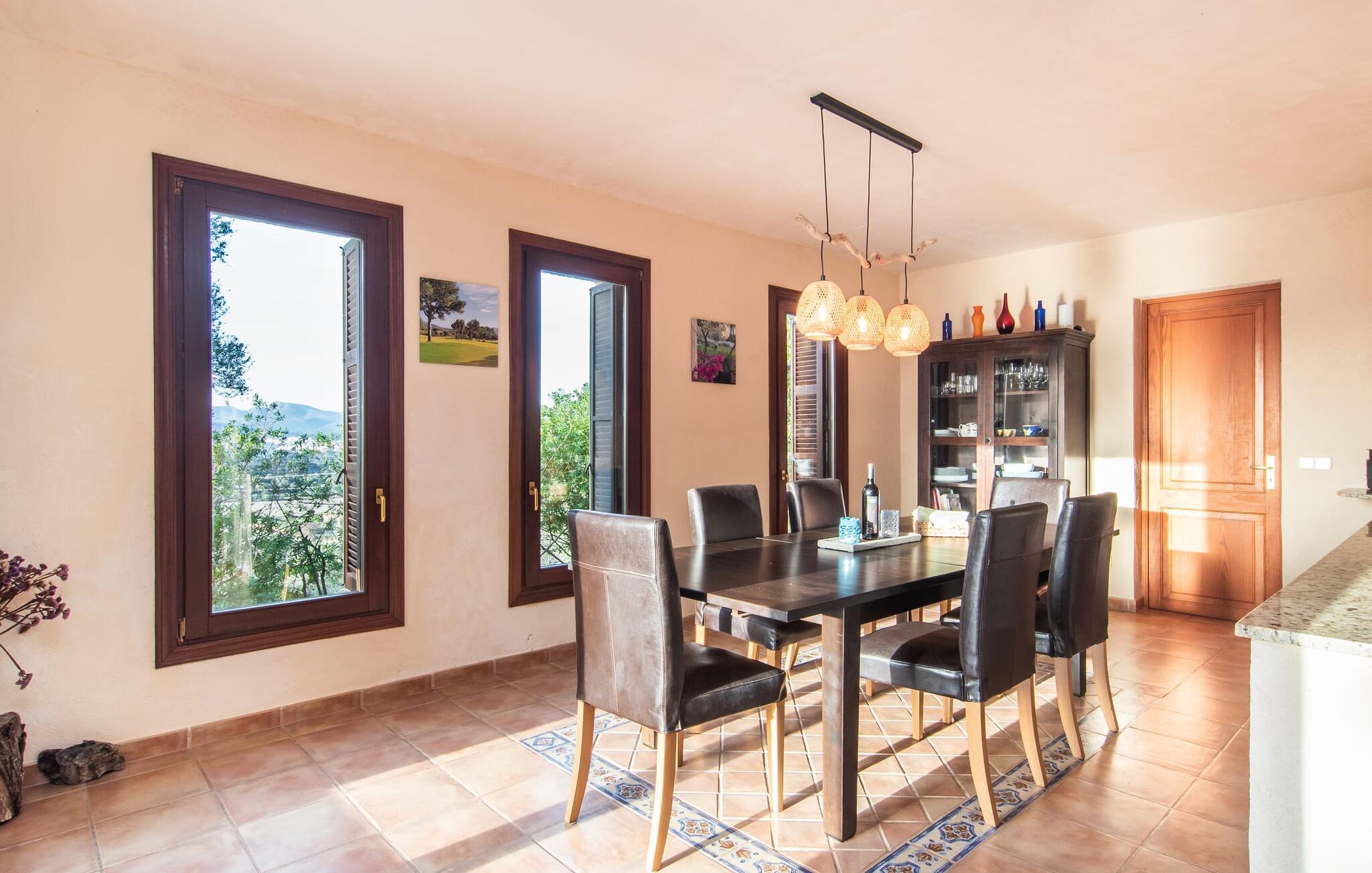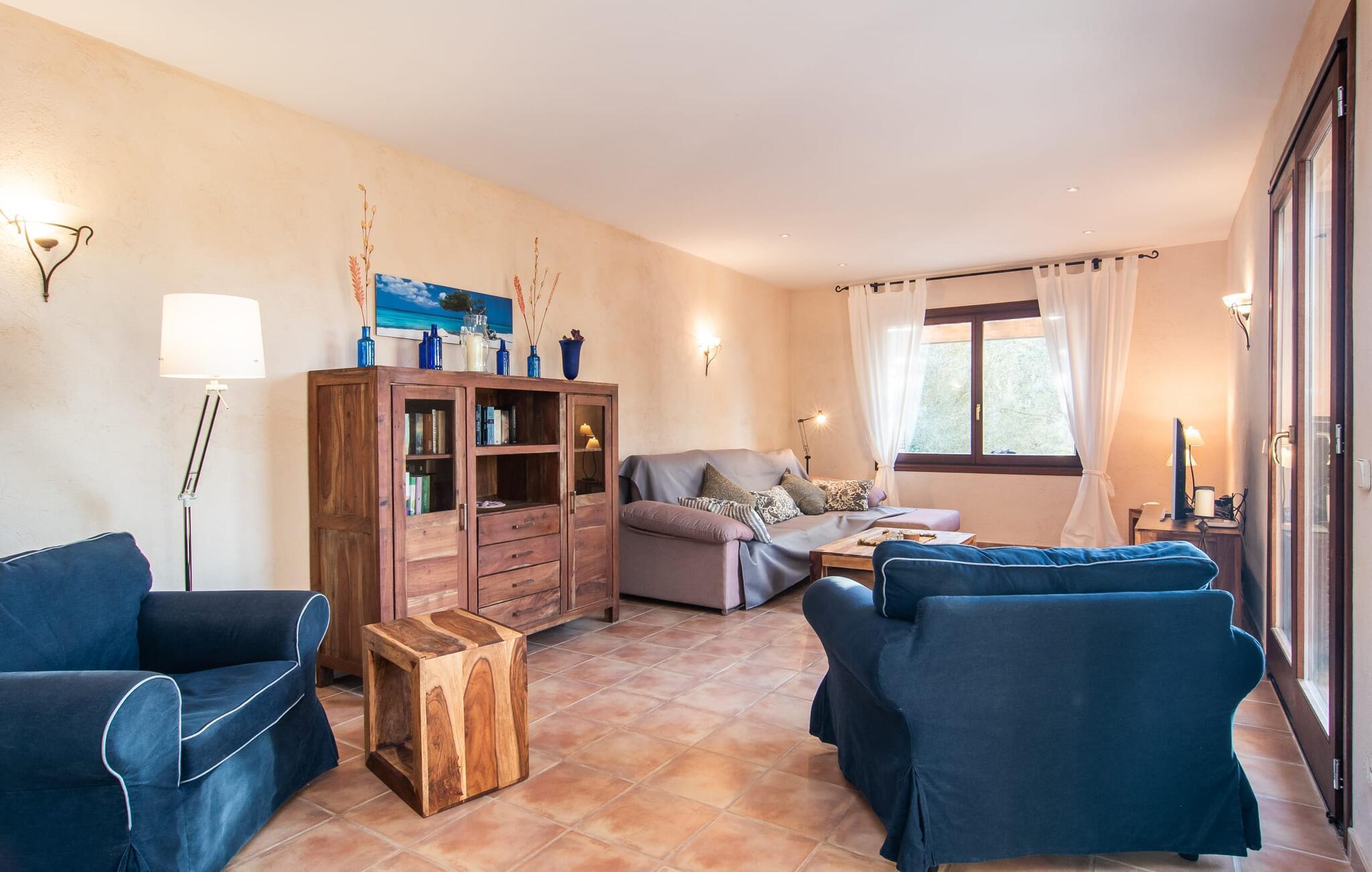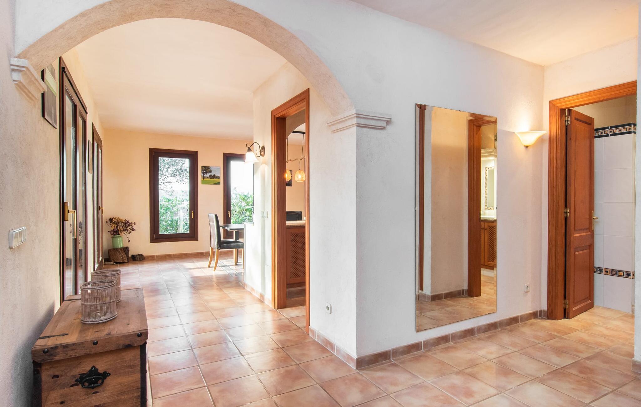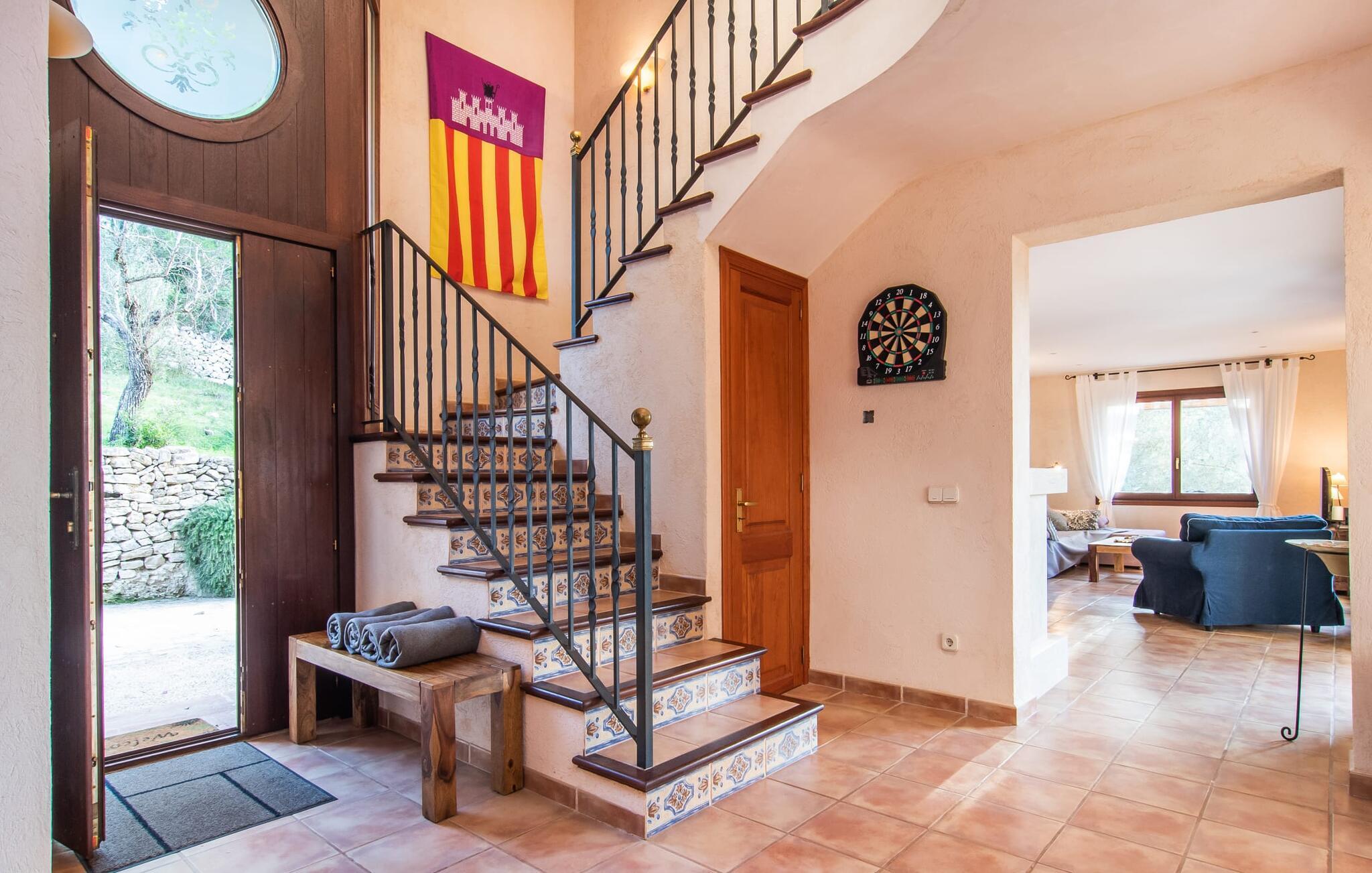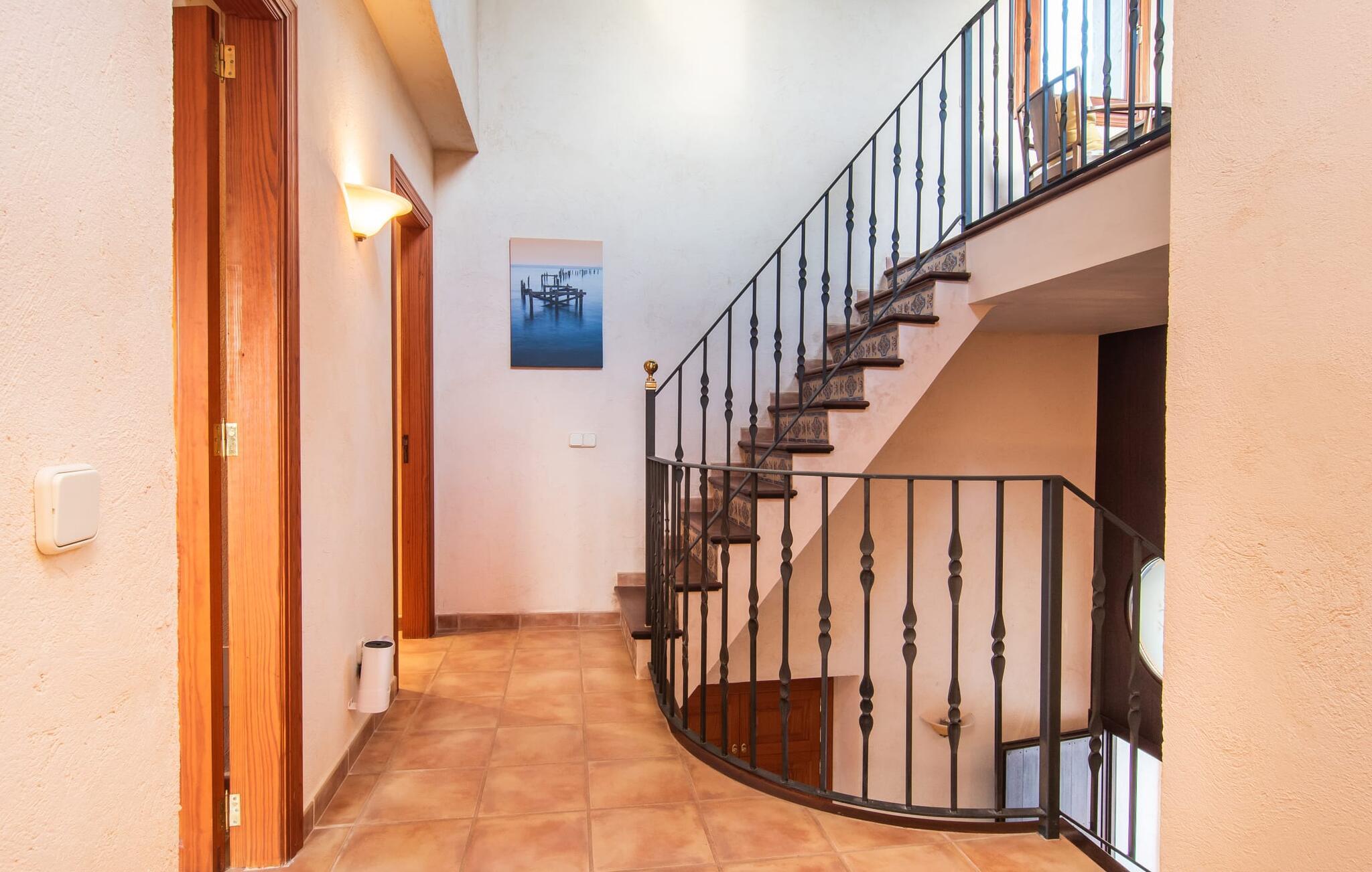 Et venligt interiør glæder beskueren ved indtræden i hovedhuset. De smukke gulvfliser og de lyse vægge skaber en hyggelig atmosfære. Fra entréen træder man ind i den lyse spisestue med mange dybe vinduer og en fantastisk udsigt – dette er et rigtig dejligt sted til stilfulde indendørsmåltider. Til højre er det åbne køkken, løst adskilt af en bordplade, som er noget særligt med sit udstyr af høj kvalitet. Til venstre for entréen ligger stuen, hvorfra man også kan nyde en vidunderlig udsigt. Det første brusebad er også placeret i stueetagen. Fra entréområdet fører en smuk, typisk mallorcansk flisebelagt trappe til øverste etage. Tre hyggeligt indrettede soveværelser – hvoraf to har adgang til balkonen – lægger op til afslapning og ro. Lyse farver kombineret med stilfulde møbler skaber en hyggelig atmosfære til en afslappende søvn. De to badeværelser på denne etage – hvoraf det ene har eget badeværelse – kan prale af naturskønt lys og en samlet lys og behagelig atmosfære. Fra første sal fører en kort trappe til tagterrassen. Der kan I nyde den vidunderlige solnedgang og lade blikket vandre over det omkringliggende landskab og mod Artà.