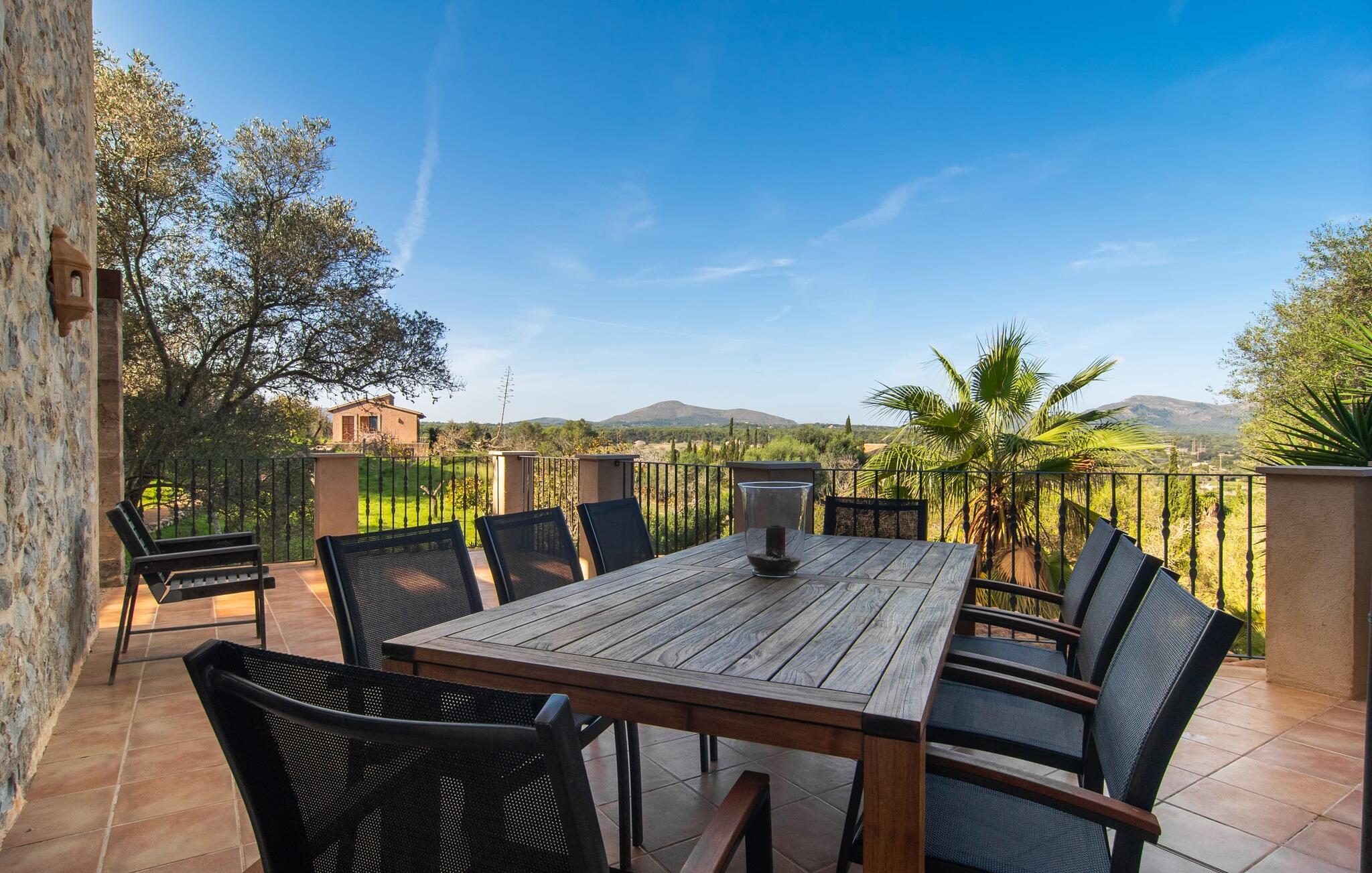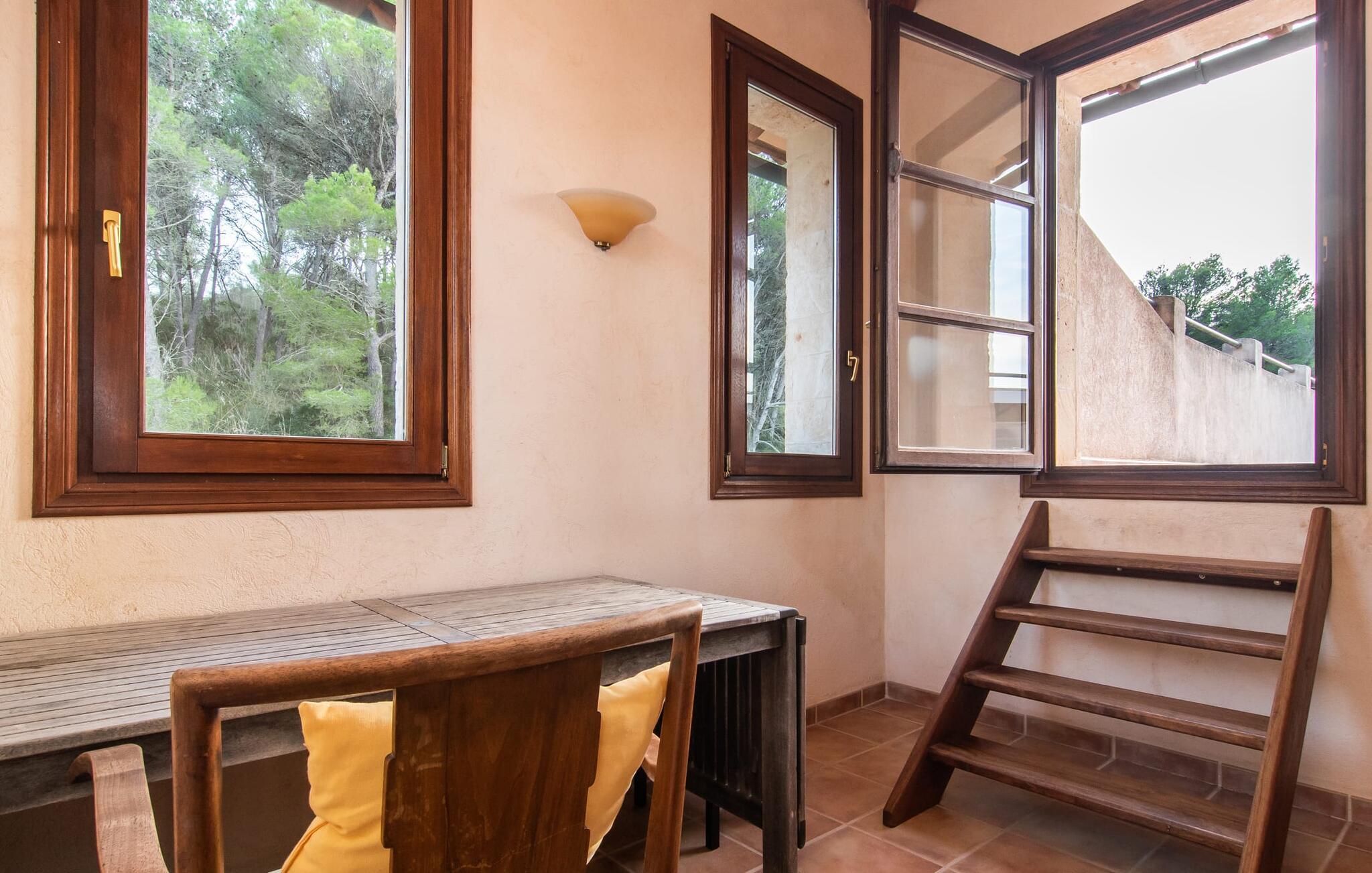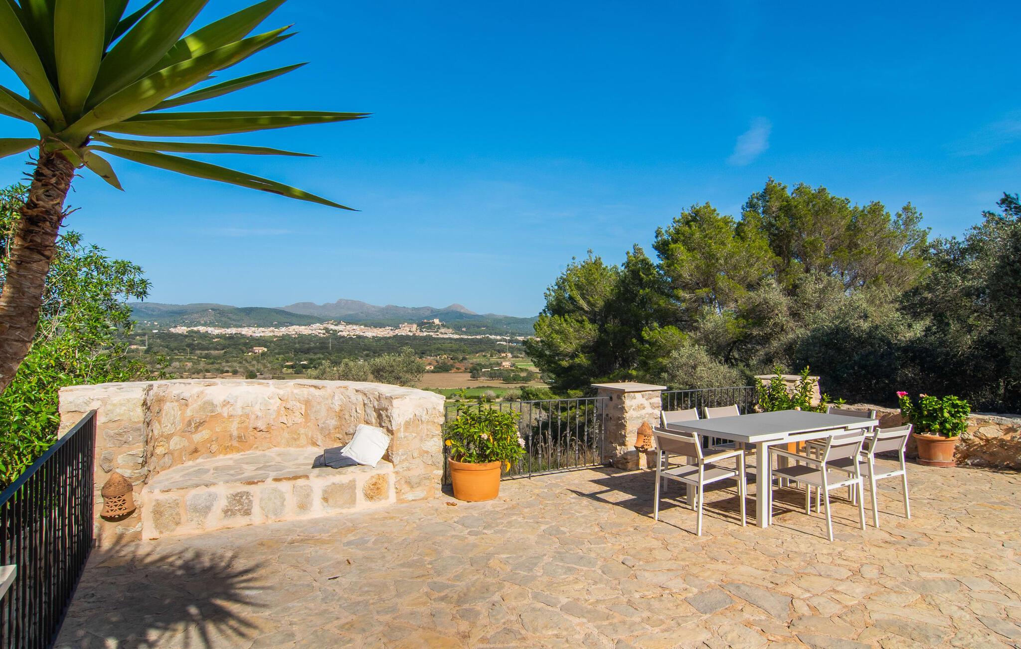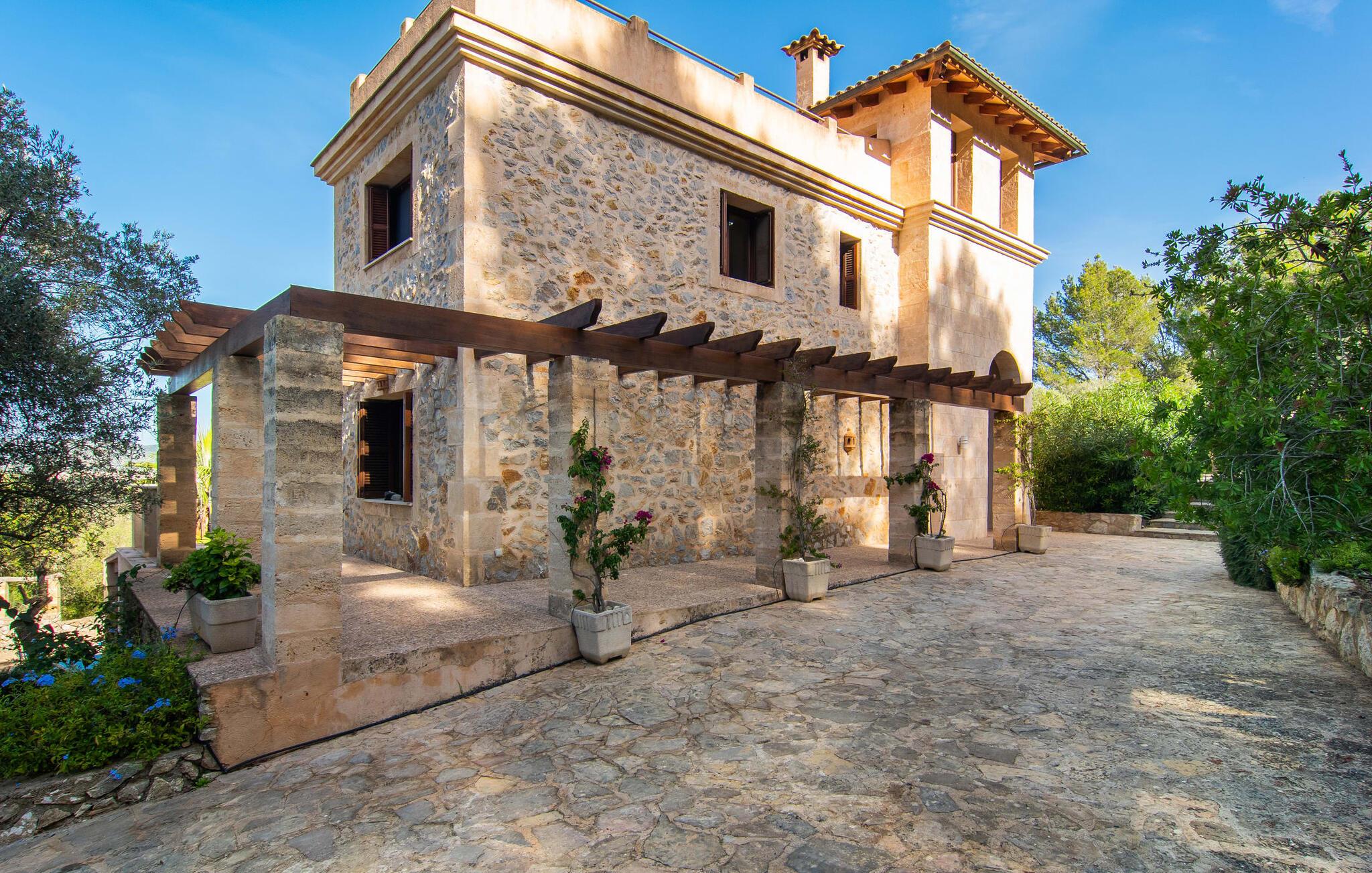 Et venligt interiør glæder beskueren ved indtræden i hovedhuset. De smukke gulvfliser og de lyse vægge skaber en hyggelig atmosfære. Fra entréen træder man ind i den lyse spisestue med mange dybe vinduer og en fantastisk udsigt – dette er et rigtig dejligt sted til stilfulde indendørsmåltider. Til højre er det åbne køkken, løst adskilt af en bordplade, som er noget særligt med sit udstyr af høj kvalitet. Til venstre for entréen ligger stuen, hvorfra man også kan nyde en vidunderlig udsigt. Det første brusebad er også placeret i stueetagen. Fra entréområdet fører en smuk, typisk mallorcansk flisebelagt trappe til øverste etage. Tre hyggeligt indrettede soveværelser – hvoraf to har adgang til balkonen – lægger op til afslapning og ro. Lyse farver kombineret med stilfulde møbler skaber en hyggelig atmosfære til en afslappende søvn. De to badeværelser på denne etage – hvoraf det ene har eget badeværelse – kan prale af naturskønt lys og en samlet lys og behagelig atmosfære. Fra første sal fører en kort trappe til tagterrassen. Der kan I nyde den vidunderlige solnedgang og lade blikket vandre over det omkringliggende landskab og mod Artà.
