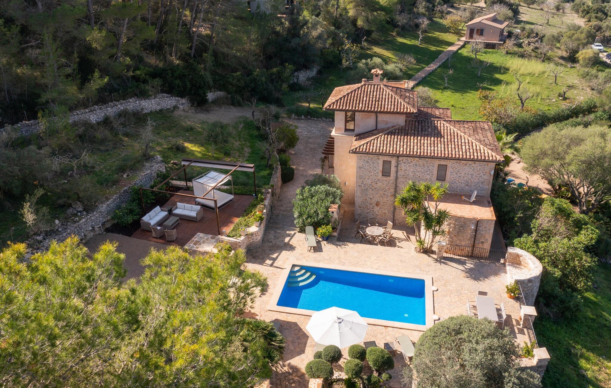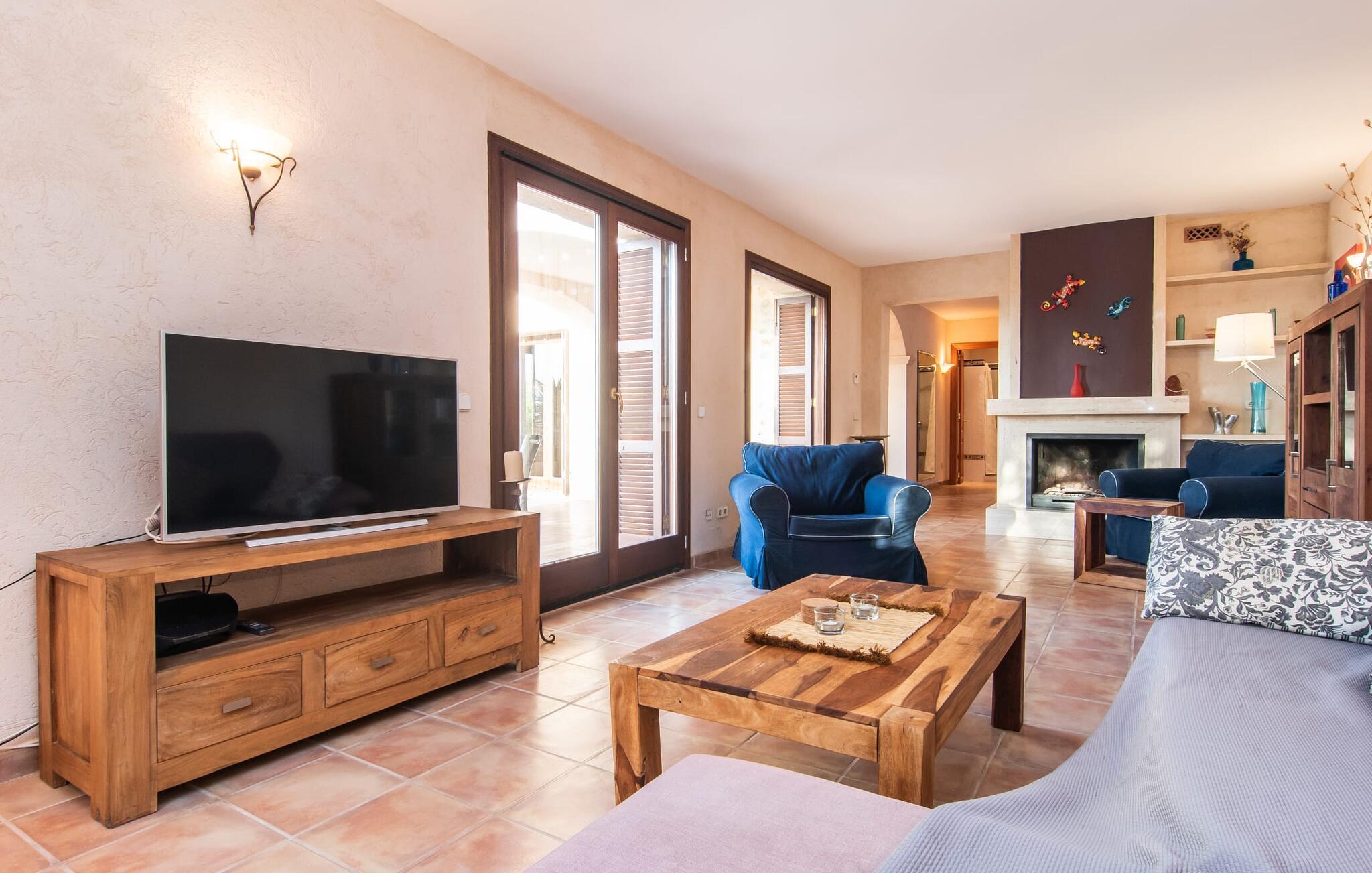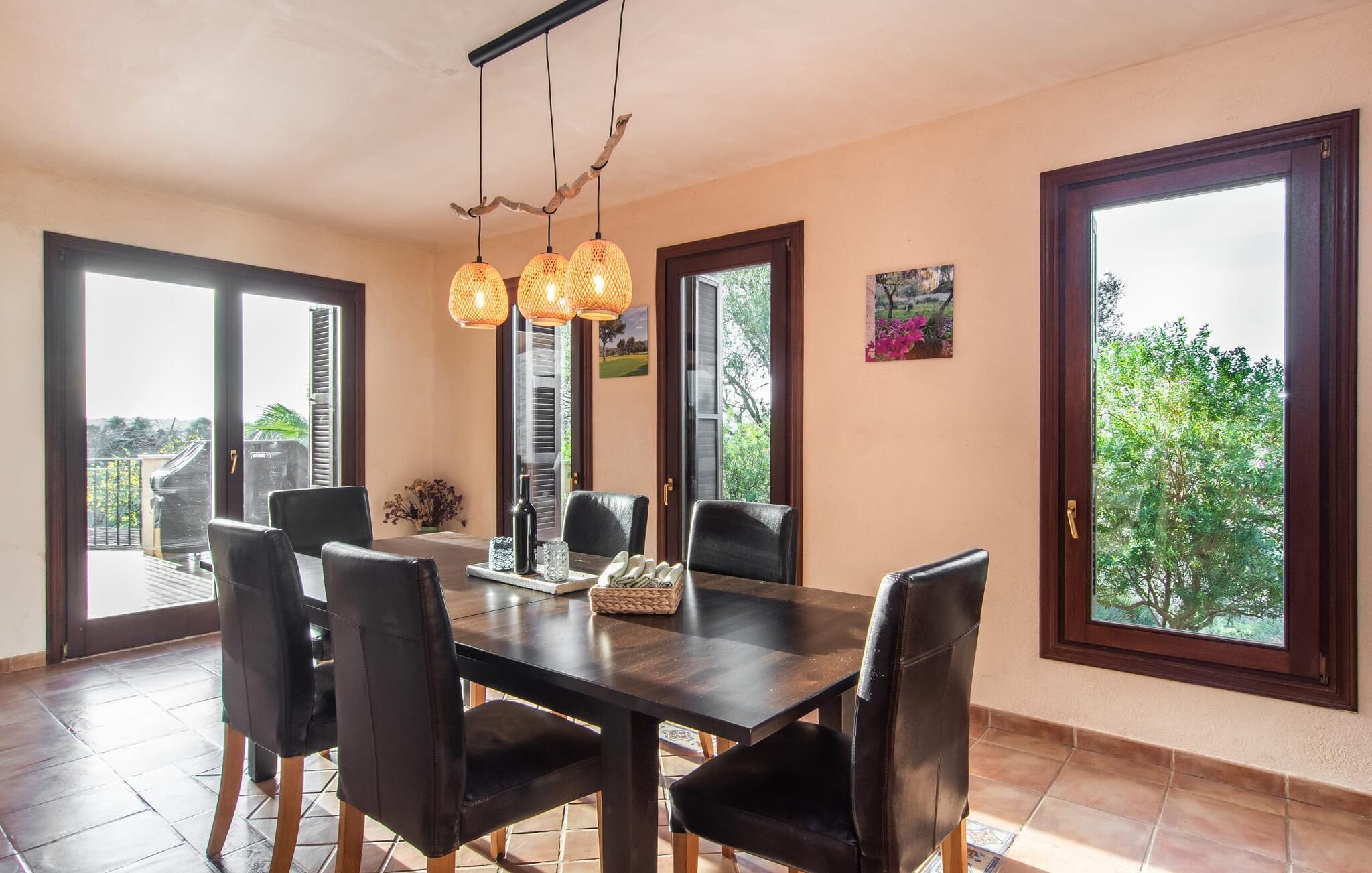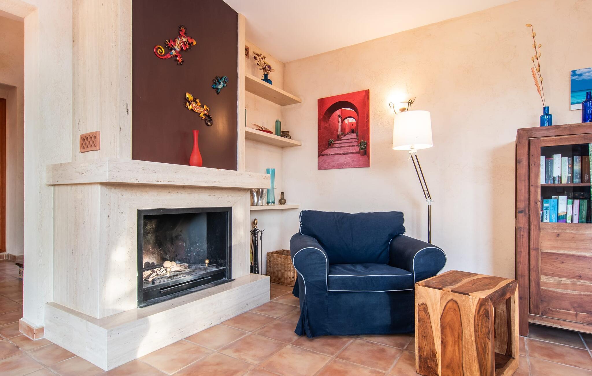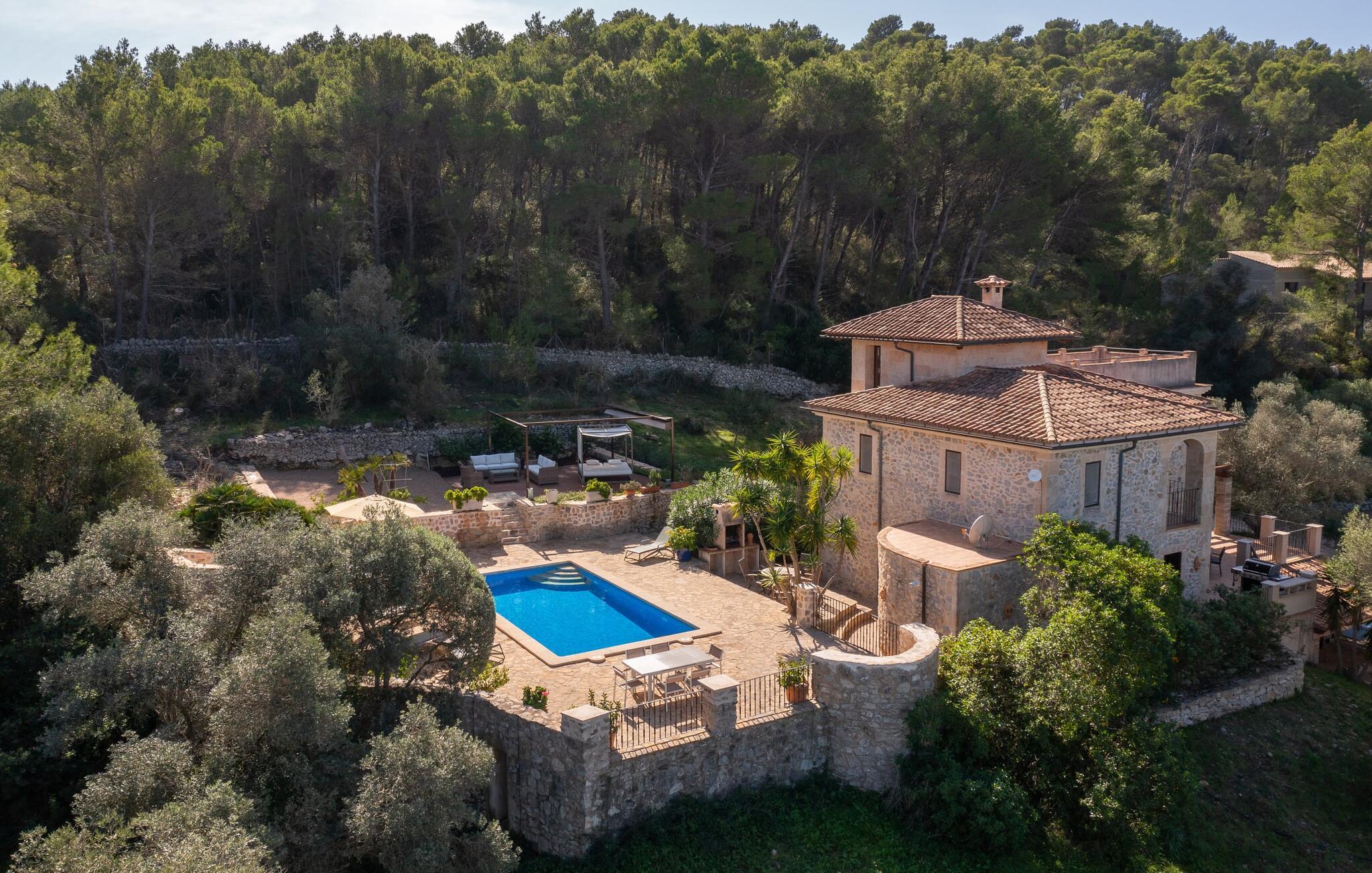 Et venligt interiør glæder beskueren ved indtræden i hovedhuset. De smukke gulvfliser og de lyse vægge skaber en hyggelig atmosfære. Fra entréen træder man ind i den lyse spisestue med mange dybe vinduer og en fantastisk udsigt – dette er et rigtig dejligt sted til stilfulde indendørsmåltider. Til højre er det åbne køkken, løst adskilt af en bordplade, som er noget særligt med sit udstyr af høj kvalitet. Til venstre for entréen ligger stuen, hvorfra man også kan nyde en vidunderlig udsigt. Det første brusebad er også placeret i stueetagen. Fra entréområdet fører en smuk, typisk mallorcansk flisebelagt trappe til øverste etage. Tre hyggeligt indrettede soveværelser – hvoraf to har adgang til balkonen – lægger op til afslapning og ro. Lyse farver kombineret med stilfulde møbler skaber en hyggelig atmosfære til en afslappende søvn. De to badeværelser på denne etage – hvoraf det ene har eget badeværelse – kan prale af naturskønt lys og en samlet lys og behagelig atmosfære. Fra første sal fører en kort trappe til tagterrassen. Der kan I nyde den vidunderlige solnedgang og lade blikket vandre over det omkringliggende landskab og mod Artà.