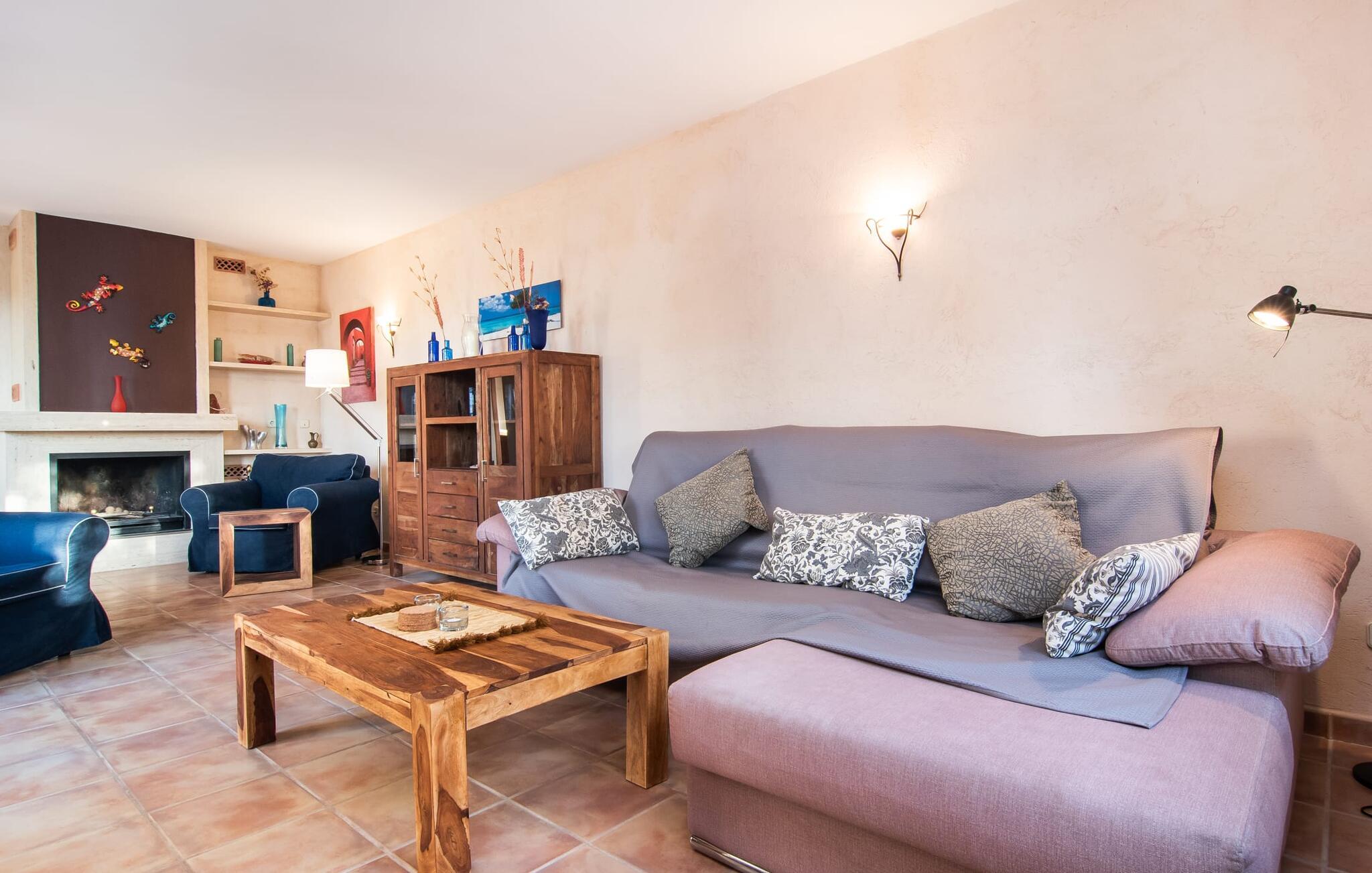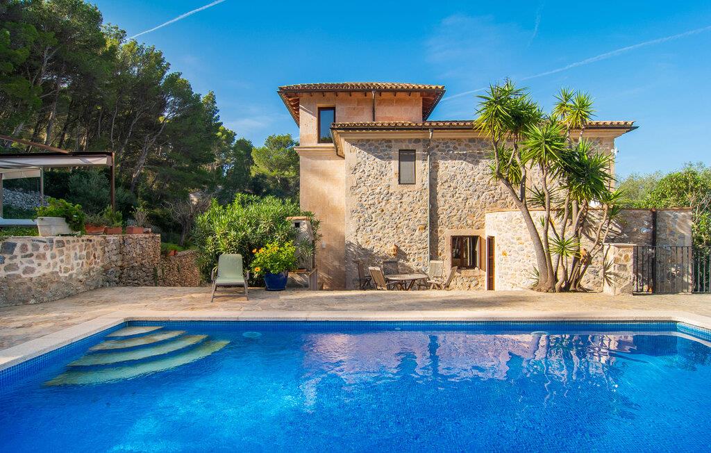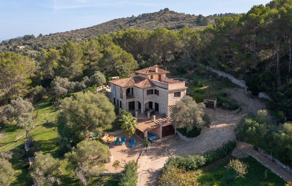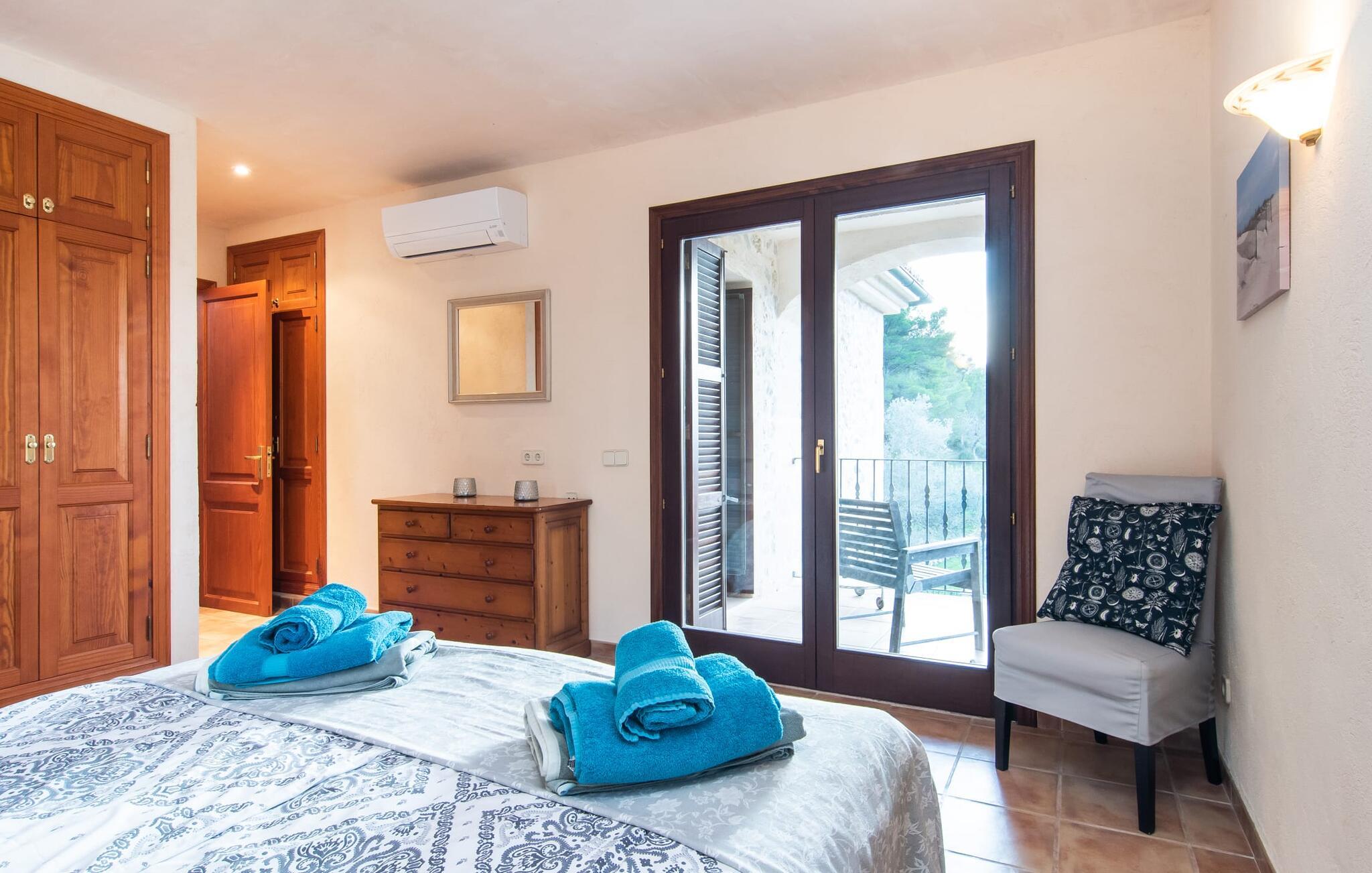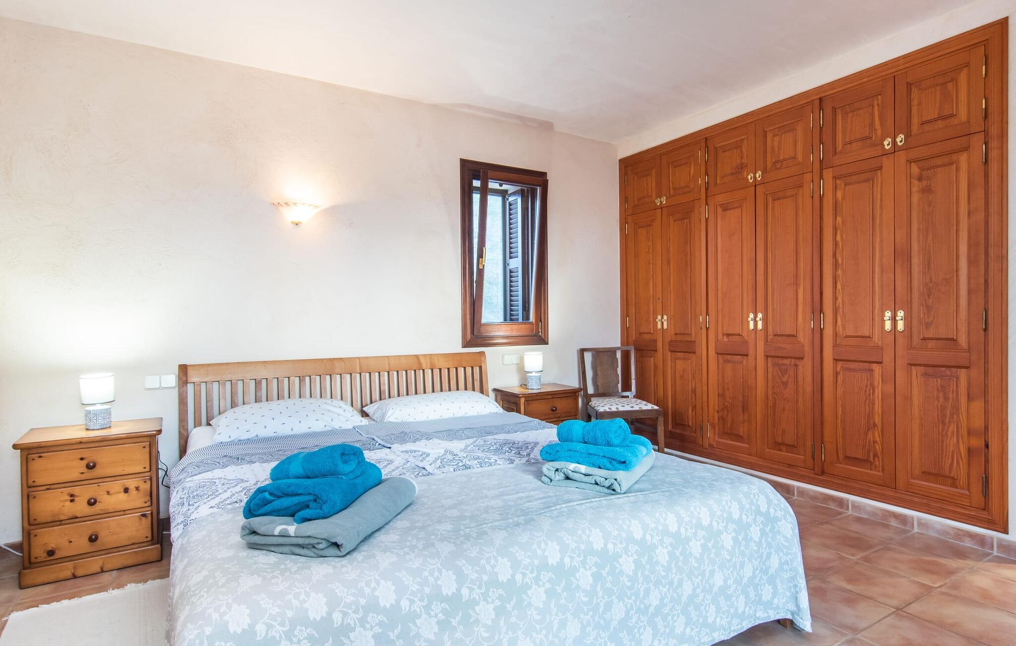 Et venligt interiør glæder beskueren ved indtræden i hovedhuset. De smukke gulvfliser og de lyse vægge skaber en hyggelig atmosfære. Fra entréen træder man ind i den lyse spisestue med mange dybe vinduer og en fantastisk udsigt – dette er et rigtig dejligt sted til stilfulde indendørsmåltider. Til højre er det åbne køkken, løst adskilt af en bordplade, som er noget særligt med sit udstyr af høj kvalitet. Til venstre for entréen ligger stuen, hvorfra man også kan nyde en vidunderlig udsigt. Det første brusebad er også placeret i stueetagen. Fra entréområdet fører en smuk, typisk mallorcansk flisebelagt trappe til øverste etage. Tre hyggeligt indrettede soveværelser – hvoraf to har adgang til balkonen – lægger op til afslapning og ro. Lyse farver kombineret med stilfulde møbler skaber en hyggelig atmosfære til en afslappende søvn. De to badeværelser på denne etage – hvoraf det ene har eget badeværelse – kan prale af naturskønt lys og en samlet lys og behagelig atmosfære. Fra første sal fører en kort trappe til tagterrassen. Der kan I nyde den vidunderlige solnedgang og lade blikket vandre over det omkringliggende landskab og mod Artà.