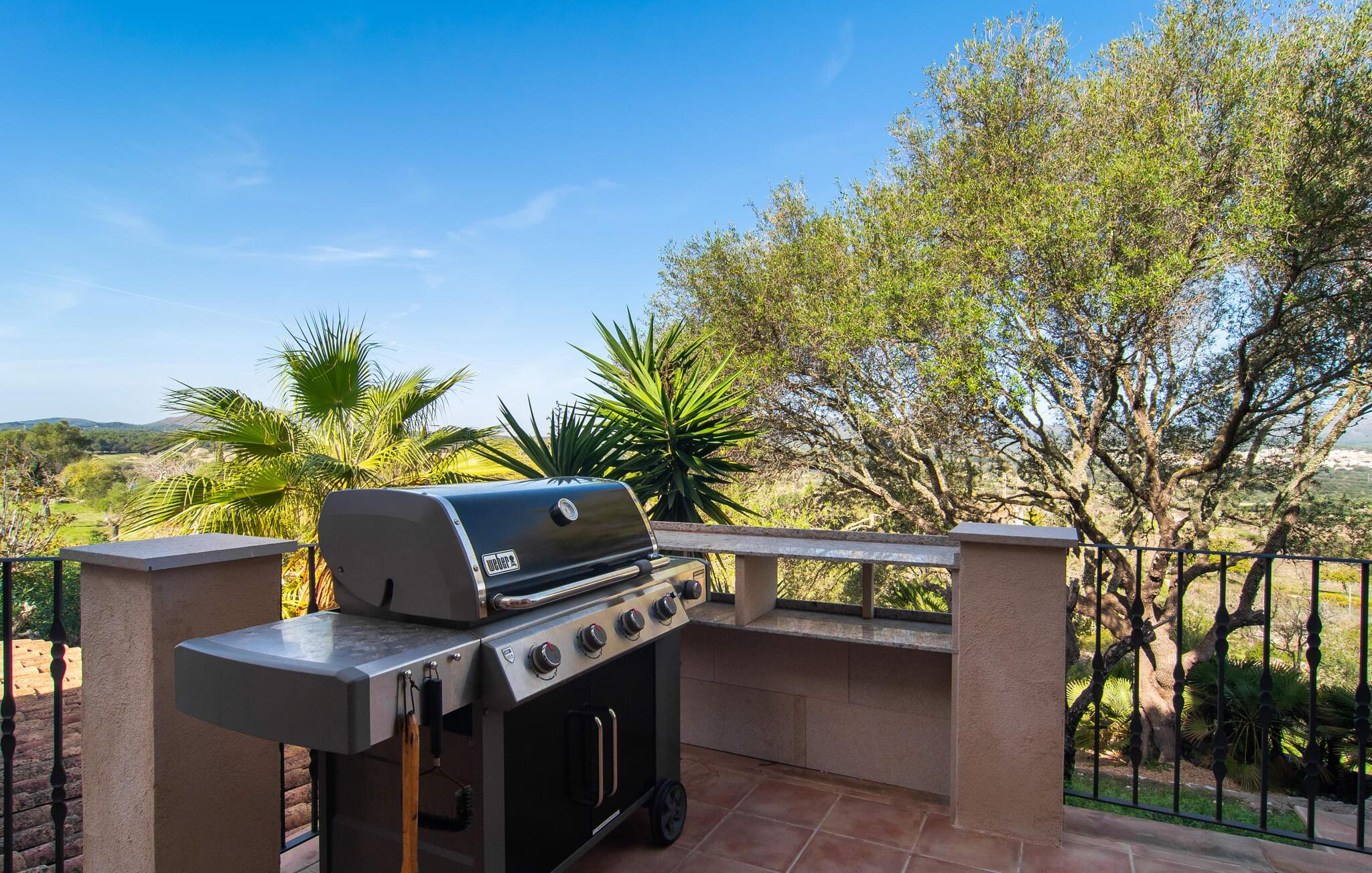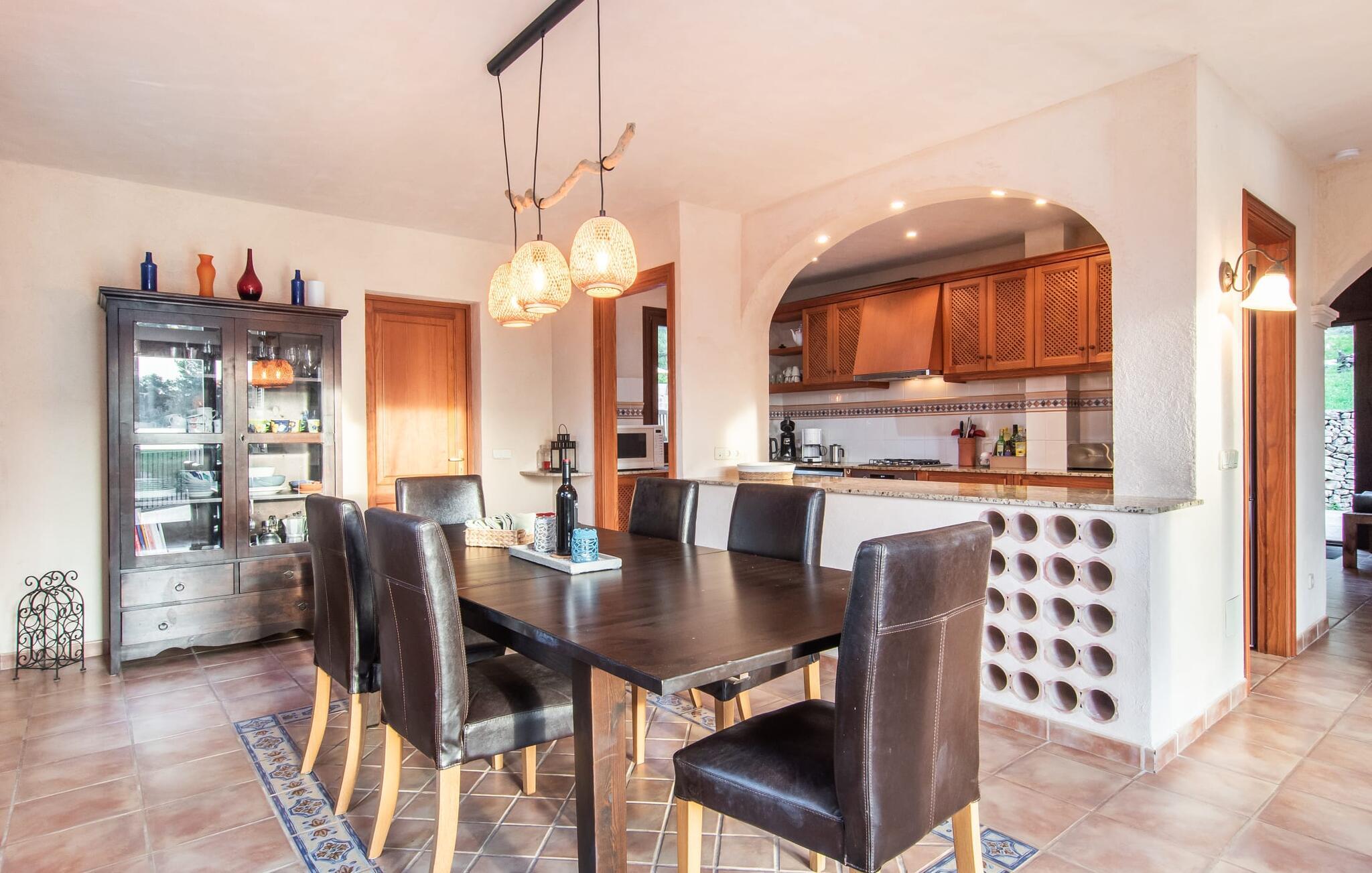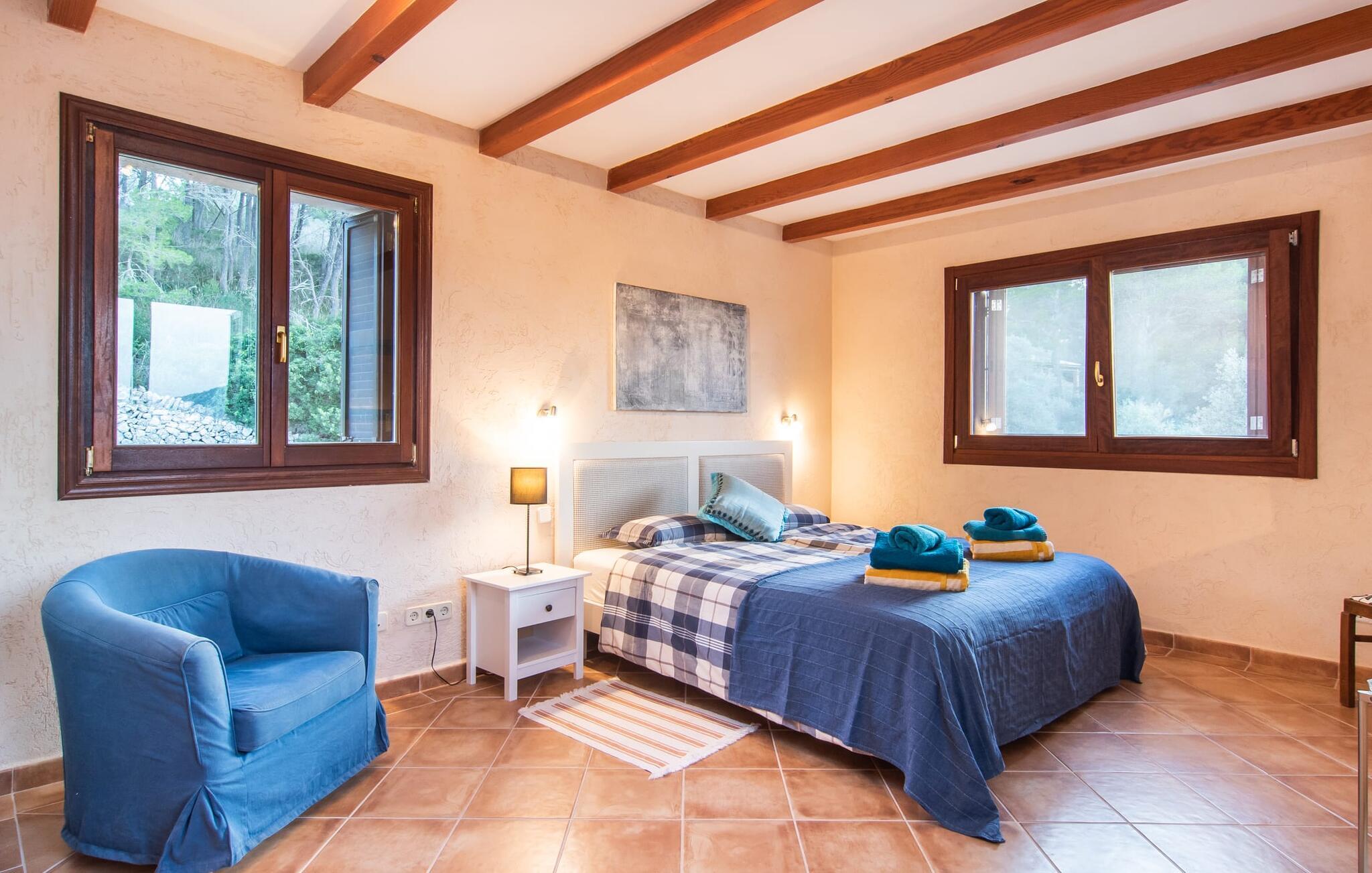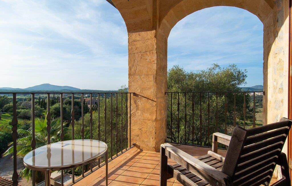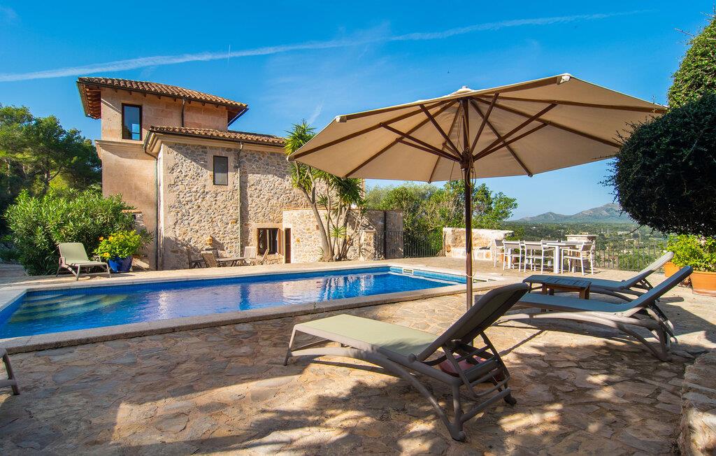Et venligt interiør glæder beskueren ved indtræden i hovedhuset. De smukke gulvfliser og de lyse vægge skaber en hyggelig atmosfære. Fra entréen træder man ind i den lyse spisestue med mange dybe vinduer og en fantastisk udsigt – dette er et rigtig dejligt sted til stilfulde indendørsmåltider. Til højre er det åbne køkken, løst adskilt af en bordplade, som er noget særligt med sit udstyr af høj kvalitet. Til venstre for entréen ligger stuen, hvorfra man også kan nyde en vidunderlig udsigt. Det første brusebad er også placeret i stueetagen. Fra entréområdet fører en smuk, typisk mallorcansk flisebelagt trappe til øverste etage. Tre hyggeligt indrettede soveværelser – hvoraf to har adgang til balkonen – lægger op til afslapning og ro. Lyse farver kombineret med stilfulde møbler skaber en hyggelig atmosfære til en afslappende søvn. De to badeværelser på denne etage – hvoraf det ene har eget badeværelse – kan prale af naturskønt lys og en samlet lys og behagelig atmosfære. Fra første sal fører en kort trappe til tagterrassen. Der kan I nyde den vidunderlige solnedgang og lade blikket vandre over det omkringliggende landskab og mod Artà.