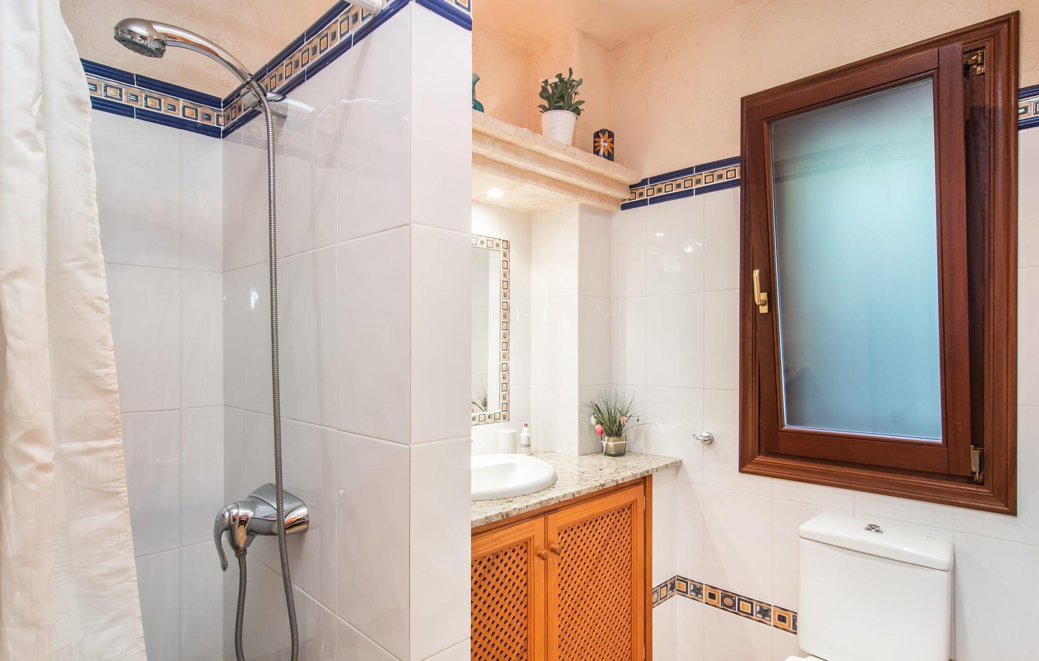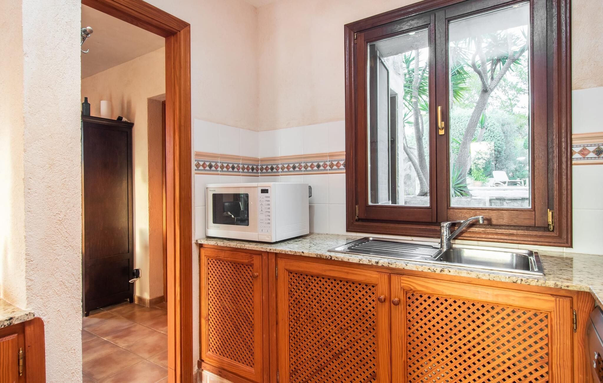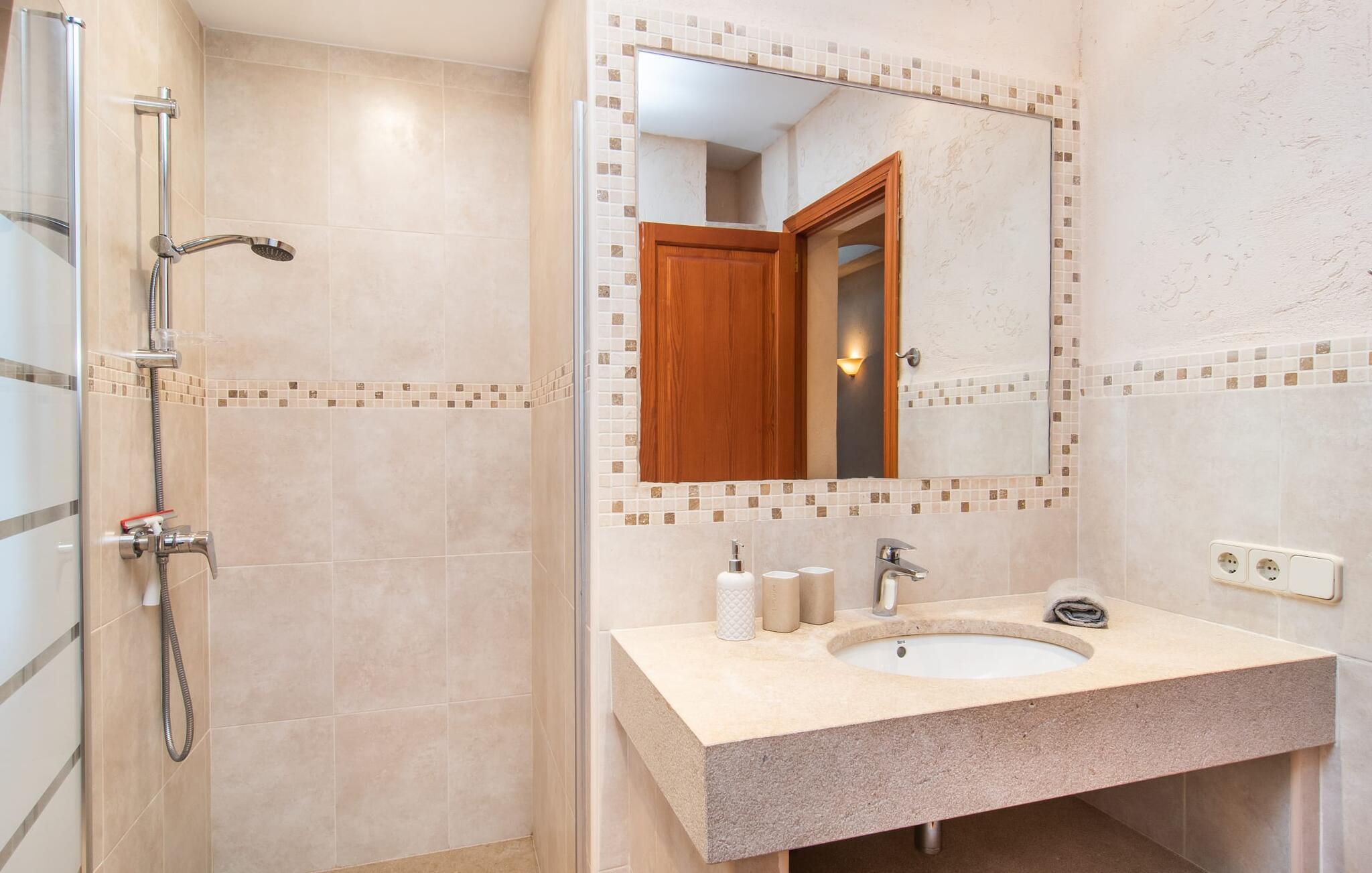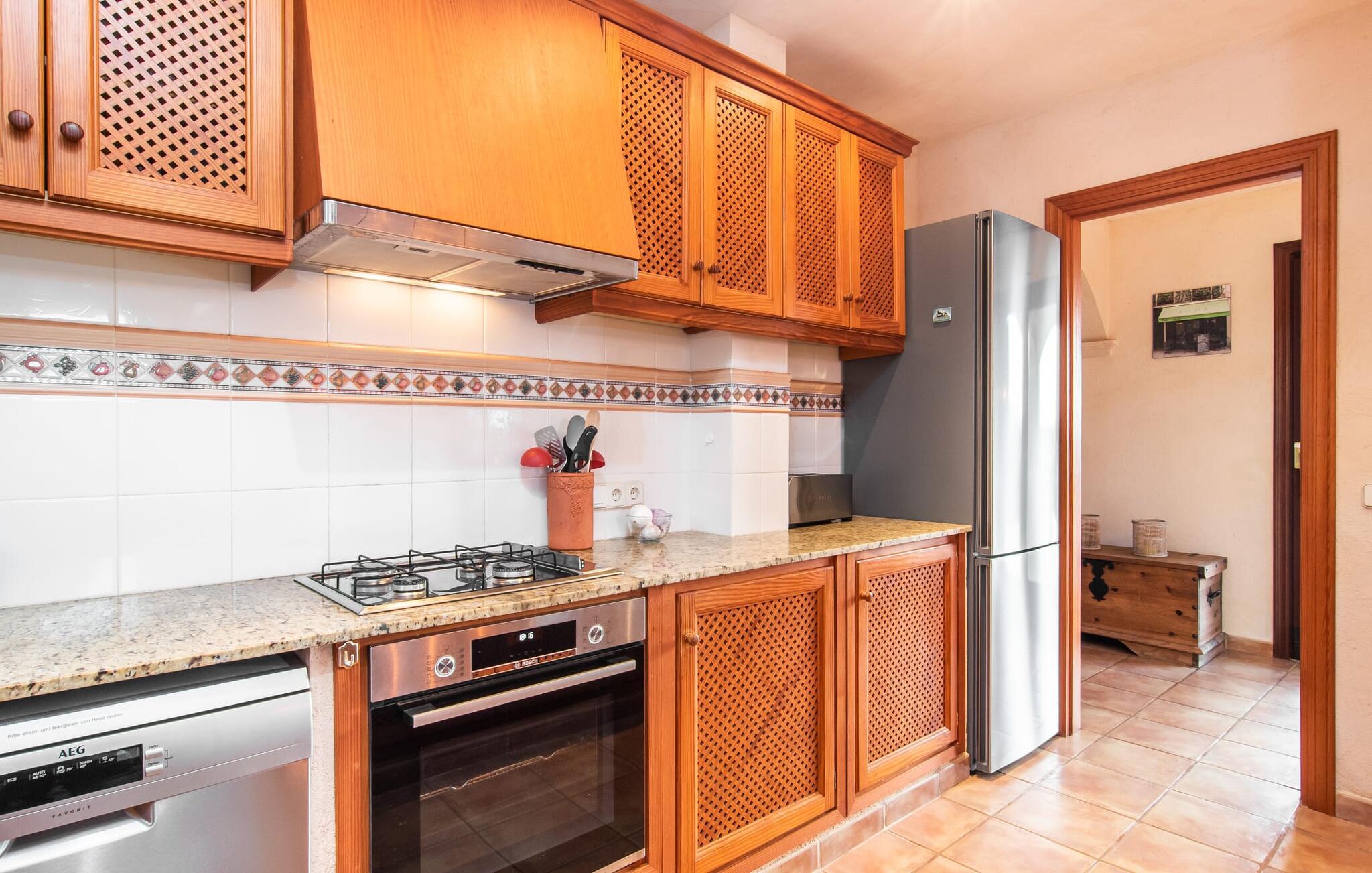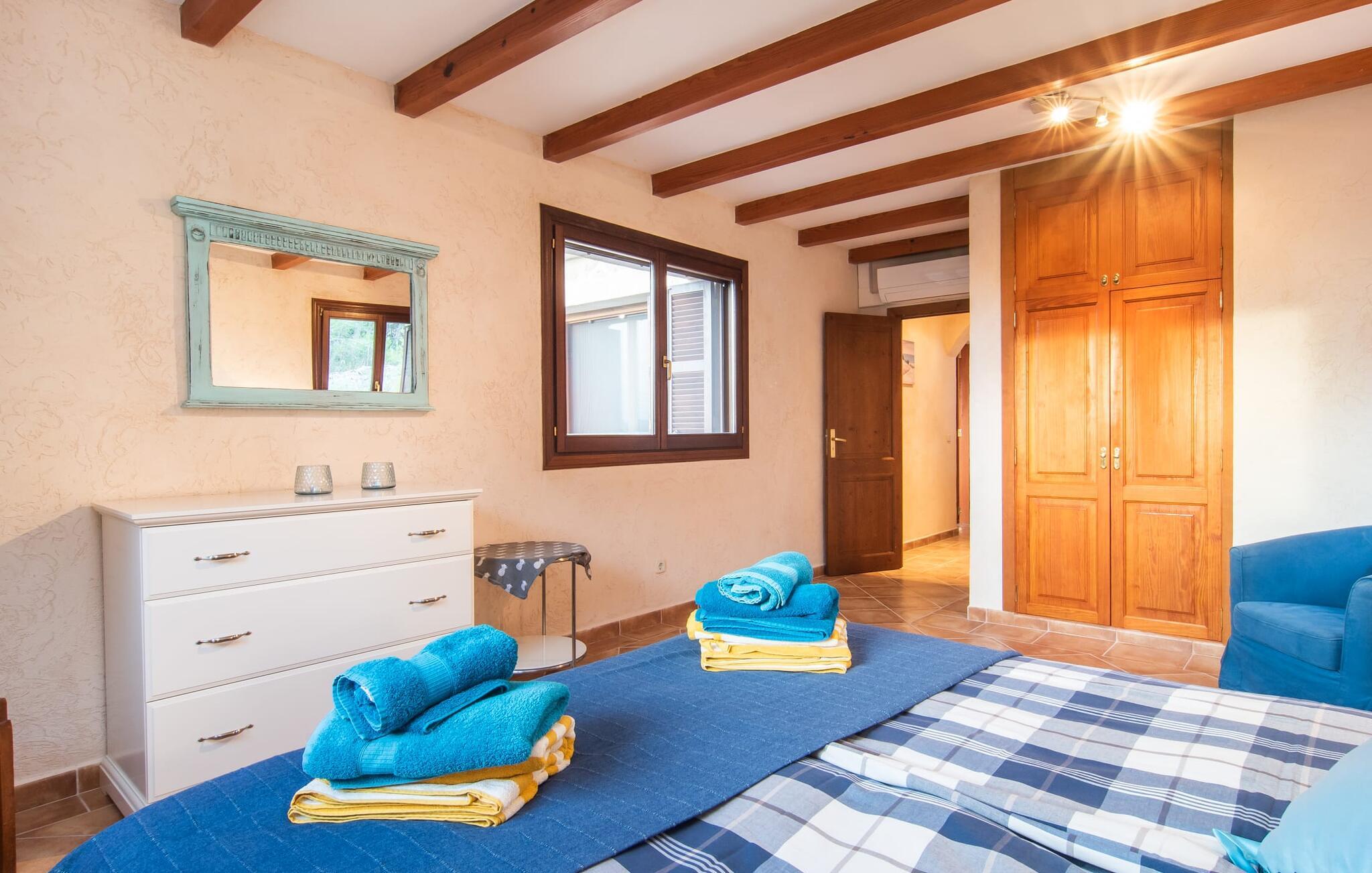 Et venligt interiør glæder beskueren ved indtræden i hovedhuset. De smukke gulvfliser og de lyse vægge skaber en hyggelig atmosfære. Fra entréen træder man ind i den lyse spisestue med mange dybe vinduer og en fantastisk udsigt – dette er et rigtig dejligt sted til stilfulde indendørsmåltider. Til højre er det åbne køkken, løst adskilt af en bordplade, som er noget særligt med sit udstyr af høj kvalitet. Til venstre for entréen ligger stuen, hvorfra man også kan nyde en vidunderlig udsigt. Det første brusebad er også placeret i stueetagen. Fra entréområdet fører en smuk, typisk mallorcansk flisebelagt trappe til øverste etage. Tre hyggeligt indrettede soveværelser – hvoraf to har adgang til balkonen – lægger op til afslapning og ro. Lyse farver kombineret med stilfulde møbler skaber en hyggelig atmosfære til en afslappende søvn. De to badeværelser på denne etage – hvoraf det ene har eget badeværelse – kan prale af naturskønt lys og en samlet lys og behagelig atmosfære. Fra første sal fører en kort trappe til tagterrassen. Der kan I nyde den vidunderlige solnedgang og lade blikket vandre over det omkringliggende landskab og mod Artà.