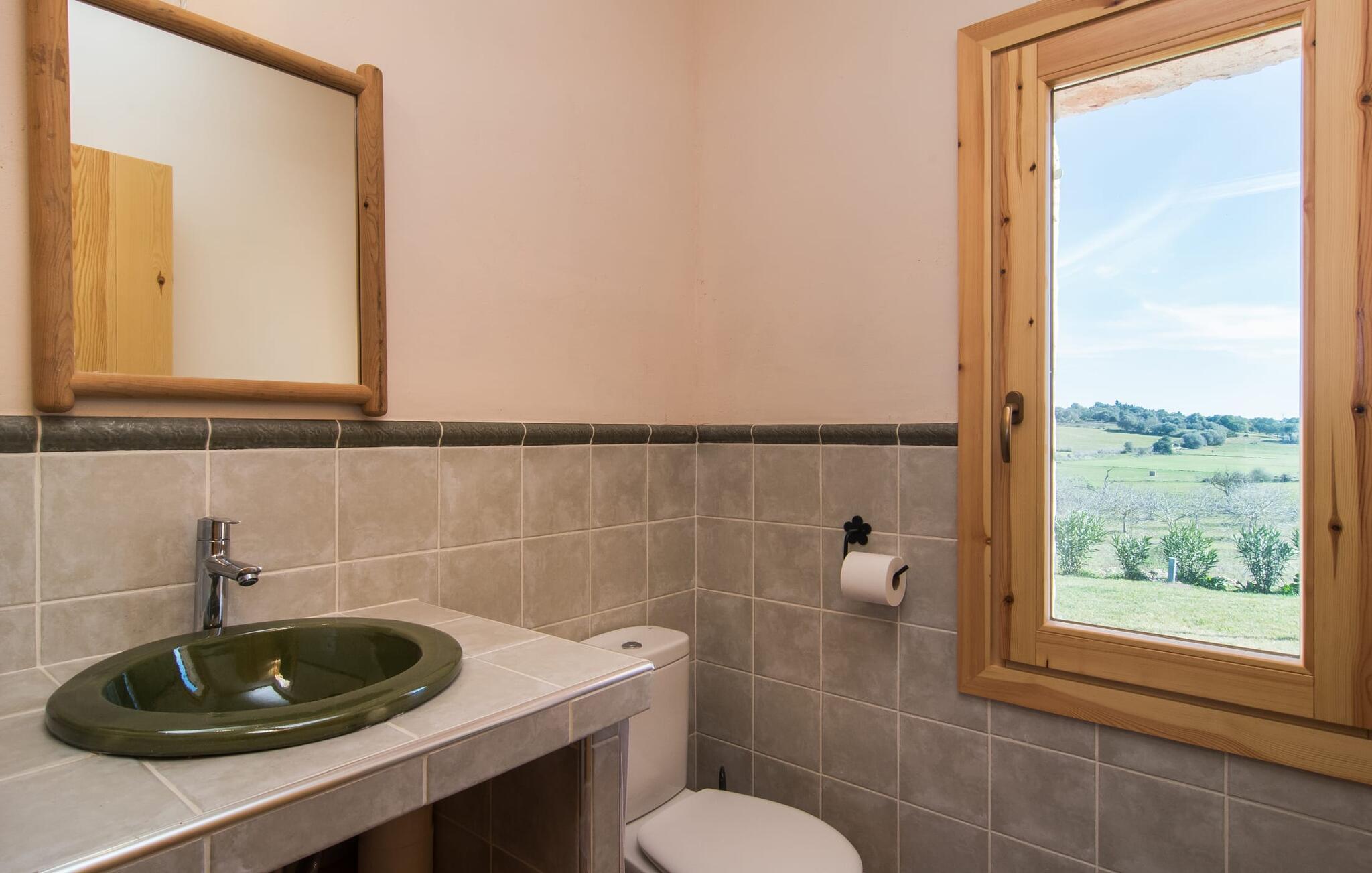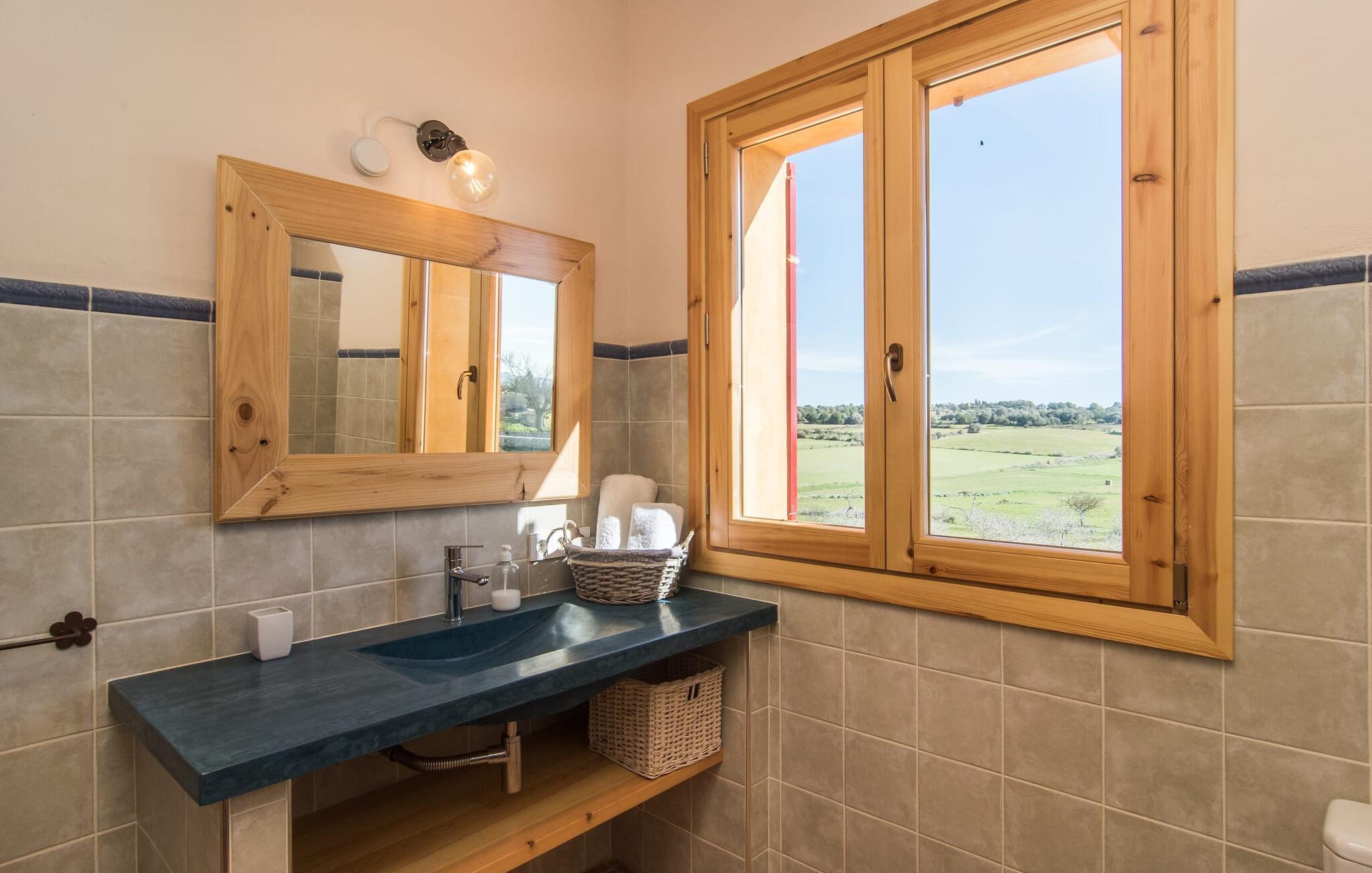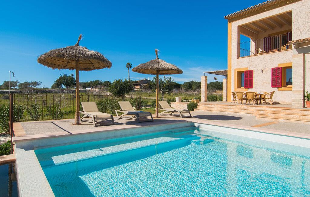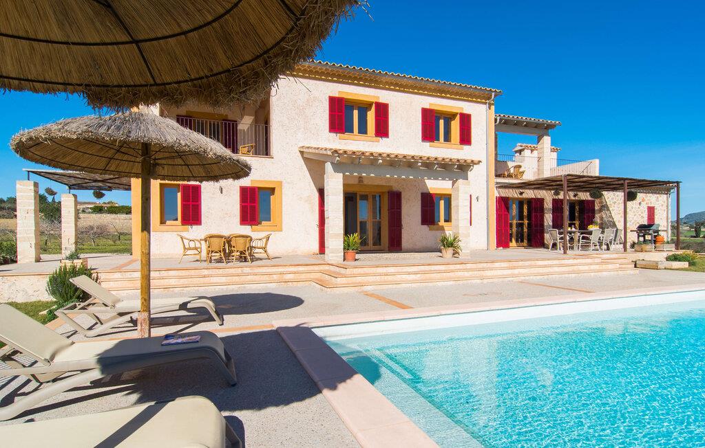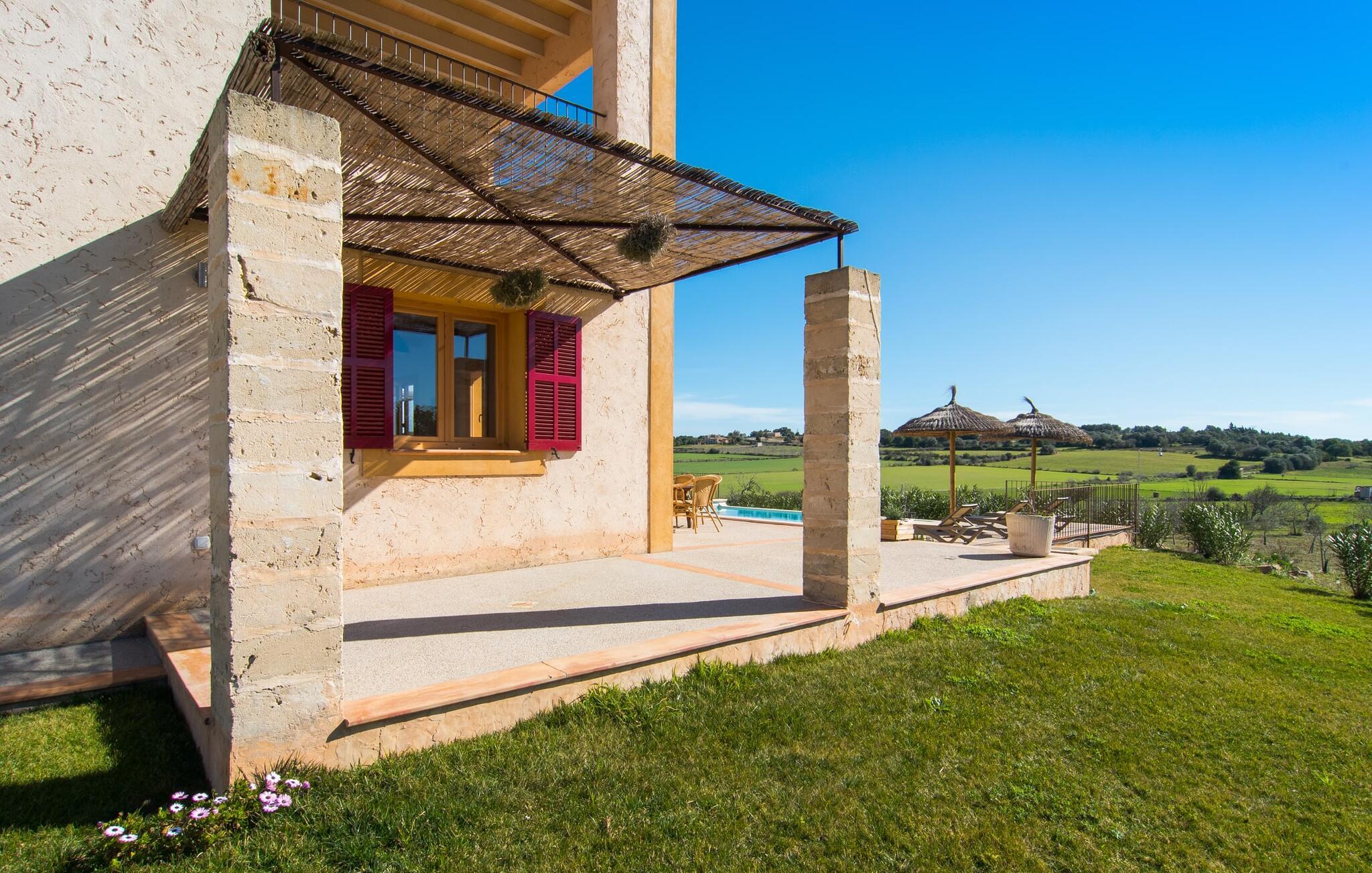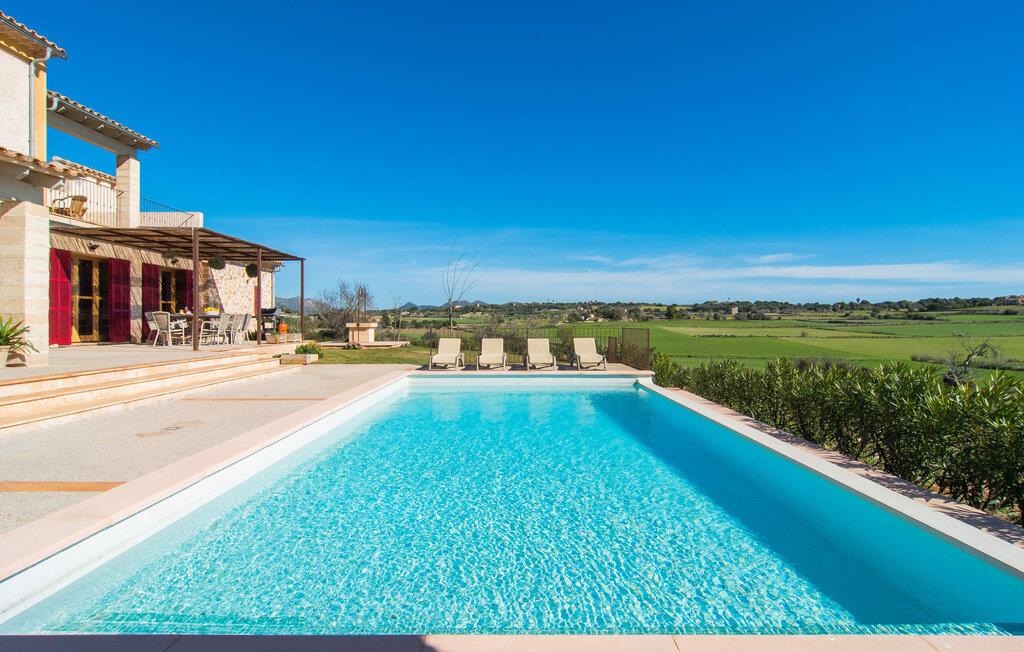 Kort efter landing i Palma Lufthavn kører I ned ad indkørslen til huset, parkerer jeres lejebil og nyder straks den betagende udsigt, som dette feriehus på Mallorca har at byde på: Her kan I se langt ud over det overvejende flade landskab til kæderne af bakker, som hæver sig blidt i forskellige retninger. Og så vil I straks have fat i et badehåndklæde og snuppe en af de liggestole, der er så indbydende placeret ved poolen, som er 10 m lang, har klart vand og er nem at komme til via trapper. Og alt det - vi gentager os gerne her! - med et storslået panorama, der strækker sig ud foran jer. Solterrassen og de åbne og delvist overdækkede terrassearealer direkte ved siden af huset virker harmonisk. Adskillige siddepladser ved perfekte udsigtspunkter inviterer jer til at tilbringe timers afslapning, som er særlig smuk ved solopgang og solnedgang. Også vidunderligt: to altaner på husets øverste etage supplerer udendørsområdet. Direkte fra terrassen kommer I ind i den store stue/spisestue, som er opdelt i to områder - på den ene side med en behagelig sofa og pejs-tv-hjørne, på den anden side med en hyggelig spiseplads. Blot et værelse videre ligger køkkenet, som også er så rummeligt, at der er god plads til udvidede madlavningssessioner og endnu et spisebord - et rigtigt køkken-alrum, hvor fællessammenkomster er i højsædet. I stueplan er der desuden soveværelse med smarte indbyggede skabe samt badeværelse og toilet. Derfor er der yderligere tre soveværelser med dobbeltsenge på øverste etage, hvoraf det ene har en-suite badeværelse; Der er også et ekstra badeværelse. Husets indretning imponerer med sin behagelige lysstyrke, som understreges af den generøse brug af træ. Lyse vægge, store gulvfliser og synlige bjælkelofter fuldender den indvendige harmoni i denne charmerende Mallora-finca. Fincaen "s'Hort de Son Pereto" er ideelt placeret på Mallorca for udflugter i alle retninger. Samtidig kan I nyde absolut fred og privatliv her. I kan klare jeres daglige ærinder i smukke Sant Llorenc (ca. 3 km), og for yderligere shopping kan I køre til Manacor, ca. 6 km væk. Sandstrandene i Cala Millor, Sa Coma og Porto Cristo er inden for rækkevidde.