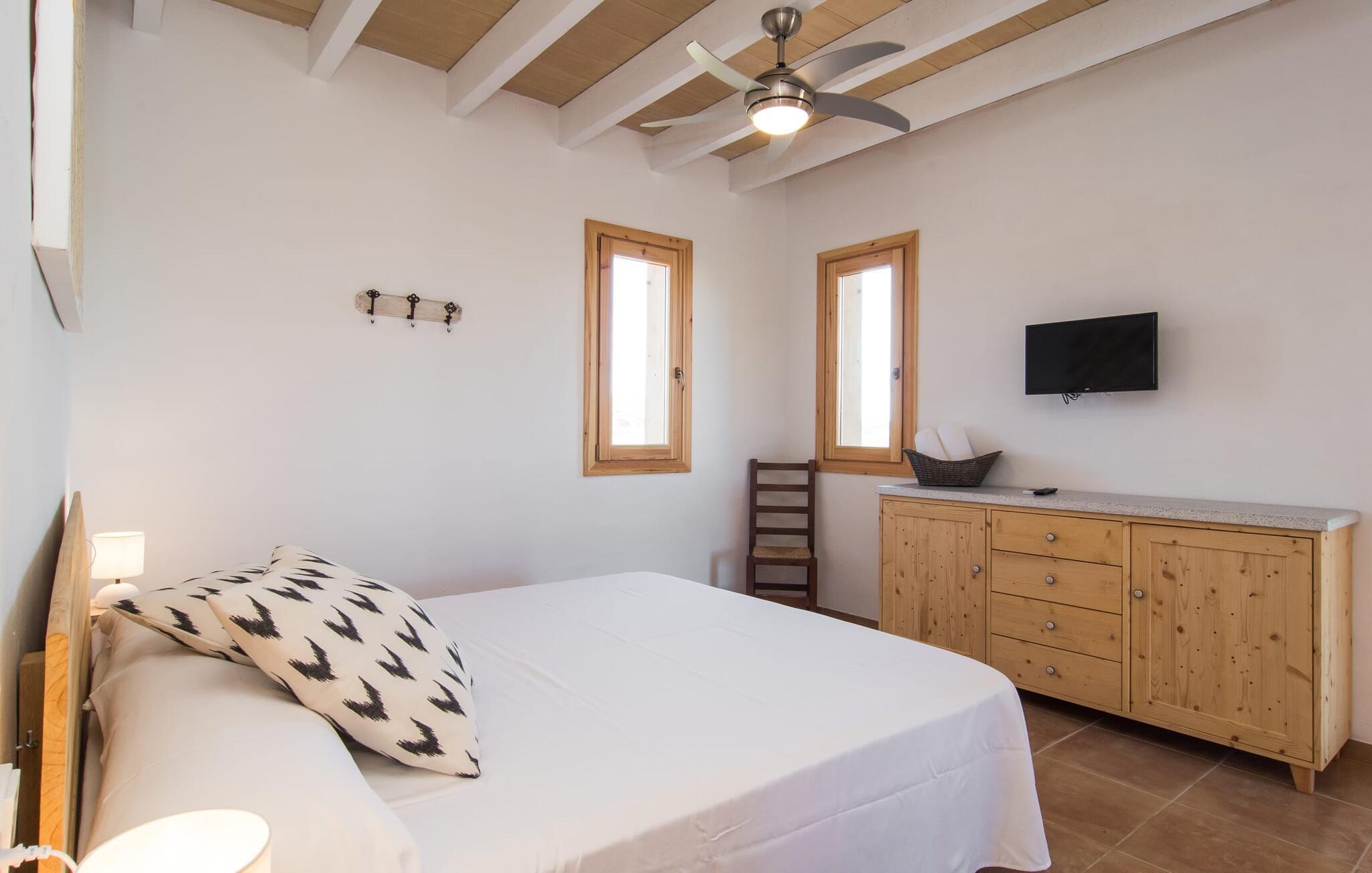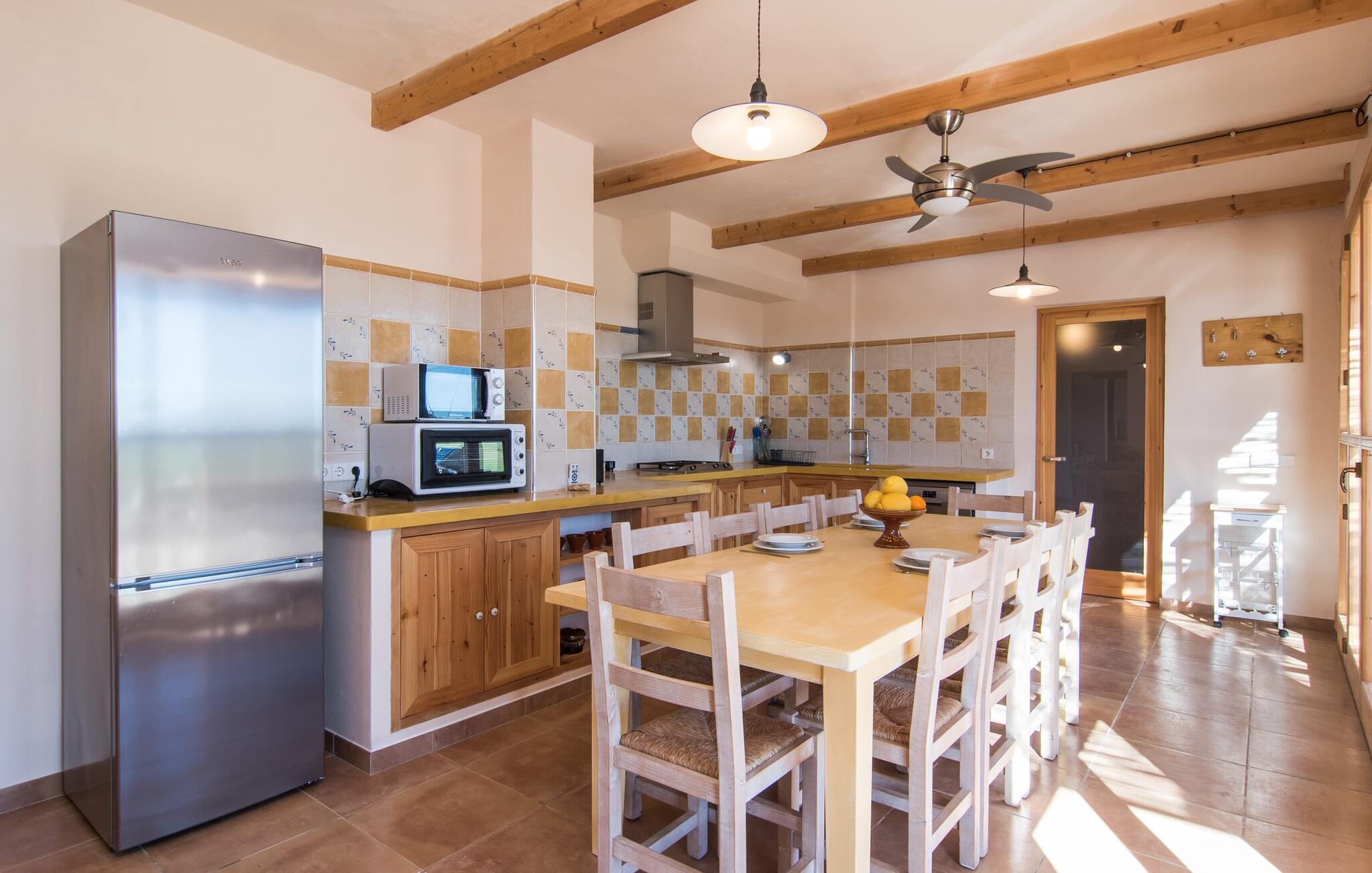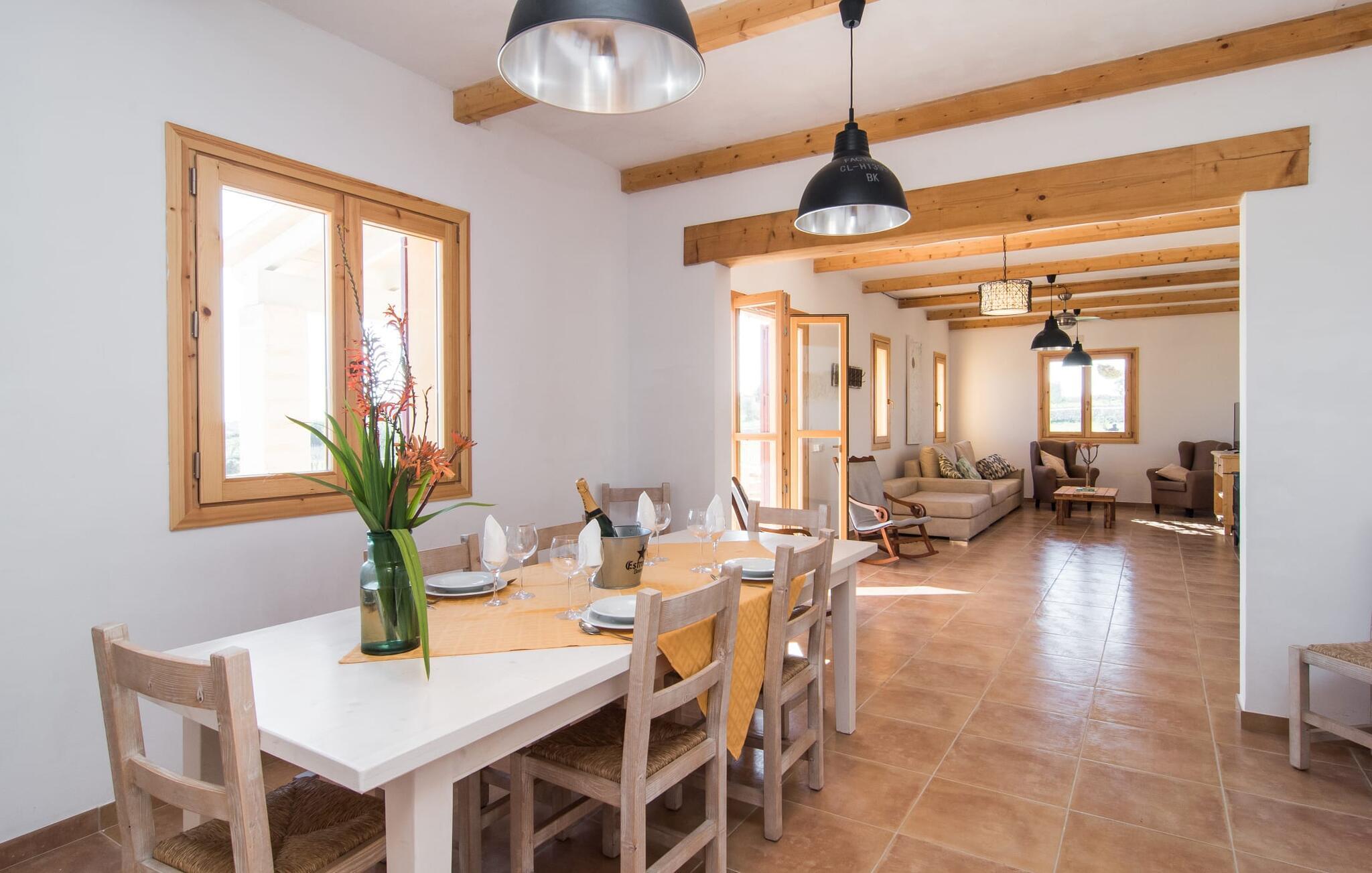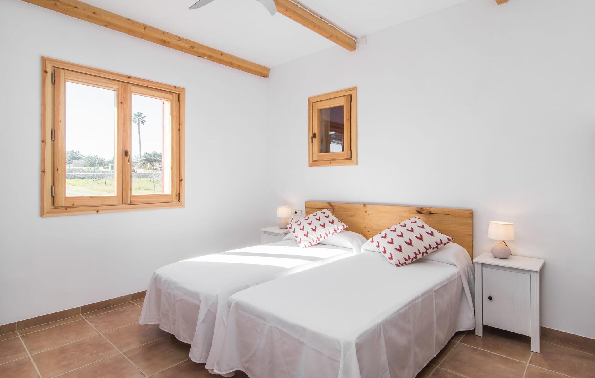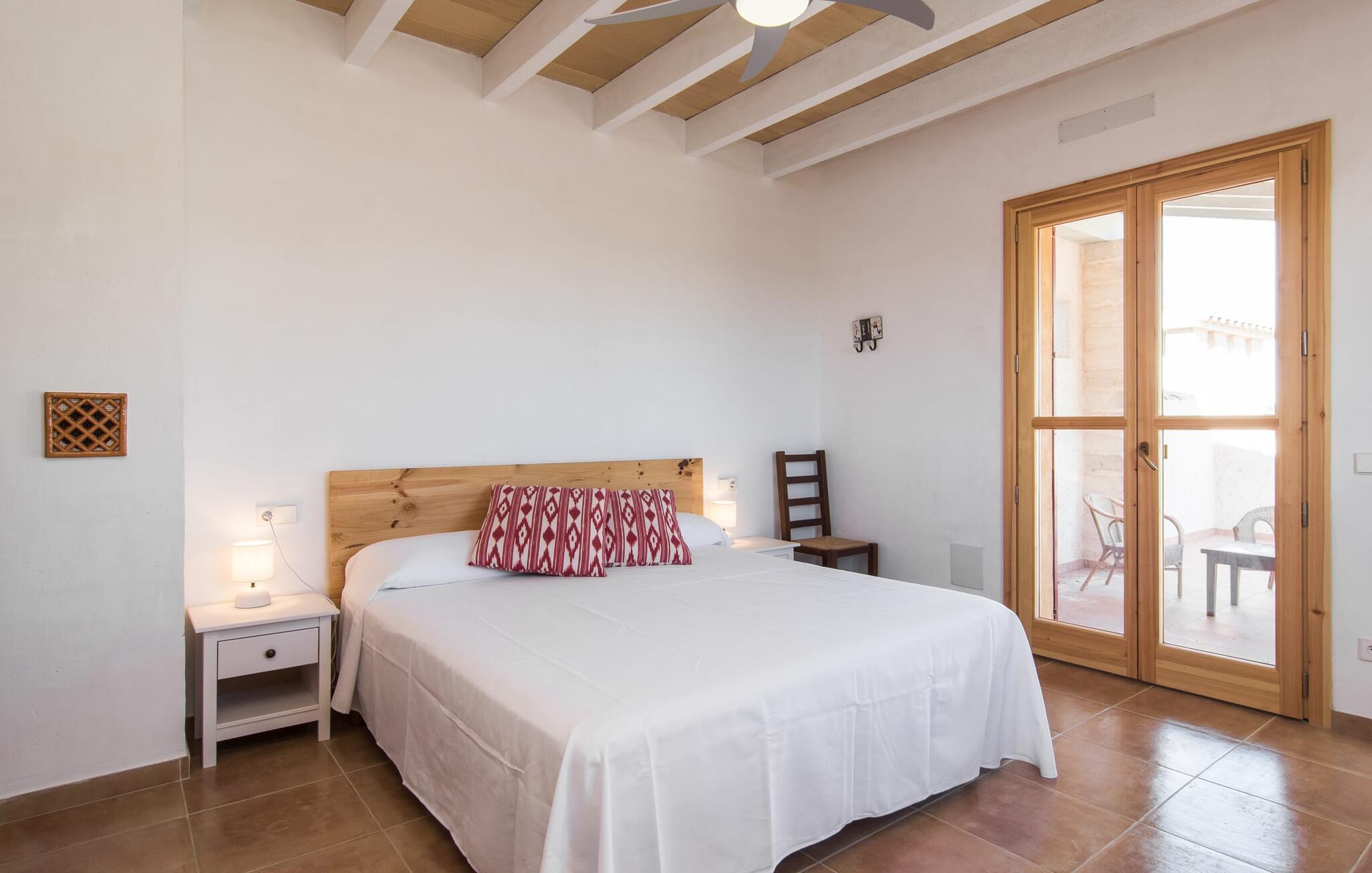 Kort efter landing i Palma Lufthavn kører I ned ad indkørslen til huset, parkerer jeres lejebil og nyder straks den betagende udsigt, som dette feriehus på Mallorca har at byde på: Her kan I se langt ud over det overvejende flade landskab til kæderne af bakker, som hæver sig blidt i forskellige retninger. Og så vil I straks have fat i et badehåndklæde og snuppe en af de liggestole, der er så indbydende placeret ved poolen, som er 10 m lang, har klart vand og er nem at komme til via trapper. Og alt det - vi gentager os gerne her! - med et storslået panorama, der strækker sig ud foran jer. Solterrassen og de åbne og delvist overdækkede terrassearealer direkte ved siden af huset virker harmonisk. Adskillige siddepladser ved perfekte udsigtspunkter inviterer jer til at tilbringe timers afslapning, som er særlig smuk ved solopgang og solnedgang. Også vidunderligt: to altaner på husets øverste etage supplerer udendørsområdet. Direkte fra terrassen kommer I ind i den store stue/spisestue, som er opdelt i to områder - på den ene side med en behagelig sofa og pejs-tv-hjørne, på den anden side med en hyggelig spiseplads. Blot et værelse videre ligger køkkenet, som også er så rummeligt, at der er god plads til udvidede madlavningssessioner og endnu et spisebord - et rigtigt køkken-alrum, hvor fællessammenkomster er i højsædet. I stueplan er der desuden soveværelse med smarte indbyggede skabe samt badeværelse og toilet. Derfor er der yderligere tre soveværelser med dobbeltsenge på øverste etage, hvoraf det ene har en-suite badeværelse; Der er også et ekstra badeværelse. Husets indretning imponerer med sin behagelige lysstyrke, som understreges af den generøse brug af træ. Lyse vægge, store gulvfliser og synlige bjælkelofter fuldender den indvendige harmoni i denne charmerende Mallora-finca. Fincaen "s'Hort de Son Pereto" er ideelt placeret på Mallorca for udflugter i alle retninger. Samtidig kan I nyde absolut fred og privatliv her. I kan klare jeres daglige ærinder i smukke Sant Llorenc (ca. 3 km), og for yderligere shopping kan I køre til Manacor, ca. 6 km væk. Sandstrandene i Cala Millor, Sa Coma og Porto Cristo er inden for rækkevidde.