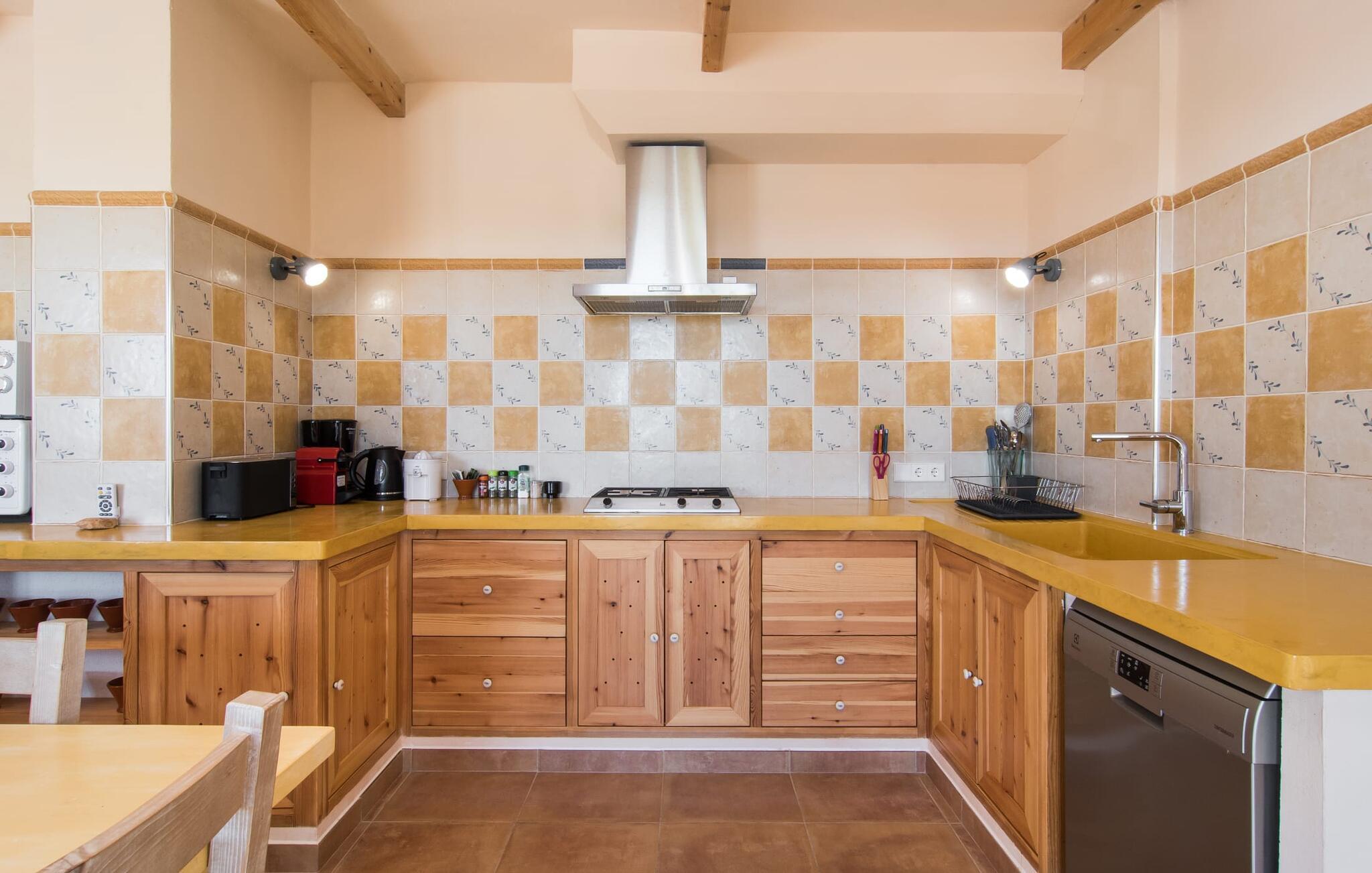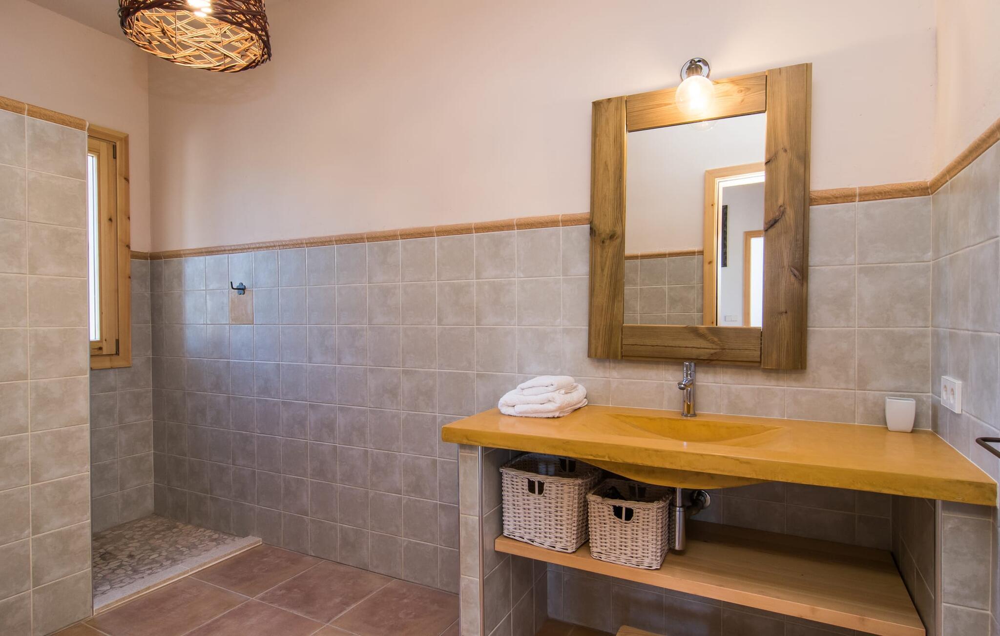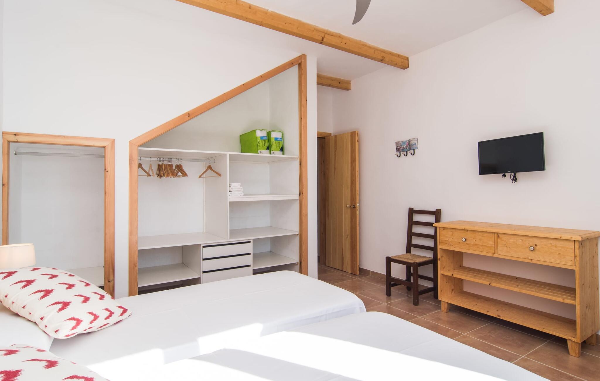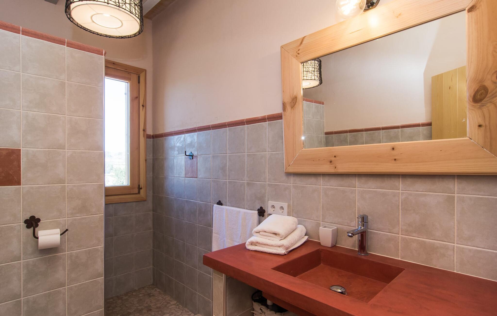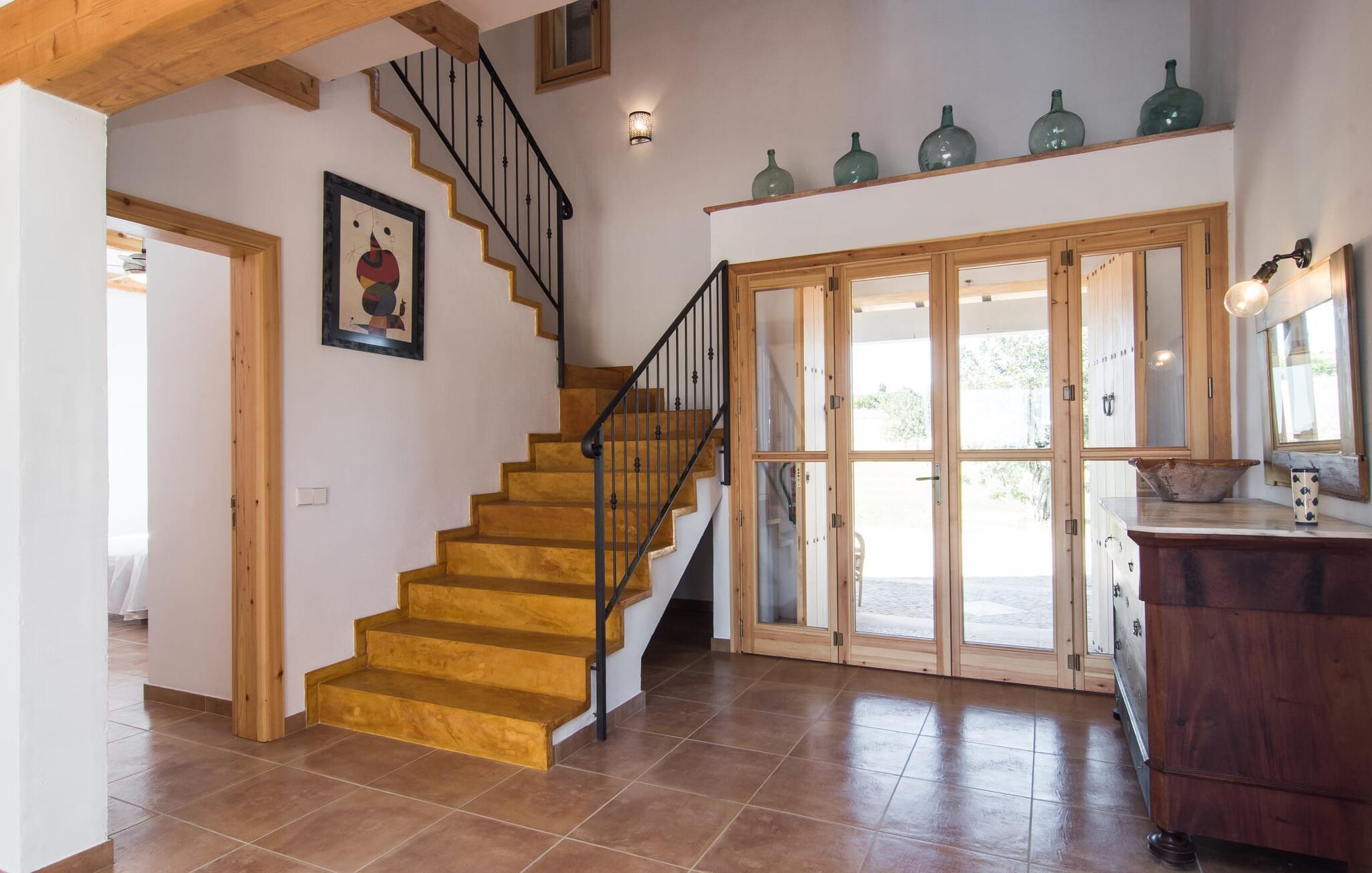 Kort efter landing i Palma Lufthavn kører I ned ad indkørslen til huset, parkerer jeres lejebil og nyder straks den betagende udsigt, som dette feriehus på Mallorca har at byde på: Her kan I se langt ud over det overvejende flade landskab til kæderne af bakker, som hæver sig blidt i forskellige retninger. Og så vil I straks have fat i et badehåndklæde og snuppe en af de liggestole, der er så indbydende placeret ved poolen, som er 10 m lang, har klart vand og er nem at komme til via trapper. Og alt det - vi gentager os gerne her! - med et storslået panorama, der strækker sig ud foran jer. Solterrassen og de åbne og delvist overdækkede terrassearealer direkte ved siden af huset virker harmonisk. Adskillige siddepladser ved perfekte udsigtspunkter inviterer jer til at tilbringe timers afslapning, som er særlig smuk ved solopgang og solnedgang. Også vidunderligt: to altaner på husets øverste etage supplerer udendørsområdet. Direkte fra terrassen kommer I ind i den store stue/spisestue, som er opdelt i to områder - på den ene side med en behagelig sofa og pejs-tv-hjørne, på den anden side med en hyggelig spiseplads. Blot et værelse videre ligger køkkenet, som også er så rummeligt, at der er god plads til udvidede madlavningssessioner og endnu et spisebord - et rigtigt køkken-alrum, hvor fællessammenkomster er i højsædet. I stueplan er der desuden soveværelse med smarte indbyggede skabe samt badeværelse og toilet. Derfor er der yderligere tre soveværelser med dobbeltsenge på øverste etage, hvoraf det ene har en-suite badeværelse; Der er også et ekstra badeværelse. Husets indretning imponerer med sin behagelige lysstyrke, som understreges af den generøse brug af træ. Lyse vægge, store gulvfliser og synlige bjælkelofter fuldender den indvendige harmoni i denne charmerende Mallora-finca. Fincaen "s'Hort de Son Pereto" er ideelt placeret på Mallorca for udflugter i alle retninger. Samtidig kan I nyde absolut fred og privatliv her. I kan klare jeres daglige ærinder i smukke Sant Llorenc (ca. 3 km), og for yderligere shopping kan I køre til Manacor, ca. 6 km væk. Sandstrandene i Cala Millor, Sa Coma og Porto Cristo er inden for rækkevidde.
