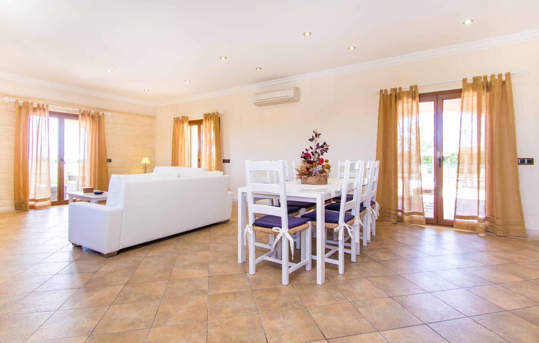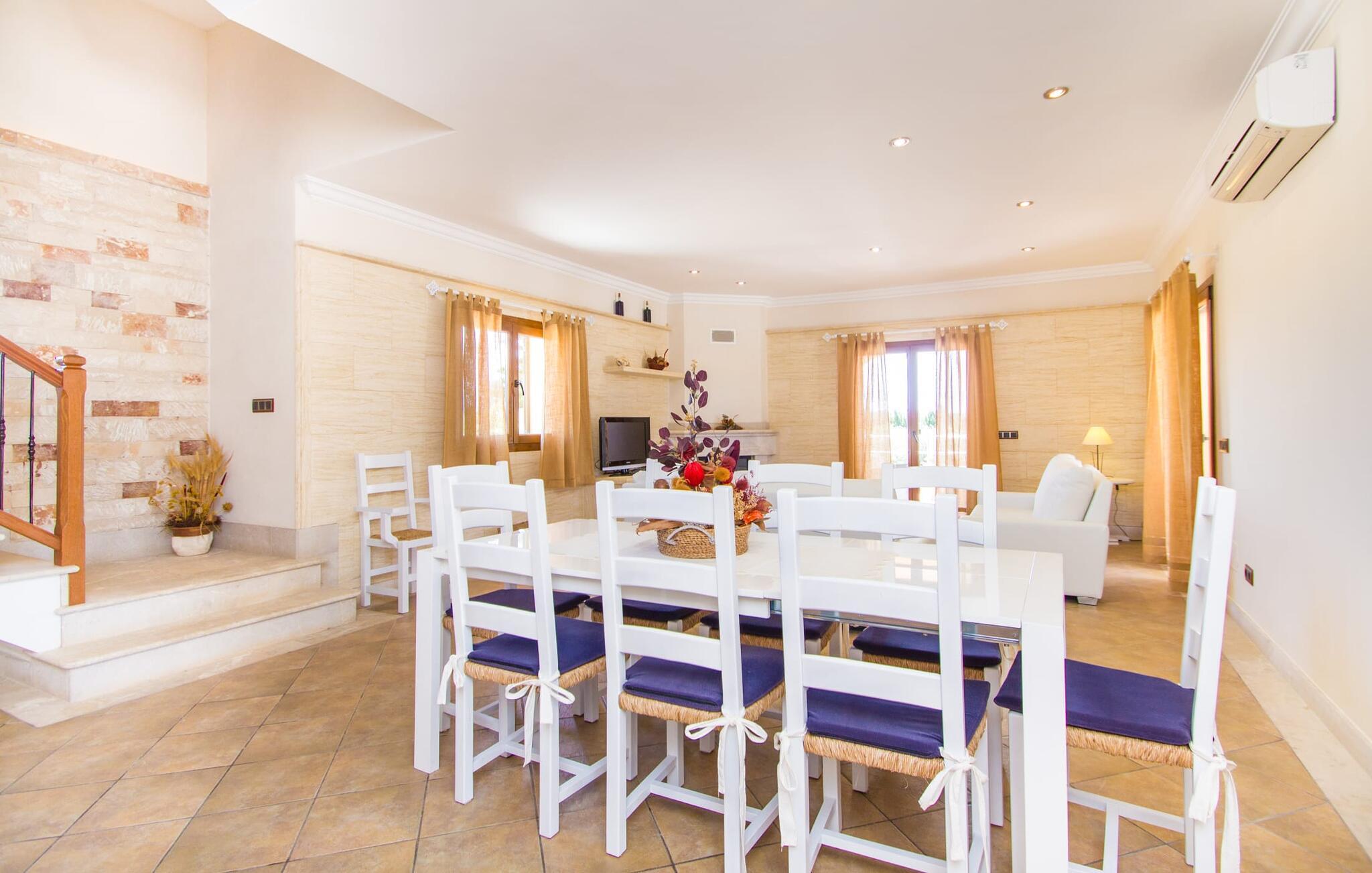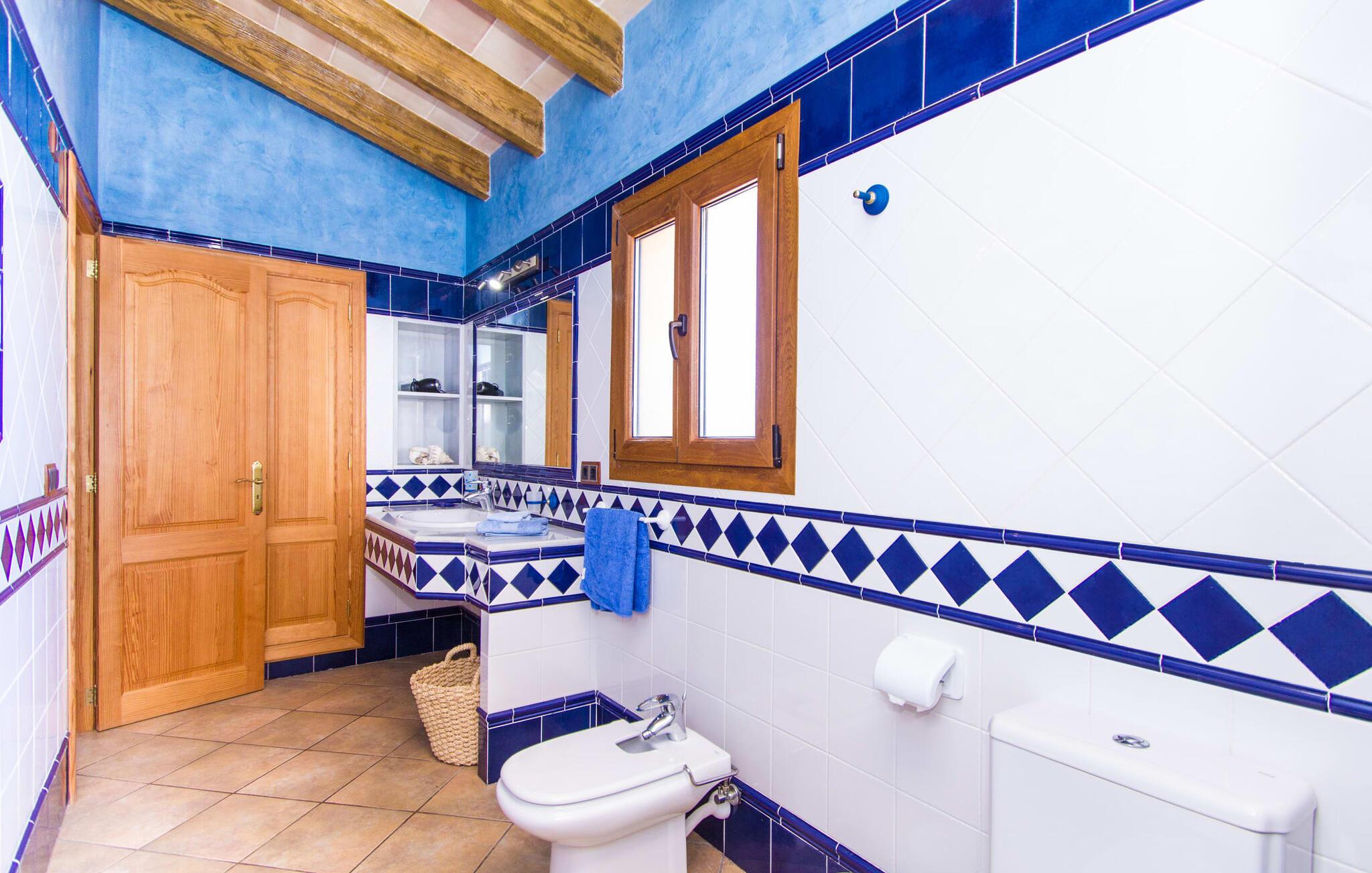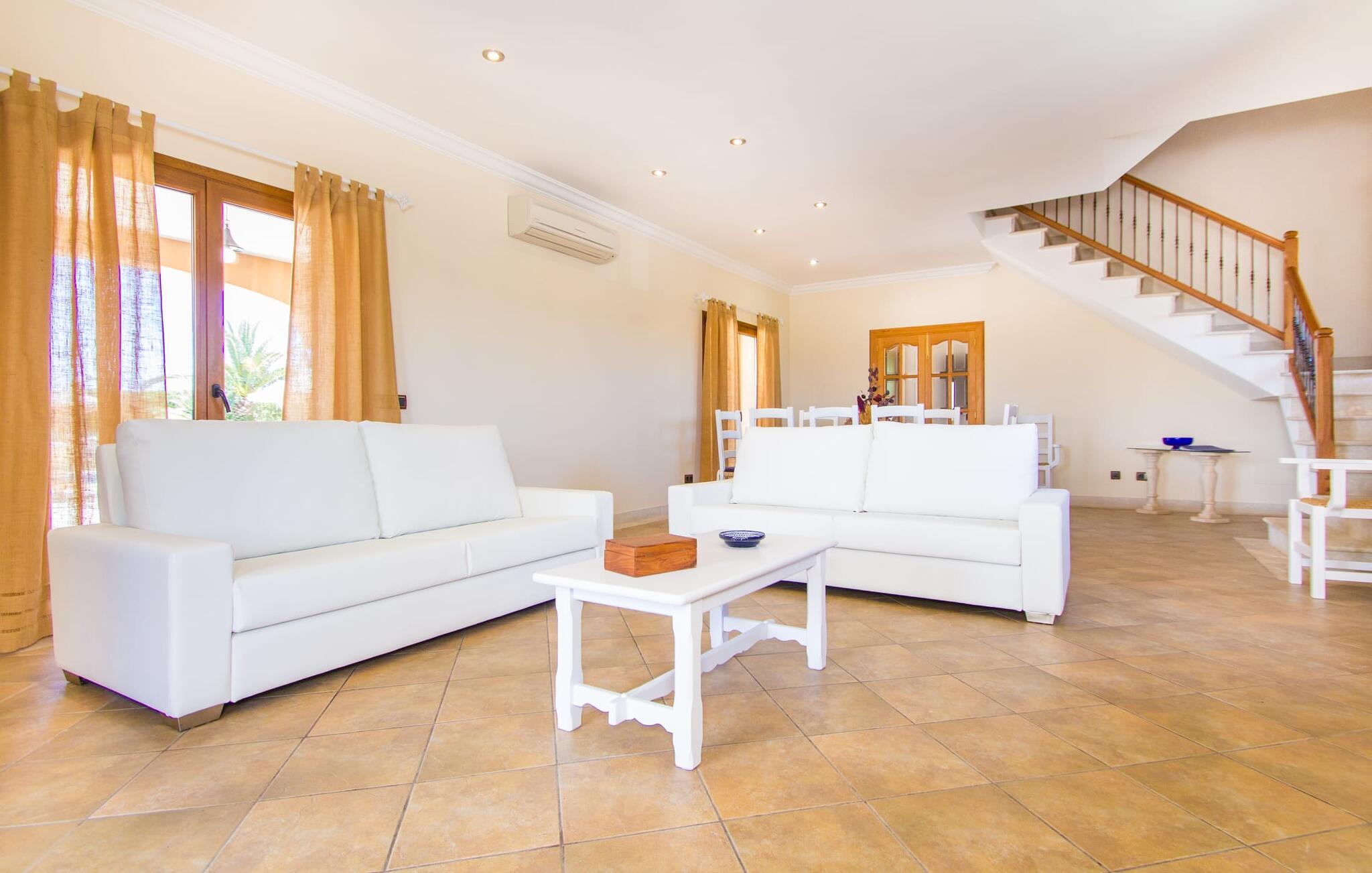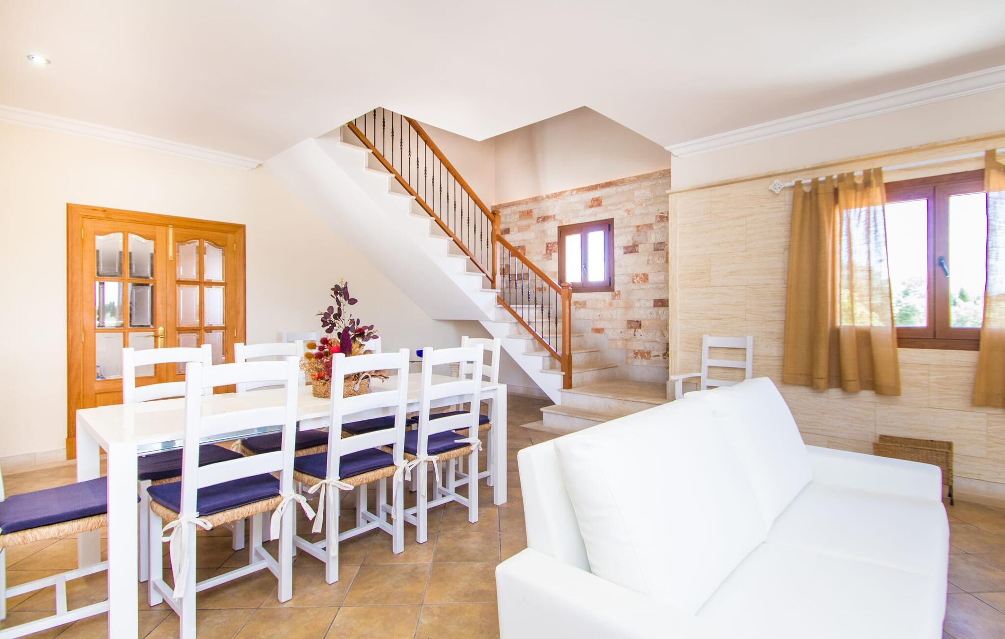 Hvis I er fan af skandinaviske, muntre farveskemaer, vil I straks forelske jer i husets indretning. Farverne på fliser, vægge og møbler harmonerer med hinanden og komplementeres charmerende af villaens belysningskoncept. I den store stue og spisestue kan I se den knitrende ild i pejsen eller slappe af i de store, hvide lædersofaer og se en film på fladskærms-tv'et. Køkkenet, der er udstyret med et bord, har også alt det nødvendige redskab til at sætte prikken over i'et på jeres ferie på Mallorca. Hvis tiden er knap, er der altid mulighed for at forkorte tilberedningen i mikrobølgeovnen. Ovnen er stilfuldt indbygget i væggen, og køleskabet tilbyder rigelig opbevaringsplads, selv til større shoppingture. Et af soveværelserne og et badeværelse ligger også i stueetagen. De to ekstra badeværelser, hvoraf det ene er indrettet i nautisk blå og hvid, samt fire yderligere soveværelser ligger på øverste niveau og fører ud til stuen. Et af badeværelserne har endda et badekar, hvis poolen og havet er for meget for jer. Værelserne ovenpå har også adgang til solterrassen med udsigt over poolen, haven og de landlige omgivelser.