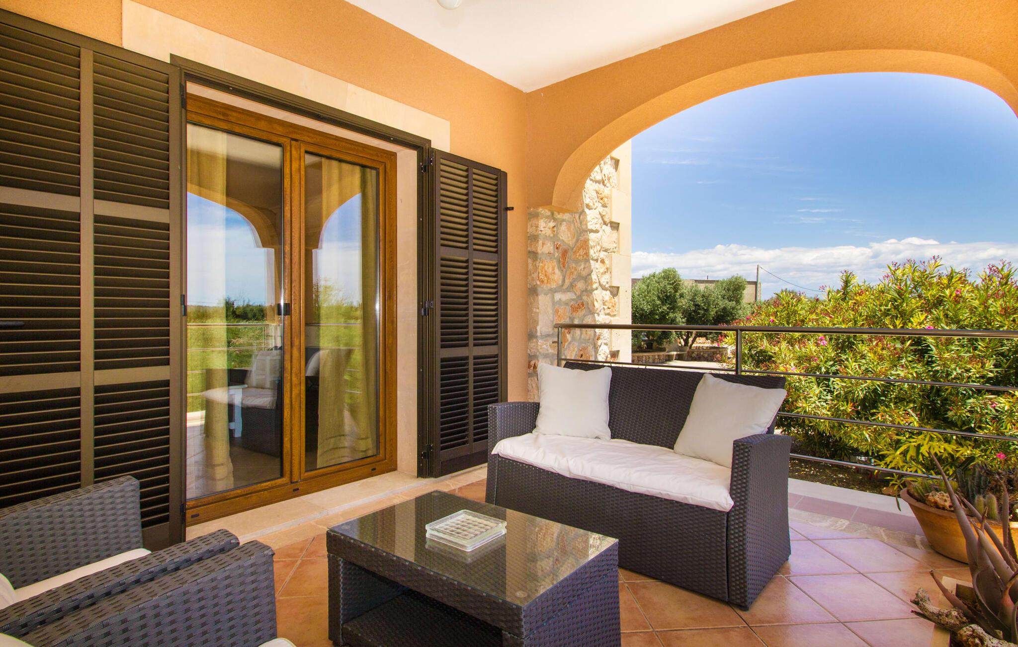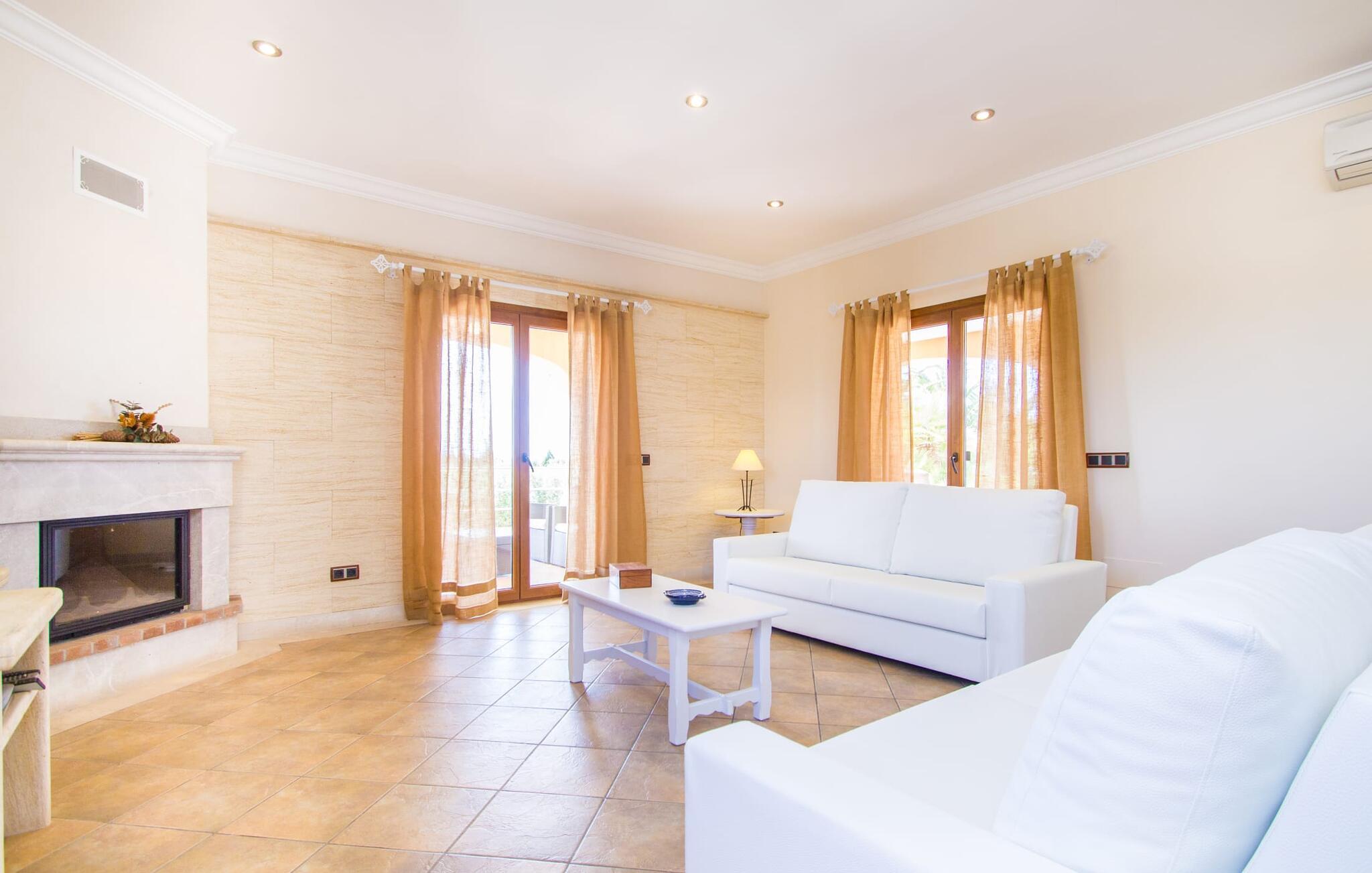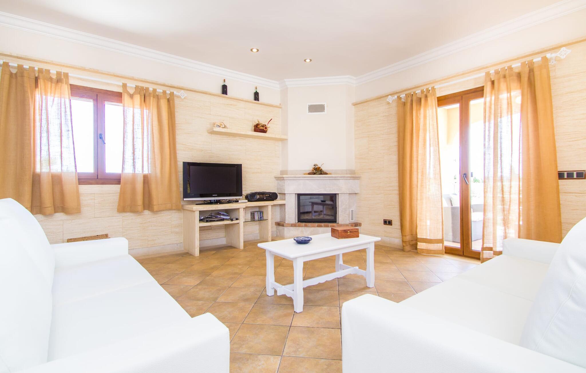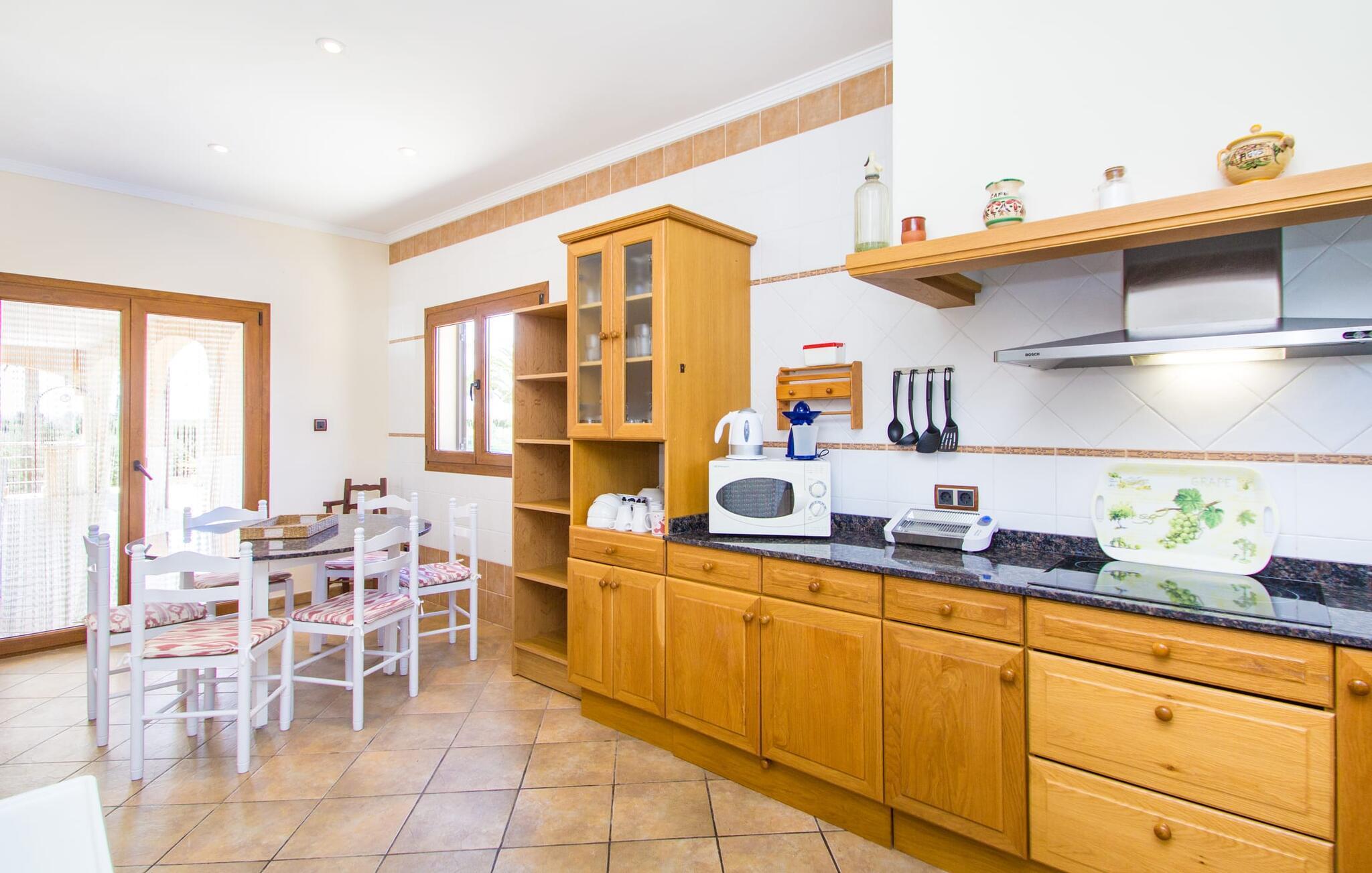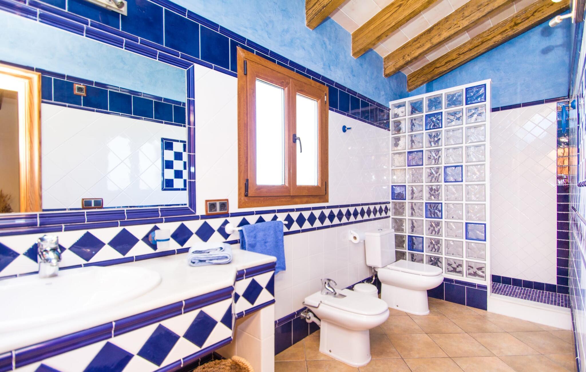 Hvis I er fan af skandinaviske, muntre farveskemaer, vil I straks forelske jer i husets indretning. Farverne på fliser, vægge og møbler harmonerer med hinanden og komplementeres charmerende af villaens belysningskoncept. I den store stue og spisestue kan I se den knitrende ild i pejsen eller slappe af i de store, hvide lædersofaer og se en film på fladskærms-tv'et. Køkkenet, der er udstyret med et bord, har også alt det nødvendige redskab til at sætte prikken over i'et på jeres ferie på Mallorca. Hvis tiden er knap, er der altid mulighed for at forkorte tilberedningen i mikrobølgeovnen. Ovnen er stilfuldt indbygget i væggen, og køleskabet tilbyder rigelig opbevaringsplads, selv til større shoppingture. Et af soveværelserne og et badeværelse ligger også i stueetagen. De to ekstra badeværelser, hvoraf det ene er indrettet i nautisk blå og hvid, samt fire yderligere soveværelser ligger på øverste niveau og fører ud til stuen. Et af badeværelserne har endda et badekar, hvis poolen og havet er for meget for jer. Værelserne ovenpå har også adgang til solterrassen med udsigt over poolen, haven og de landlige omgivelser.