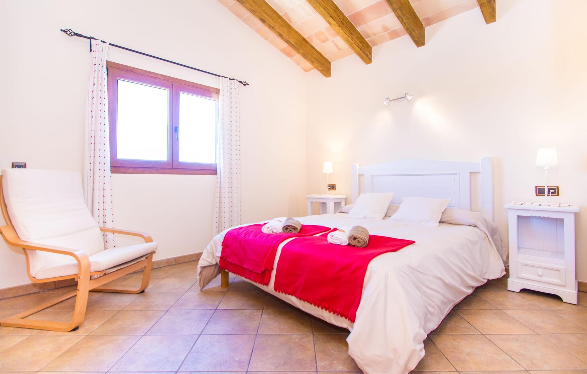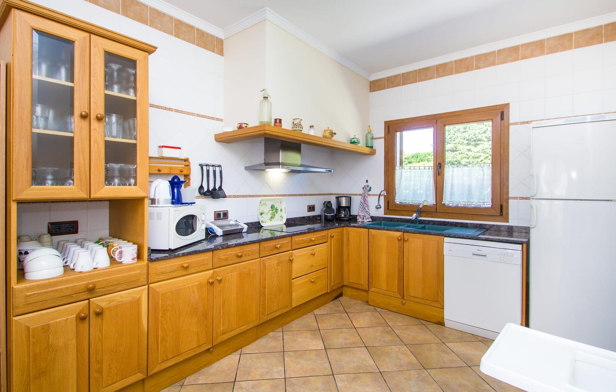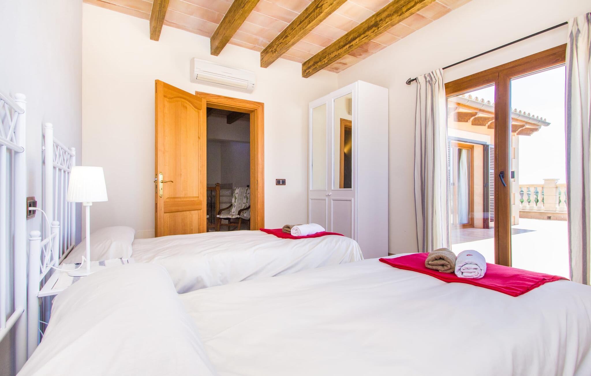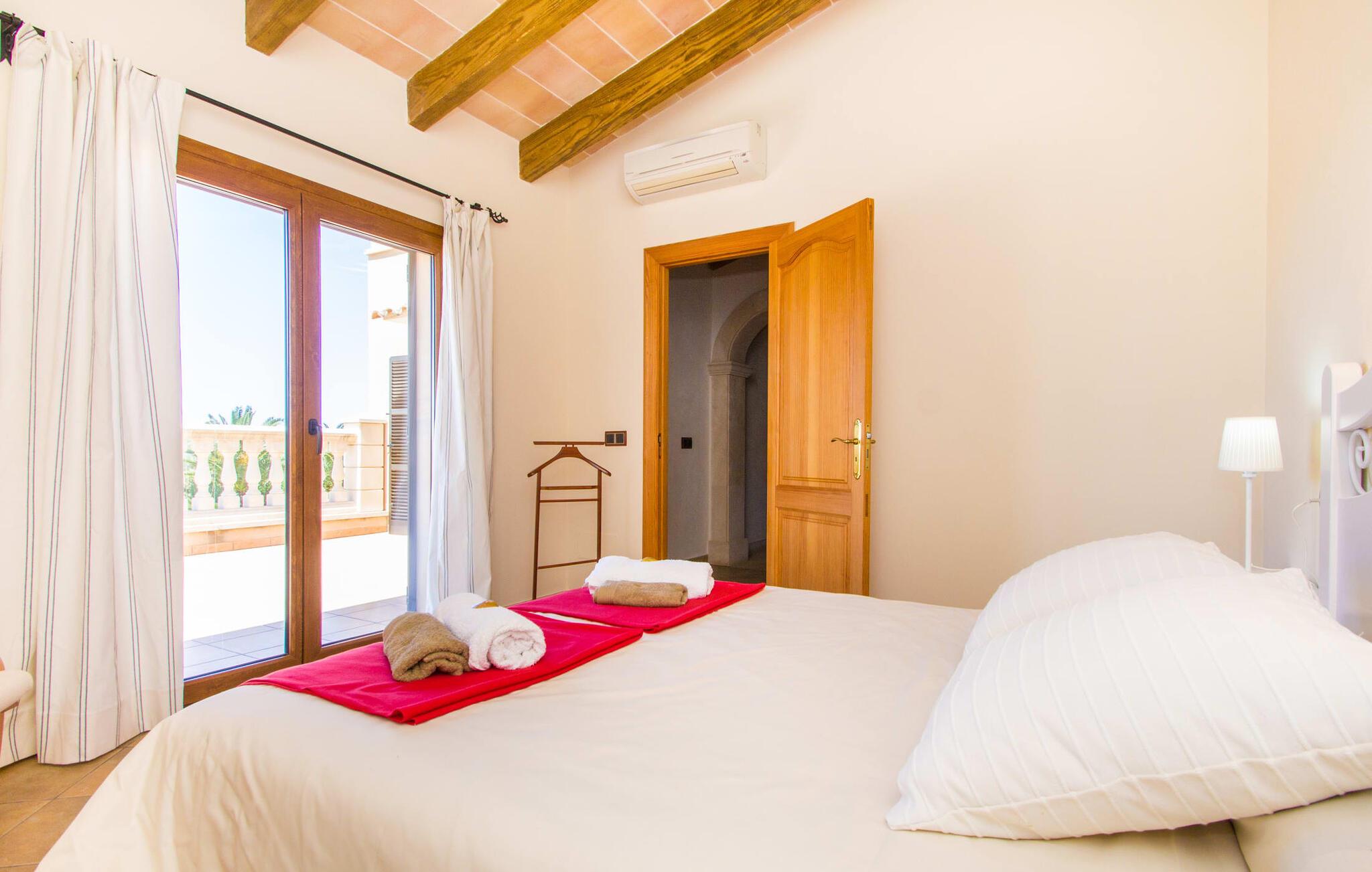 Hvis I er fan af skandinaviske, muntre farveskemaer, vil I straks forelske jer i husets indretning. Farverne på fliser, vægge og møbler harmonerer med hinanden og komplementeres charmerende af villaens belysningskoncept. I den store stue og spisestue kan I se den knitrende ild i pejsen eller slappe af i de store, hvide lædersofaer og se en film på fladskærms-tv'et. Køkkenet, der er udstyret med et bord, har også alt det nødvendige redskab til at sætte prikken over i'et på jeres ferie på Mallorca. Hvis tiden er knap, er der altid mulighed for at forkorte tilberedningen i mikrobølgeovnen. Ovnen er stilfuldt indbygget i væggen, og køleskabet tilbyder rigelig opbevaringsplads, selv til større shoppingture. Et af soveværelserne og et badeværelse ligger også i stueetagen. De to ekstra badeværelser, hvoraf det ene er indrettet i nautisk blå og hvid, samt fire yderligere soveværelser ligger på øverste niveau og fører ud til stuen. Et af badeværelserne har endda et badekar, hvis poolen og havet er for meget for jer. Værelserne ovenpå har også adgang til solterrassen med udsigt over poolen, haven og de landlige omgivelser.