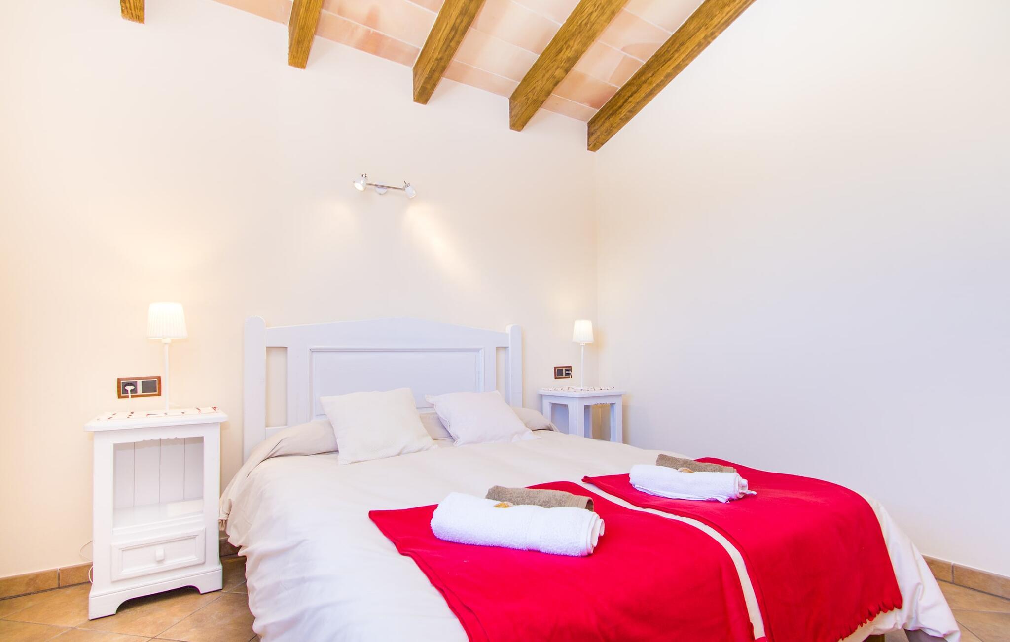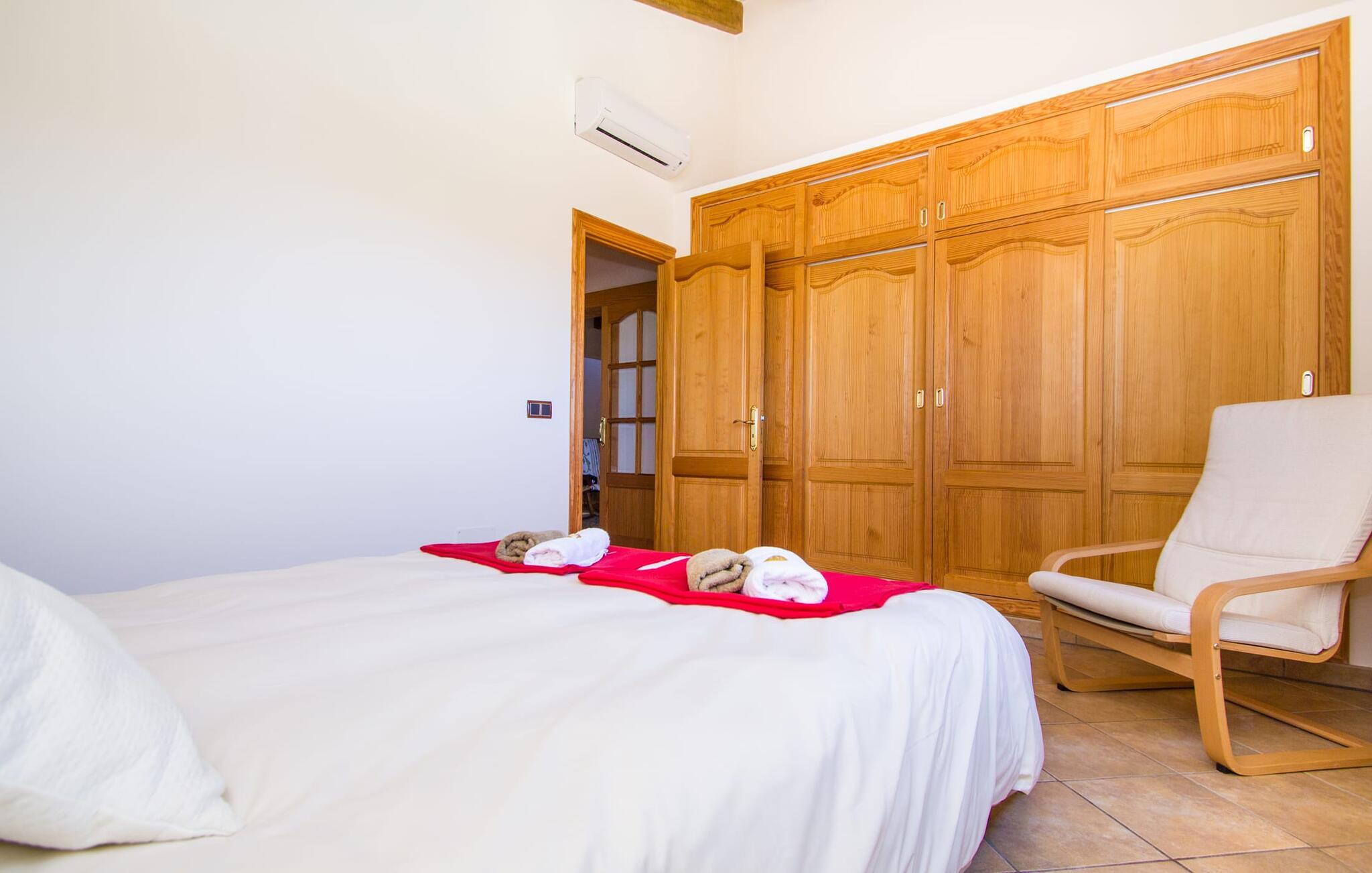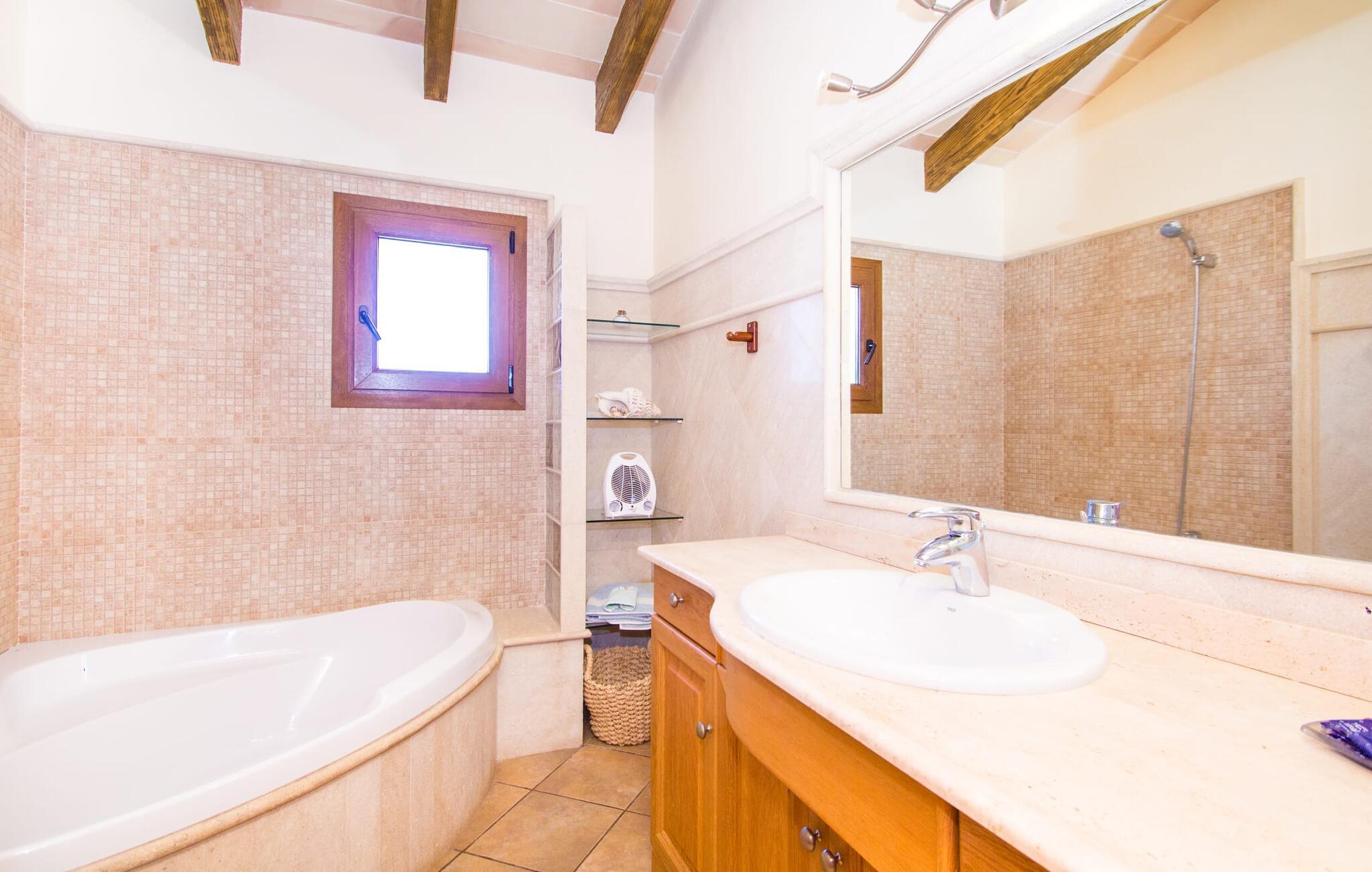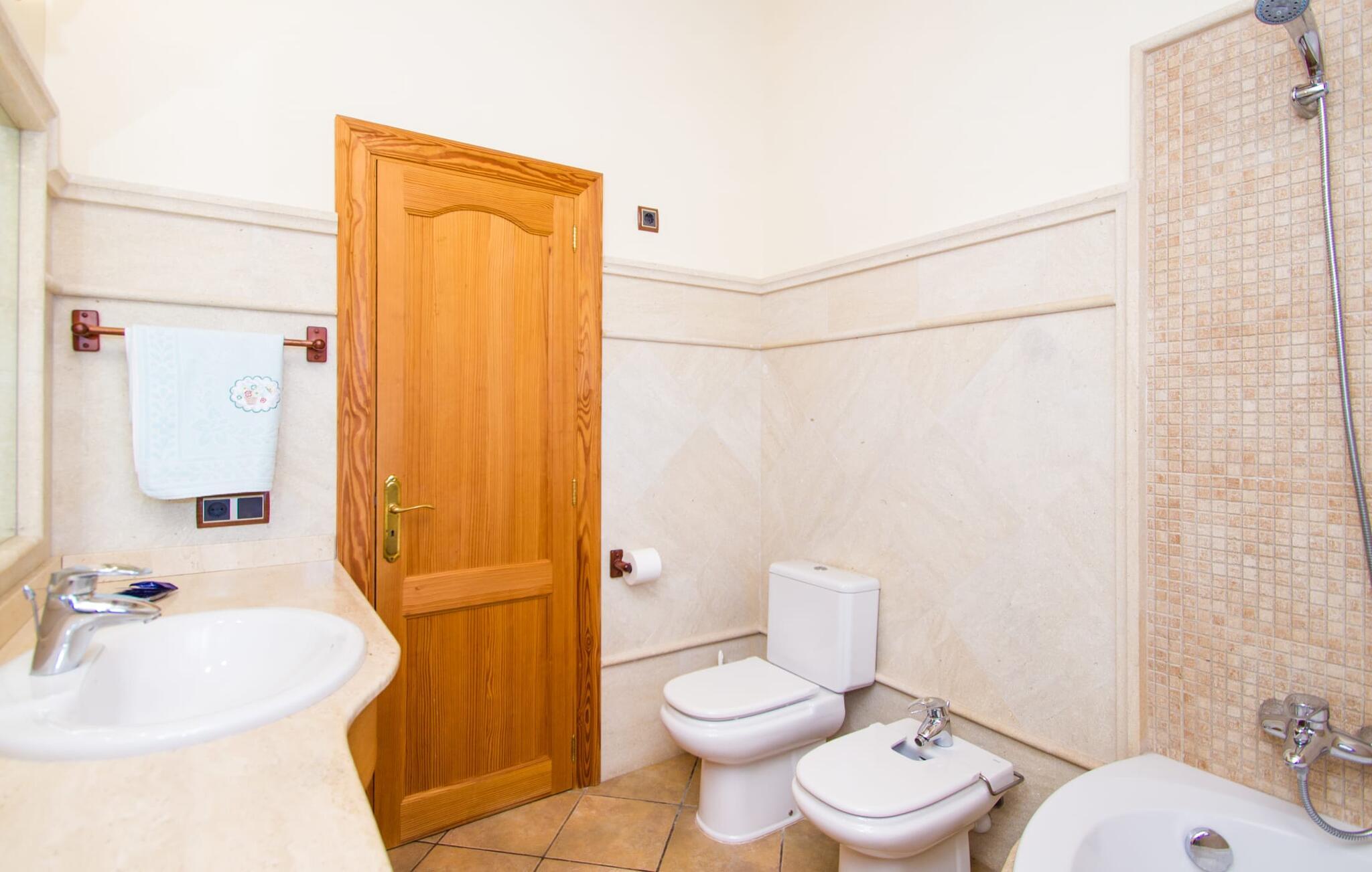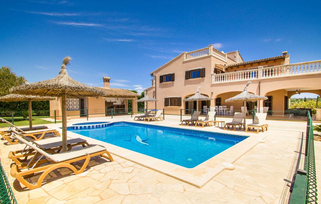 Hvis I er fan af skandinaviske, muntre farveskemaer, vil I straks forelske jer i husets indretning. Farverne på fliser, vægge og møbler harmonerer med hinanden og komplementeres charmerende af villaens belysningskoncept. I den store stue og spisestue kan I se den knitrende ild i pejsen eller slappe af i de store, hvide lædersofaer og se en film på fladskærms-tv'et. Køkkenet, der er udstyret med et bord, har også alt det nødvendige redskab til at sætte prikken over i'et på jeres ferie på Mallorca. Hvis tiden er knap, er der altid mulighed for at forkorte tilberedningen i mikrobølgeovnen. Ovnen er stilfuldt indbygget i væggen, og køleskabet tilbyder rigelig opbevaringsplads, selv til større shoppingture. Et af soveværelserne og et badeværelse ligger også i stueetagen. De to ekstra badeværelser, hvoraf det ene er indrettet i nautisk blå og hvid, samt fire yderligere soveværelser ligger på øverste niveau og fører ud til stuen. Et af badeværelserne har endda et badekar, hvis poolen og havet er for meget for jer. Værelserne ovenpå har også adgang til solterrassen med udsigt over poolen, haven og de landlige omgivelser.