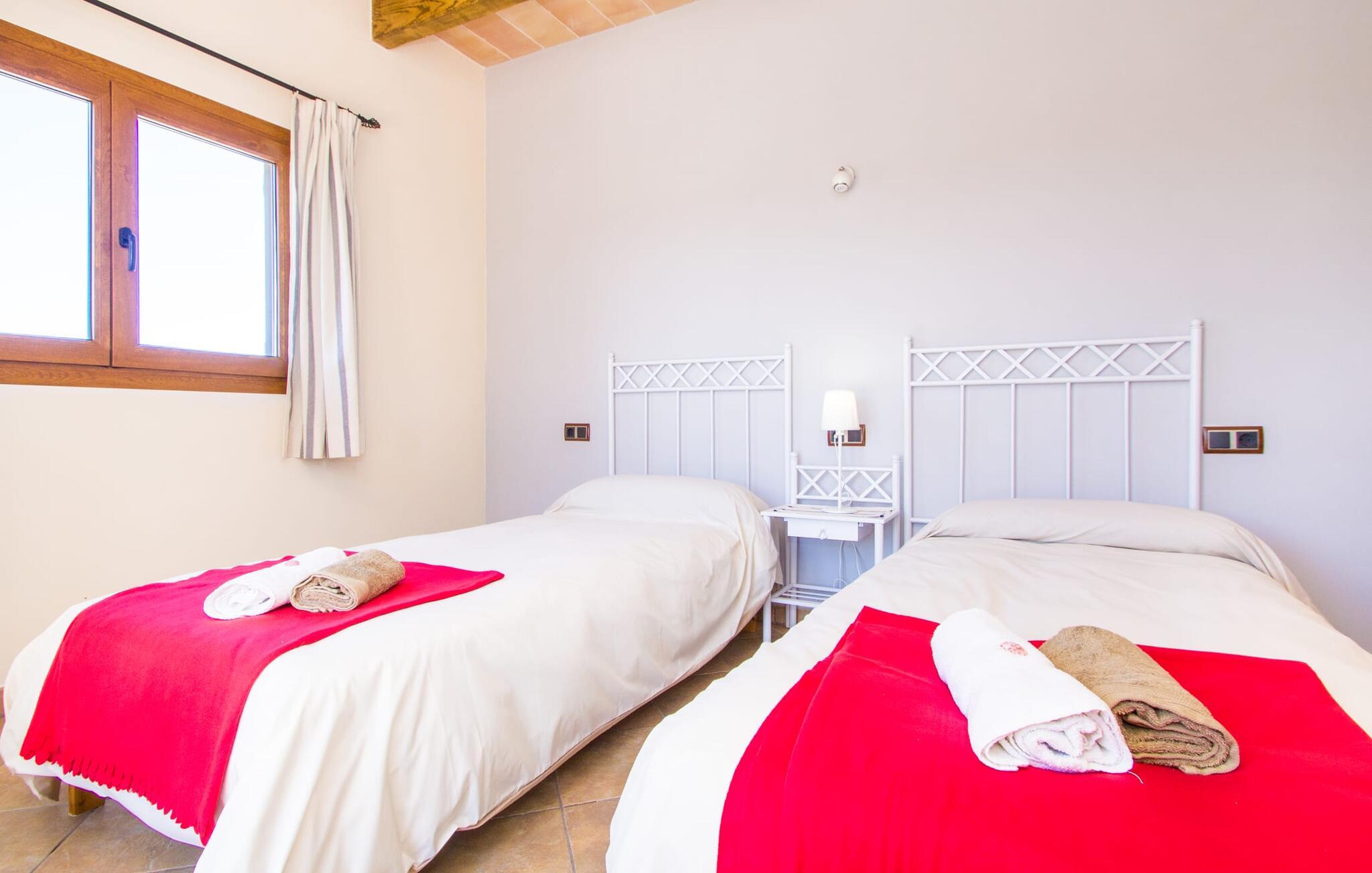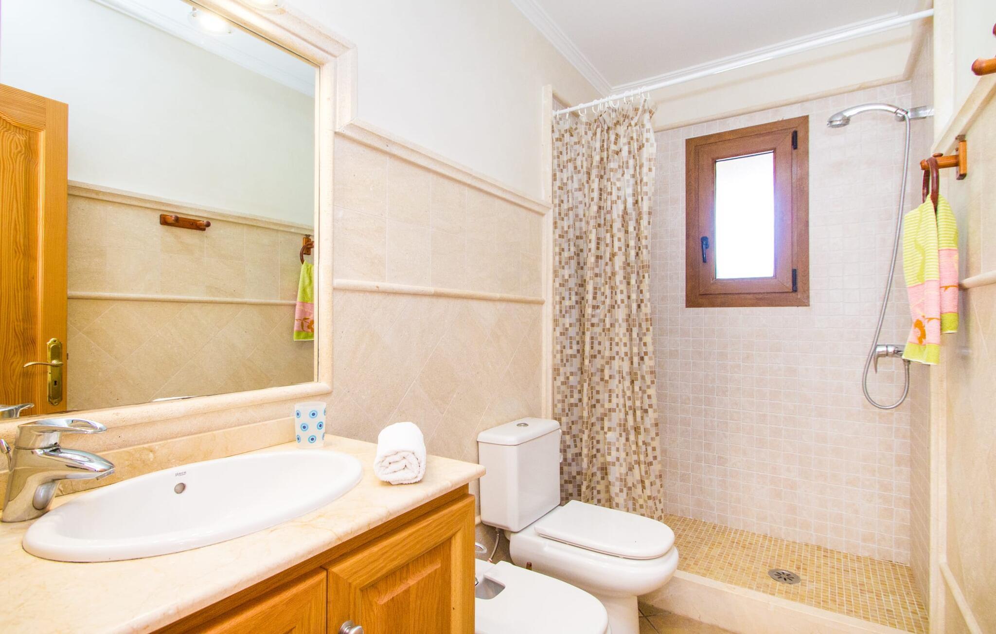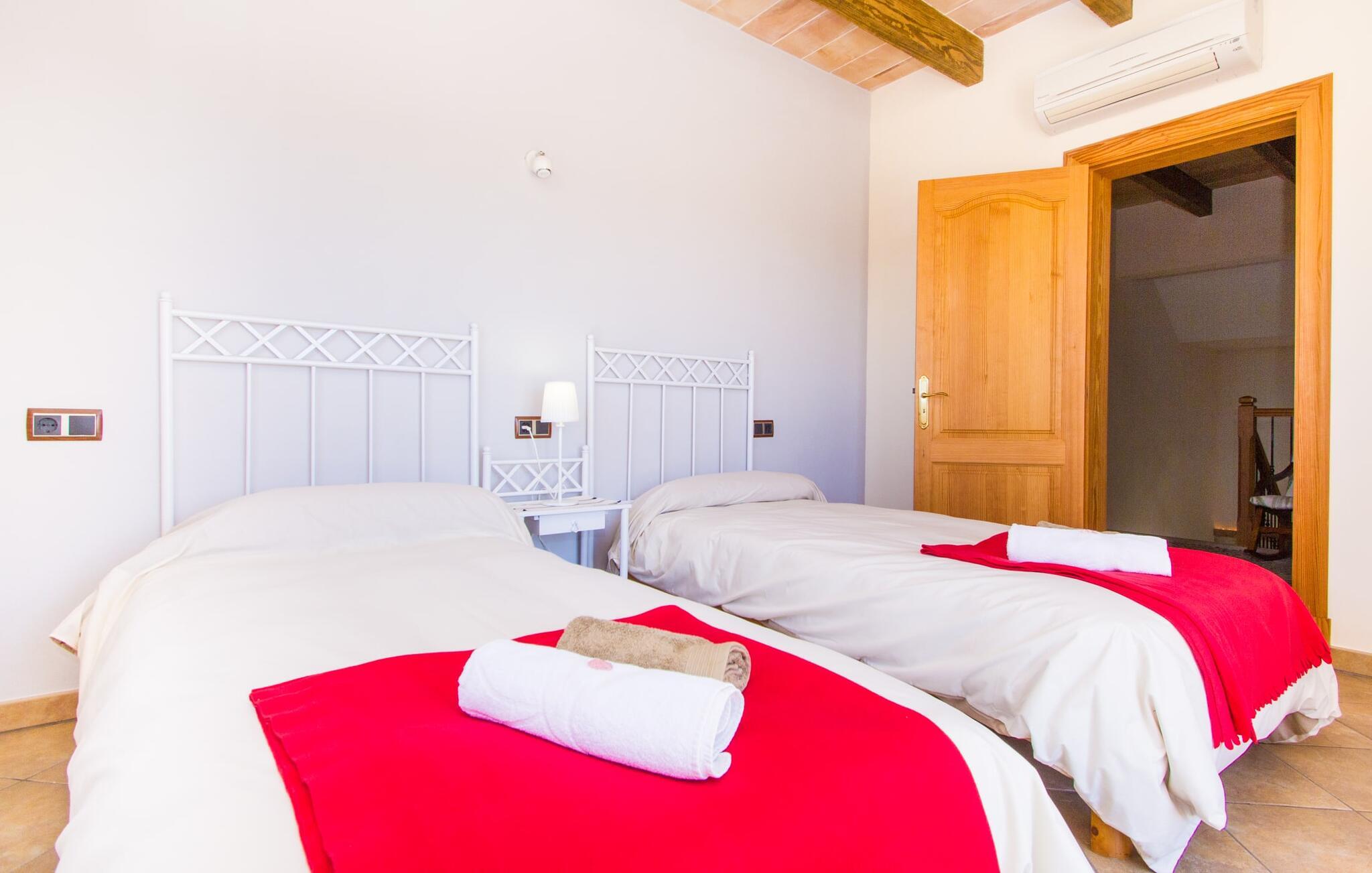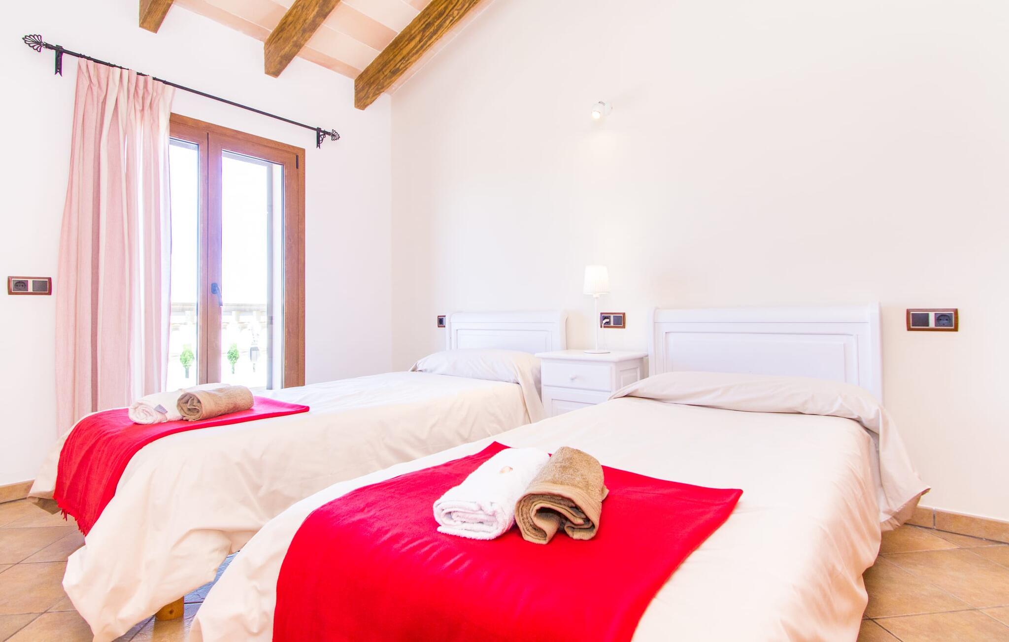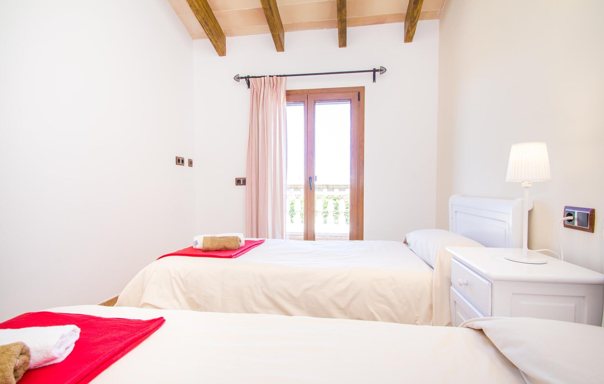 Hvis I er fan af skandinaviske, muntre farveskemaer, vil I straks forelske jer i husets indretning. Farverne på fliser, vægge og møbler harmonerer med hinanden og komplementeres charmerende af villaens belysningskoncept. I den store stue og spisestue kan I se den knitrende ild i pejsen eller slappe af i de store, hvide lædersofaer og se en film på fladskærms-tv'et. Køkkenet, der er udstyret med et bord, har også alt det nødvendige redskab til at sætte prikken over i'et på jeres ferie på Mallorca. Hvis tiden er knap, er der altid mulighed for at forkorte tilberedningen i mikrobølgeovnen. Ovnen er stilfuldt indbygget i væggen, og køleskabet tilbyder rigelig opbevaringsplads, selv til større shoppingture. Et af soveværelserne og et badeværelse ligger også i stueetagen. De to ekstra badeværelser, hvoraf det ene er indrettet i nautisk blå og hvid, samt fire yderligere soveværelser ligger på øverste niveau og fører ud til stuen. Et af badeværelserne har endda et badekar, hvis poolen og havet er for meget for jer. Værelserne ovenpå har også adgang til solterrassen med udsigt over poolen, haven og de landlige omgivelser.